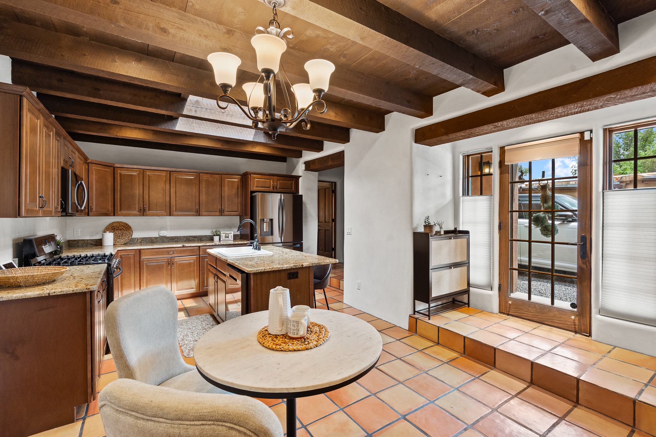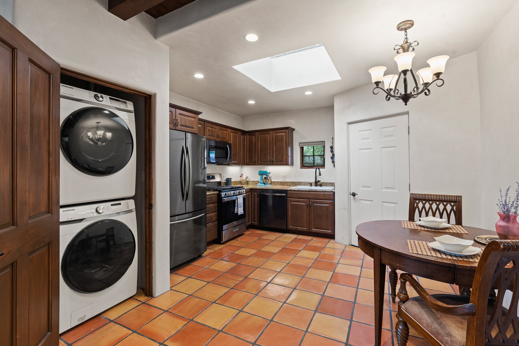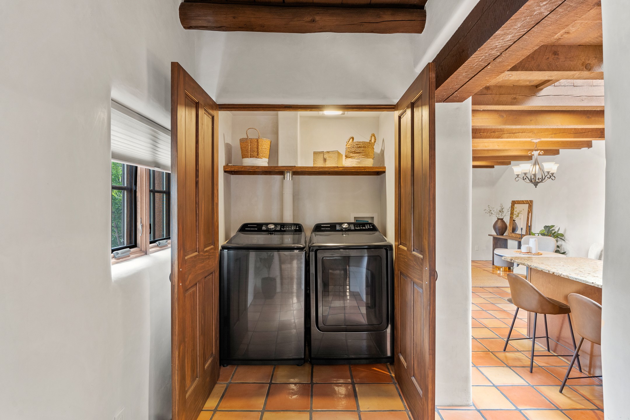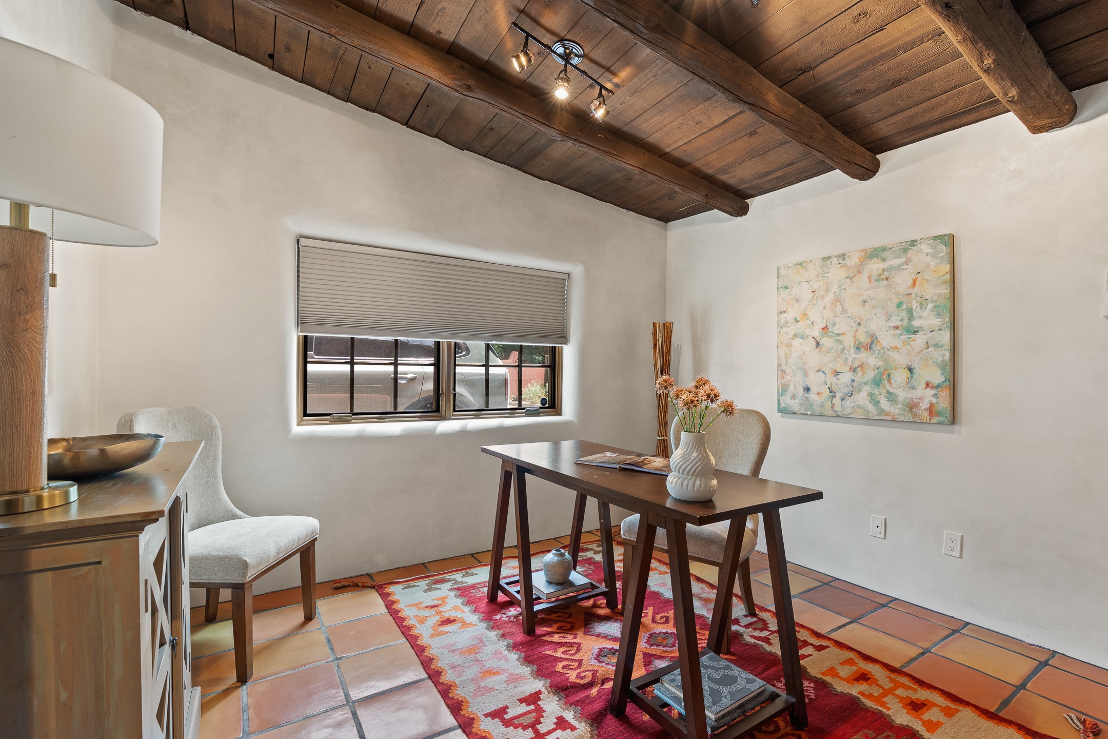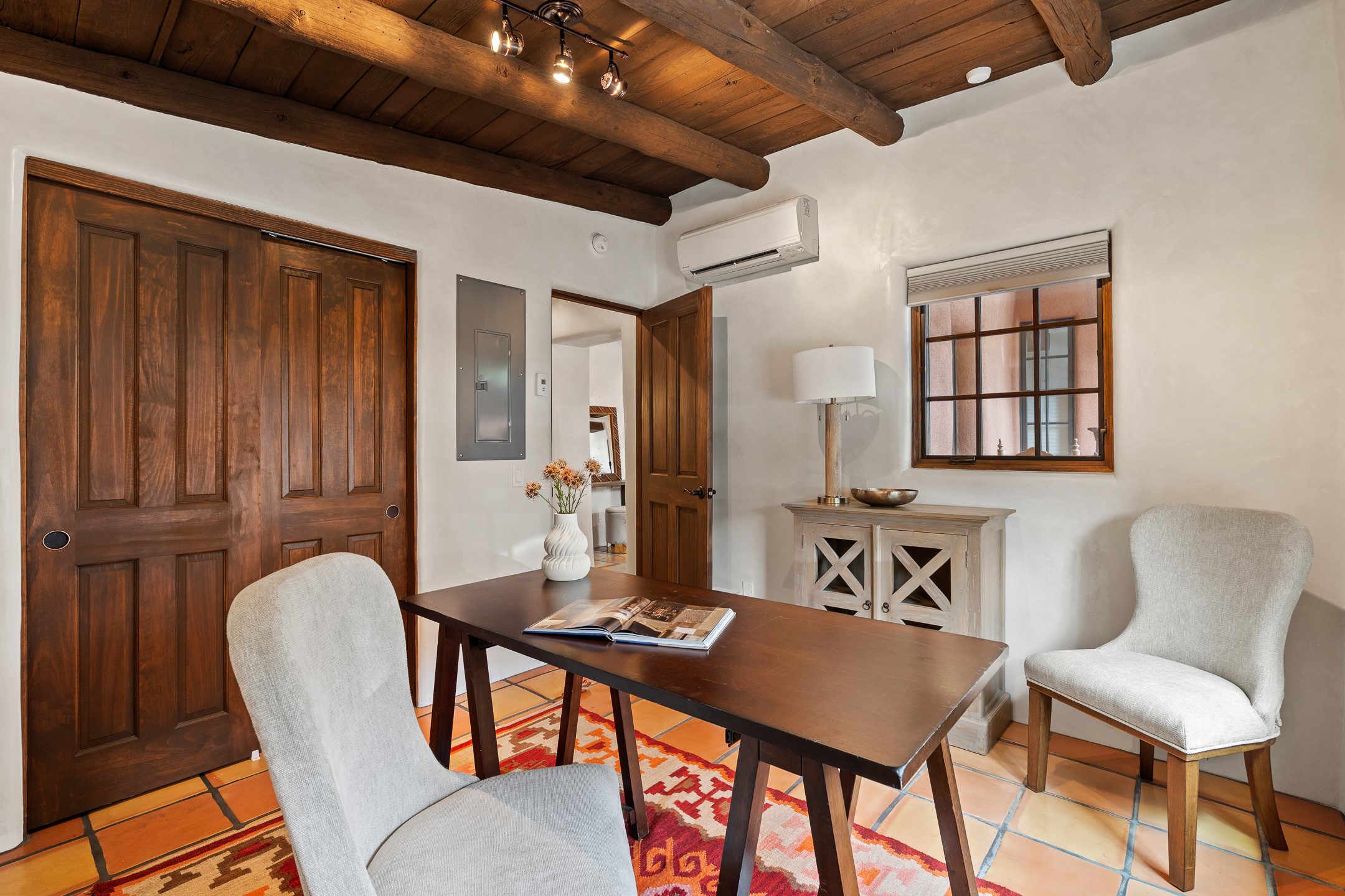 Modern Comfort in a Classic Santa Fe Setting. This beautifully rebuilt duplex sits in a highly walkable and desirable downtown Santa Fe neighborhood. Thoughtfully remodeled less than ten years ago, this home seamlessly blends old-world charm with modern conveniences -- perfect for anyone seeking quality, location, and flexibility. The front casita, features two serene bedrooms and two full bathrooms. The back casita is two bedrooms and one bath. Each space has a private entrance flanked by mature landscaping as well as updated systems and stylish finishes throughout. Recent upgrades include: Pella divided light windows and doors. Venetian-style diamond plaster walls. Rich Saltillo tile flooring throughout. Radiant in-floor heat complemented by ducted and split-unit air systems. Upgraded electric and plumbing with separate meters. Stainless appliance packages. Washer and dryer in both casitas Oil rubbed Bronze Kohler fixtures and custom Italian hand-blown glass tile shower accents. Flagstone walk and patio. TPO roof and updated sewer line. Brand new stucco exterior completed in 2024. Professionally installed drip irrigation system. No HOA restrictions mean ultimate flexibility: live in one unit while renting the other for passive income, or capitalize on Santa Fe's vibrant rental market with both units. Whether you're looking for a primary residence, pied-terre, or investment property, this home offers rare versatility with premium finishes in an unbeatable location.
