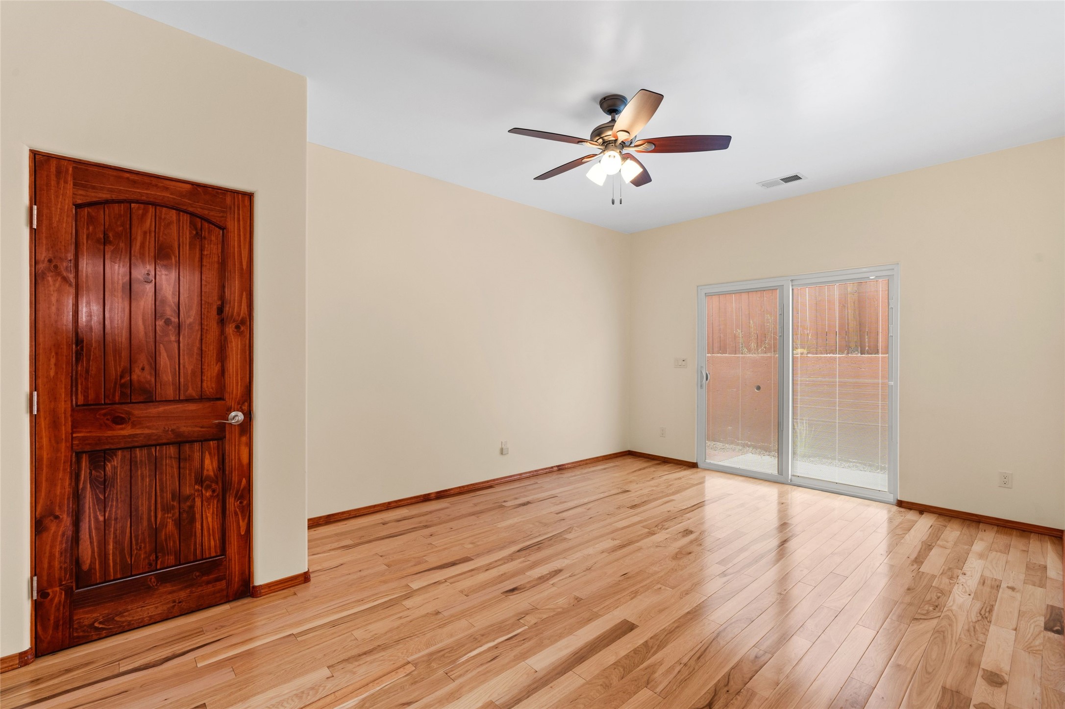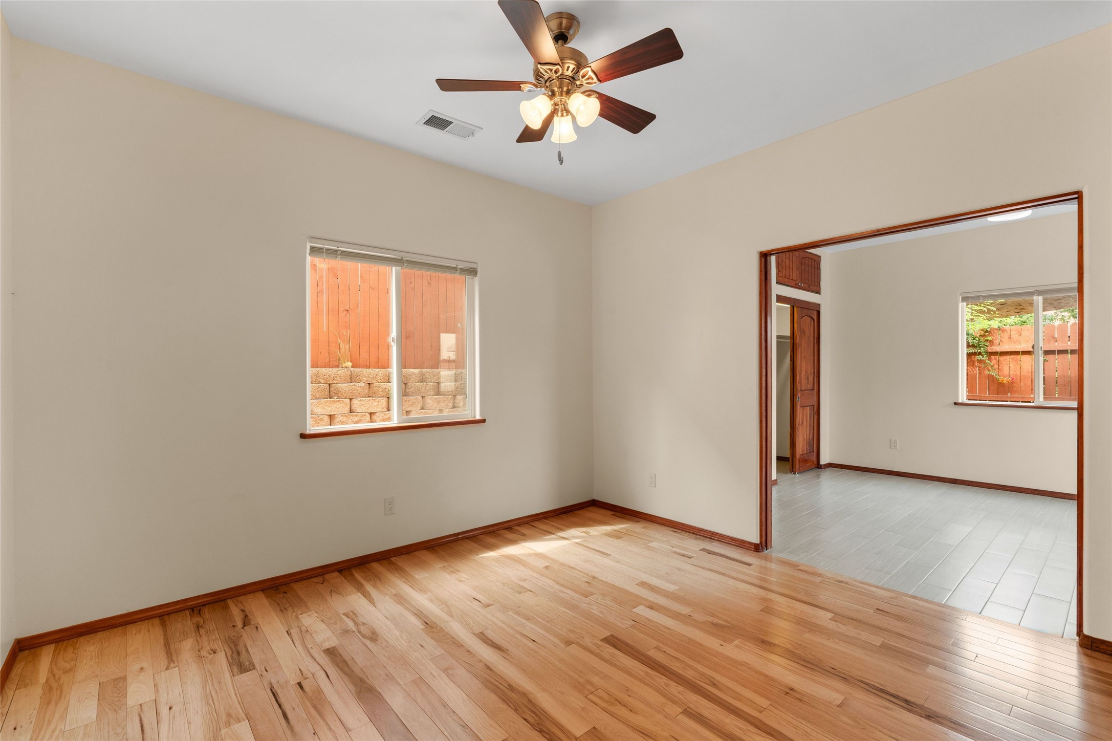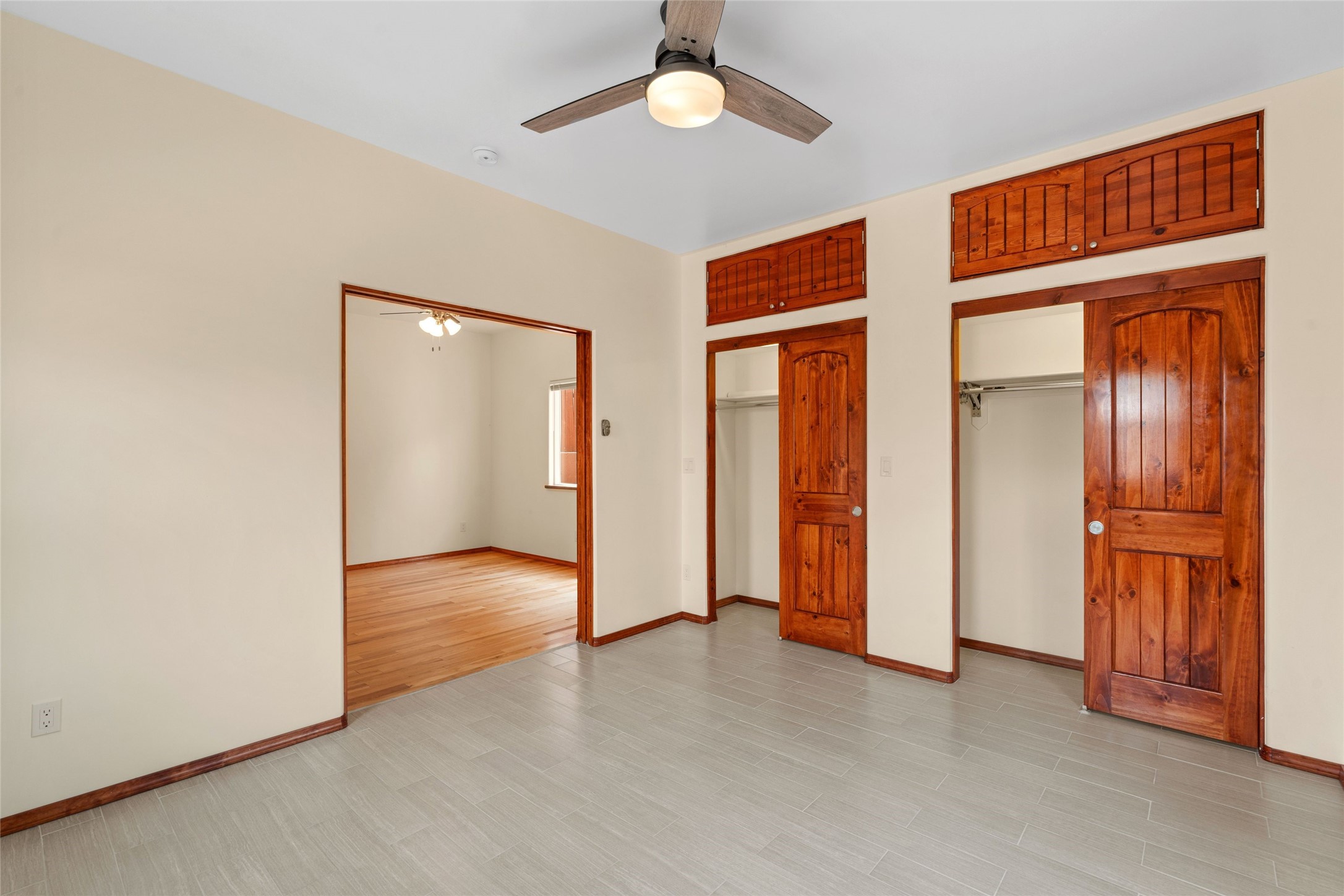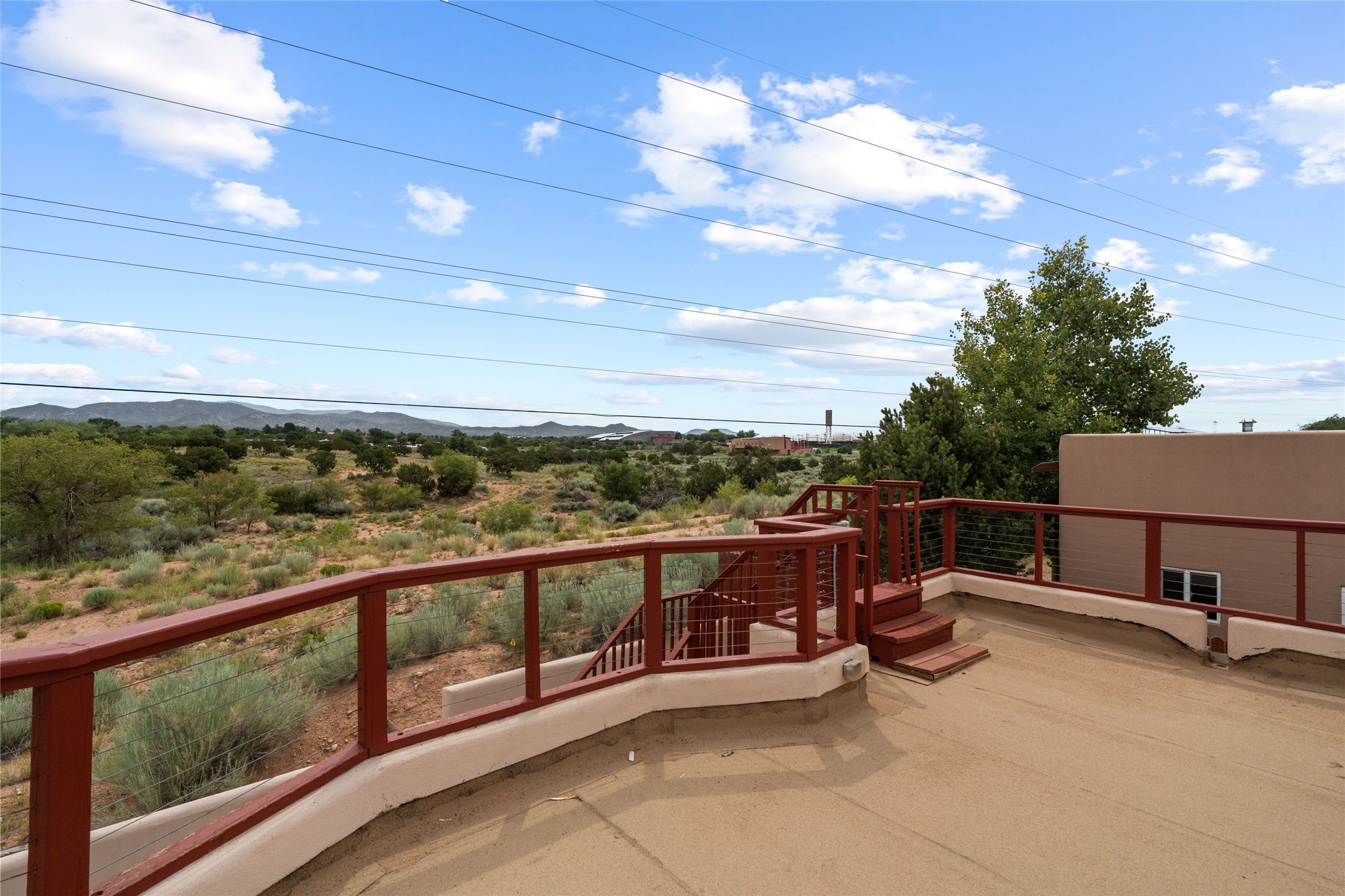 Kachina Ridge 3-bedroom, 2-bathroom residence, crafted by Master Green Builder Arch Sproul, showcases numerous custom upgrades and green features, making it an eco-friendly choice for the modern homeowner. Wide doorways, nichos, and porcelain tile and hardwood hickory floors throughout. The solid knotty pine doors add a touch of rustic charm, while the enlarged living room with log vigas and a gas fireplace with a flagstone hearth, invites you to unwind in style. The bright, east-facing kitchen is appointed with a center island, solid maple cabinets finished in natural tones, Silestone quartz countertops and Energy Star Appliances. The primary suite includes a walk-in closet and en-suite bath with soaking tub and walk-in shower. The two guest bedrooms offer versatile options, whether you need a studio, office, or additional space for visitors. Plus, a bonus room awaits your creativity--perfect for exercise or artistic endeavors. Step outside to the expansive back portal featuring a tongue and groove ceiling, where you can enjoy al fresco dining. The front and backyard gardens are thoughtfully designed with low-water perennials and buried irrigation lines. Enlarged, fully finished garage with 10-foot ceiling and overhead storage. Equipped with 30 photovoltaic panels installed by Positive Energy, you can enjoy lower energy costs while reducing your carbon footprint. The Kachina Ridge Subdivision homes are located adjacent to a greenbelt with no through streets. Convenient city location close to shopping, restaurants and the Santa Fe Plaza.
