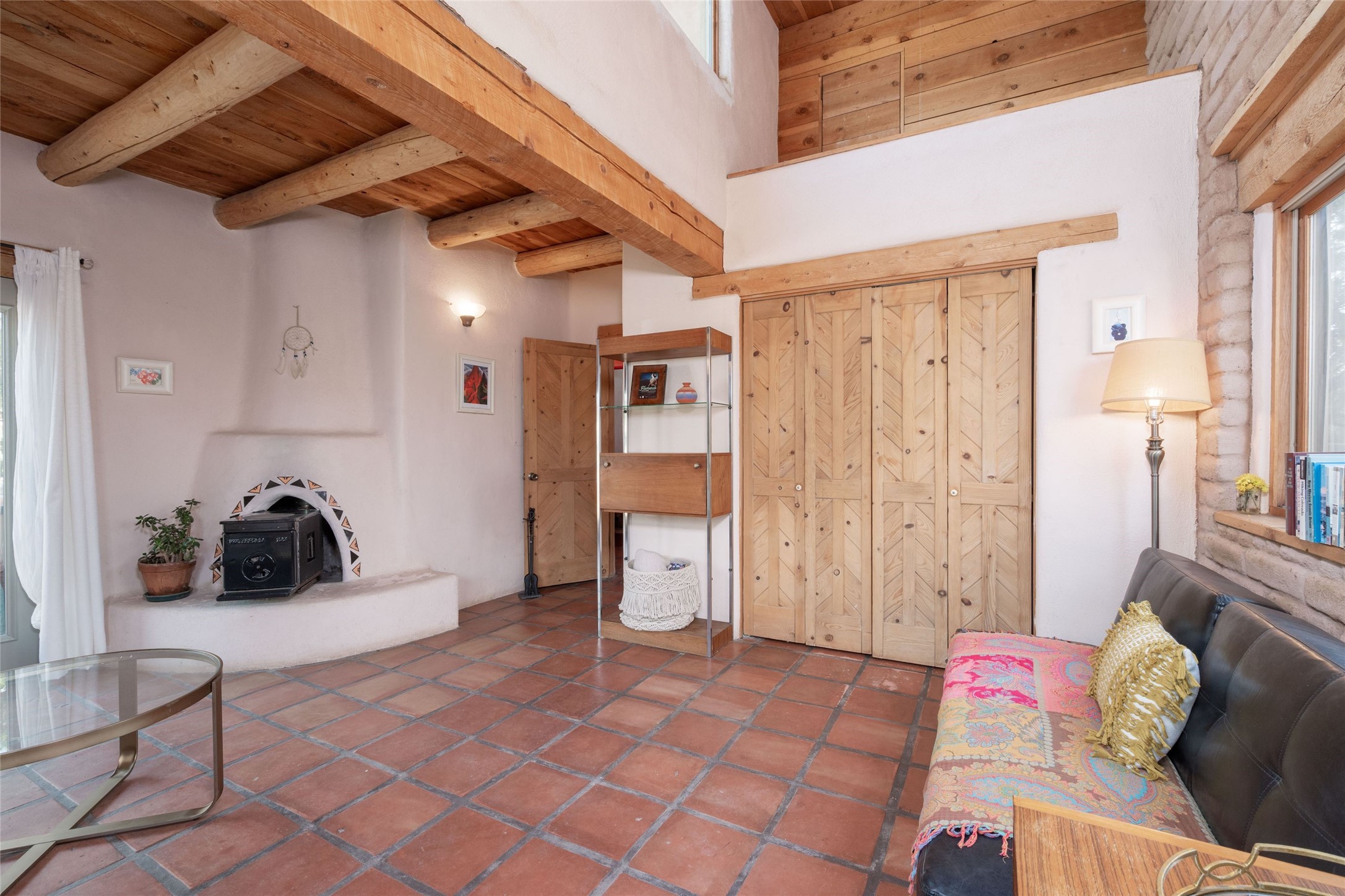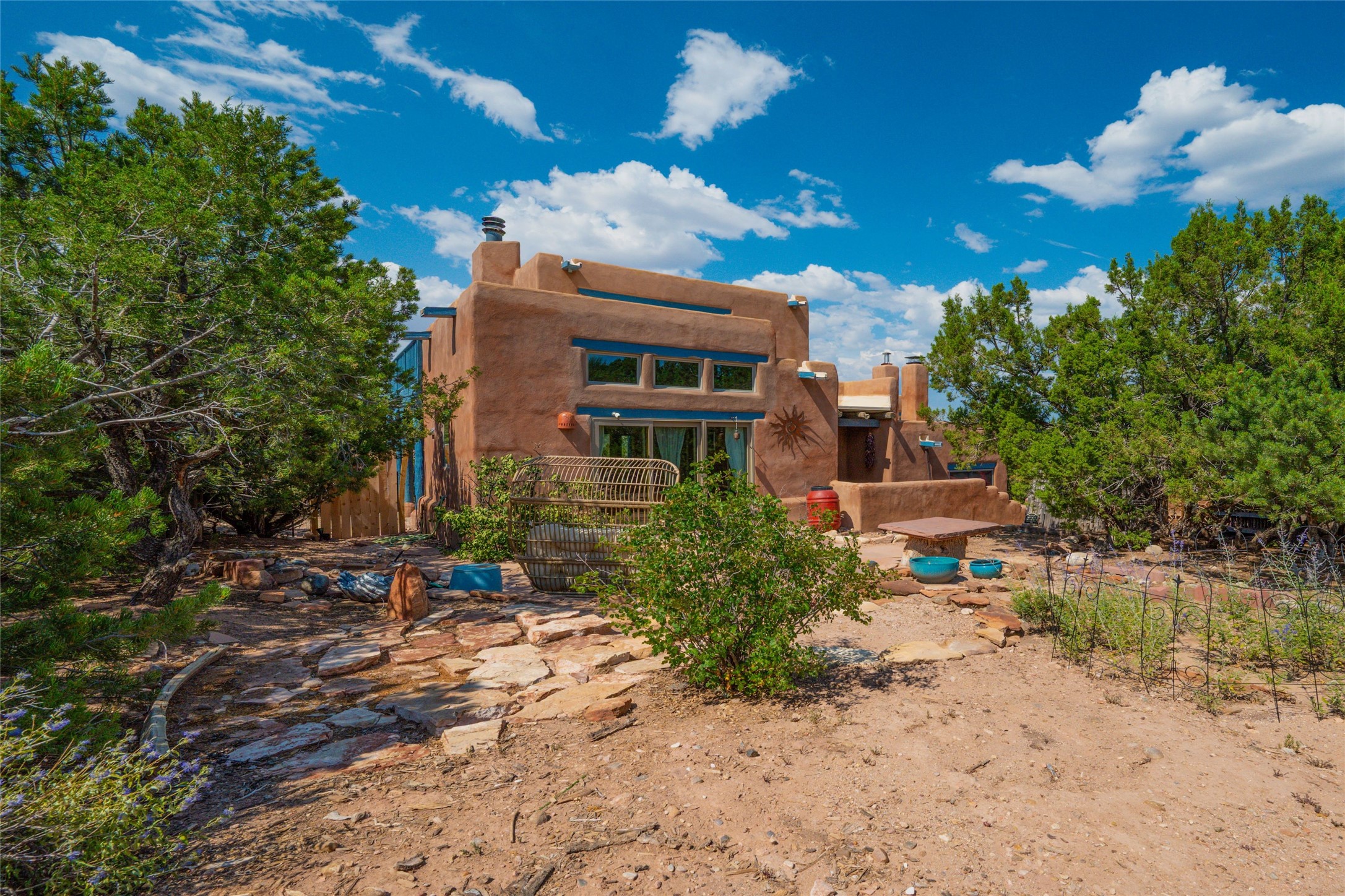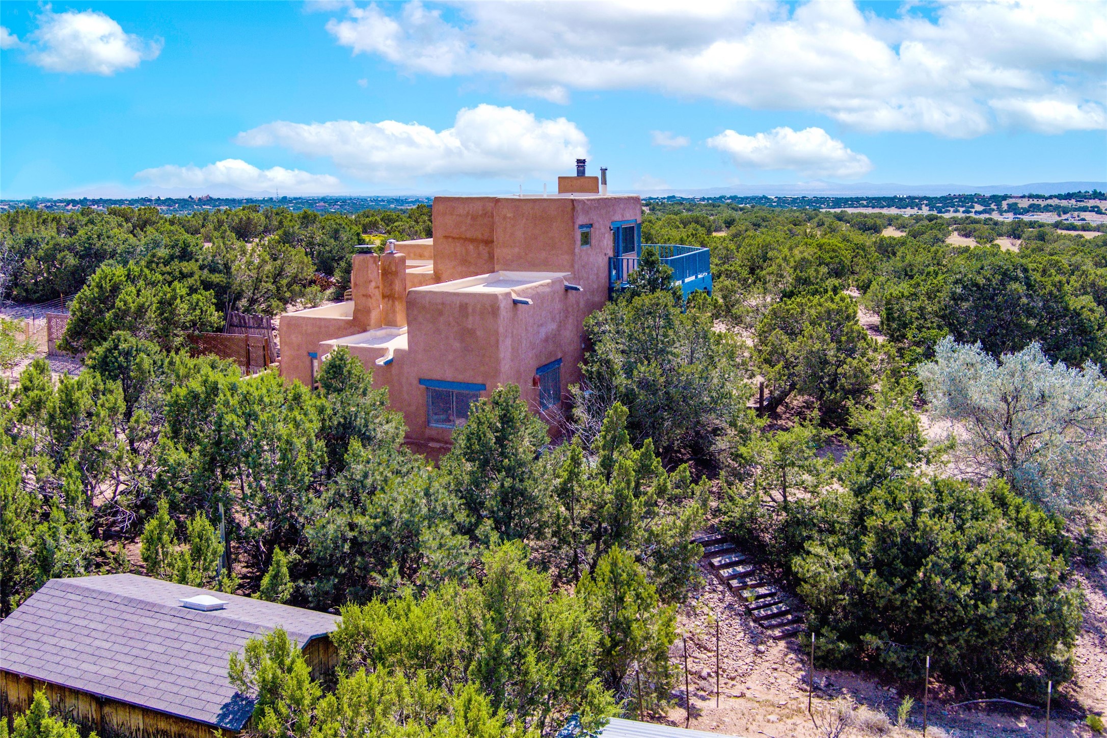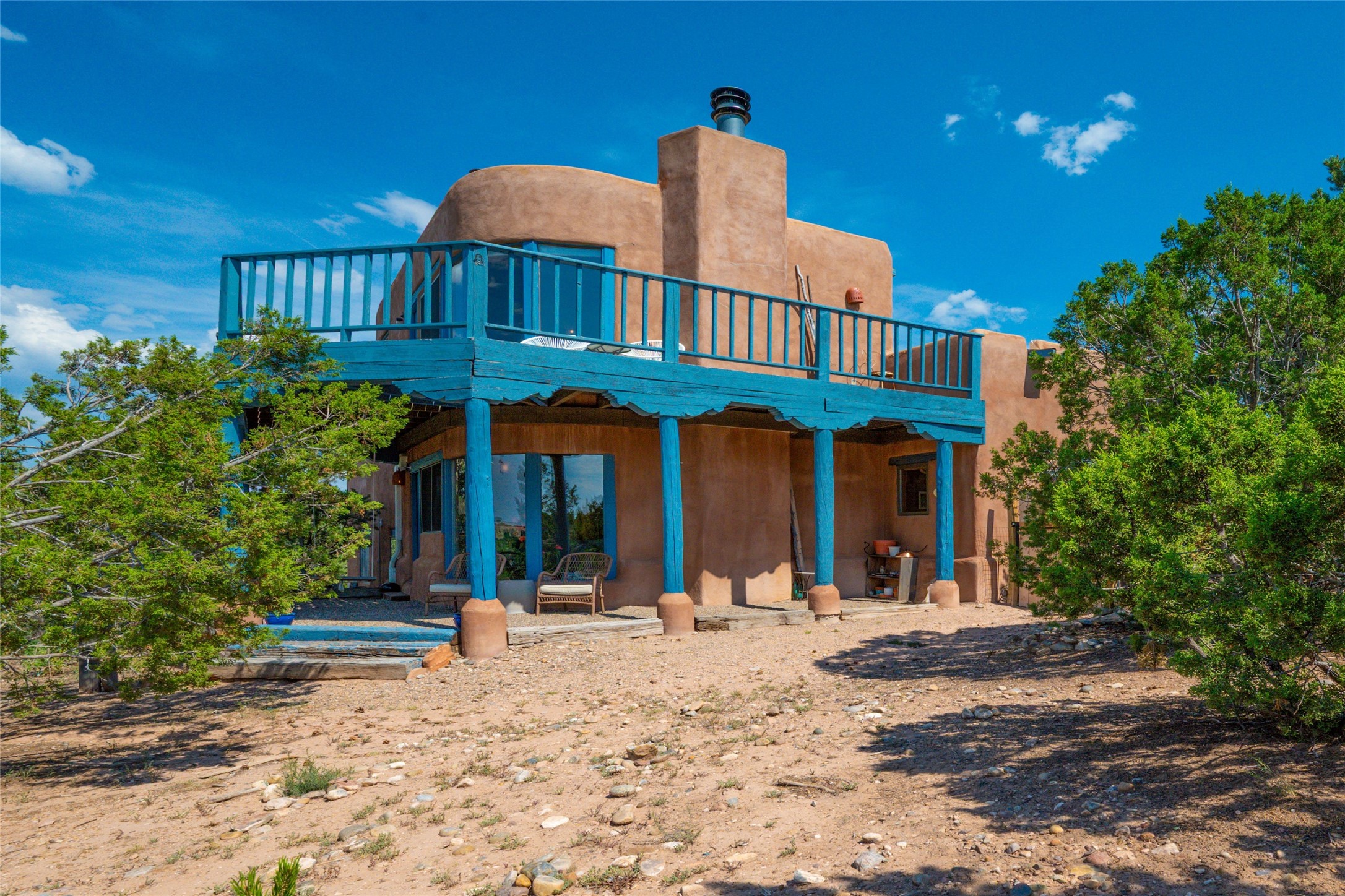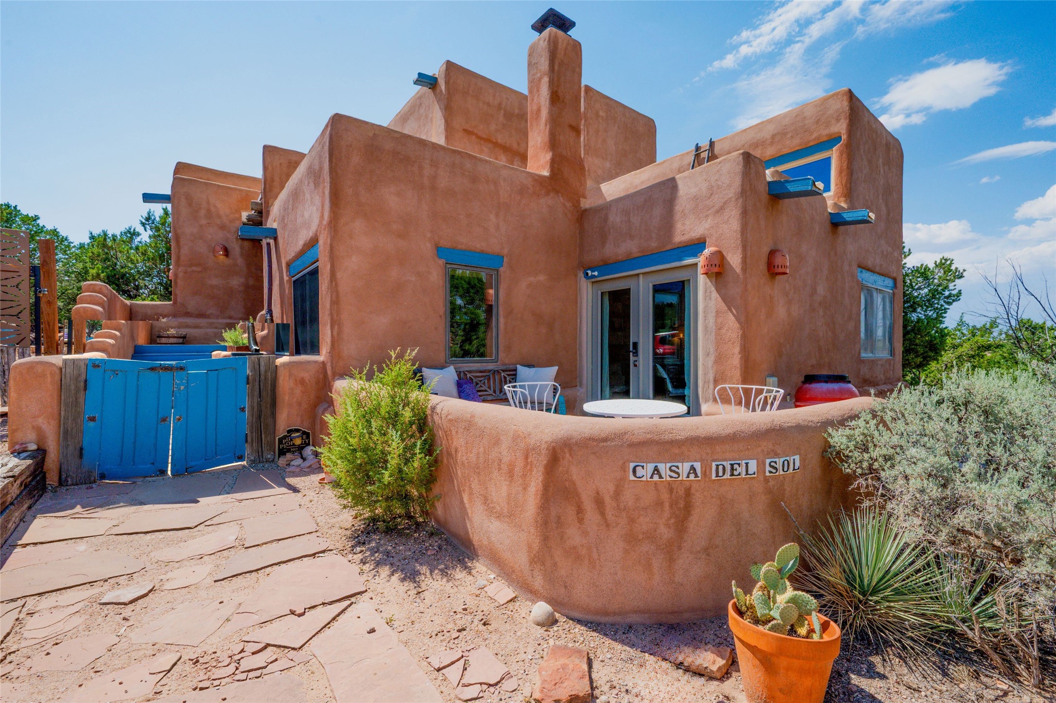 Located on 1.25 acres, a mere 4 miles from the Plaza, Casa del Sol feels like country living ten minutes from town. The Casa has 3 bedrooms and 2 full baths, ample privacy, stunning mountain views, and fantastic light. This classic Pueblo style adobe home was built by hand by artist Paul Glickman with careful attention to detail. You'll find all the classic finishes - vigas and beams, high ceilings, corbels, pretty wood doors, Saltillo tile floors, nichos and 4 fireplaces- kivas and 2 wood burning stoves. The main living areas have an open feel between kitchen, dining and living, as well as high ceilings with clerestory windows for added light and passive solar gain. The South-facing flagstone patio off the kitchen, as well as the Northwest outdoor area off the living room, are perfect for indoor and outdoor living and entertaining. A highlight of this home is the Loretto-inspired wooden spiral staircase to the second-floor primary bedroom, with custom bamboo floors, a wood-burning stove, and an ensuite bath. Outside the upstairs bedroom, a wrap-around deck makes it easy to enjoy big sunset and sunrise views. Down a few steps from the front entry is the guest bedroom, offering good separation and privacy, as well as a cozy corner kiva fireplace. The third bedroom, with its separate entry, can serve several functions: home office, guest suite, den, or studio, and has a wood stove insert in the fireplace as well as a sink. With the adobe construction and a mini split for cooling, the house stays comfortable in winter and summer. A ground-mount solar array provides a surplus of energy almost every month. The property is zoned for livestock, with space for a corral. Brand new roof fall of 2025, with 10 year transferrable warranty! This home is a special retreat, with its charm, exquisite craftsmanship, and stunning views in a tranquil, beautiful, and natural setting. Casa del Sol is one of a kind.
