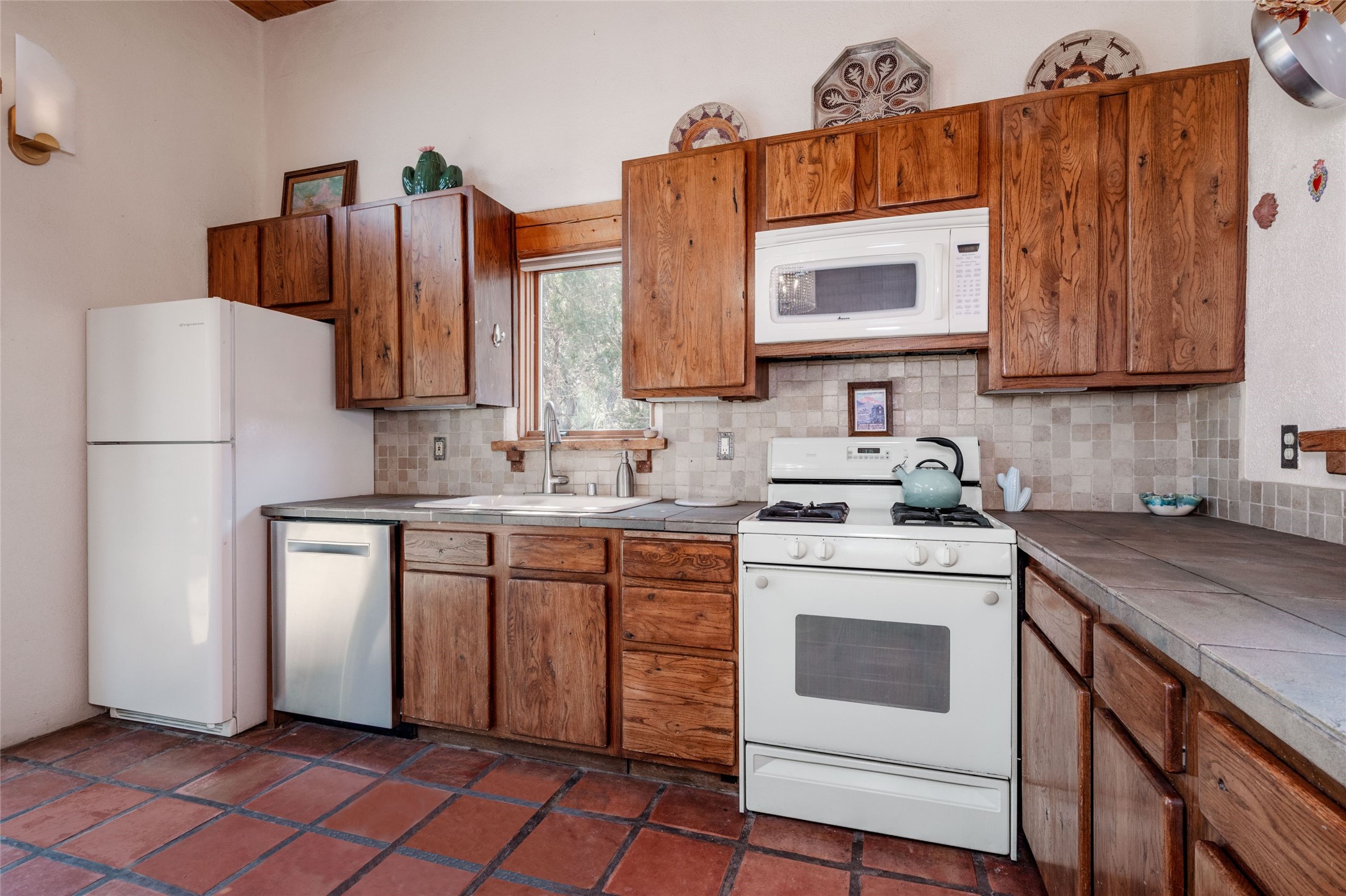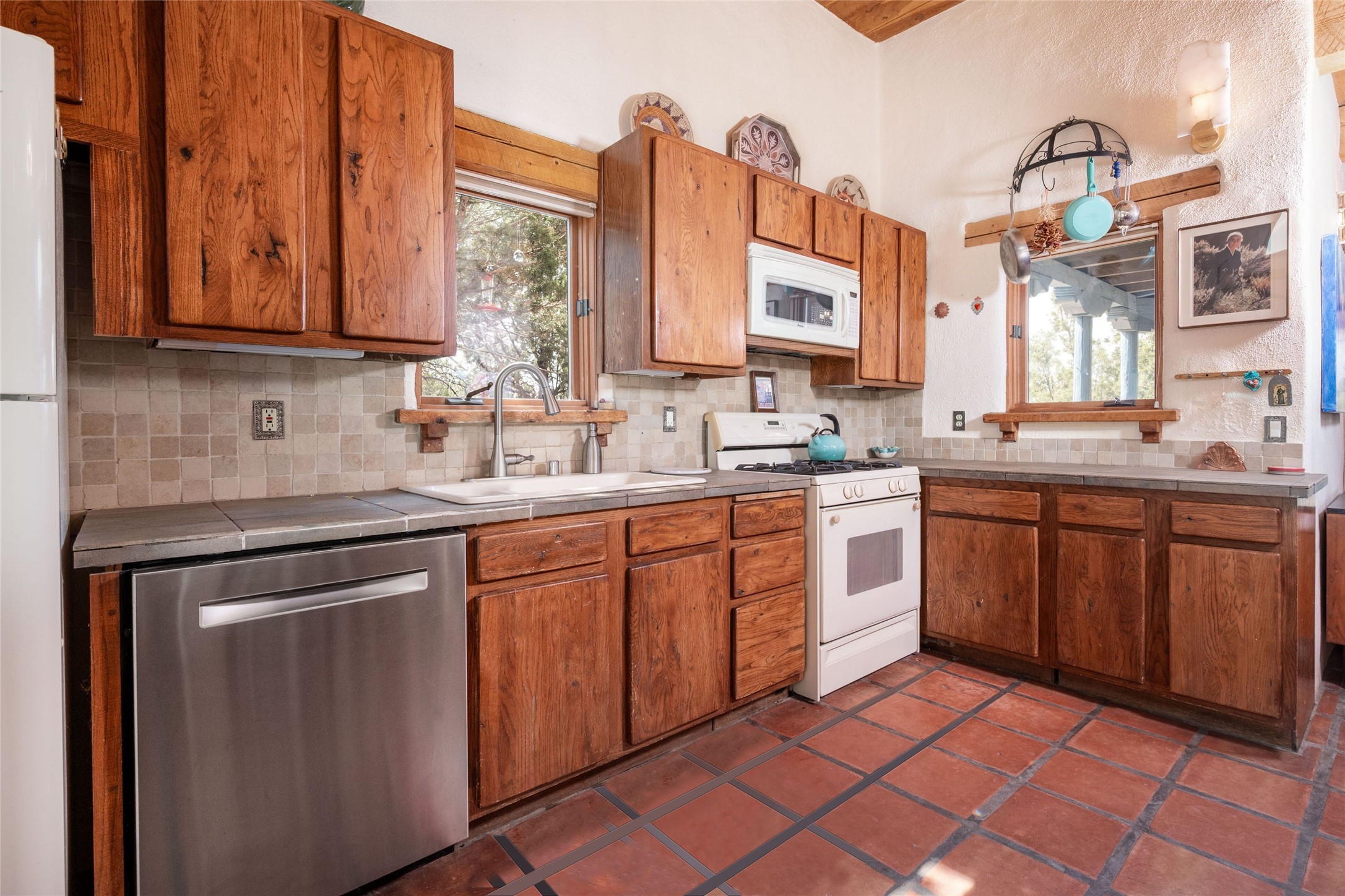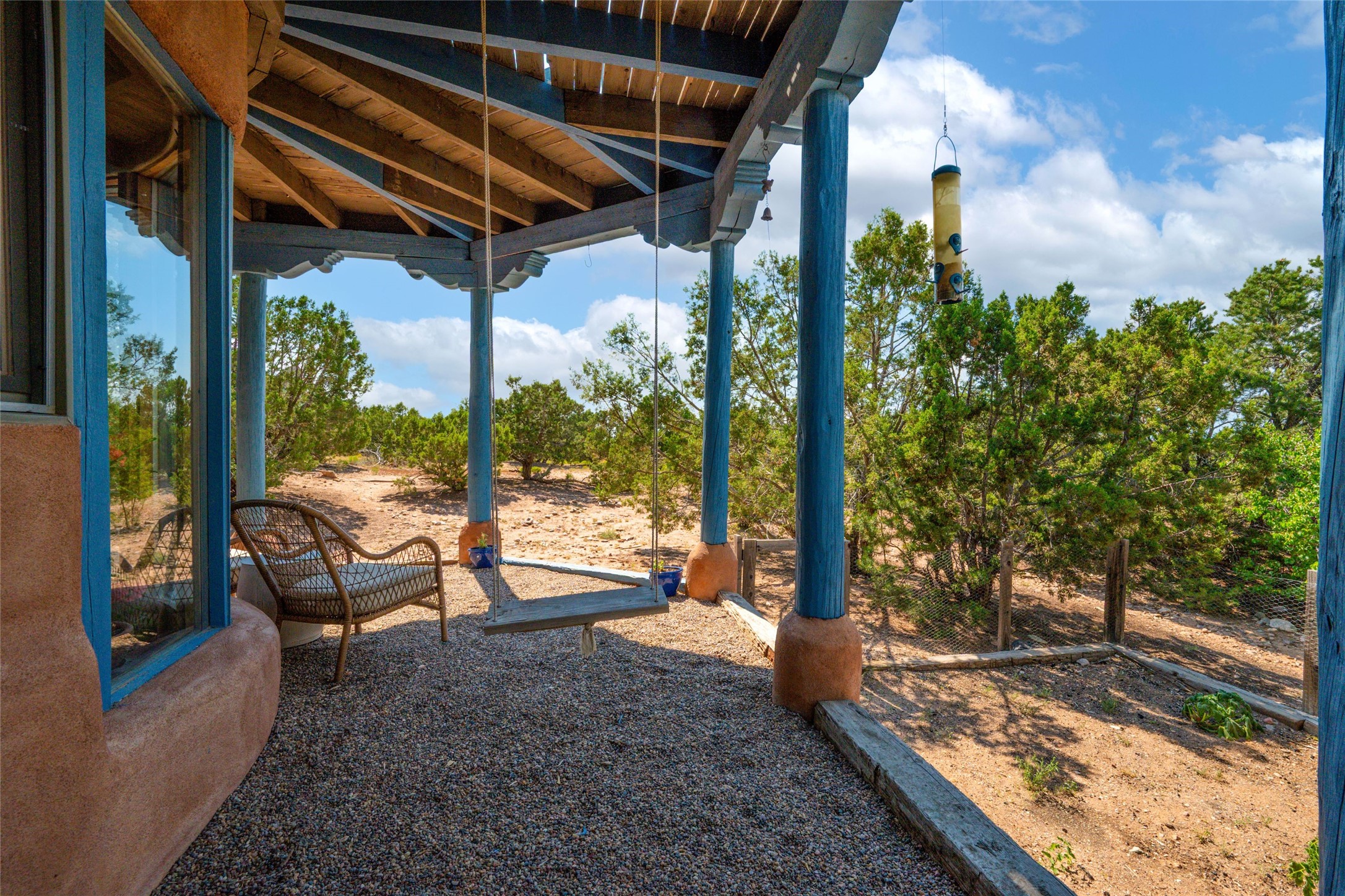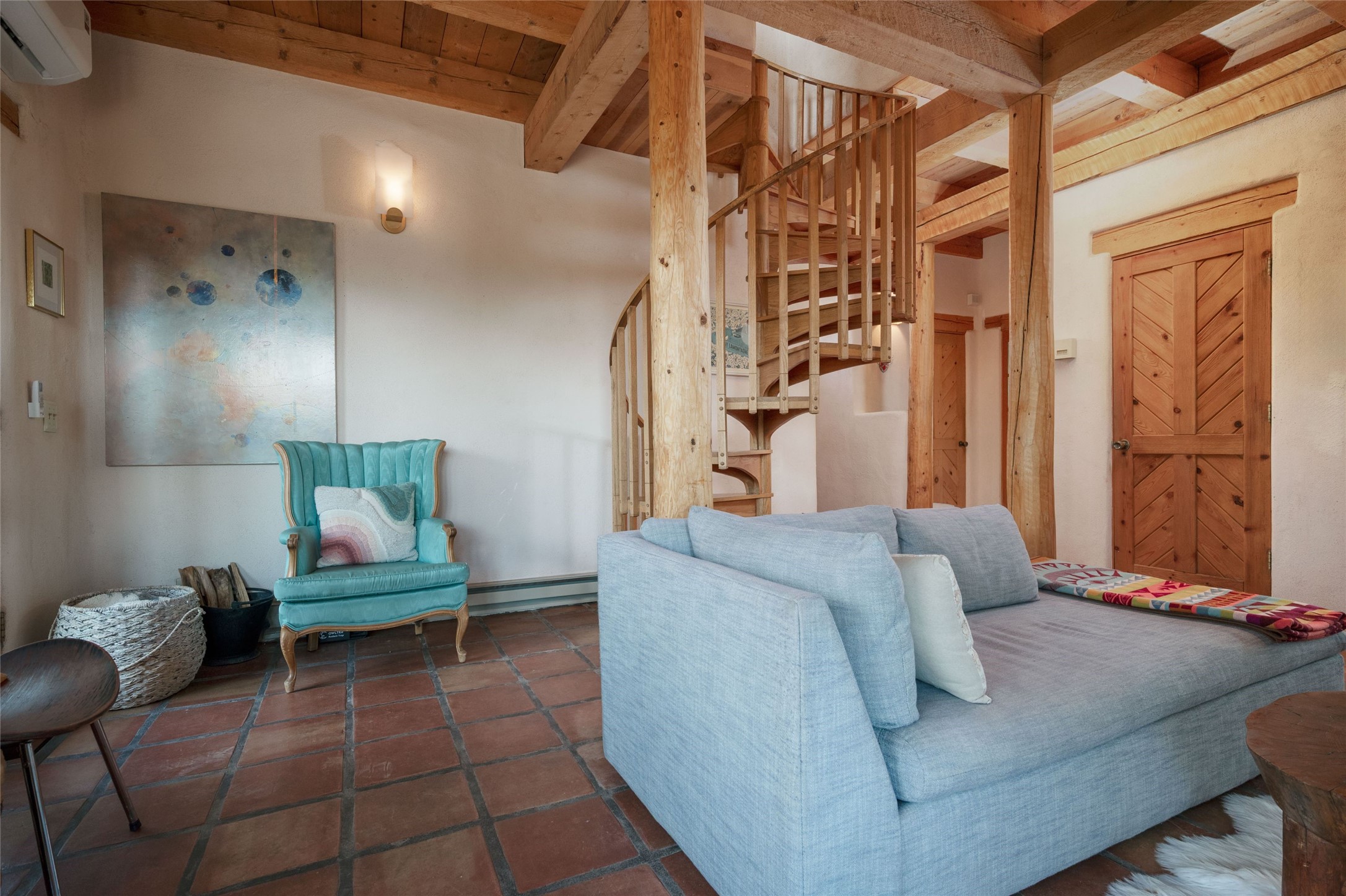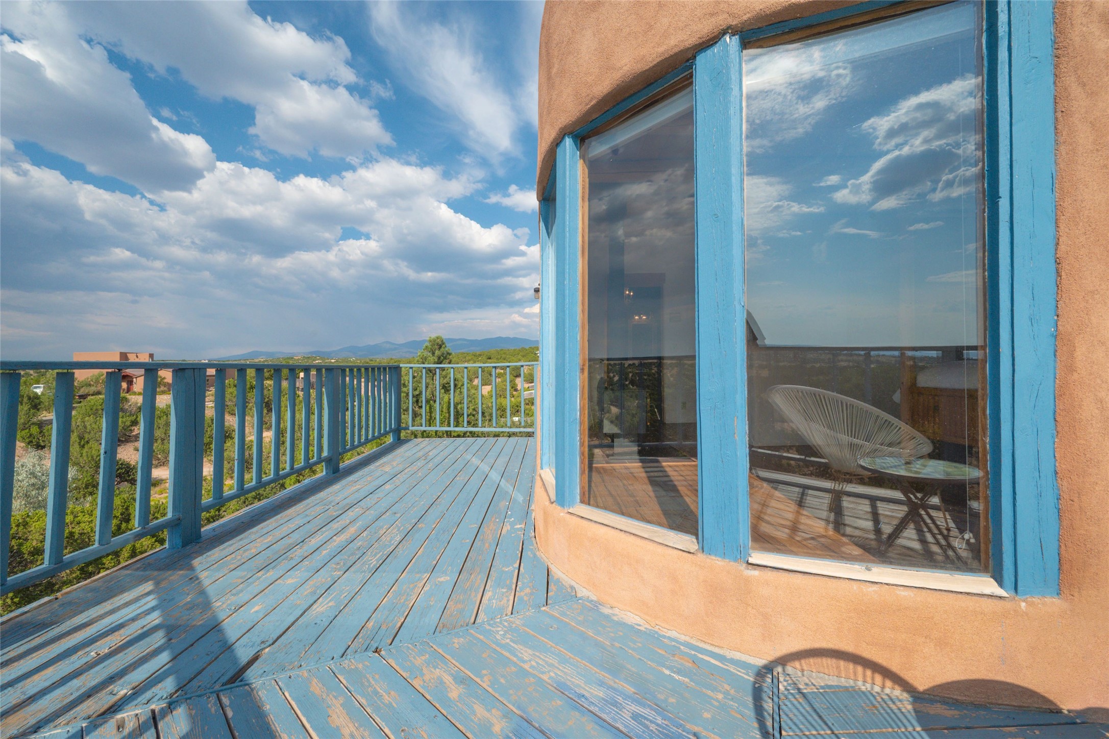 Located on 1.25 acres, a mere 4 miles from the Plaza, Casa del Sol feels like country living ten minutes from town. The Casa has 3 bedrooms and 2 full baths, ample privacy, stunning mountain views, and fantastic light. This classic Pueblo style adobe home was built by hand by artist Paul Glickman with careful attention to detail. You'll find all the classic finishes - vigas and beams, high ceilings, corbels, pretty wood doors, Saltillo tile floors, nichos and 4 fireplaces- kivas and 2 wood burning stoves. The main living areas have an open feel between kitchen, dining and living, as well as high ceilings with clerestory windows for added light and passive solar gain. The South-facing flagstone patio off the kitchen, as well as the Northwest outdoor area off the living room, are perfect for indoor and outdoor living and entertaining. A highlight of this home is the Loretto-inspired wooden spiral staircase to the second-floor primary bedroom, with custom bamboo floors, a wood-burning stove, and an ensuite bath. Outside the upstairs bedroom, a wrap-around deck makes it easy to enjoy big sunset and sunrise views. Down a few steps from the front entry is the guest bedroom, offering good separation and privacy, as well as a cozy corner kiva fireplace. The third bedroom, with its separate entry, can serve several functions: home office, guest suite, den, or studio, and has a wood stove insert in the fireplace as well as a sink. With the adobe construction and a mini split for cooling, the house stays comfortable in winter and summer. A ground-mount solar array provides a surplus of energy almost every month. The property is zoned for livestock, with space for a corral. Brand new roof fall of 2025, with 10 year transferrable warranty! This home is a special retreat, with its charm, exquisite craftsmanship, and stunning views in a tranquil, beautiful, and natural setting. Casa del Sol is one of a kind.