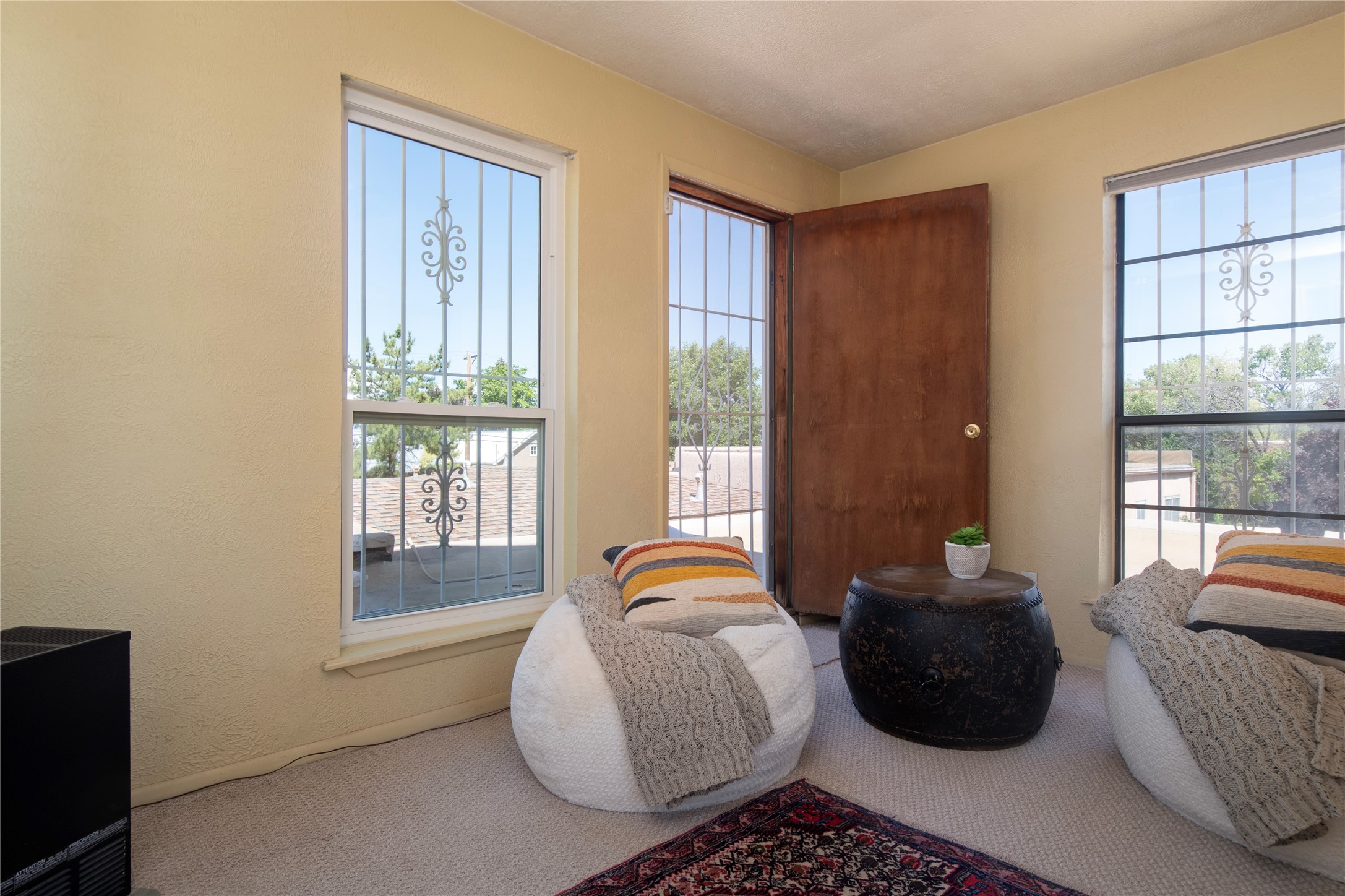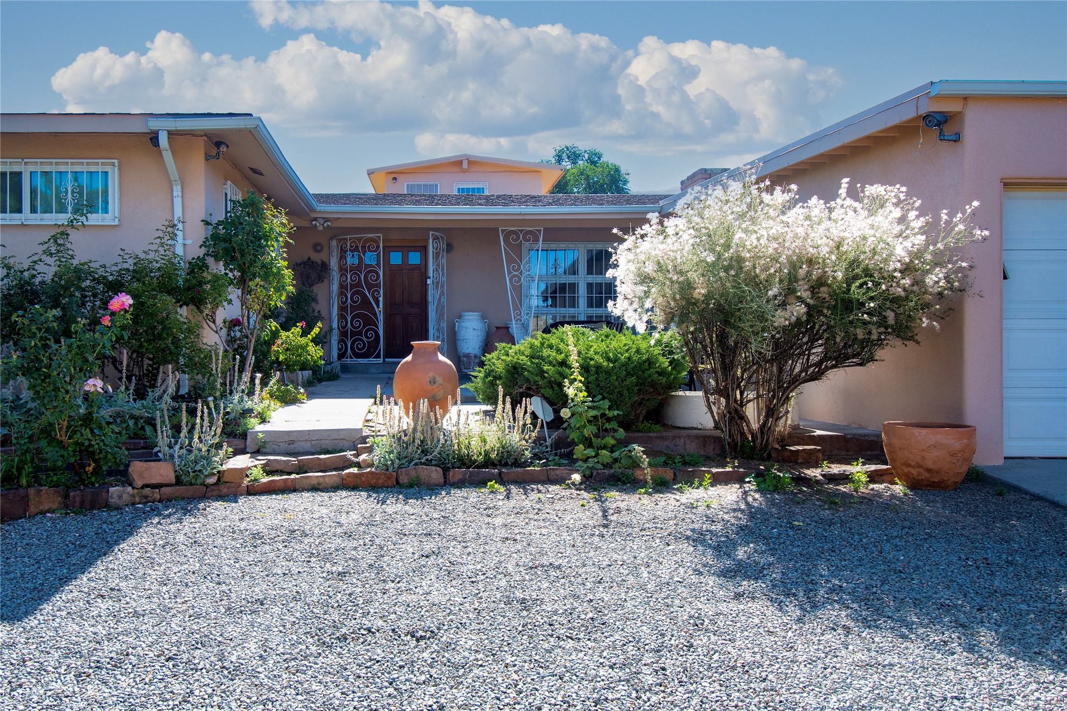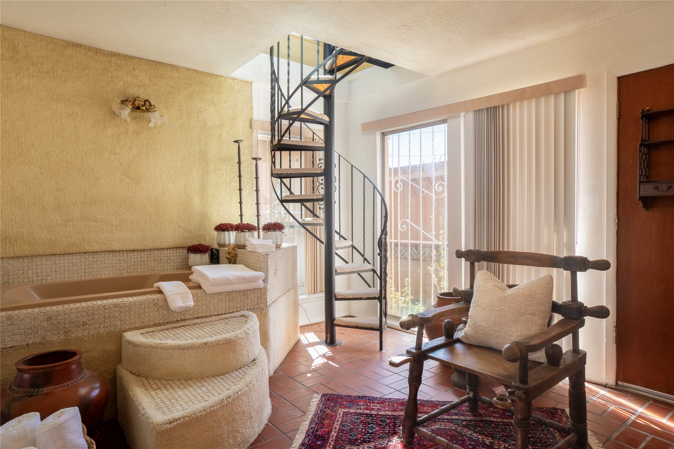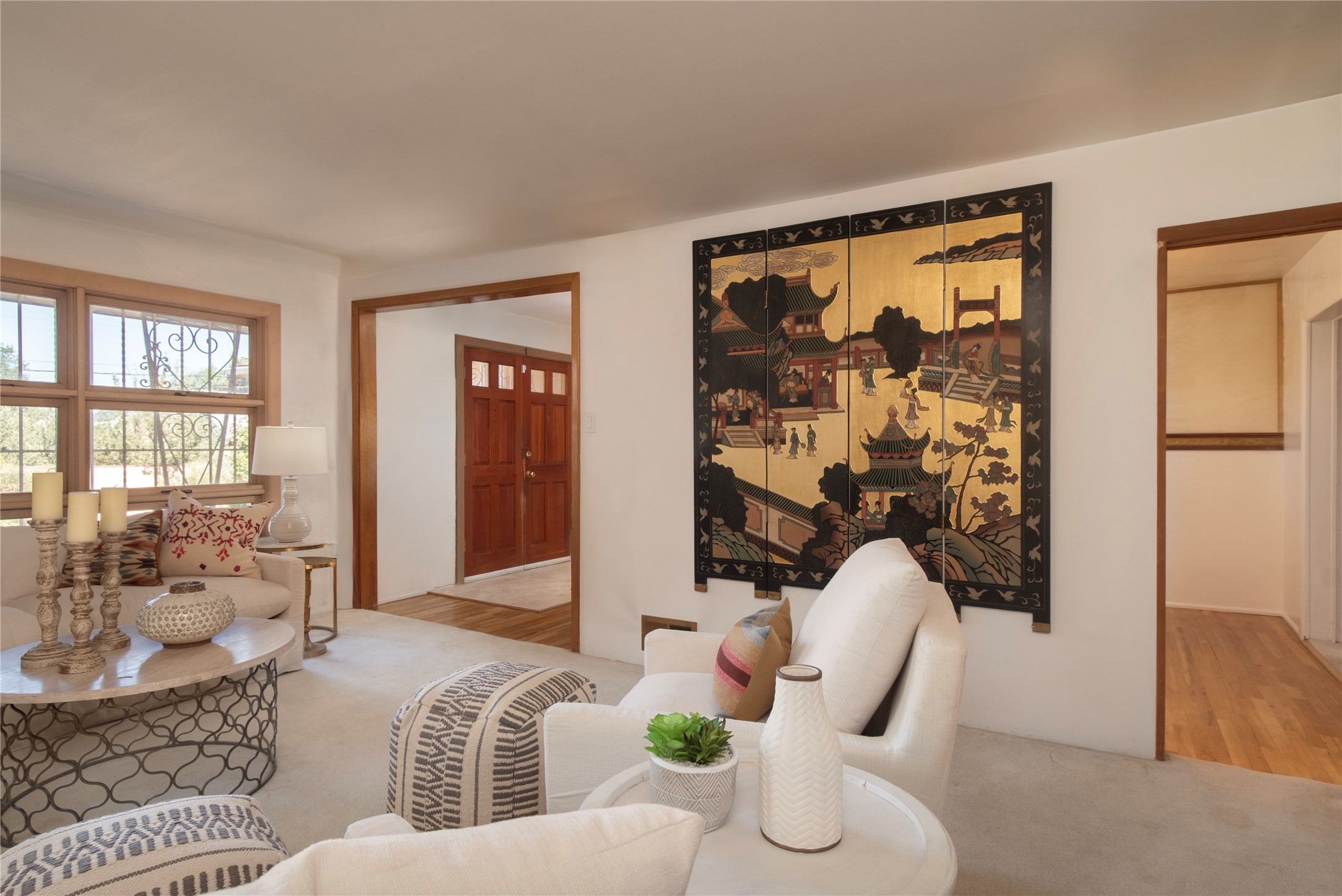 This charming residence located at 1011 Don Gaspar Ave offers a warm and inviting atmosphere with its thoughtfully designed layout and appealing features. The main house boasts three spacious bedrooms and three bathrooms, providing ample space for family and guests. The large, cozy living room is a highlight that creates a welcoming ambiance, perfect for relaxing evenings. Adjacent to the living area is a quaint dining room, ideal for intimate dinners or entertaining friends. The eat-in kitchen is both functional and charming, equipped with enough space for casual family meals and meal preparation. The upstairs of the main house is a versatile space, perfect for use as a meditation or yoga room, offering tranquil views to the west and northeast that enhance relaxation and mindfulness. The property's outdoor areas are equally impressive, with a large inviting patio and grilling area, perfect for outdoor gatherings and enjoying the pleasant New Mexico climate. Two storage buildings are situated at the back of the house, providing convenient space for storage or hobbies. Privacy is a key feature of this property, as it is securely walled off, ensuring a secluded environment. The backyard is designed for outdoor enjoyment and entertaining. Additionally, there is a separate guest house that includes a bedroom, bathroom, and a delightful kitchen, along with an outdoor area that invites relaxation and socializing. The property's location offers easy access to downtown Santa Fe and Canyon Road, making it convenient for exploring local art, culture, and dining options. This property combines comfort, privacy, and functionality, making it an ideal retreat in the Capitol District.