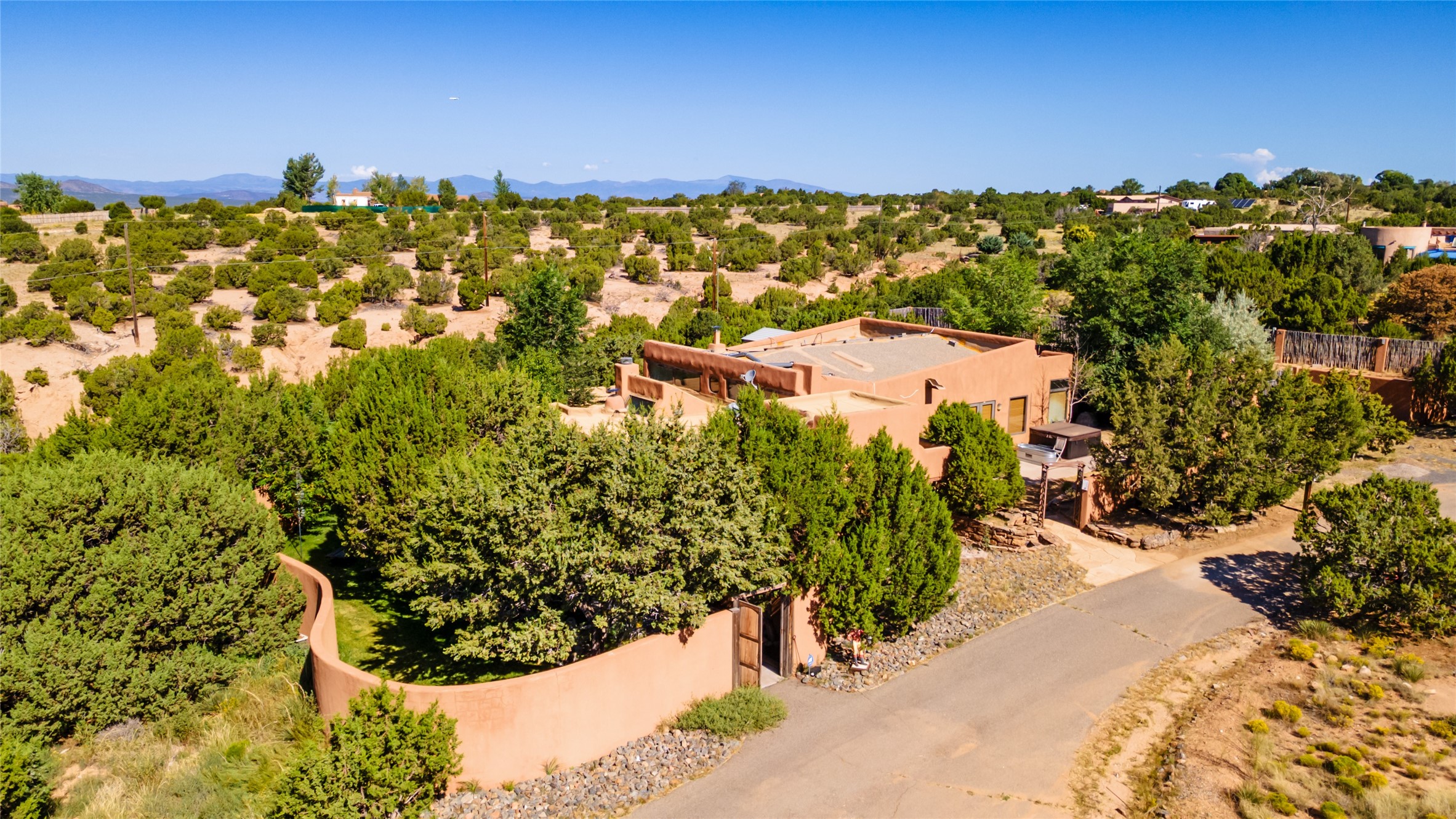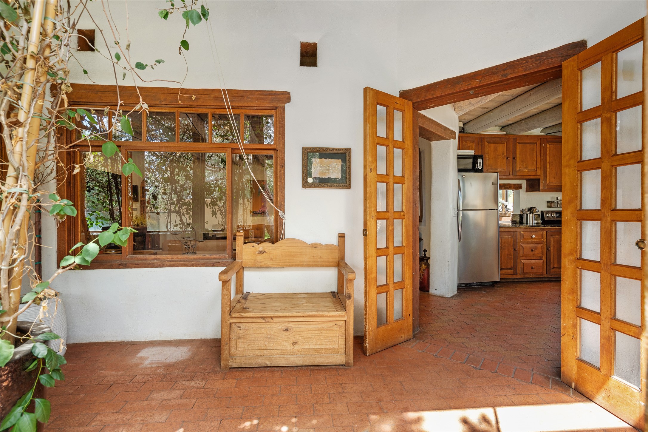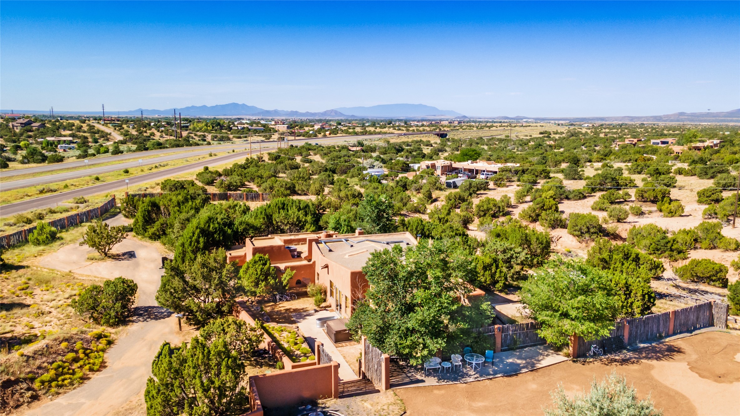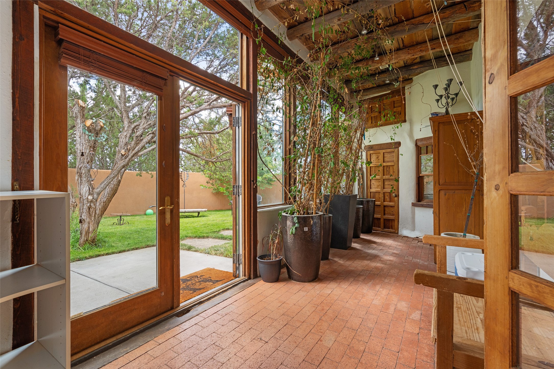 Price Improved below appraisal!!! This home has gorgeous land and NO HOA fees for restrictions!! Lovely Santa Fe estate blends traditional adobe charm with modern comfort. A coyote fence outlines the entry and welcomes you to a light-filled sunroom that seamlessly connects indoor and outdoor spaces. The original adobe home features classic Santa Fe details--exposed vigas, rough-sawn ceilings, a kiva fireplace, banco seating, and brick floors. A 2004 addition introduced a barrel-ceiling hallway linking a 5-bedroom, 4-bath layout. The flexible office/5th bedroom with its own bath and fireplace opens to a private courtyard. The primary suite offers a spa-like retreat with dual vanities, a corner tub, and a walk-in closet. Bright, tastefully tiled bathrooms add charm throughout. Outside, mature trees, xeriscaping, and irrigated courtyards provide serene spaces for gathering, gardening, or sunset views. With easy access to town, this home is both a tranquil retreat and a convenient base for enjoying Santa Fe. Your animals are welcome!!!!