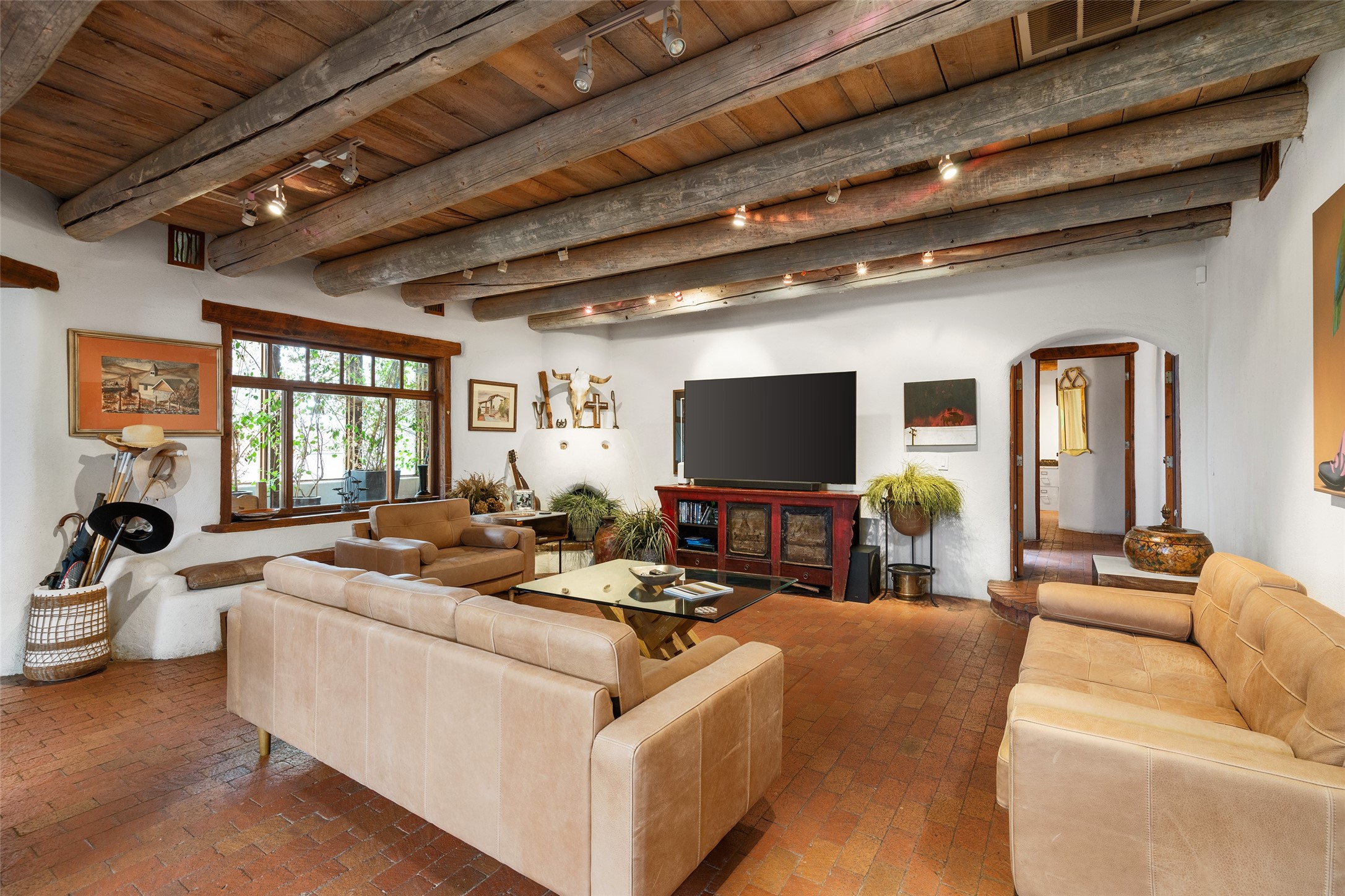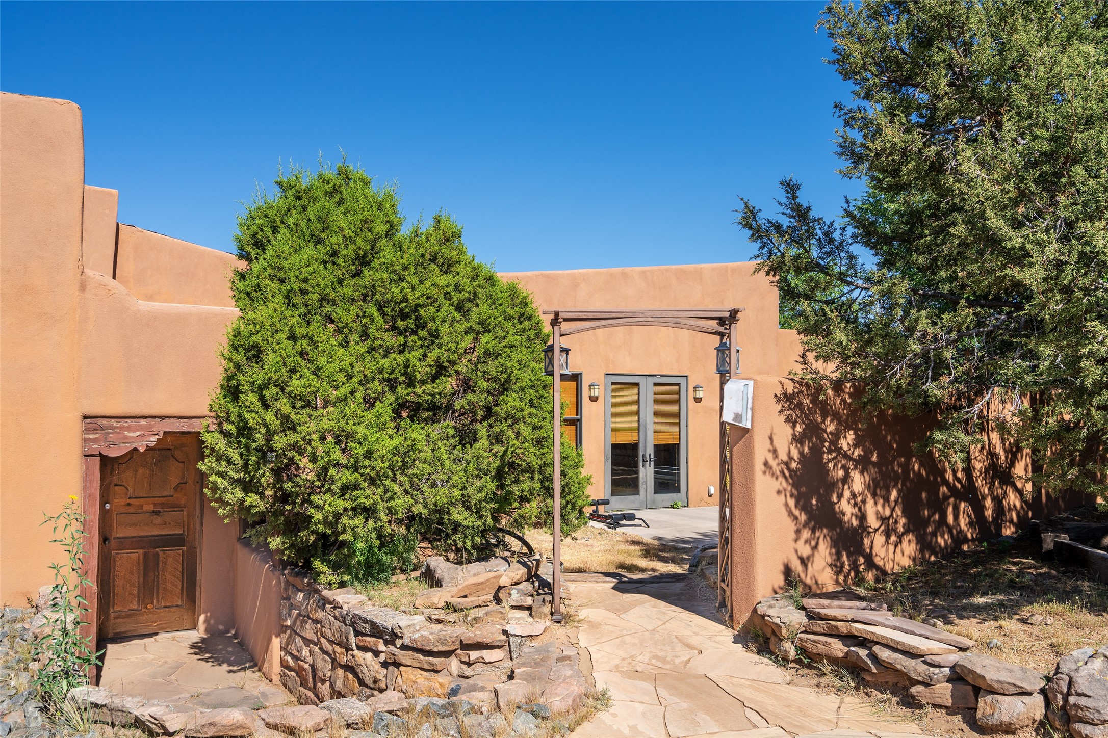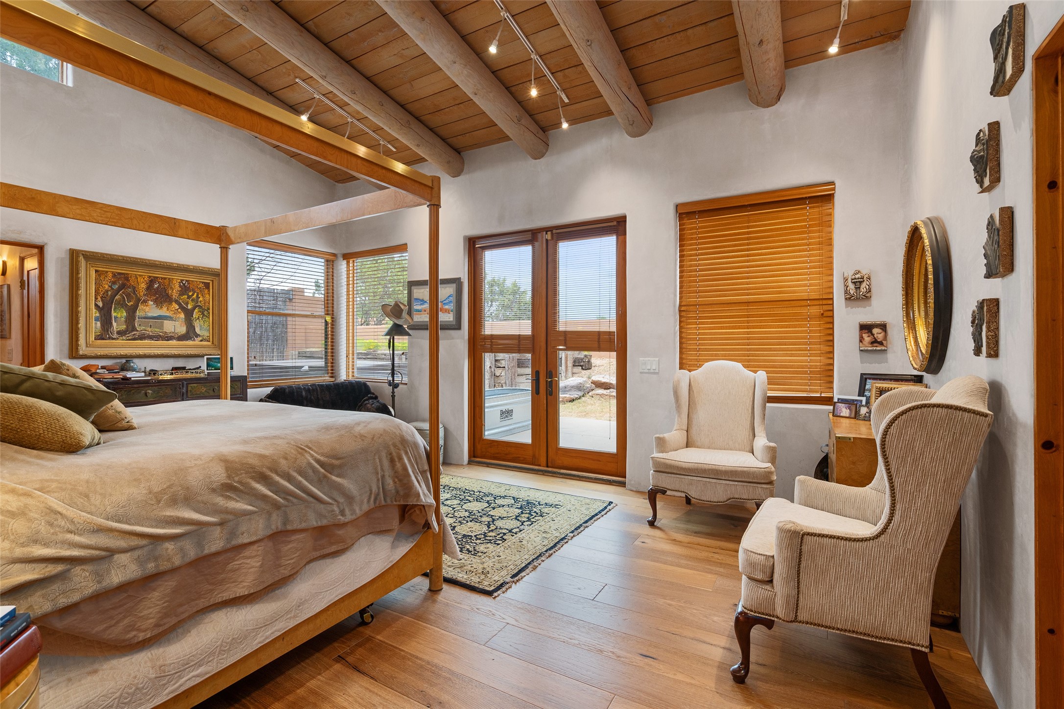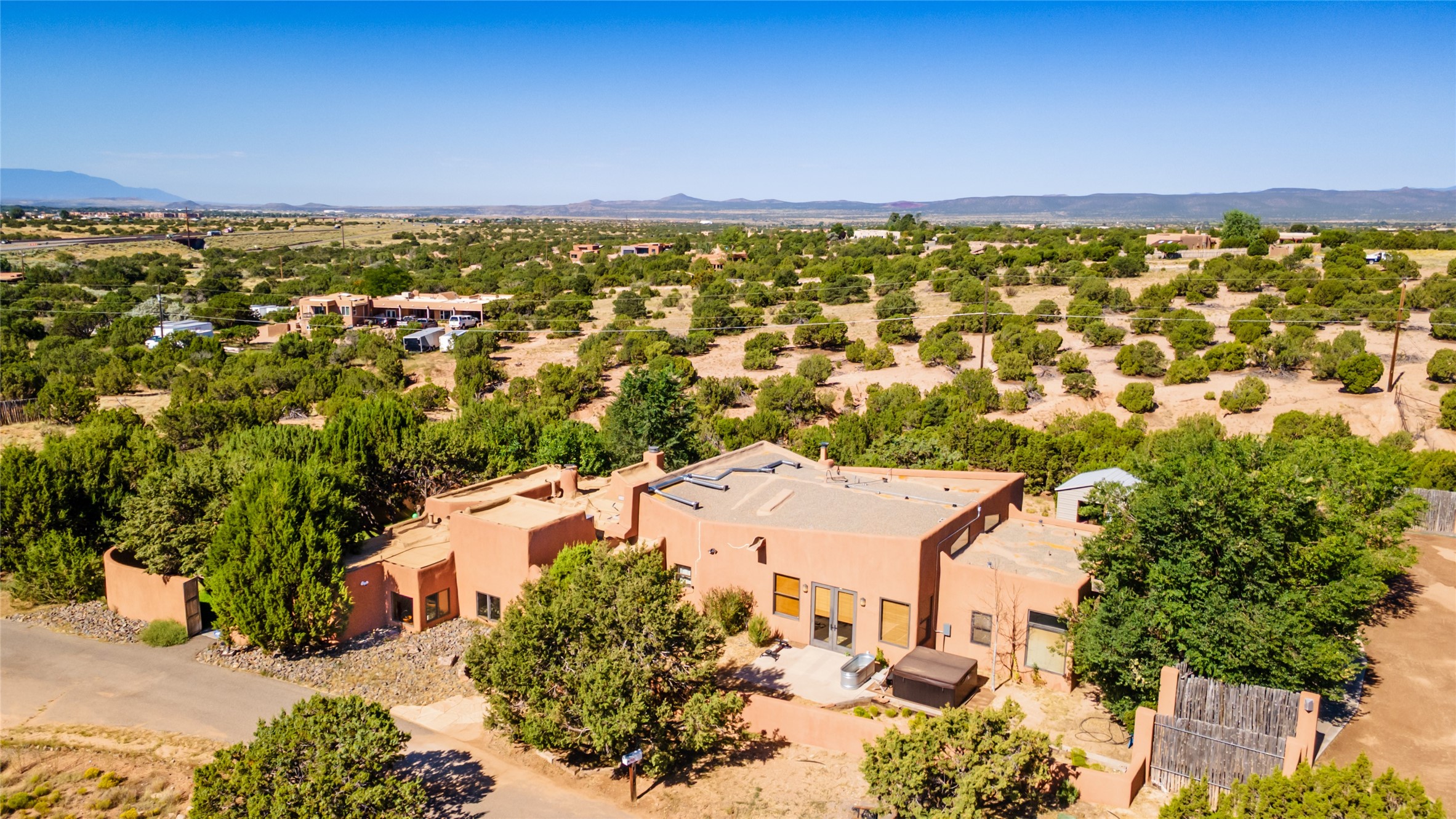 Price Improved below appraisal!!! This home has gorgeous land and NO HOA fees for restrictions!! Lovely Santa Fe estate blends traditional adobe charm with modern comfort. A coyote fence outlines the entry and welcomes you to a light-filled sunroom that seamlessly connects indoor and outdoor spaces. The original adobe home features classic Santa Fe details--exposed vigas, rough-sawn ceilings, a kiva fireplace, banco seating, and brick floors. A 2004 addition introduced a barrel-ceiling hallway linking a 5-bedroom, 4-bath layout. The flexible office/5th bedroom with its own bath and fireplace opens to a private courtyard. The primary suite offers a spa-like retreat with dual vanities, a corner tub, and a walk-in closet. Bright, tastefully tiled bathrooms add charm throughout. Outside, mature trees, xeriscaping, and irrigated courtyards provide serene spaces for gathering, gardening, or sunset views. With easy access to town, this home is both a tranquil retreat and a convenient base for enjoying Santa Fe. Your animals are welcome!!!!