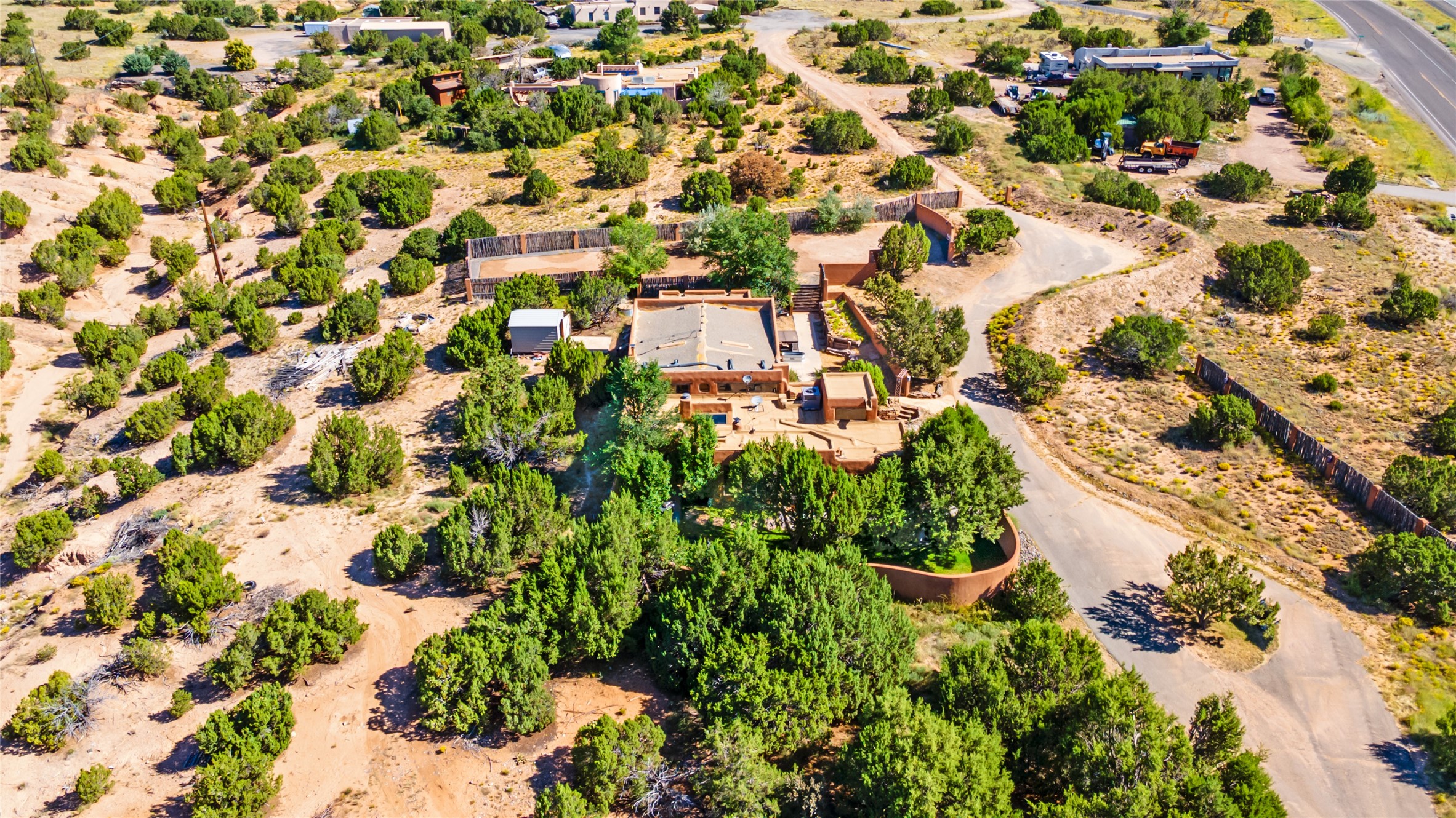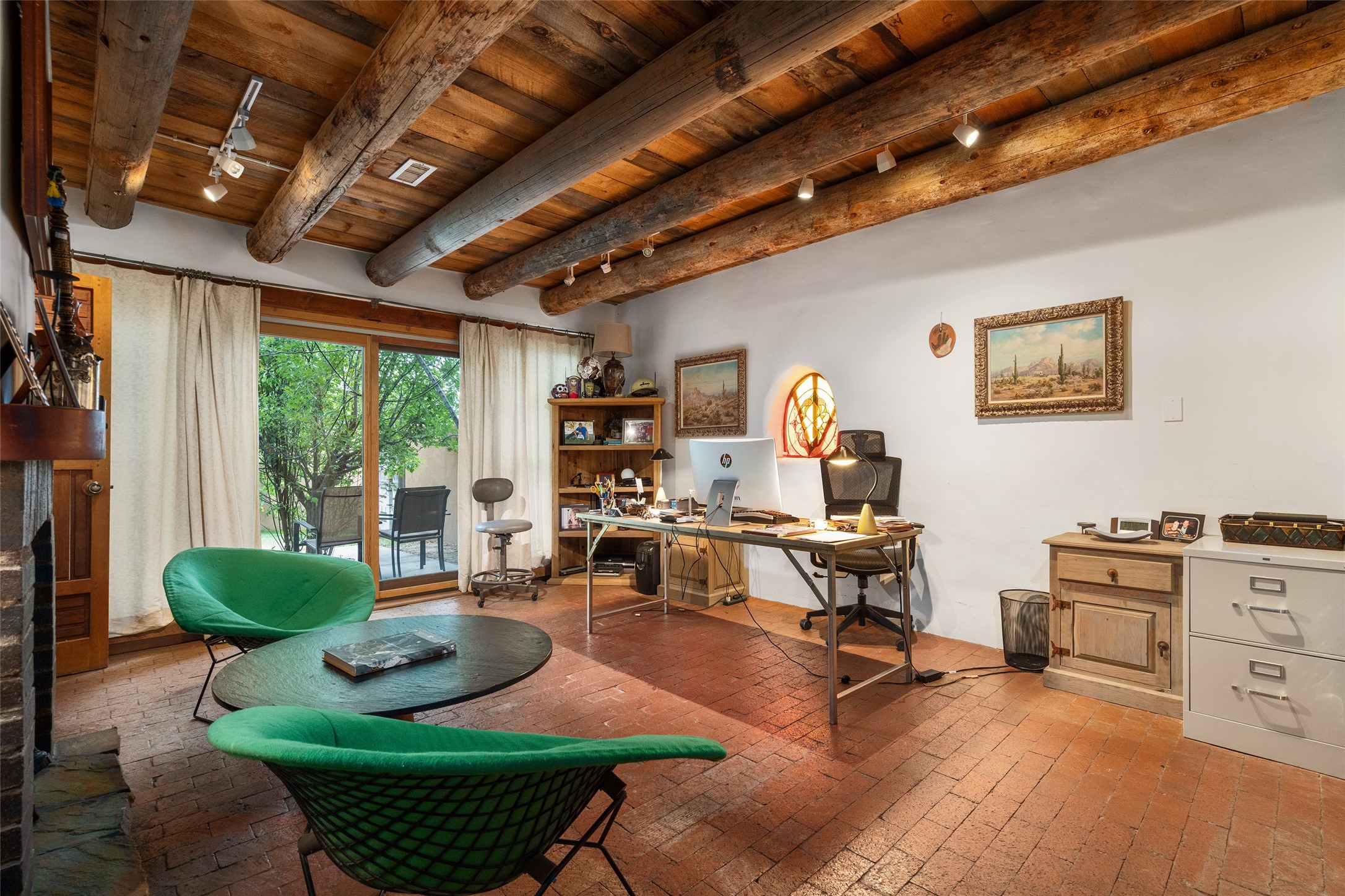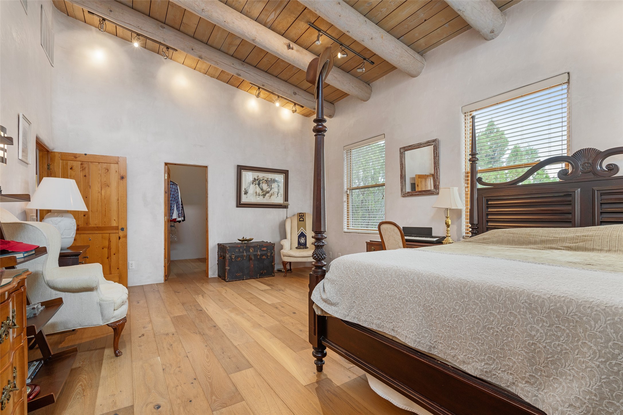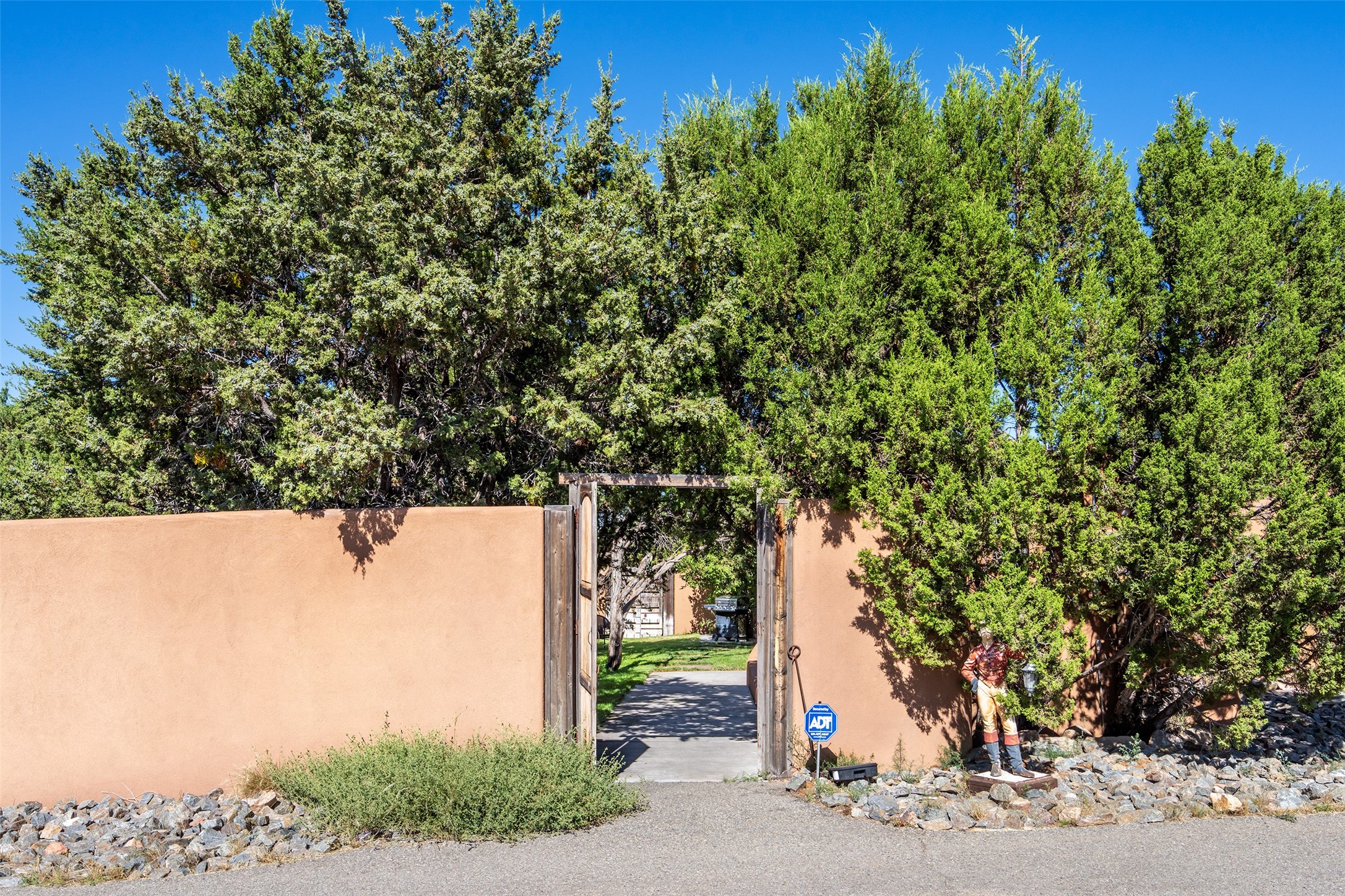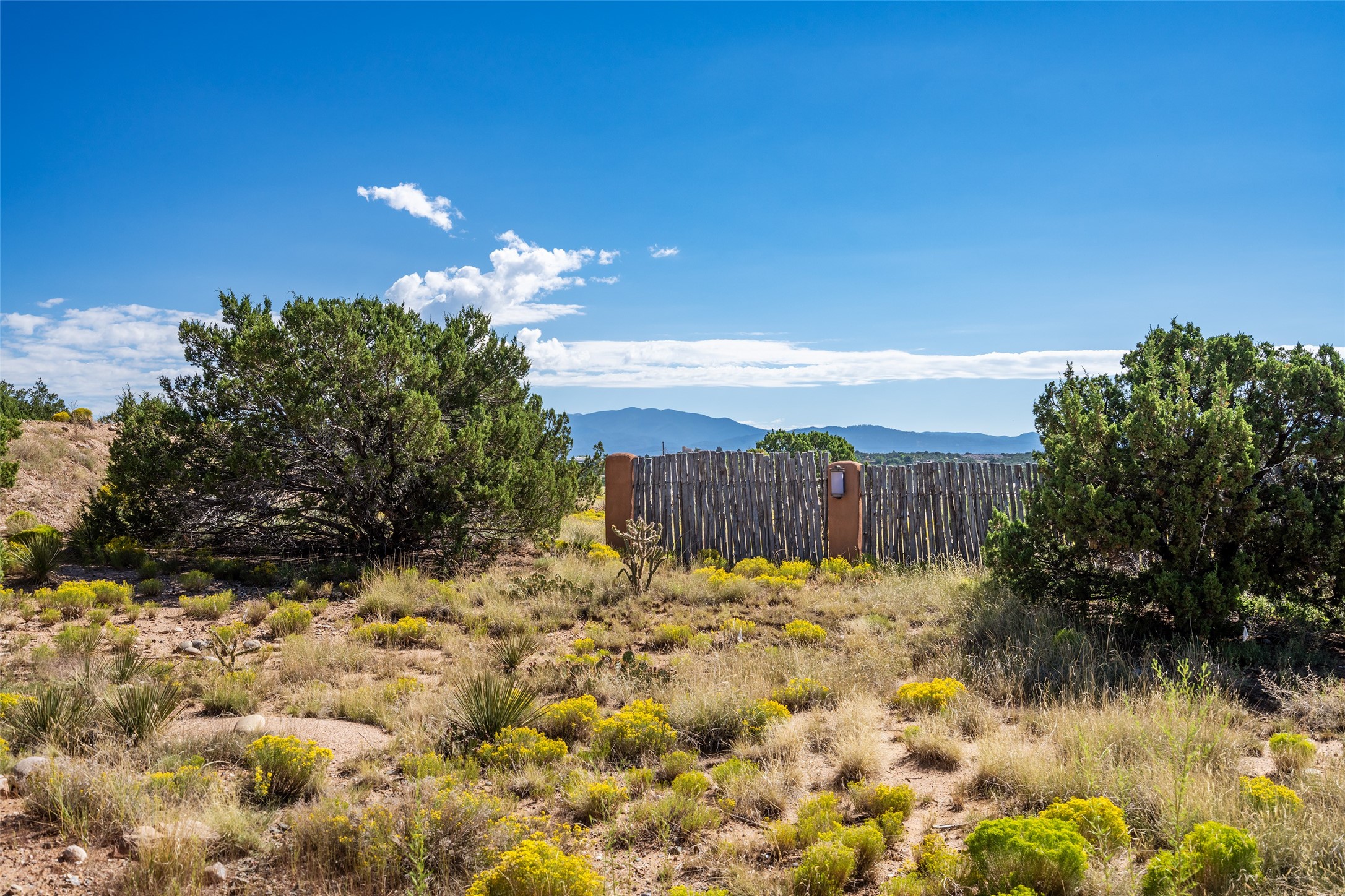 Price Improved below appraisal!!! This home has gorgeous land and NO HOA fees for restrictions!! Lovely Santa Fe estate blends traditional adobe charm with modern comfort. A coyote fence outlines the entry and welcomes you to a light-filled sunroom that seamlessly connects indoor and outdoor spaces. The original adobe home features classic Santa Fe details--exposed vigas, rough-sawn ceilings, a kiva fireplace, banco seating, and brick floors. A 2004 addition introduced a barrel-ceiling hallway linking a 5-bedroom, 4-bath layout. The flexible office/5th bedroom with its own bath and fireplace opens to a private courtyard. The primary suite offers a spa-like retreat with dual vanities, a corner tub, and a walk-in closet. Bright, tastefully tiled bathrooms add charm throughout. Outside, mature trees, xeriscaping, and irrigated courtyards provide serene spaces for gathering, gardening, or sunset views. With easy access to town, this home is both a tranquil retreat and a convenient base for enjoying Santa Fe. Your animals are welcome!!!!
