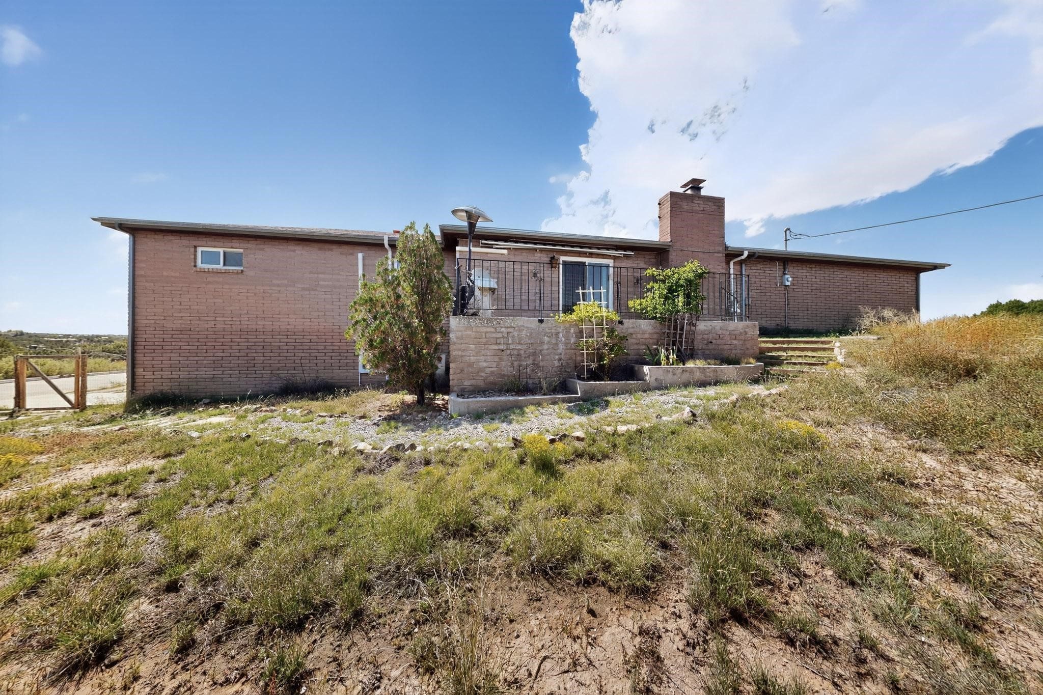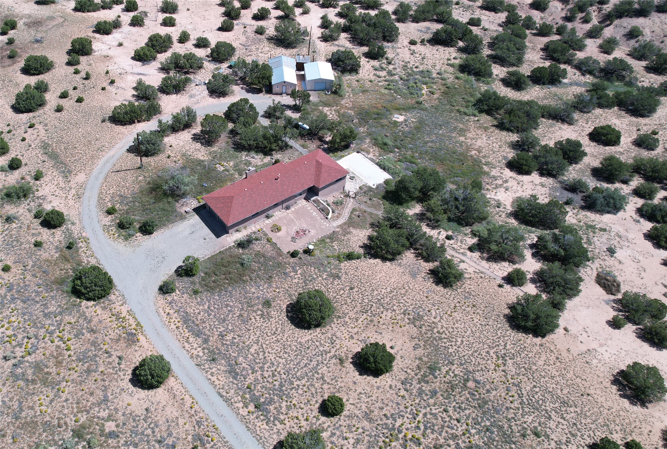 Experience the stunning high desert of Santa Fe in a solid home with a practical floor plan and plenty of elbow room. Enjoying easy access from State Road 14 but set back from the road for privacy and quiet, this property includes a separate shop and garage type outbuildings. 10 acres provides excellent space for expansion. The upper level contains three bedrooms and an attached, oversized two car garage. The lower level can be separated to serve as it's own apartment, with a bedroom, a bathroom a cooking area and a living area and it's own exterior entry. This home will serve superbly for a wide assortment of lifestyles.