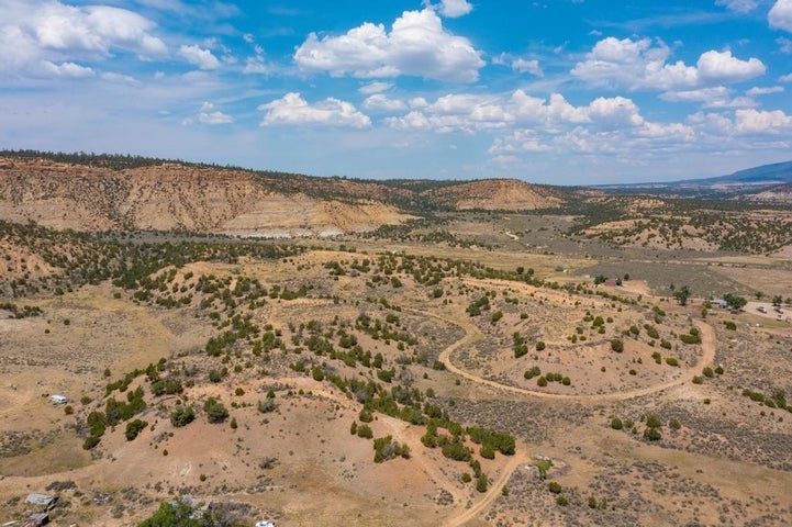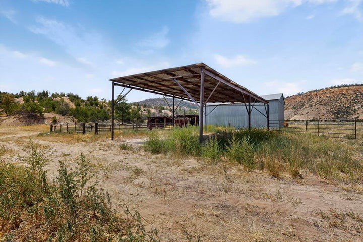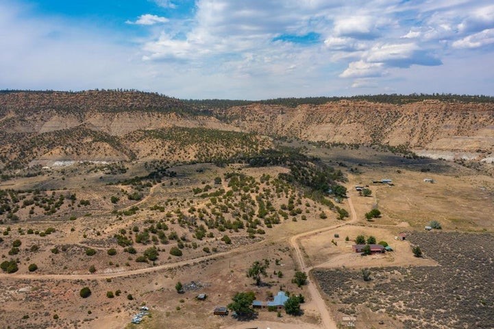 This versatile 81 acre property nestled in a peaceful canyon surrounded by grand mesas, abuts a 'hike-in' area of the Santa Fe National Forest to the west and BLM land to the north! Plenty of potential for horses, hunting, livestock and more. Watch Elk graze right outside your front porch while enjoying magnificent sunrises and sunsets. There is source of gravel and petrified wood is prevalent. Outbuildings include a shop/garage/storage 20'W x 40'D x 12'H (approx),a detached two level cellar/storage building, a tack room, a horse corral plus shaded area and more. The house has a propane line running to it.