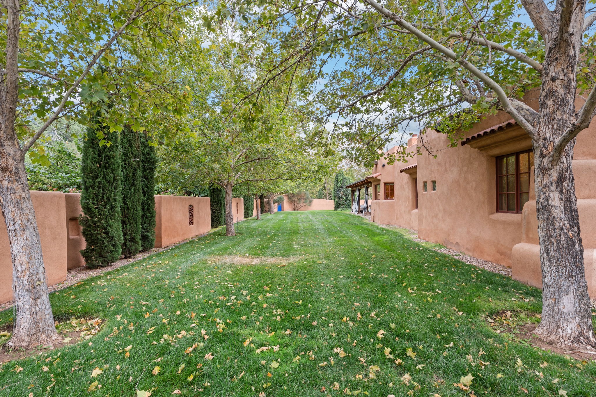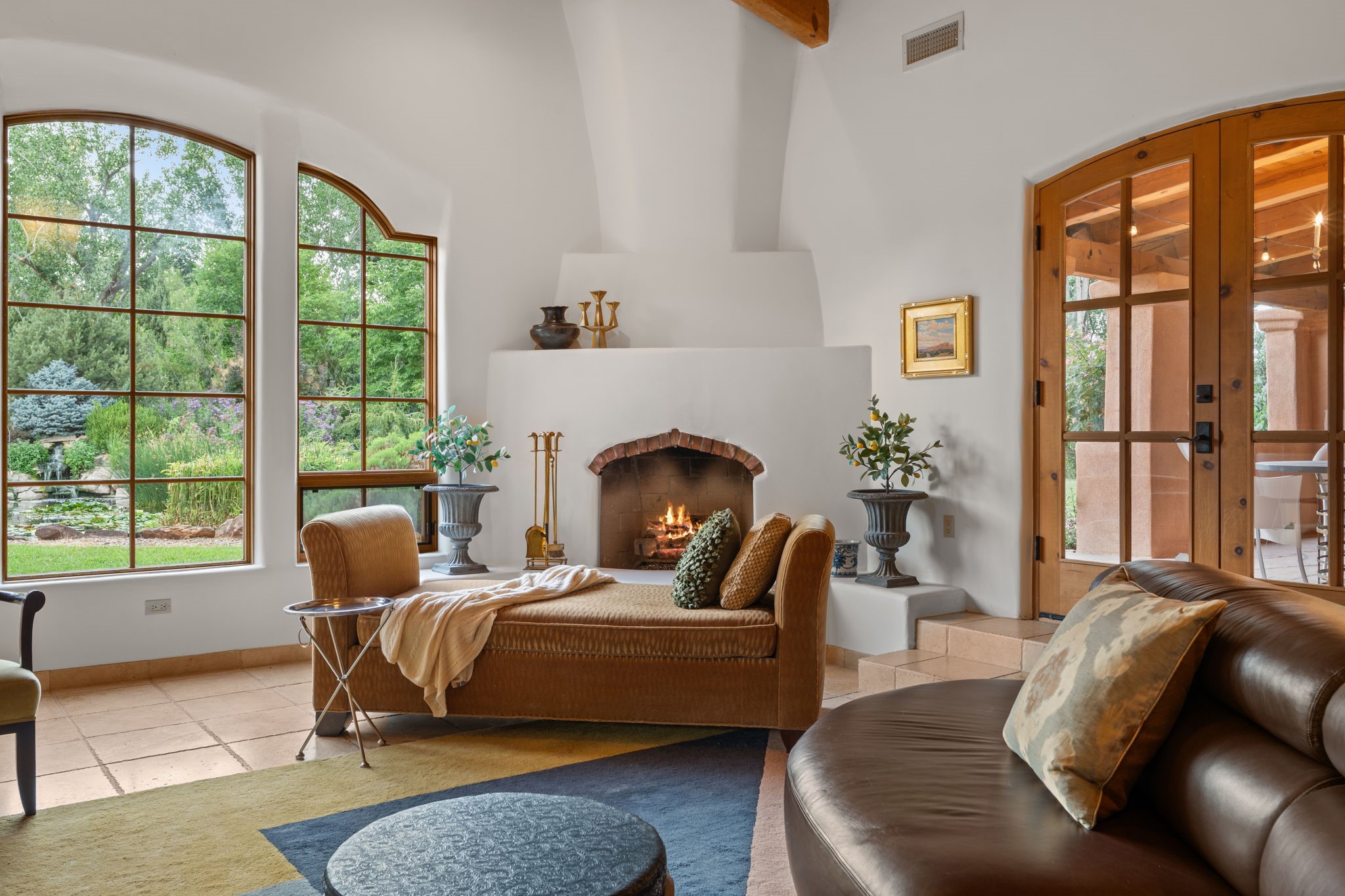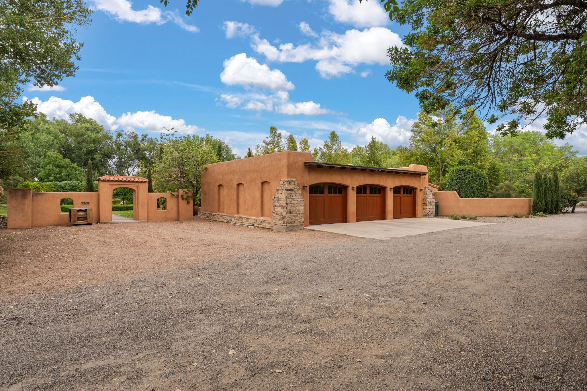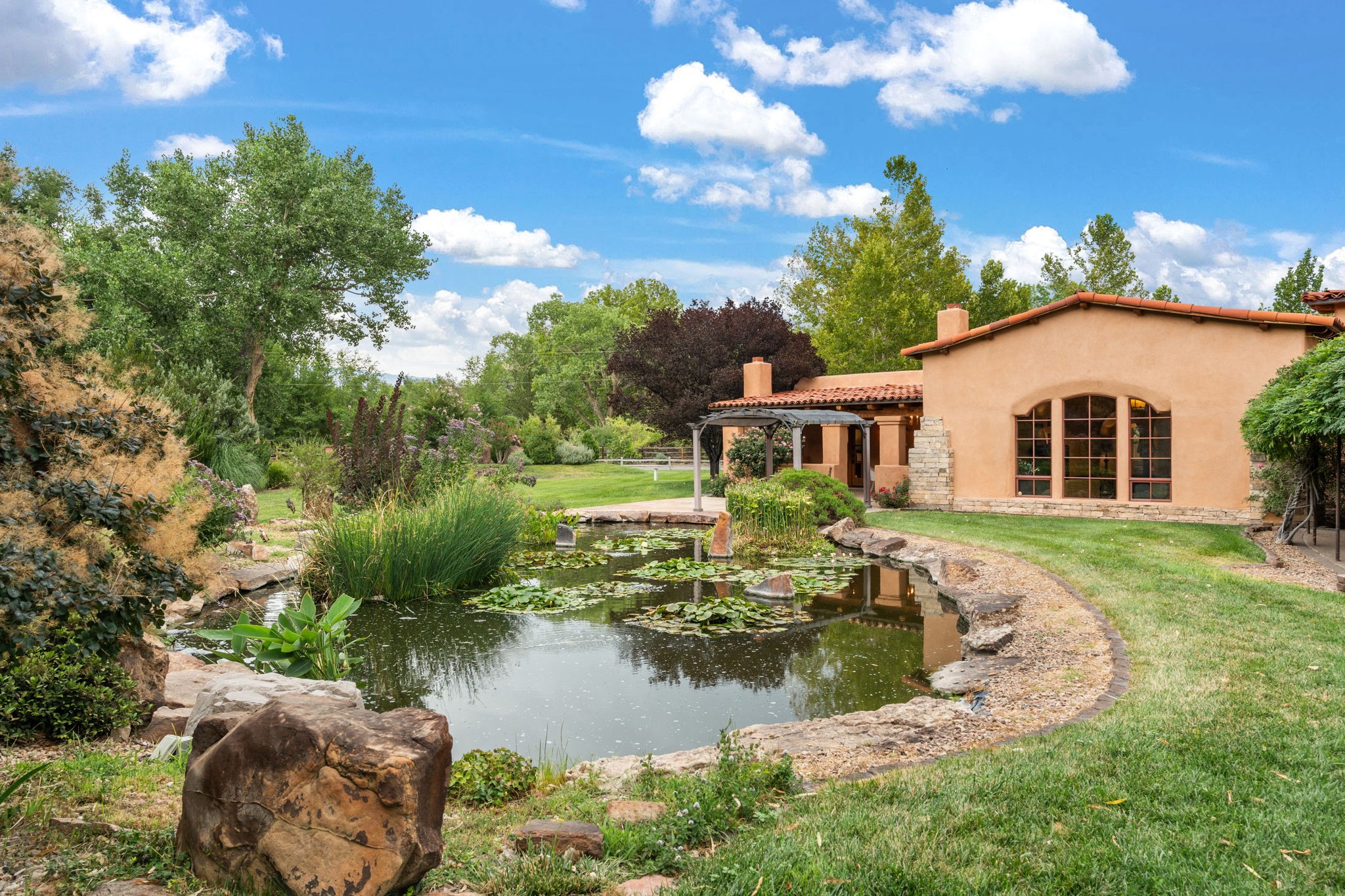 Gorgeous, peaceful, remarkable. A beautiful mediterranean adobe villa by John Calvin. Set in a lush and well-manicured setting on a very special street in the Village of Los Ranchos. Walk or ride your bike to Los Poblanos Historic Inn, Campo, Los Ranchos Growers Market, and much more. The home features a chef's kitchen, spacious en-suite bedrooms, stunning garden views from every window, and a large koi pond and a private irrigation well. Radiant heat, central AC, Wolf range, 5 fireplaces including an outdoor kiva, travertine floors, 3 Car garage. Separated & Quiet Master Suite. Kitchen features include Wolf range, subzero fridge, double-oven, wine cooler, & oversized island. Enjoy views of the gardens and landscaping from every room, with a walled backyard.