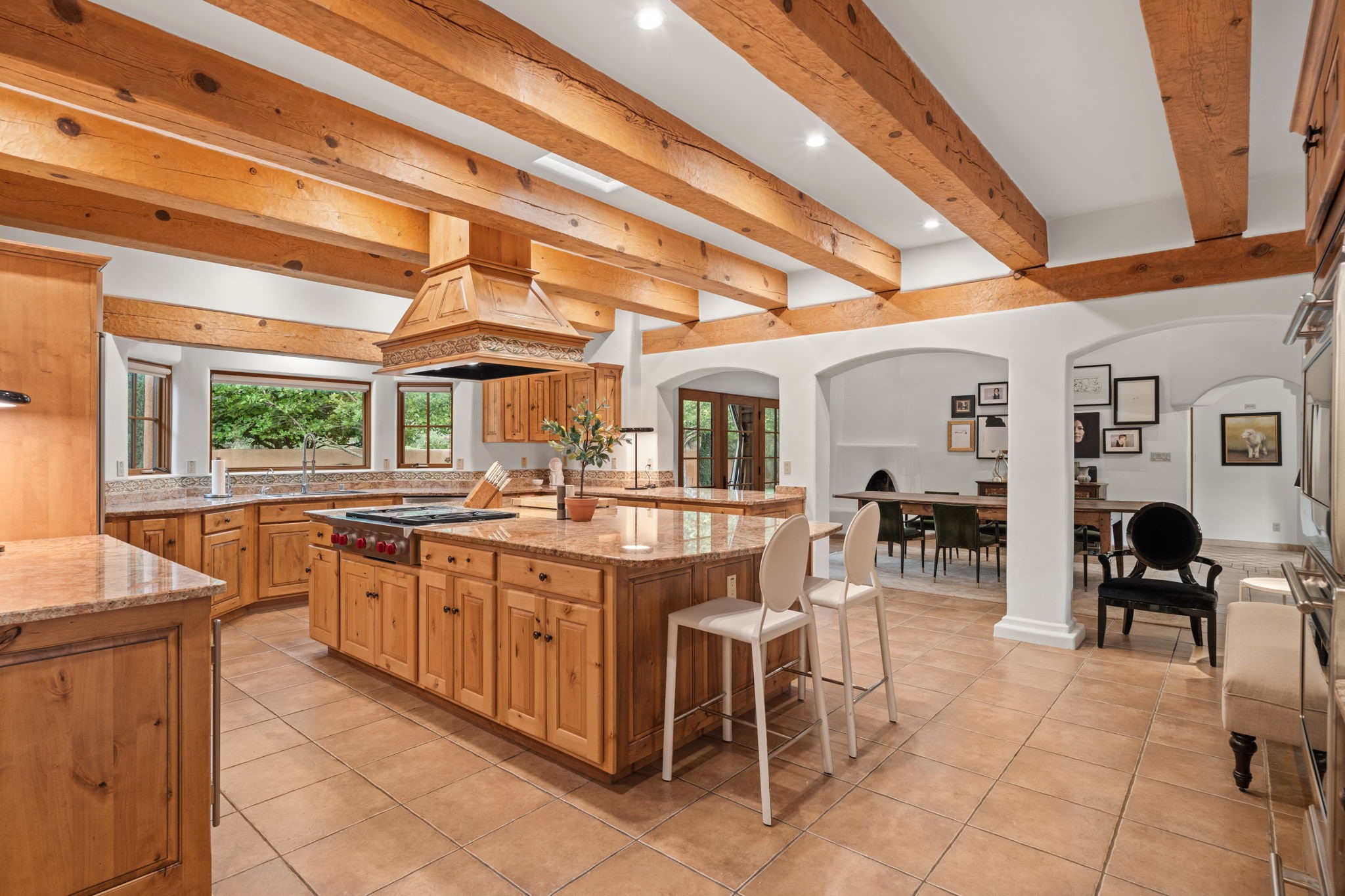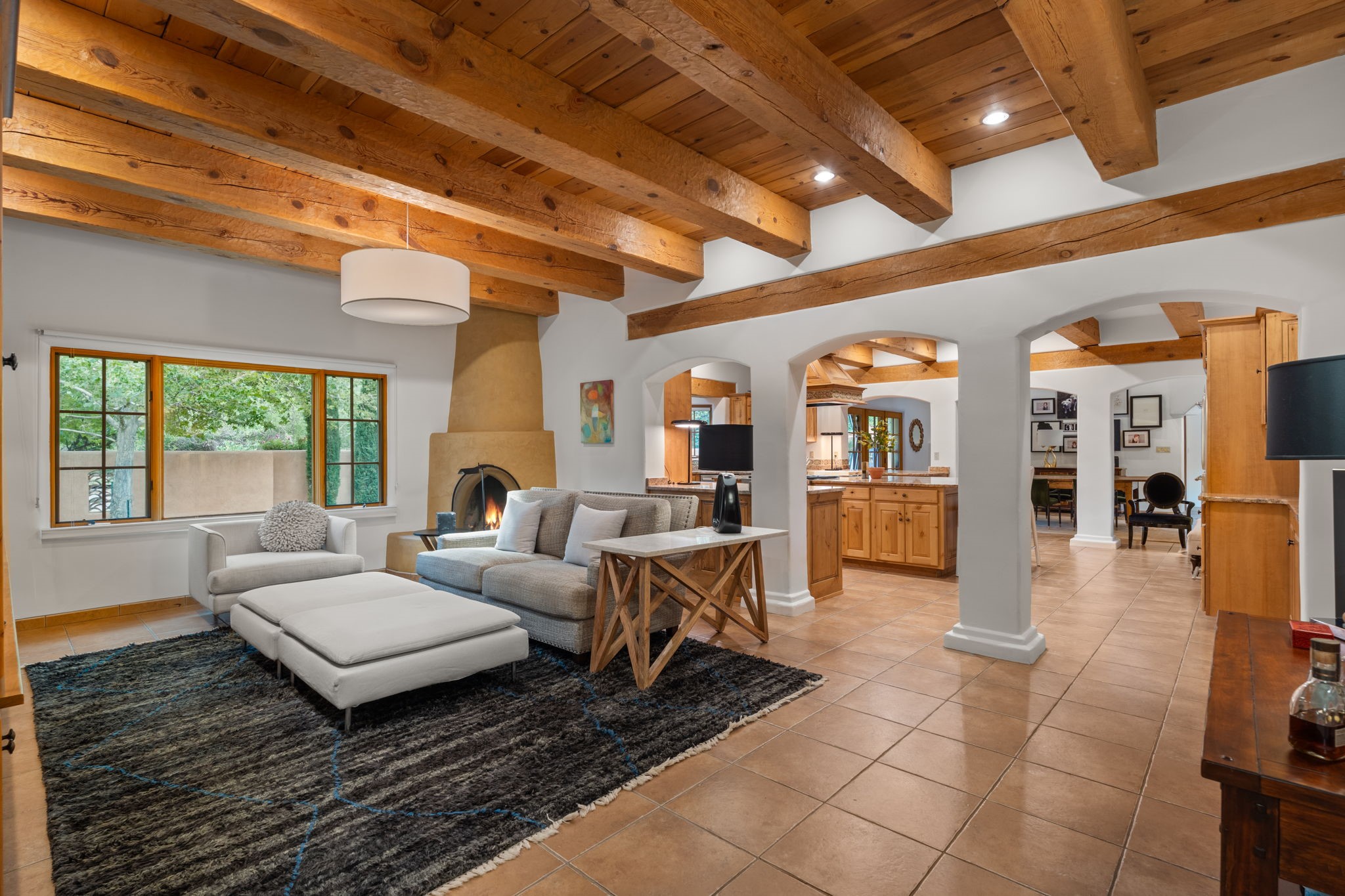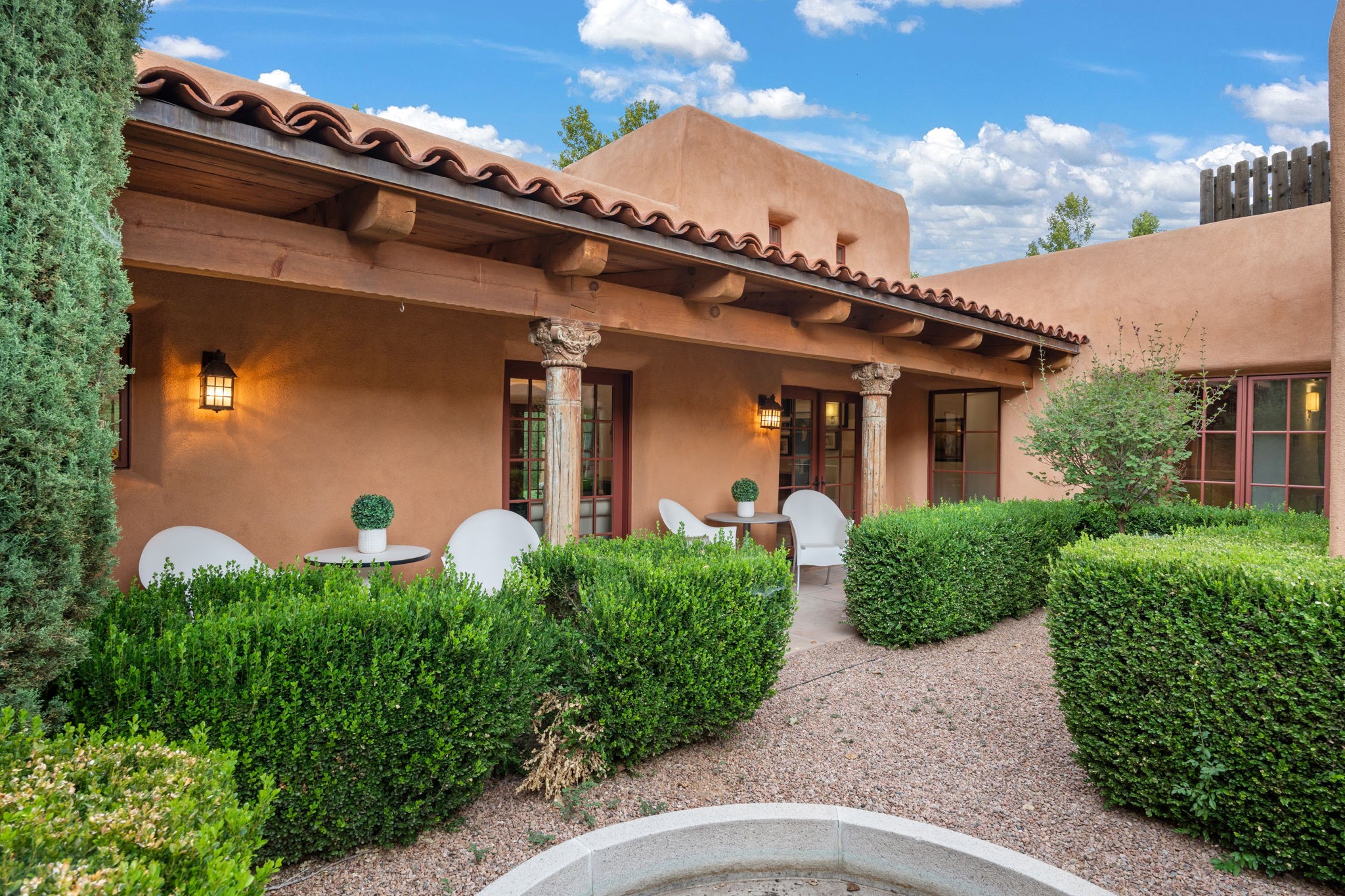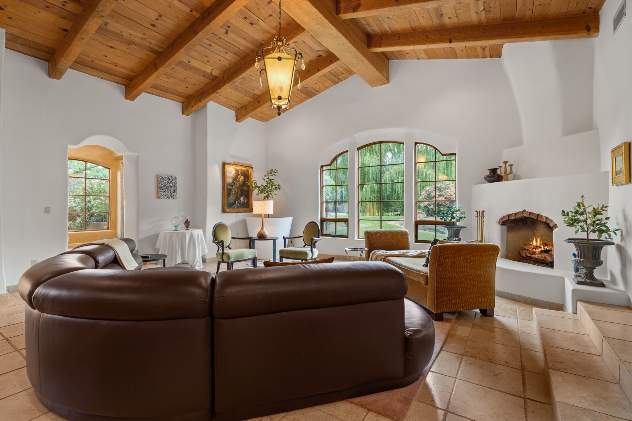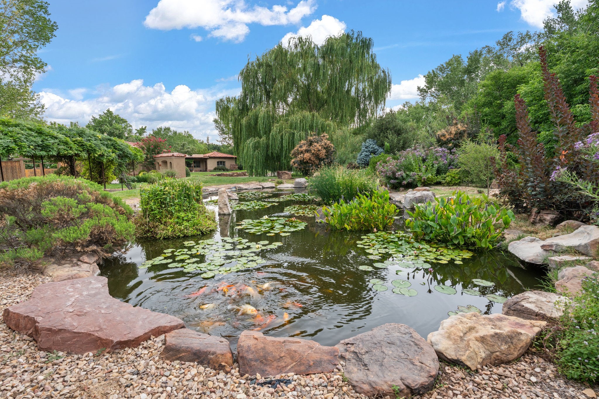 Gorgeous, peaceful, remarkable. A beautiful mediterranean adobe villa by John Calvin. Set in a lush and well-manicured setting on a very special street in the Village of Los Ranchos. Walk or ride your bike to Los Poblanos Historic Inn, Campo, Los Ranchos Growers Market, and much more. The home features a chef's kitchen, spacious en-suite bedrooms, stunning garden views from every window, and a large koi pond and a private irrigation well. Radiant heat, central AC, Wolf range, 5 fireplaces including an outdoor kiva, travertine floors, 3 Car garage. Separated & Quiet Master Suite. Kitchen features include Wolf range, subzero fridge, double-oven, wine cooler, & oversized island. Enjoy views of the gardens and landscaping from every room, with a walled backyard.