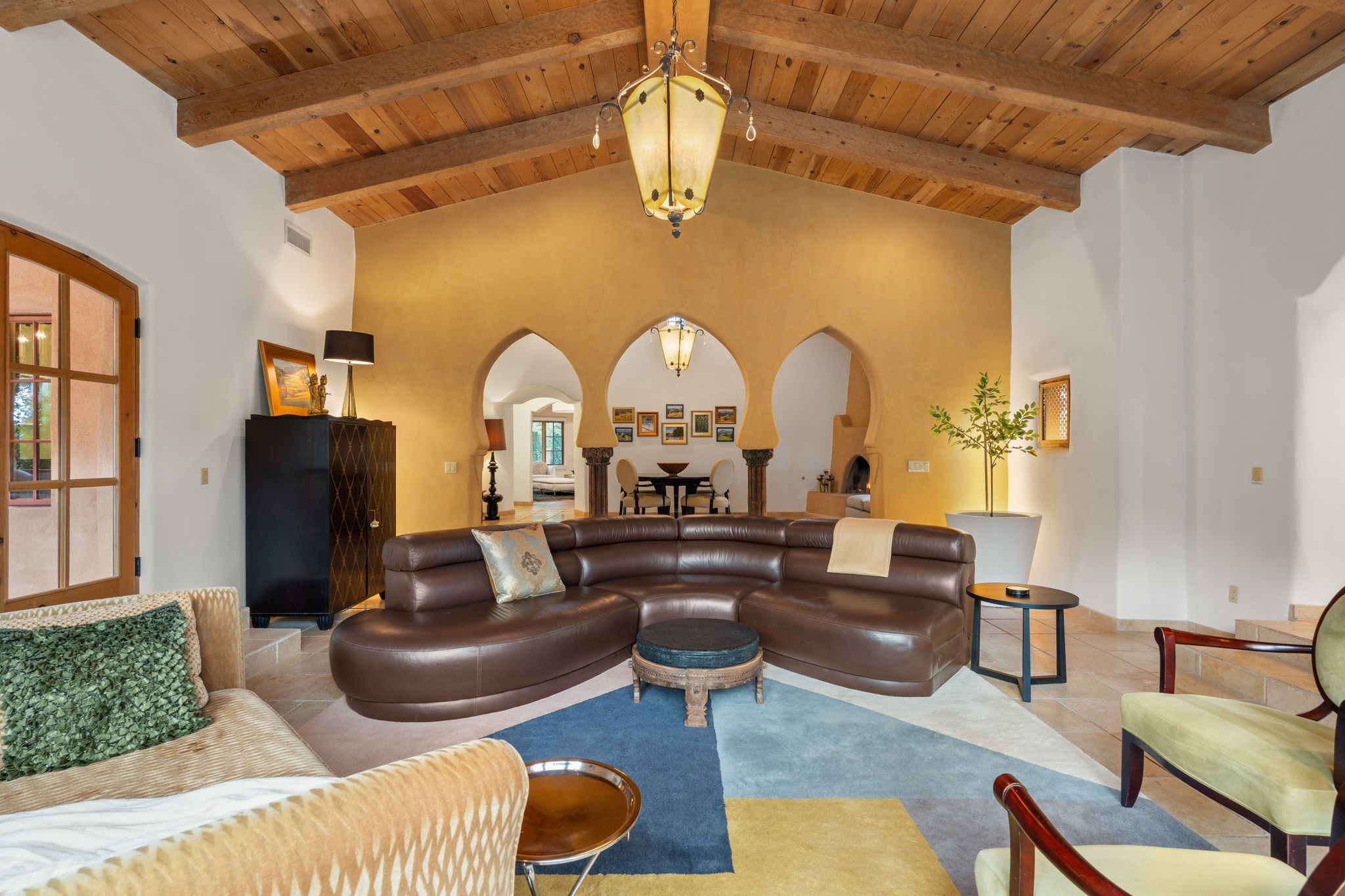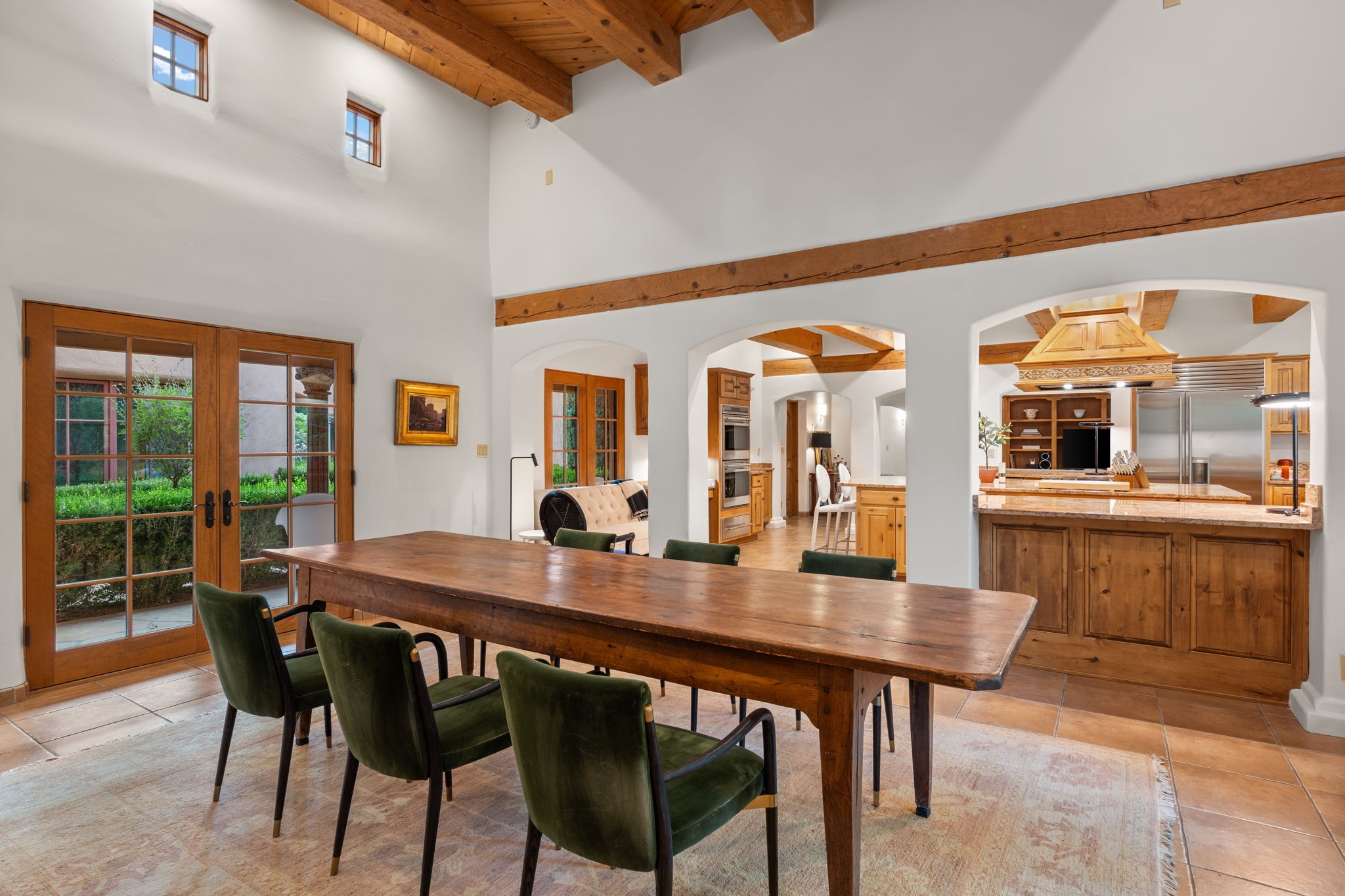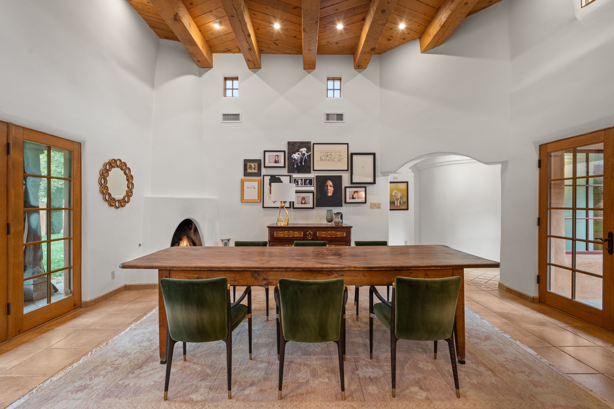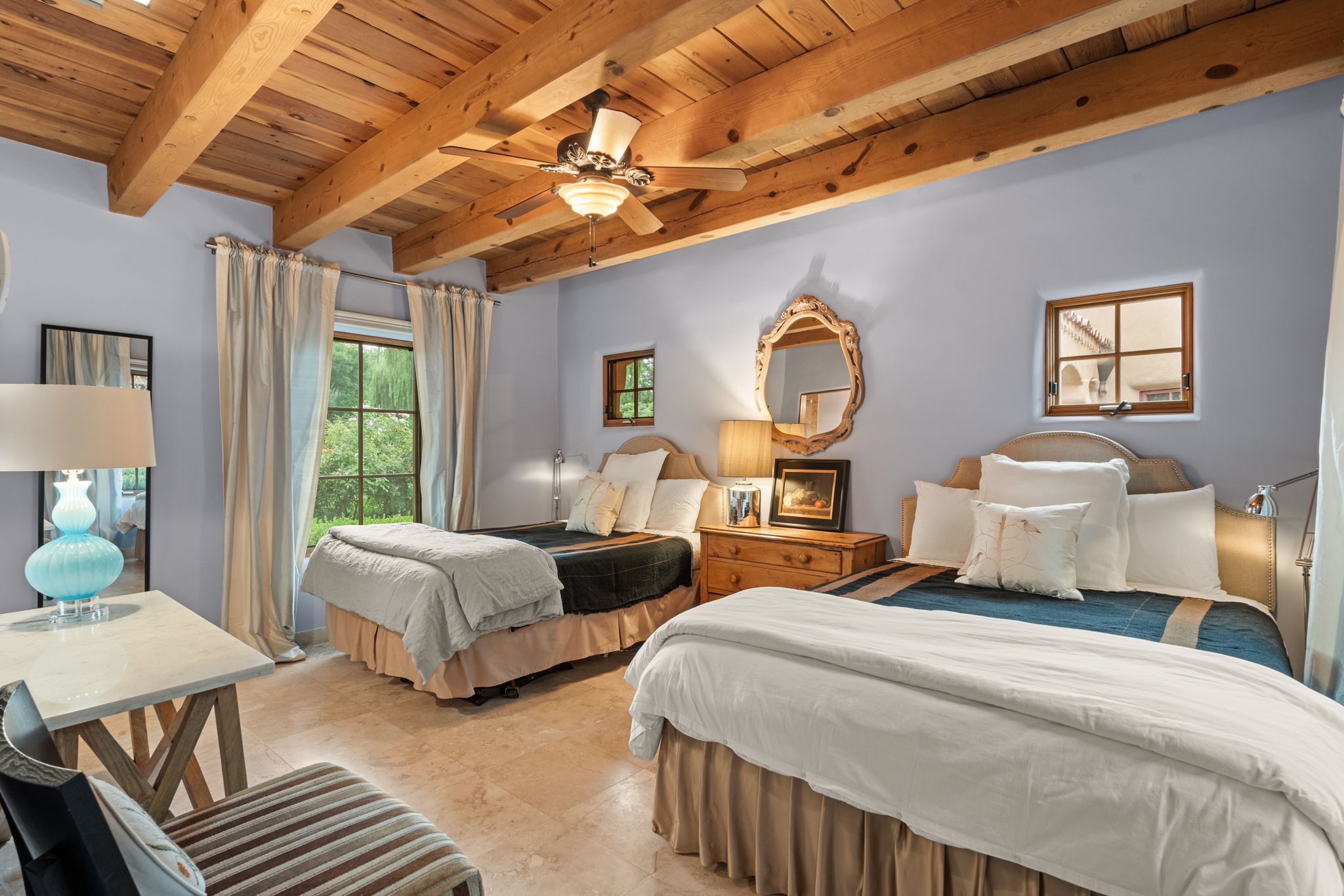Gorgeous, peaceful, remarkable. A beautiful mediterranean adobe villa by John Calvin. Set in a lush and well-manicured setting on a very special street in the Village of Los Ranchos. Walk or ride your bike to Los Poblanos Historic Inn, Campo, Los Ranchos Growers Market, and much more. The home features a chef's kitchen, spacious en-suite bedrooms, stunning garden views from every window, and a large koi pond and a private irrigation well. Radiant heat, central AC, Wolf range, 5 fireplaces including an outdoor kiva, travertine floors, 3 Car garage. Separated & Quiet Master Suite. Kitchen features include Wolf range, subzero fridge, double-oven, wine cooler, & oversized island. Enjoy views of the gardens and landscaping from every room, with a walled backyard.