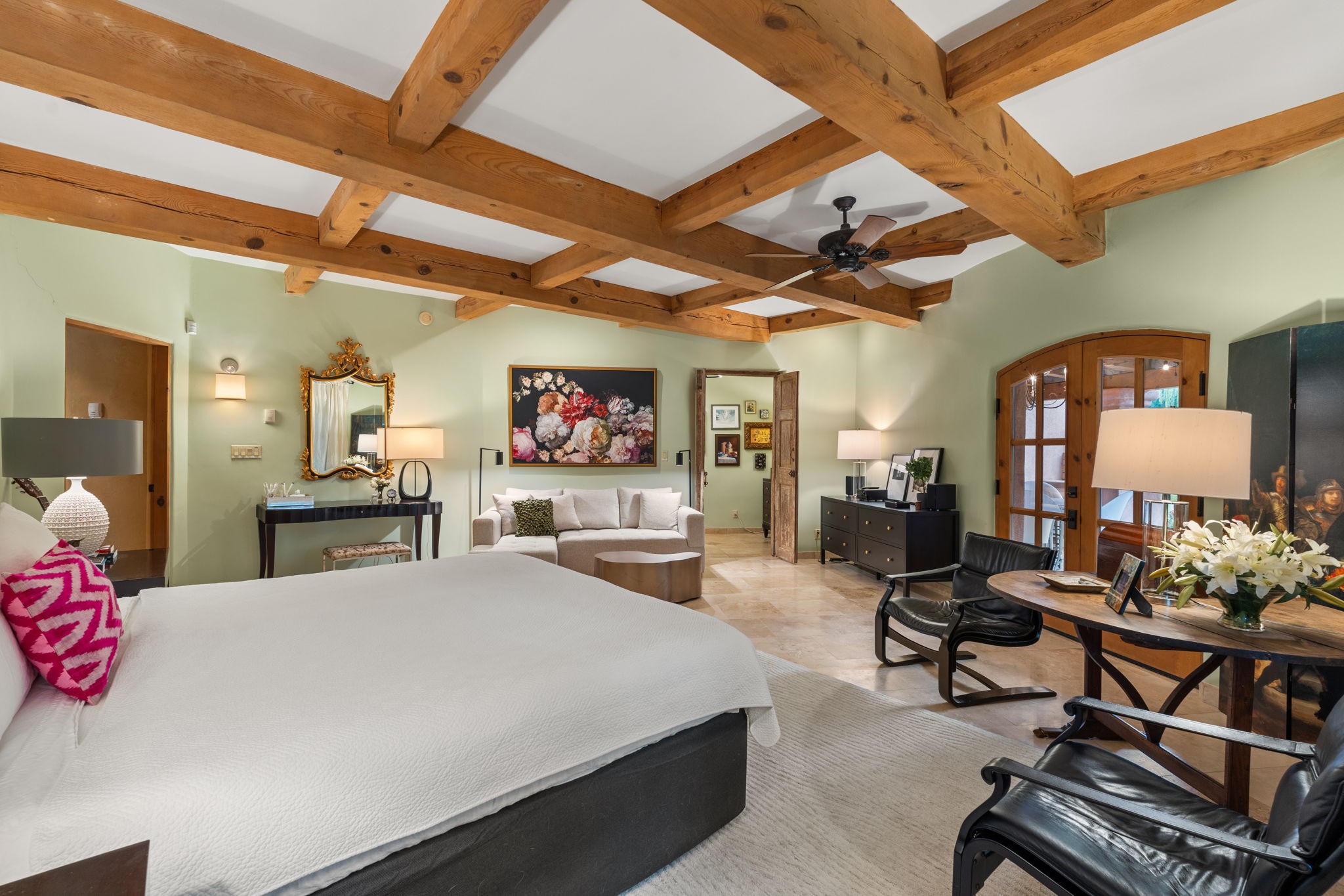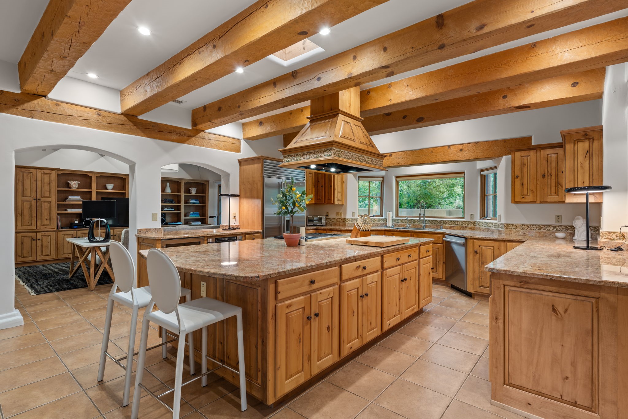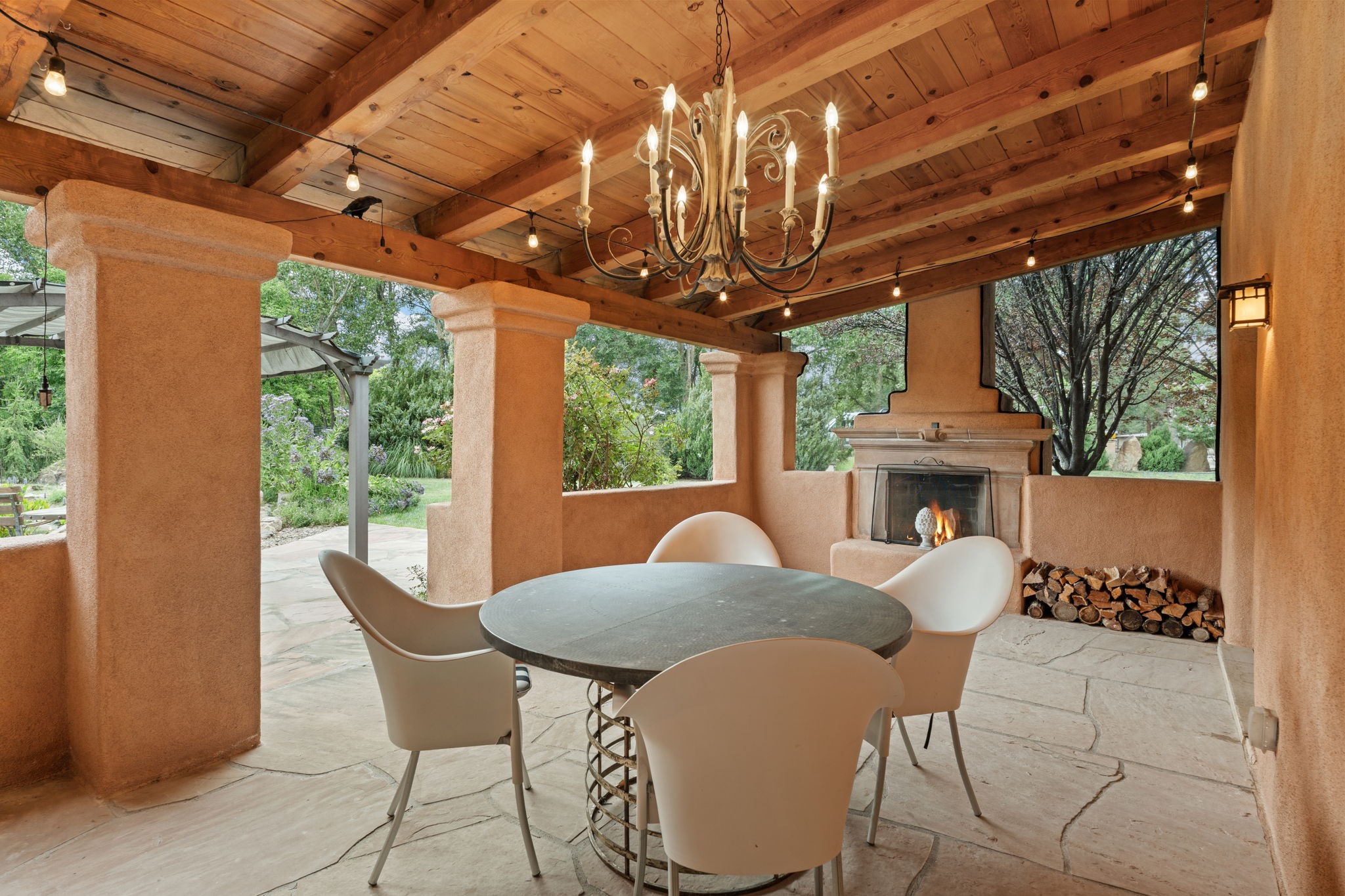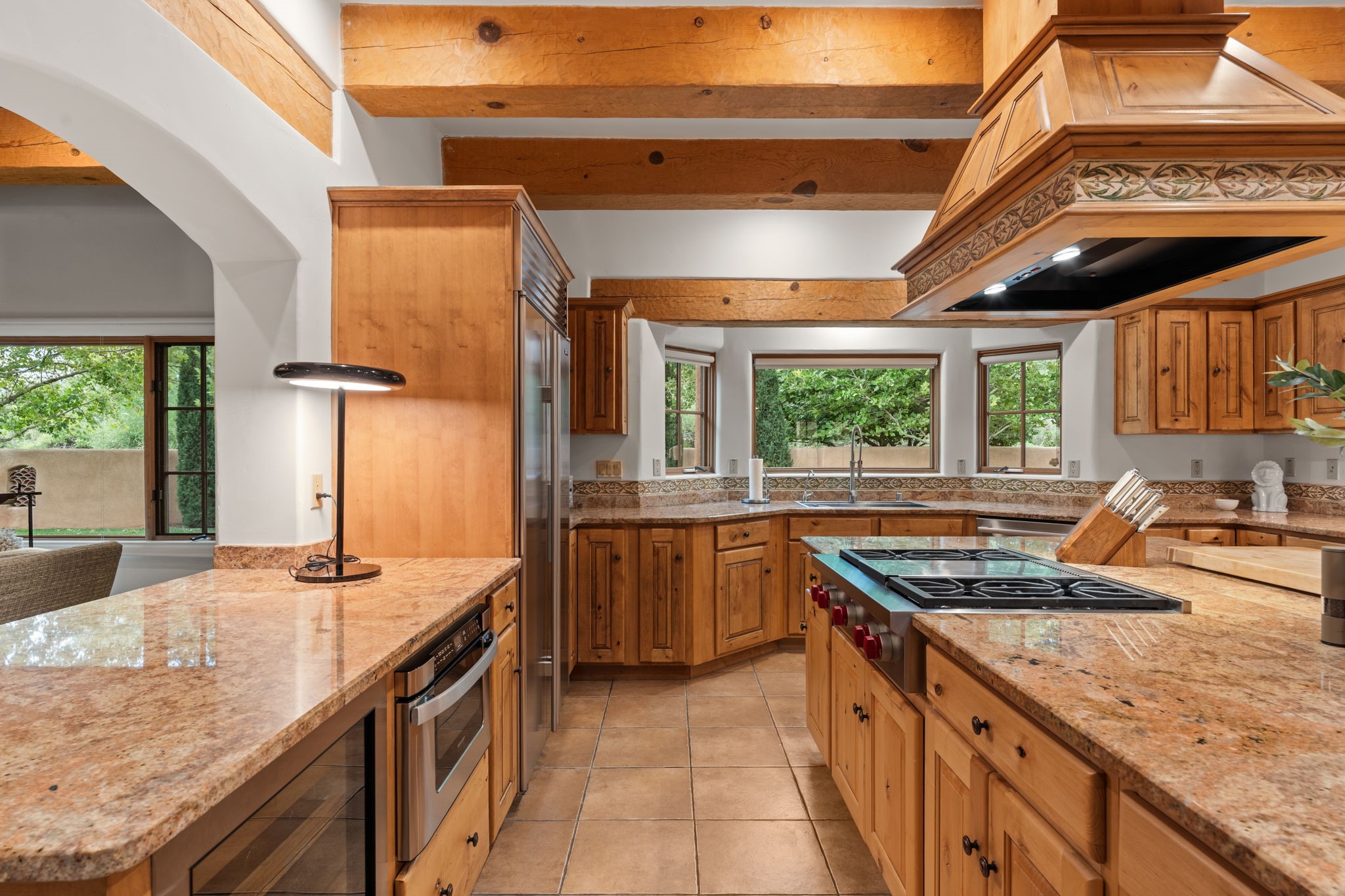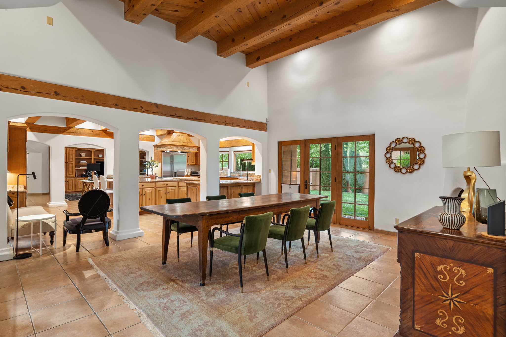 Gorgeous, peaceful, remarkable. A beautiful mediterranean adobe villa by John Calvin. Set in a lush and well-manicured setting on a very special street in the Village of Los Ranchos. Walk or ride your bike to Los Poblanos Historic Inn, Campo, Los Ranchos Growers Market, and much more. The home features a chef's kitchen, spacious en-suite bedrooms, stunning garden views from every window, and a large koi pond and a private irrigation well. Radiant heat, central AC, Wolf range, 5 fireplaces including an outdoor kiva, travertine floors, 3 Car garage. Separated & Quiet Master Suite. Kitchen features include Wolf range, subzero fridge, double-oven, wine cooler, & oversized island. Enjoy views of the gardens and landscaping from every room, with a walled backyard.