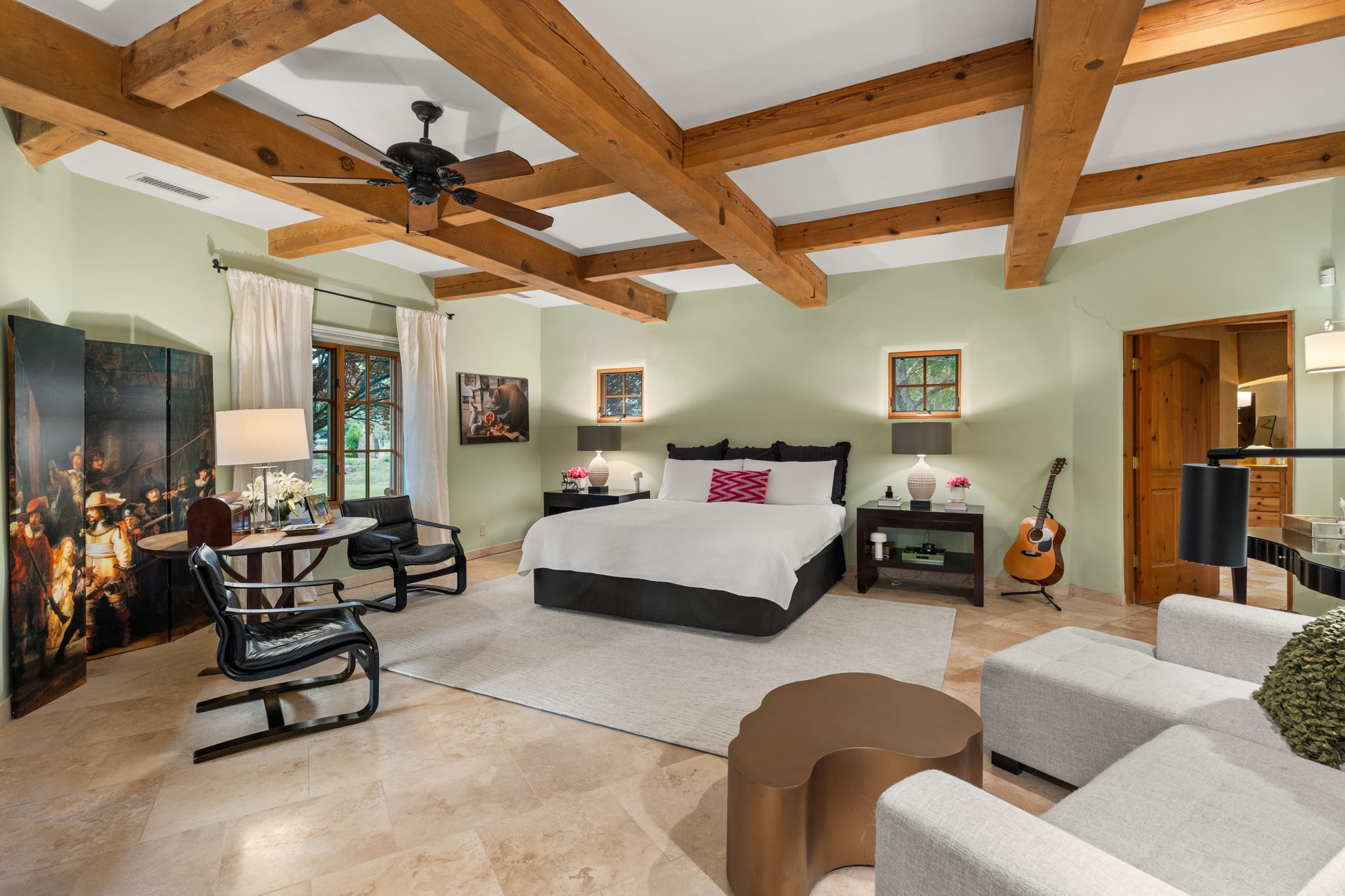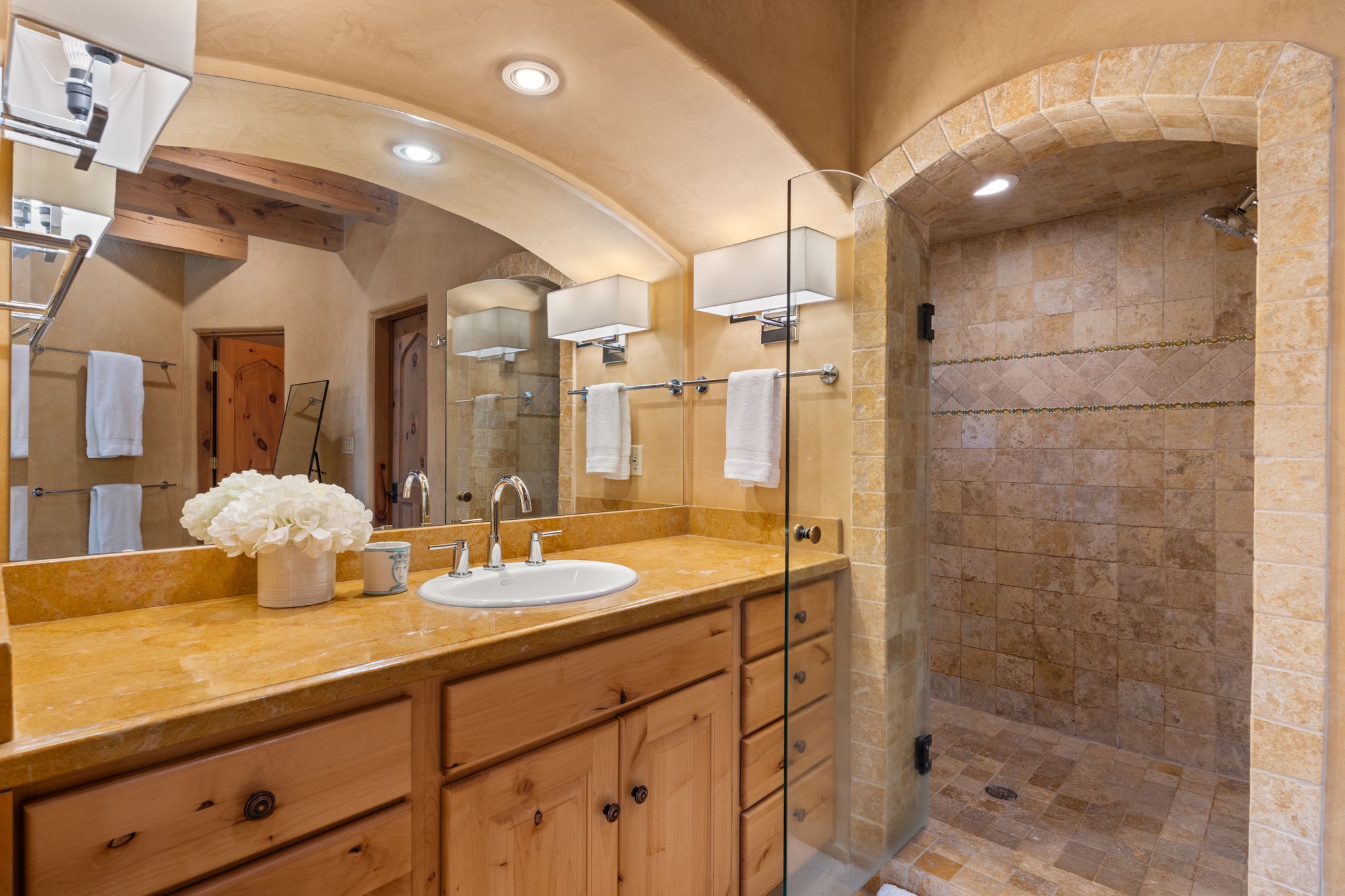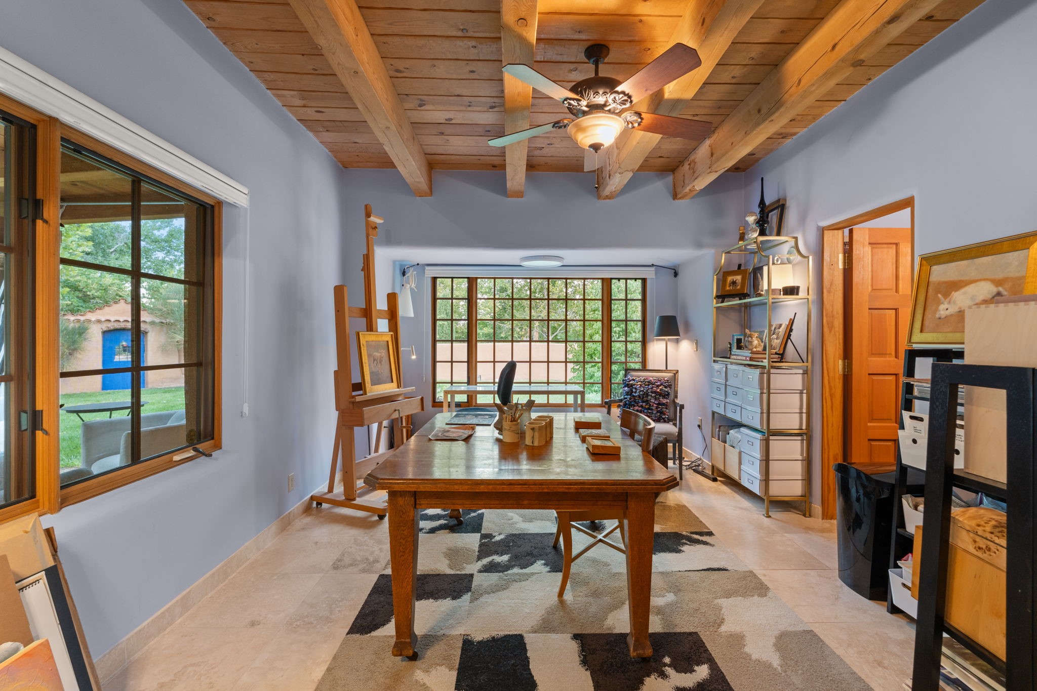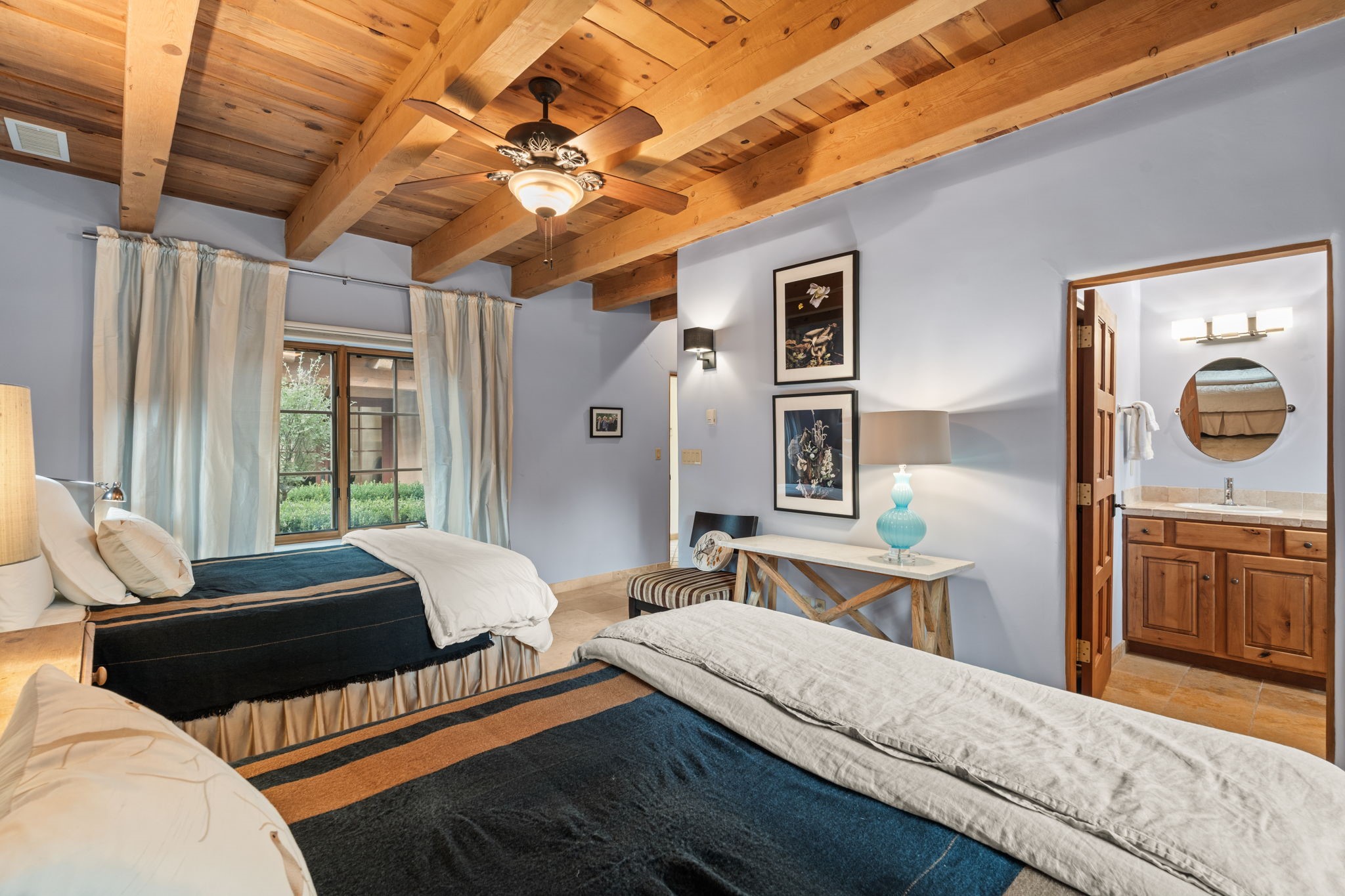 Gorgeous, peaceful, remarkable. A beautiful mediterranean adobe villa by John Calvin. Set in a lush and well-manicured setting on a very special street in the Village of Los Ranchos. Walk or ride your bike to Los Poblanos Historic Inn, Campo, Los Ranchos Growers Market, and much more. The home features a chef's kitchen, spacious en-suite bedrooms, stunning garden views from every window, and a large koi pond and a private irrigation well. Radiant heat, central AC, Wolf range, 5 fireplaces including an outdoor kiva, travertine floors, 3 Car garage. Separated & Quiet Master Suite. Kitchen features include Wolf range, subzero fridge, double-oven, wine cooler, & oversized island. Enjoy views of the gardens and landscaping from every room, with a walled backyard.