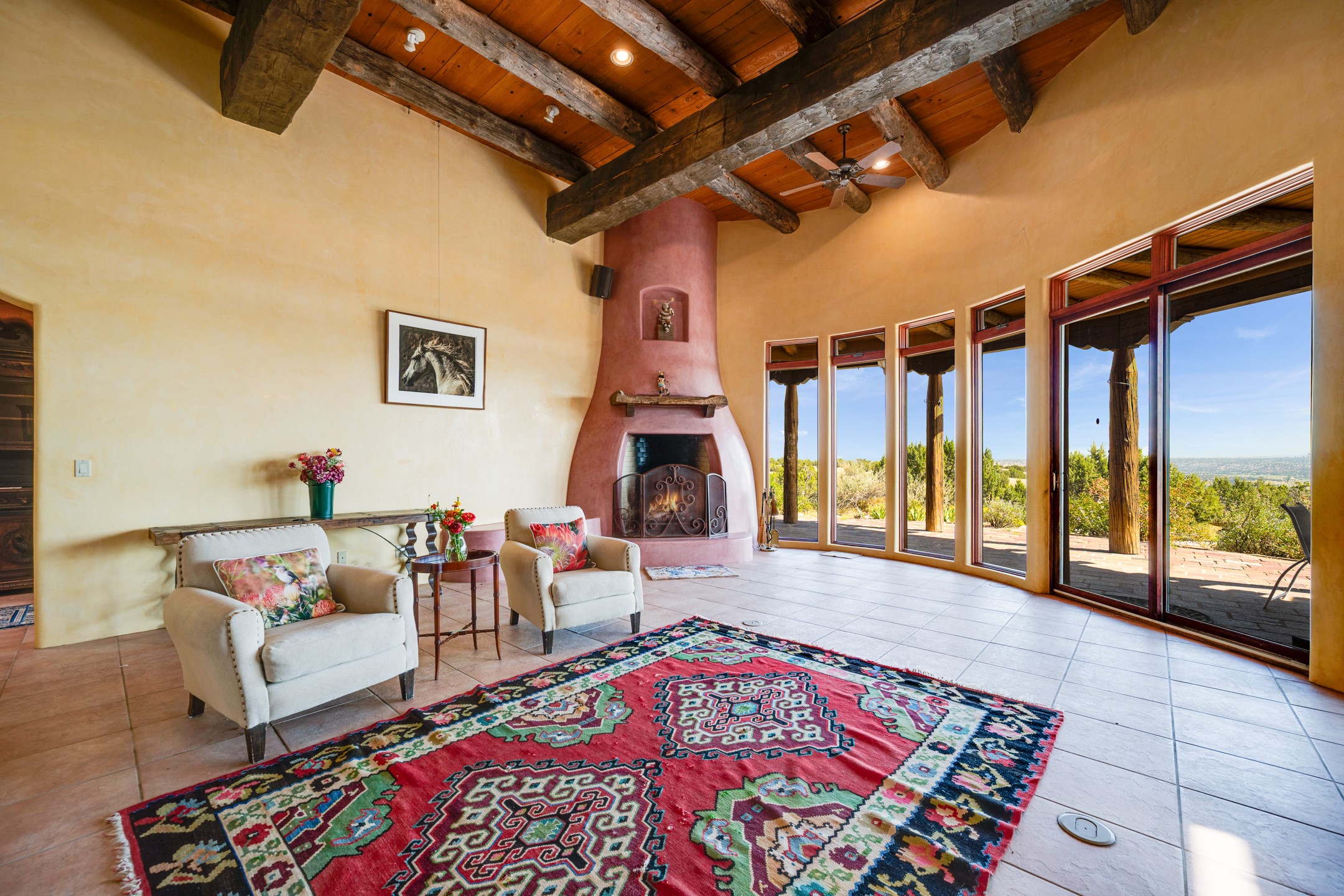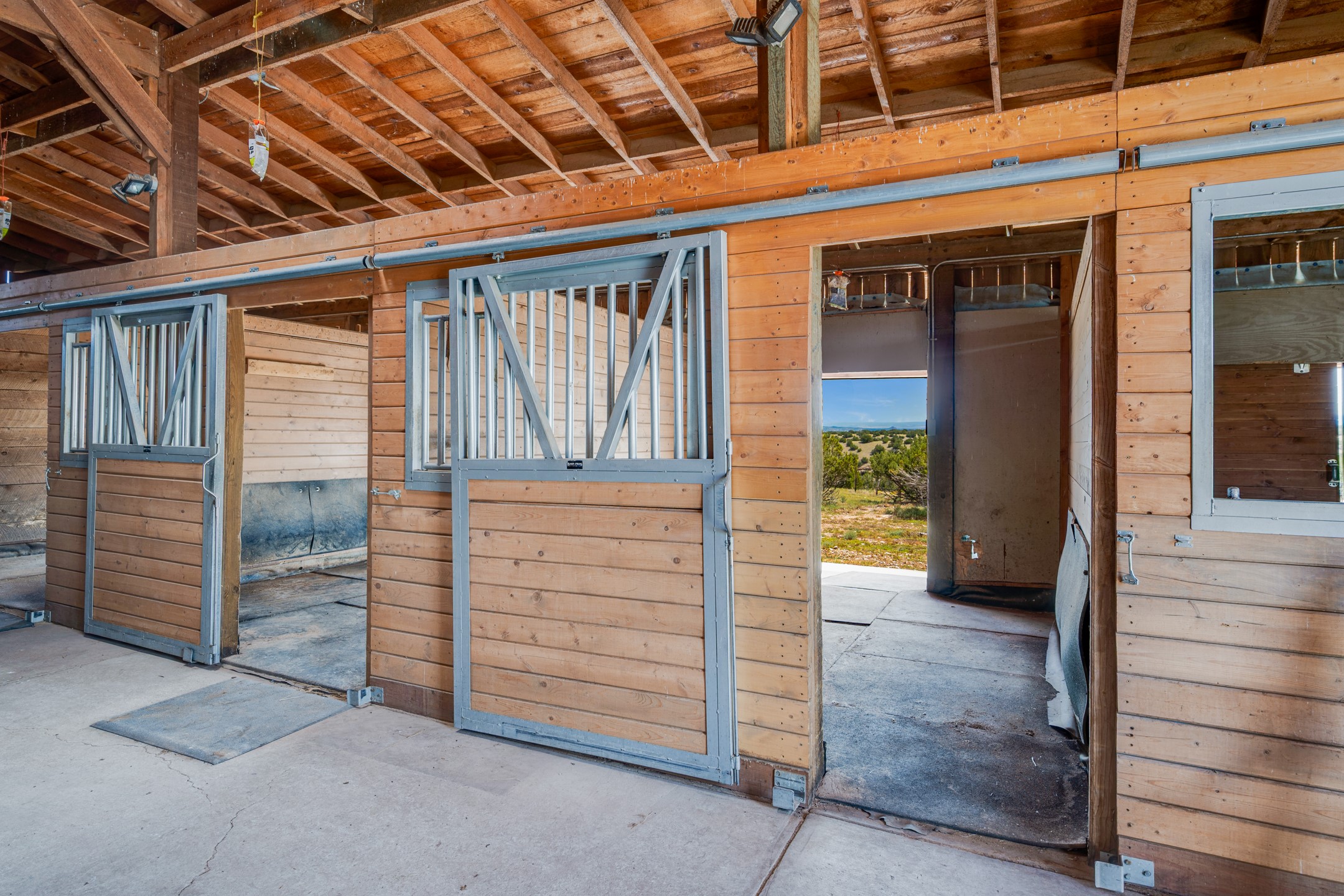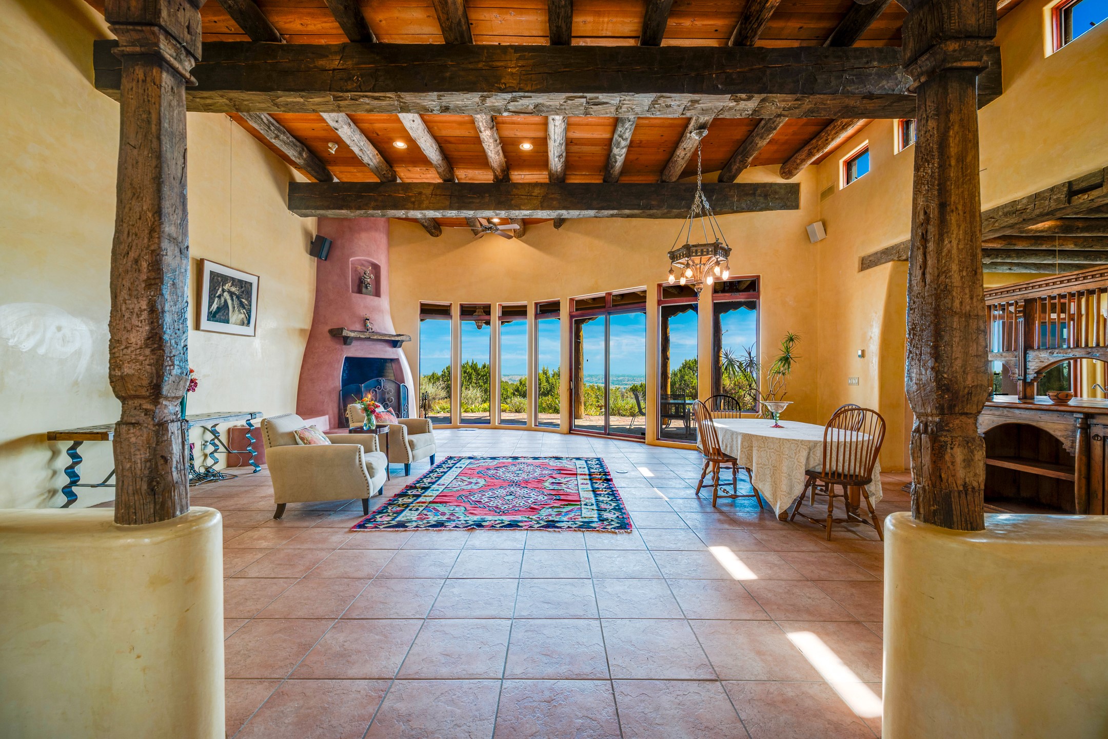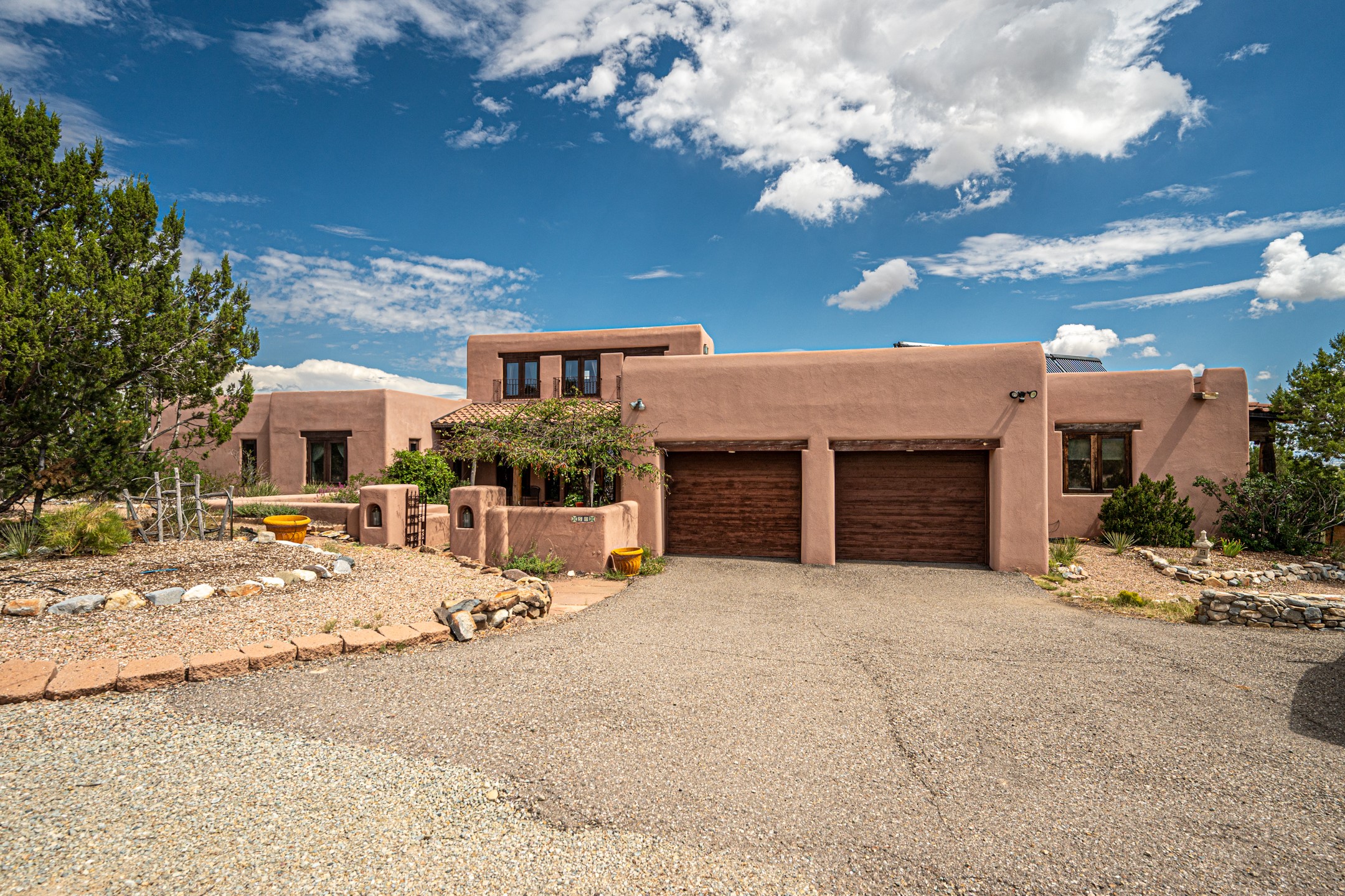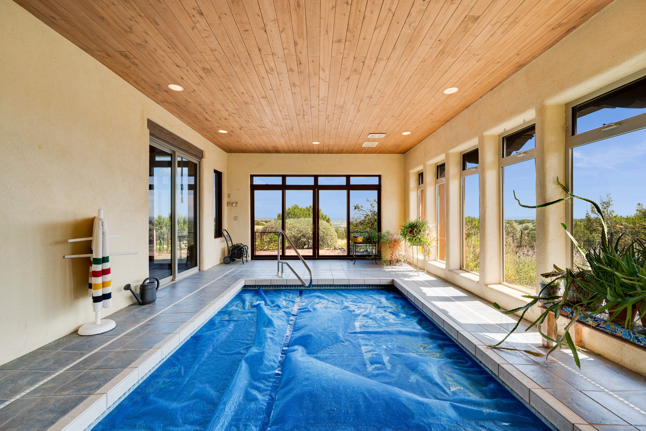 Oro Viejo Ranch is a timeless sanctuary on 106 acres. A harmonious blend of natural splendor, meticulous craftsmanship, and modern convenience. There are breathtaking panoramic views of the Sangre de Cristo, Ortiz Mountains, Cerrillos Hills, and the iconic Lone Butte. The main residence showcases authentic Southwest style, adobe and rastra construction. It features intricate plasterwork, recycled wood vigas, and a heated indoor pool, the rooftop deck offers truly unobstructed views. The solid oak cabin adds rustic charm, originally owned by the Hoover family, and rebuilt on-site. Horse enthusiasts will appreciate the six-stall, barn, tack room, workshop, covered hay storage, electric, and hot water, and protected outdoor runs. A insulated chicken coop provides the perfect setup for fresh eggs, while a private well with a large storage tank ensures a reliable water source.A convenient RV hookup is also available on the property.