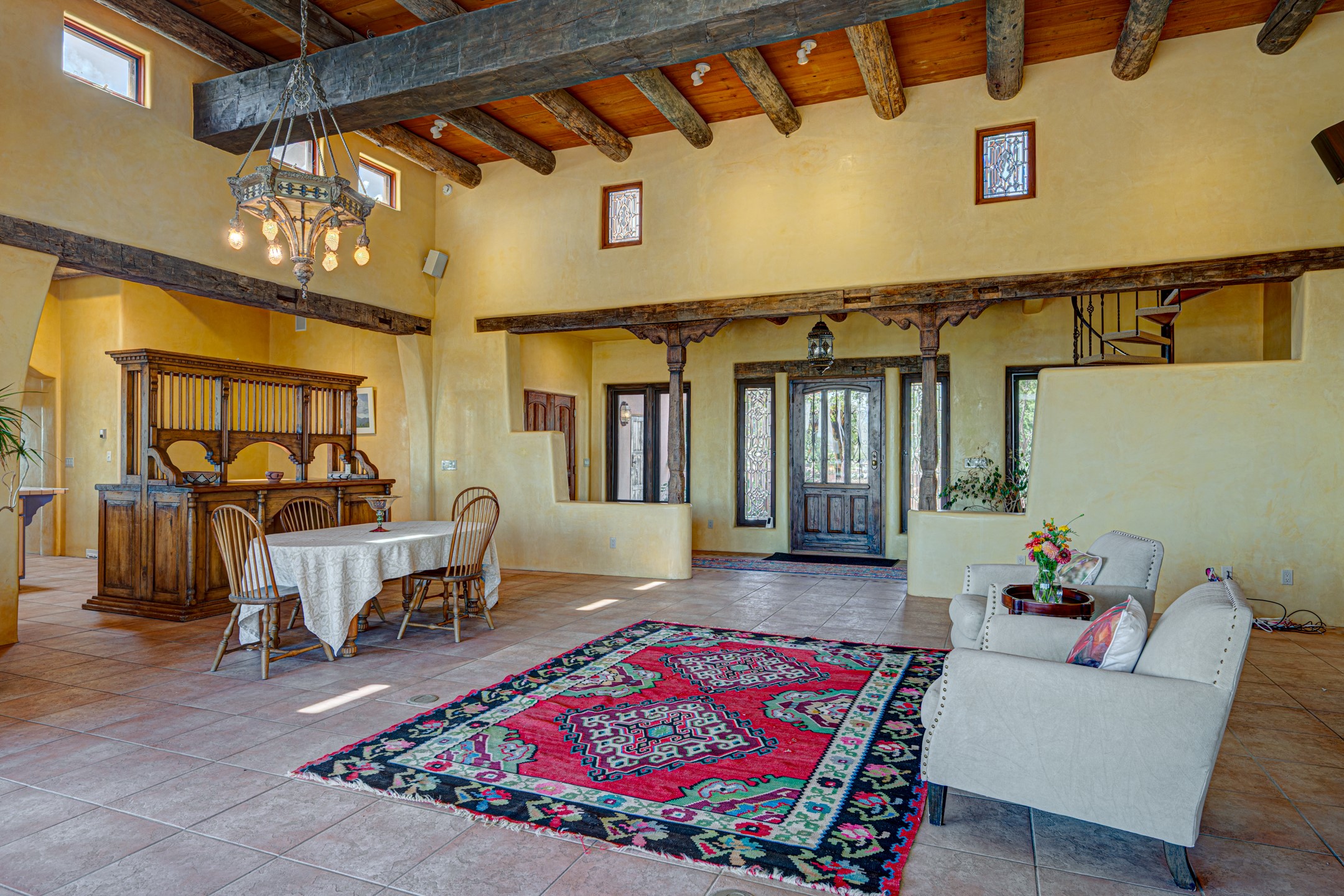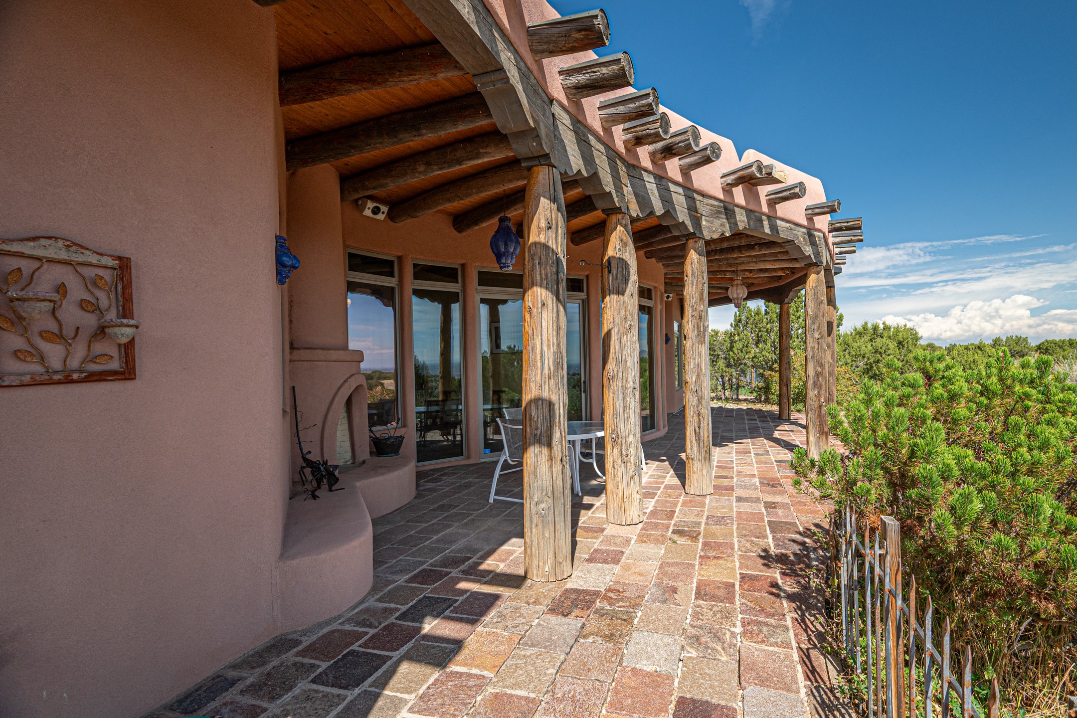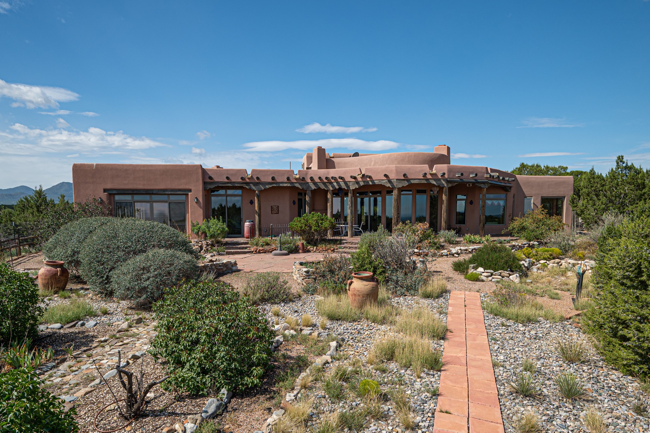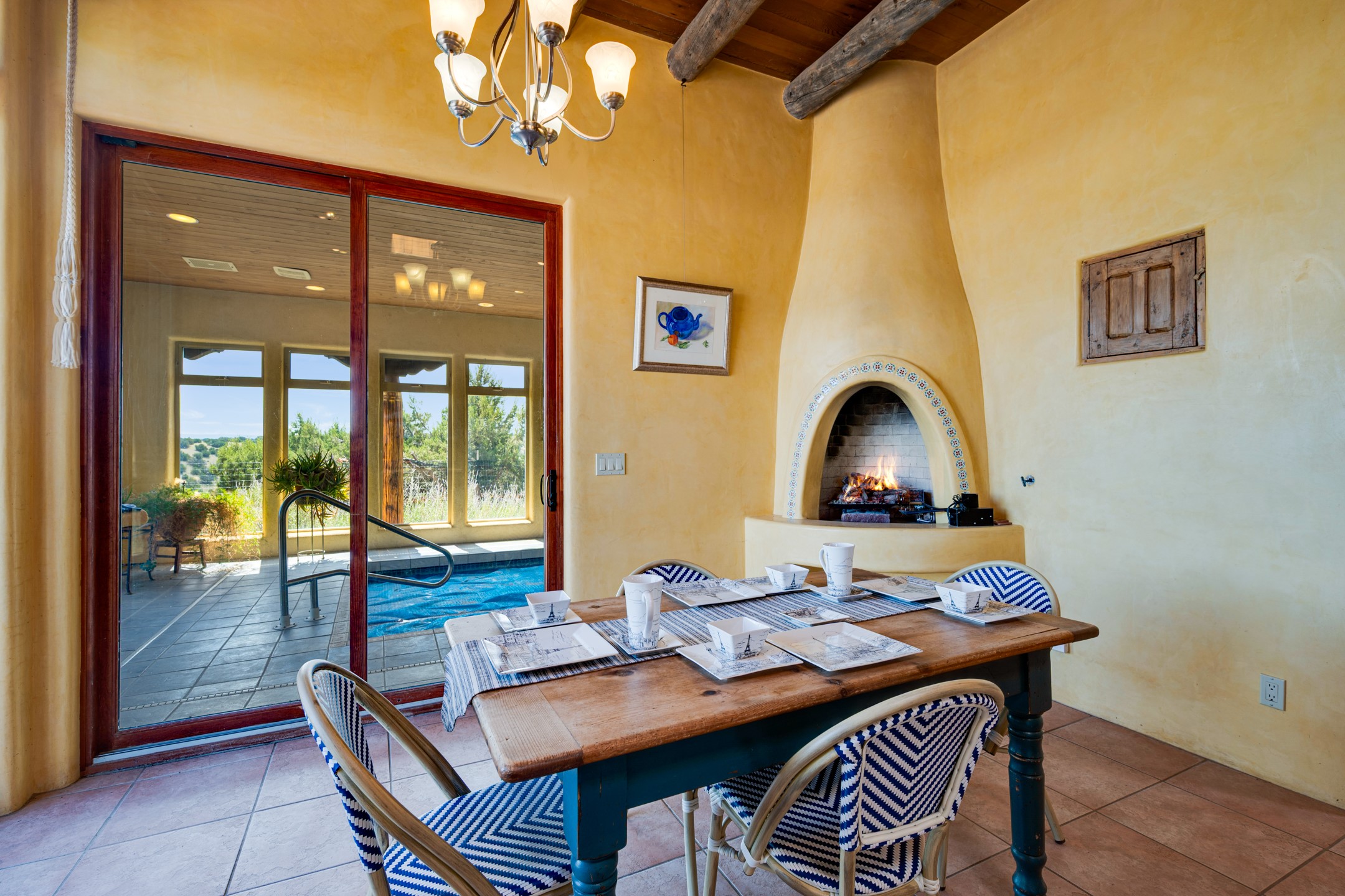 Oro Viejo Ranch is a timeless sanctuary on 106 acres. A harmonious blend of natural splendor, meticulous craftsmanship, and modern convenience. There are breathtaking panoramic views of the Sangre de Cristo, Ortiz Mountains, Cerrillos Hills, and the iconic Lone Butte. The main residence showcases authentic Southwest style, adobe and rastra construction. It features intricate plasterwork, recycled wood vigas, and a heated indoor pool, the rooftop deck offers truly unobstructed views. The solid oak cabin adds rustic charm, originally owned by the Hoover family, and rebuilt on-site. Horse enthusiasts will appreciate the six-stall, barn, tack room, workshop, covered hay storage, electric, and hot water, and protected outdoor runs. A insulated chicken coop provides the perfect setup for fresh eggs, while a private well with a large storage tank ensures a reliable water source.A convenient RV hookup is also available on the property.