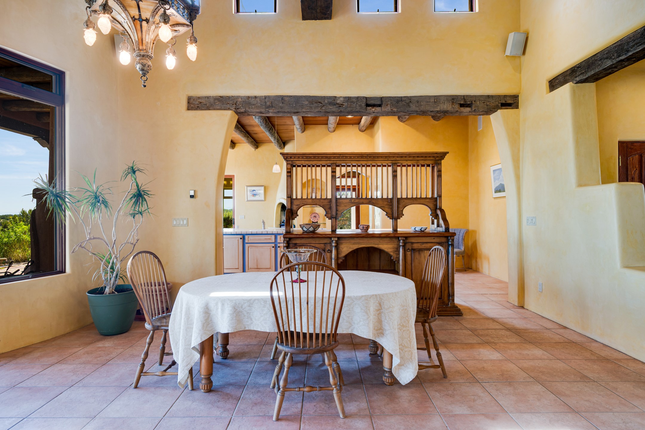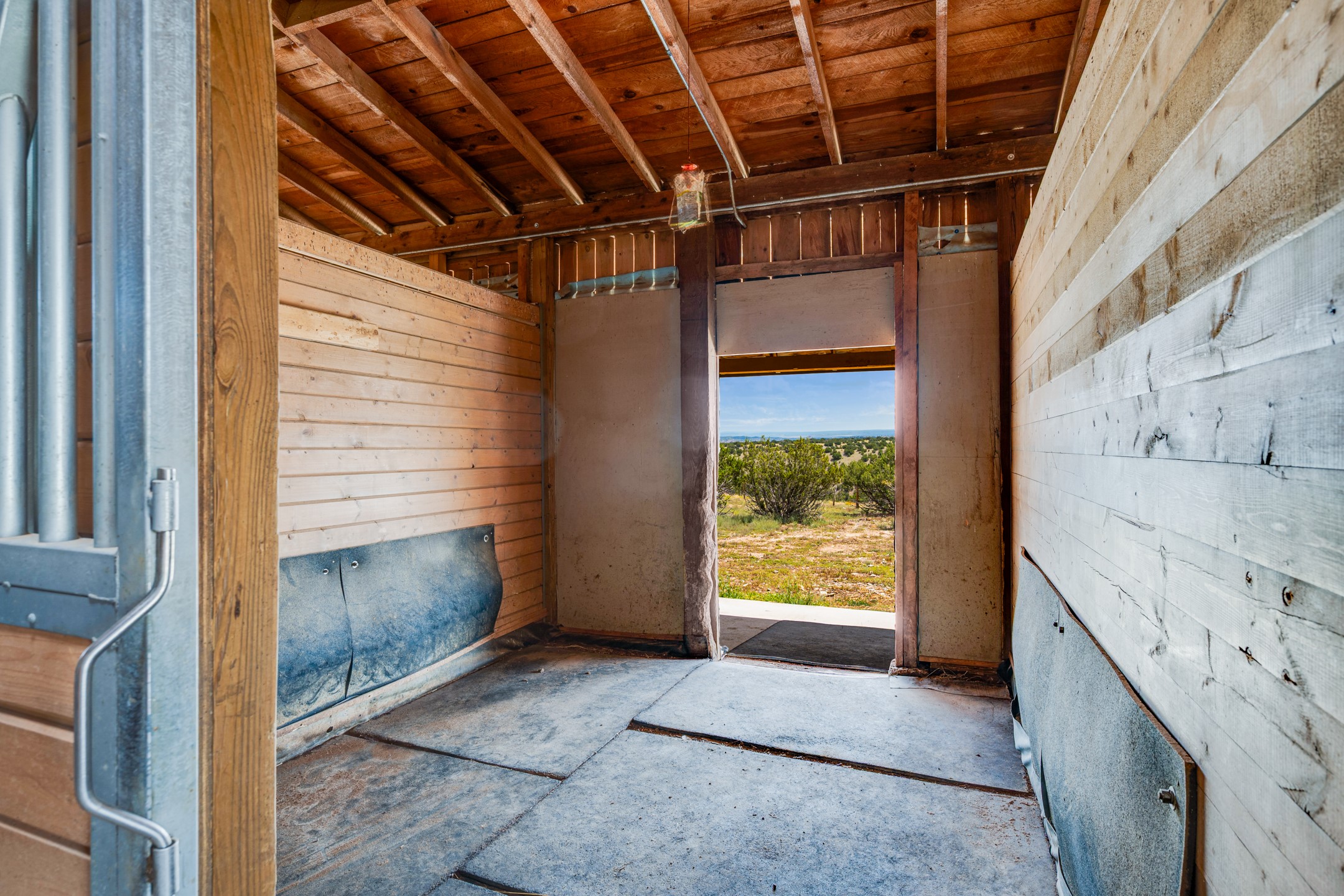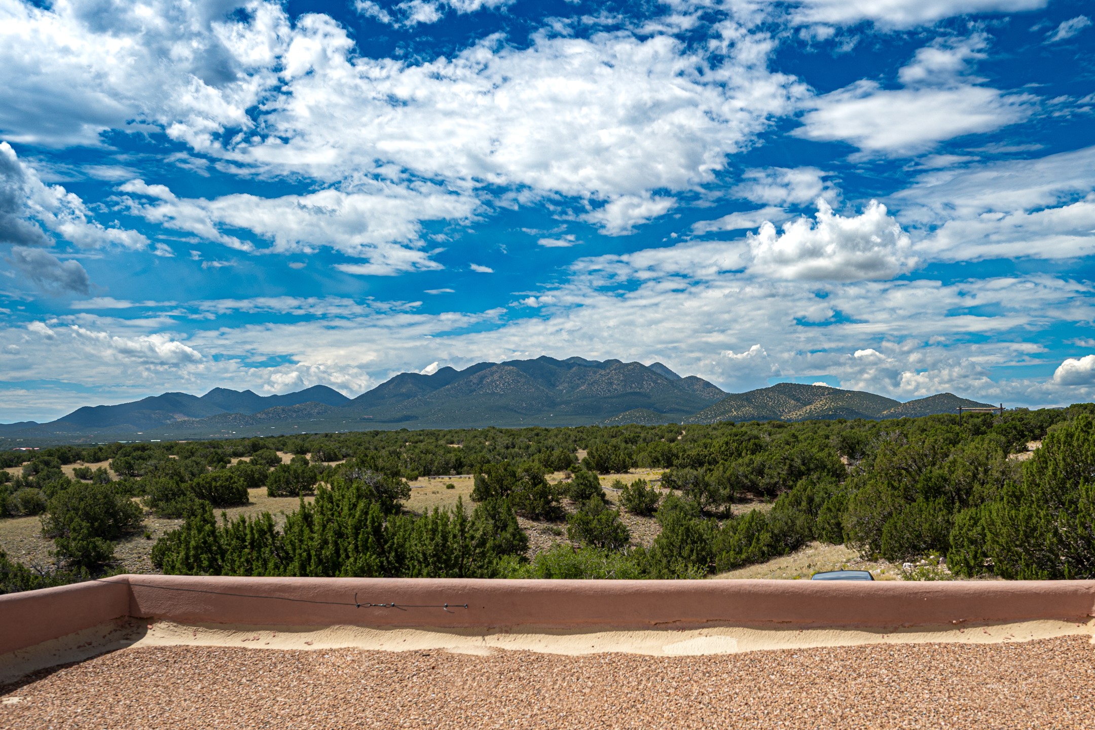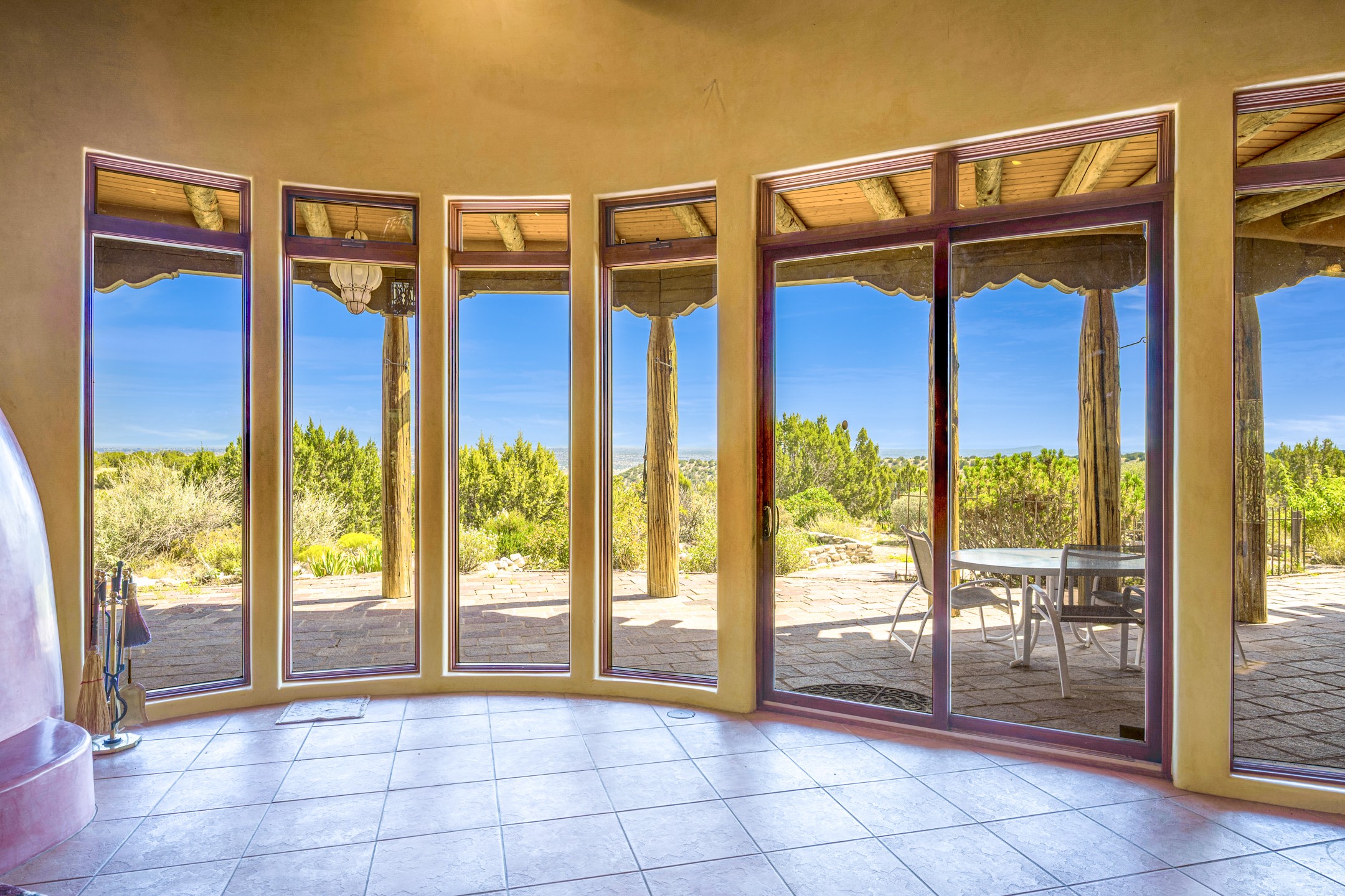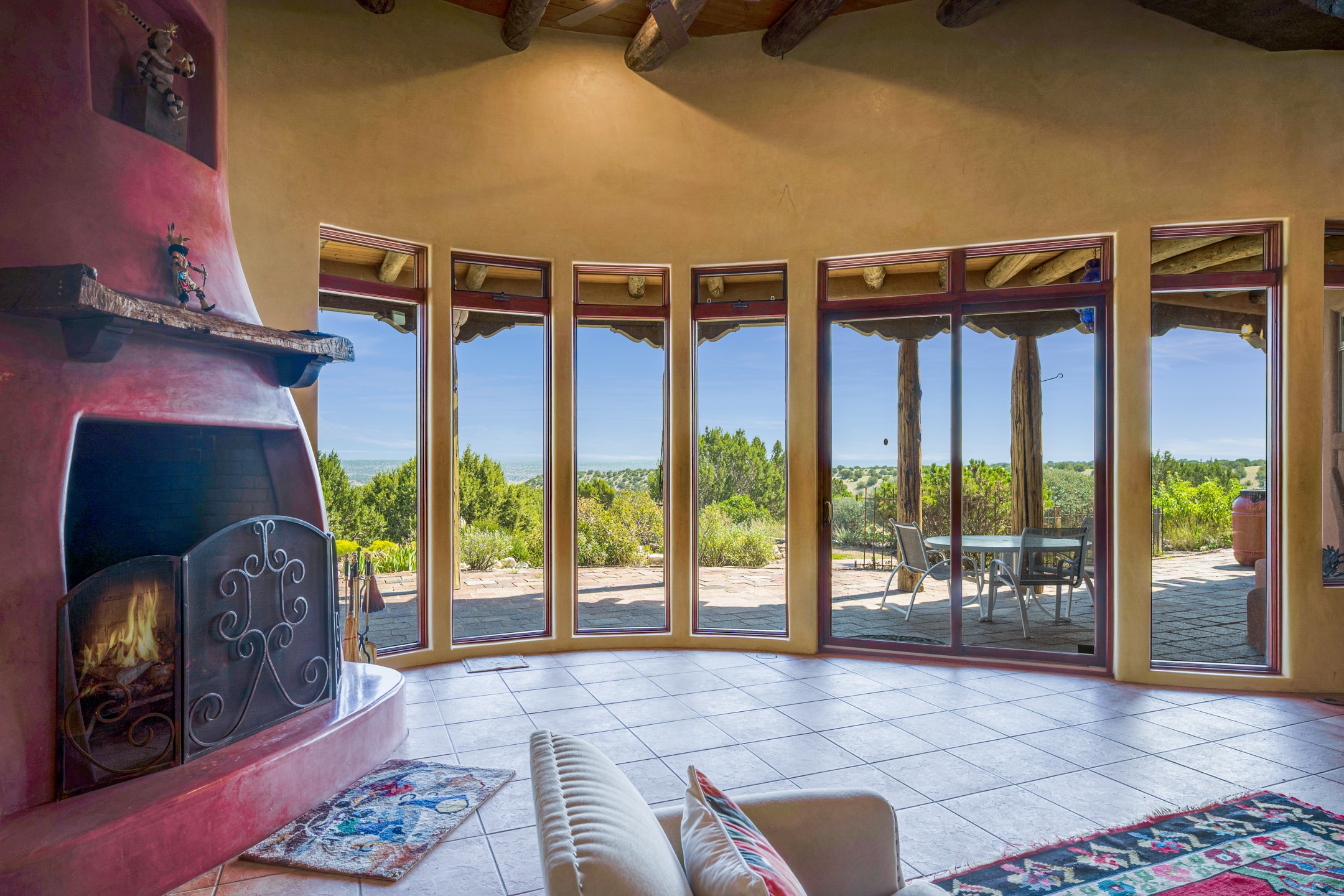 Oro Viejo Ranch is a timeless sanctuary on 106 acres. A harmonious blend of natural splendor, meticulous craftsmanship, and modern convenience. There are breathtaking panoramic views of the Sangre de Cristo, Ortiz Mountains, Cerrillos Hills, and the iconic Lone Butte. The main residence showcases authentic Southwest style, adobe and rastra construction. It features intricate plasterwork, recycled wood vigas, and a heated indoor pool, the rooftop deck offers truly unobstructed views. The solid oak cabin adds rustic charm, originally owned by the Hoover family, and rebuilt on-site. Horse enthusiasts will appreciate the six-stall, barn, tack room, workshop, covered hay storage, electric, and hot water, and protected outdoor runs. A insulated chicken coop provides the perfect setup for fresh eggs, while a private well with a large storage tank ensures a reliable water source.A convenient RV hookup is also available on the property.