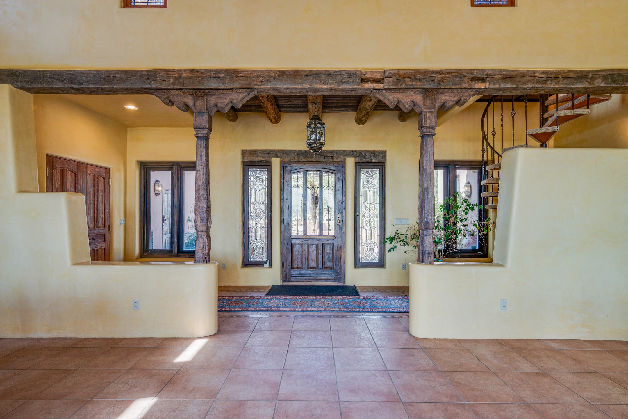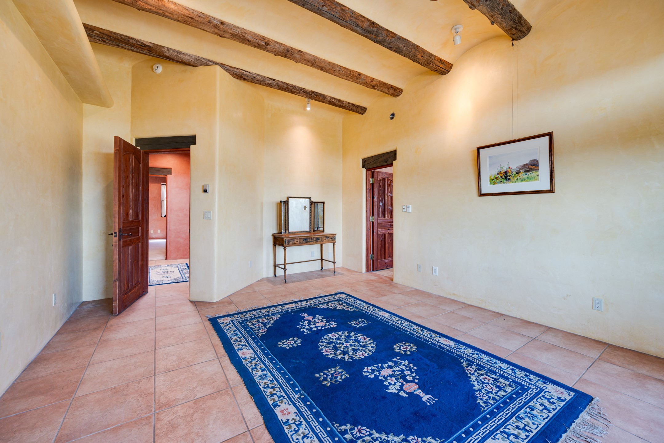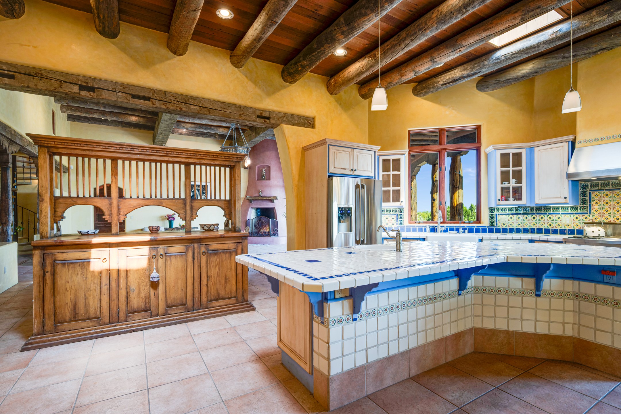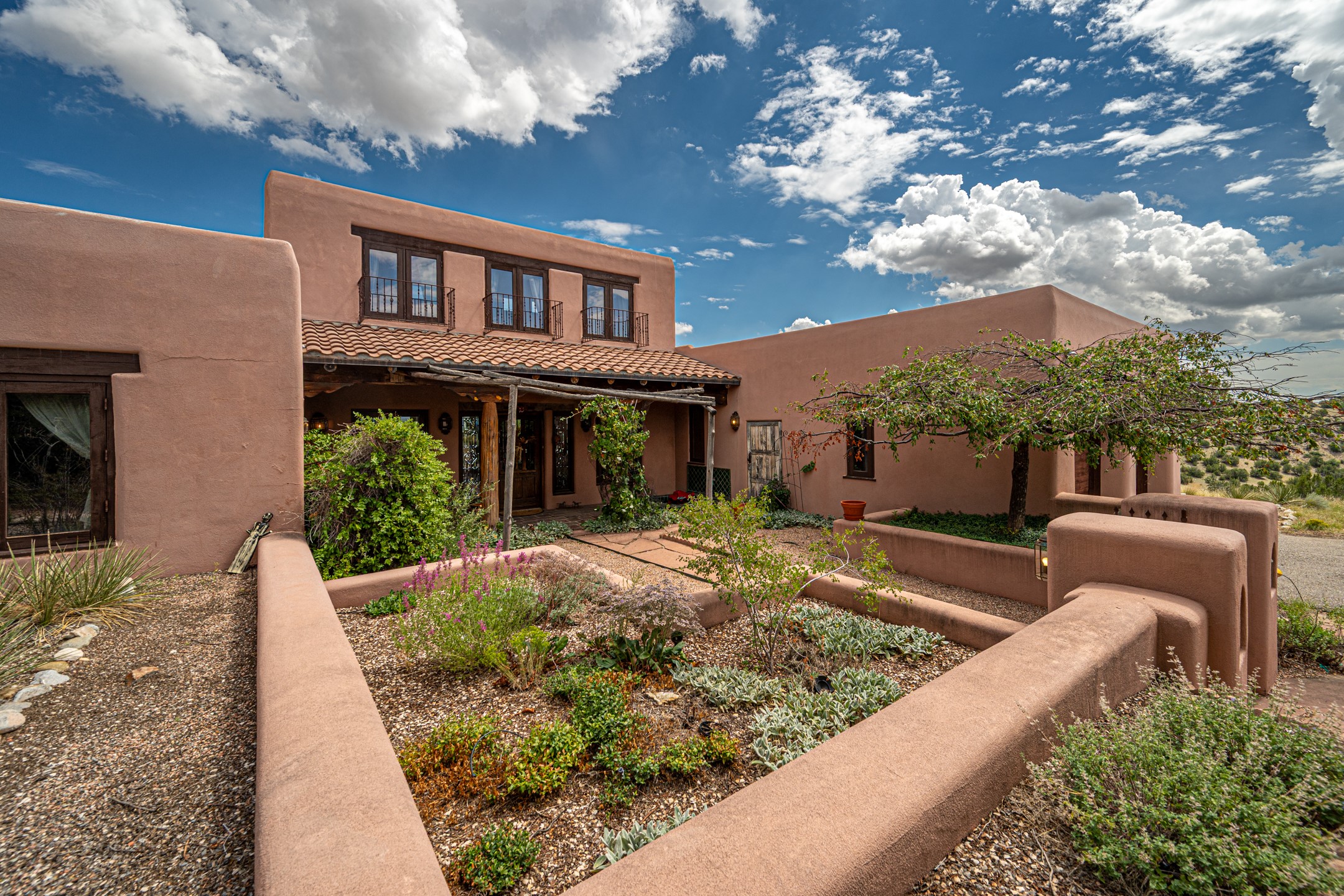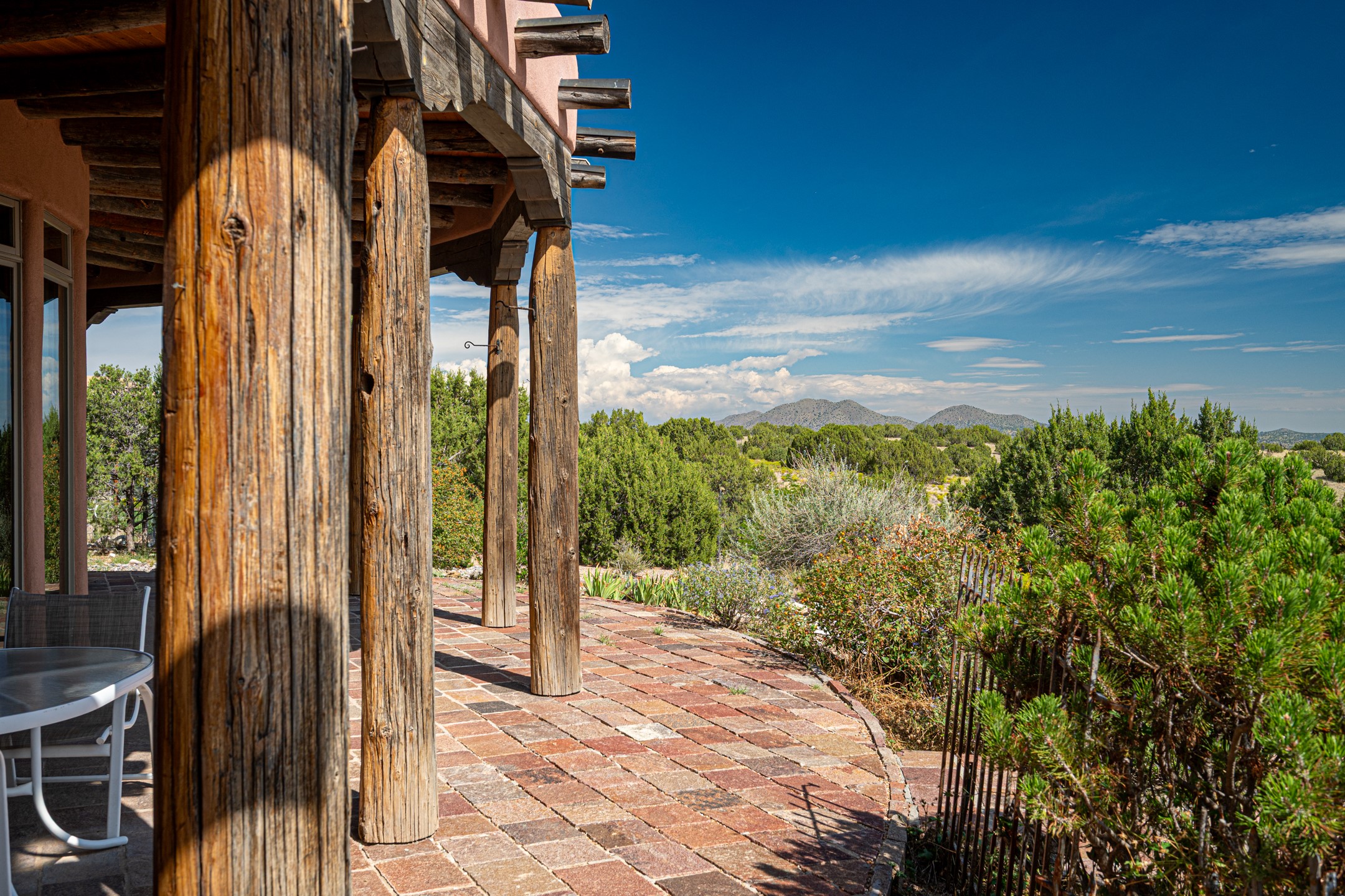 Oro Viejo Ranch is a timeless sanctuary on 106 acres. A harmonious blend of natural splendor, meticulous craftsmanship, and modern convenience. There are breathtaking panoramic views of the Sangre de Cristo, Ortiz Mountains, Cerrillos Hills, and the iconic Lone Butte. The main residence showcases authentic Southwest style, adobe and rastra construction. It features intricate plasterwork, recycled wood vigas, and a heated indoor pool, the rooftop deck offers truly unobstructed views. The solid oak cabin adds rustic charm, originally owned by the Hoover family, and rebuilt on-site. Horse enthusiasts will appreciate the six-stall, barn, tack room, workshop, covered hay storage, electric, and hot water, and protected outdoor runs. A insulated chicken coop provides the perfect setup for fresh eggs, while a private well with a large storage tank ensures a reliable water source.A convenient RV hookup is also available on the property.
