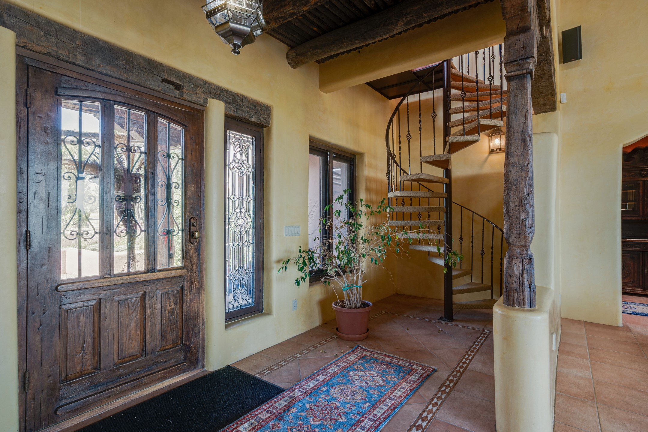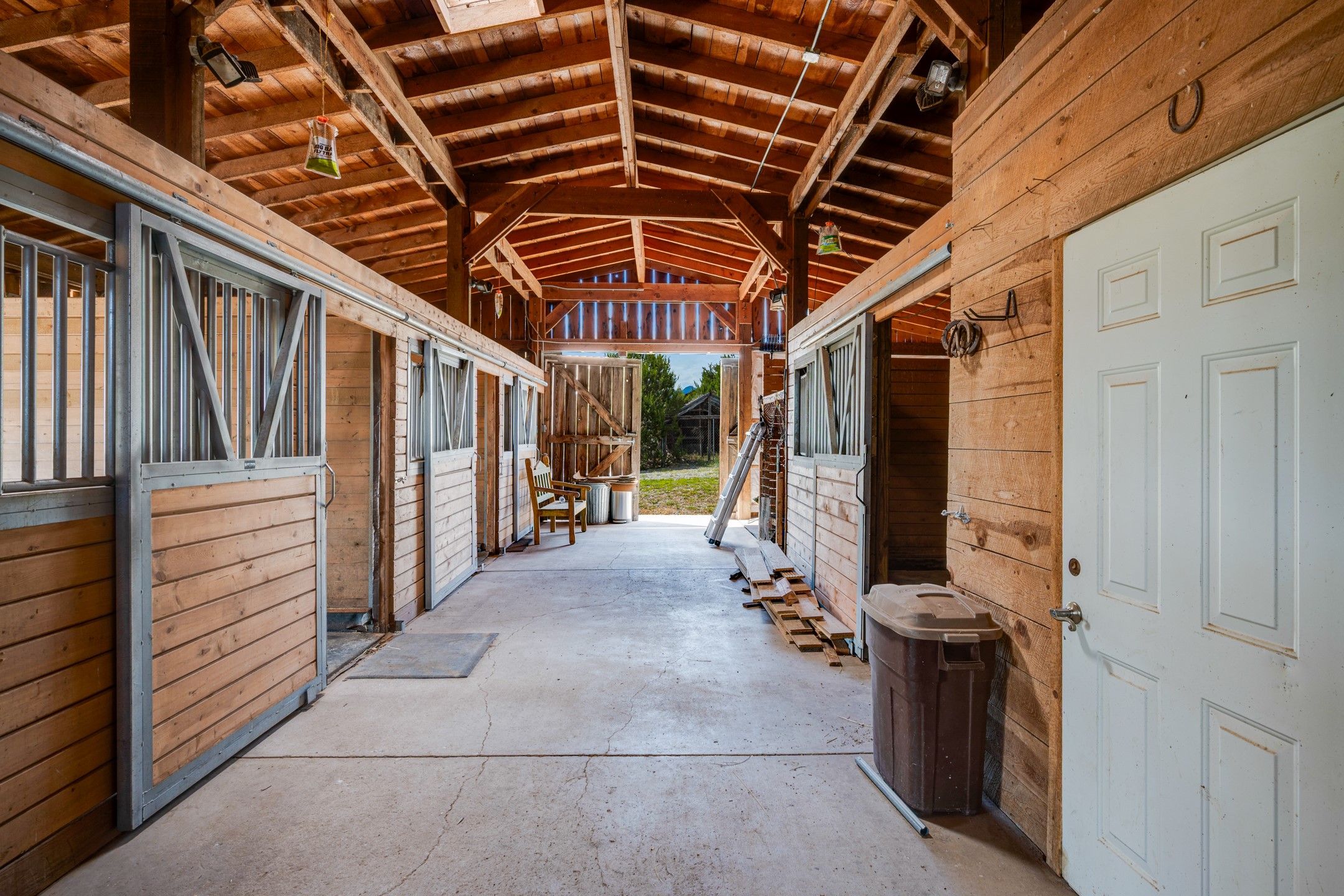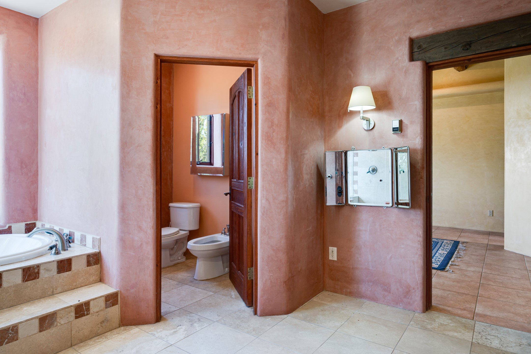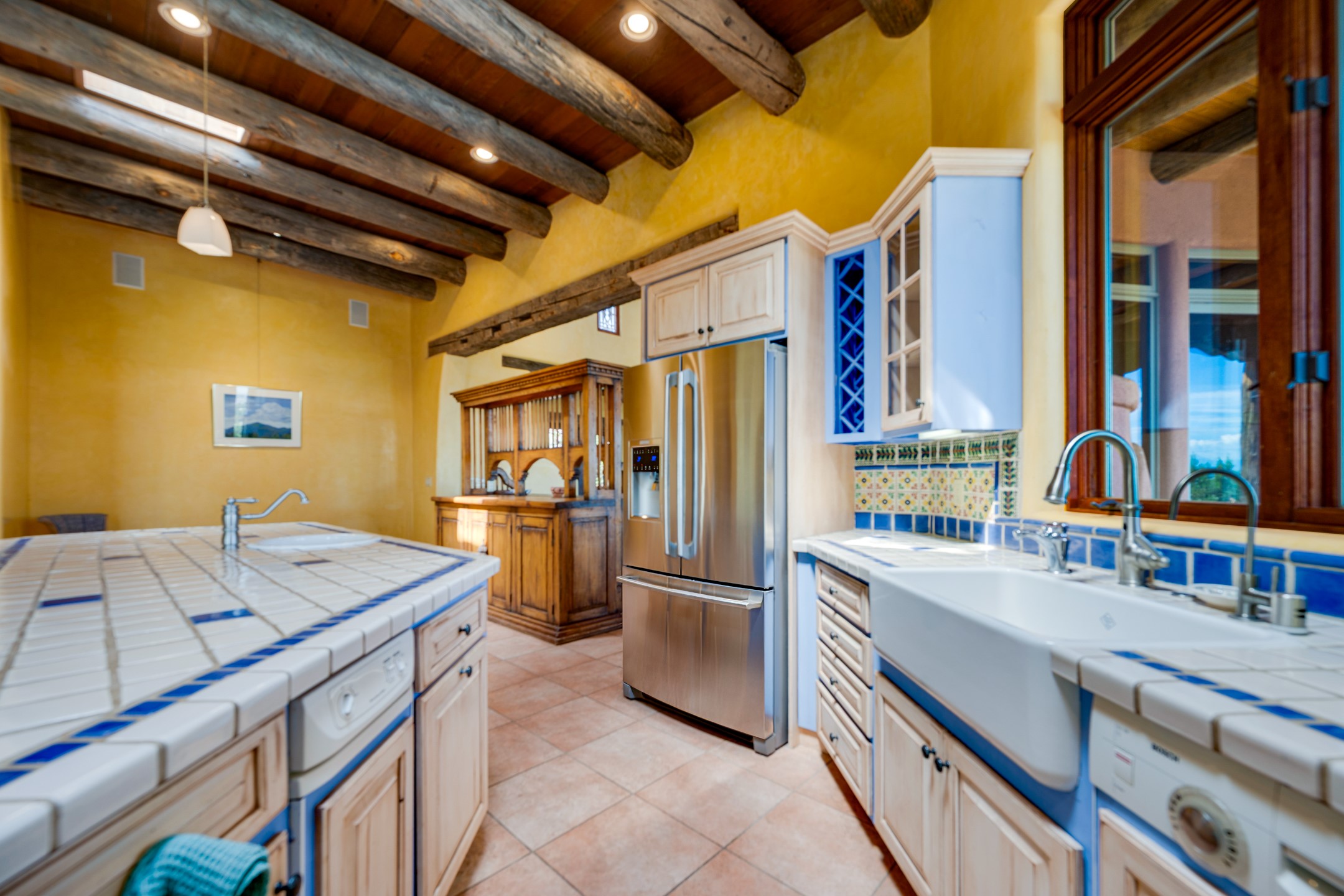 Oro Viejo Ranch is a timeless sanctuary on 106 acres. A harmonious blend of natural splendor, meticulous craftsmanship, and modern convenience. There are breathtaking panoramic views of the Sangre de Cristo, Ortiz Mountains, Cerrillos Hills, and the iconic Lone Butte. The main residence showcases authentic Southwest style, adobe and rastra construction. It features intricate plasterwork, recycled wood vigas, and a heated indoor pool, the rooftop deck offers truly unobstructed views. The solid oak cabin adds rustic charm, originally owned by the Hoover family, and rebuilt on-site. Horse enthusiasts will appreciate the six-stall, barn, tack room, workshop, covered hay storage, electric, and hot water, and protected outdoor runs. A insulated chicken coop provides the perfect setup for fresh eggs, while a private well with a large storage tank ensures a reliable water source.A convenient RV hookup is also available on the property.