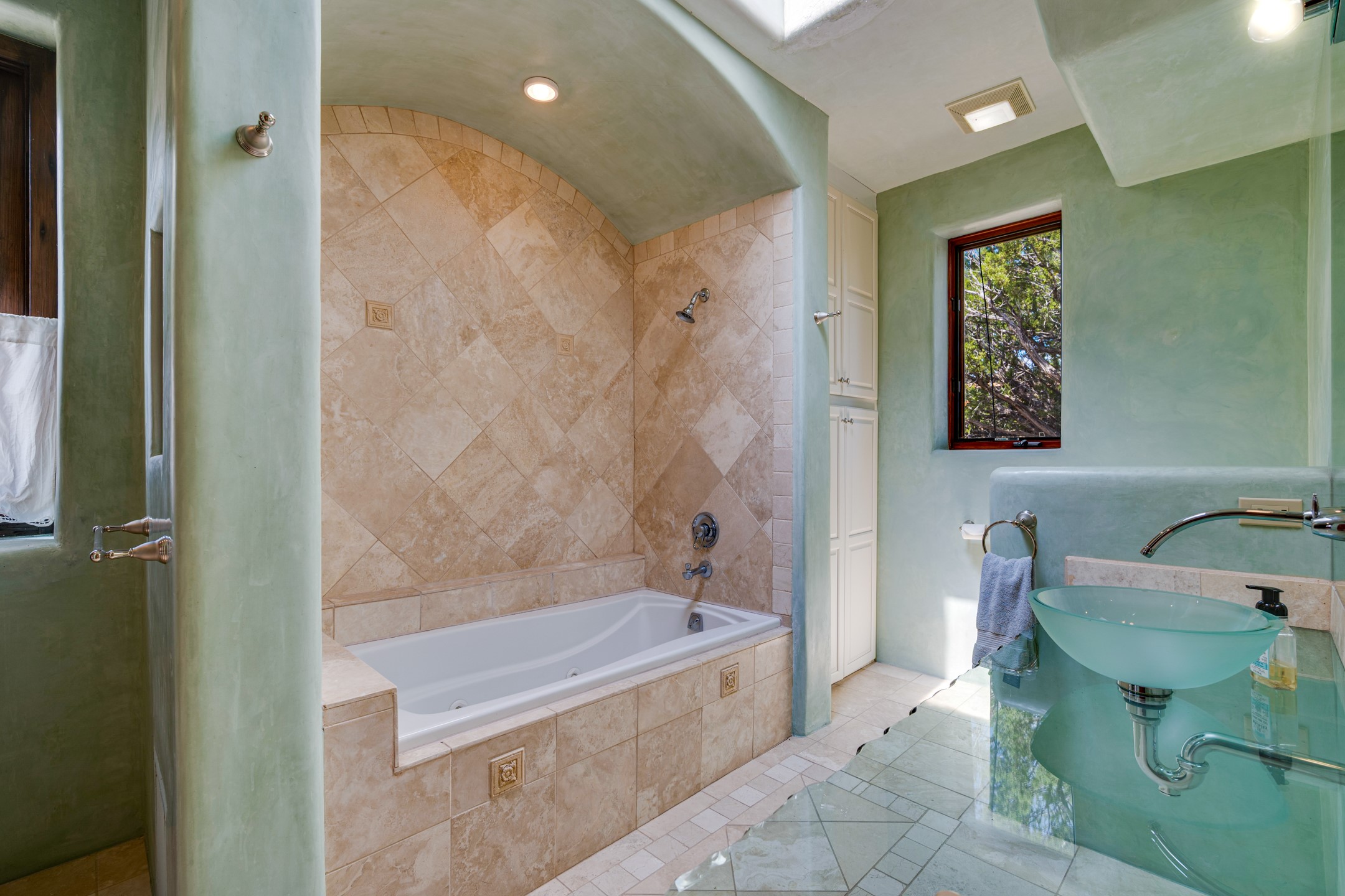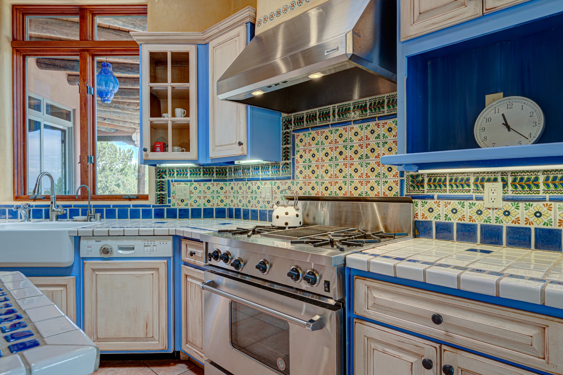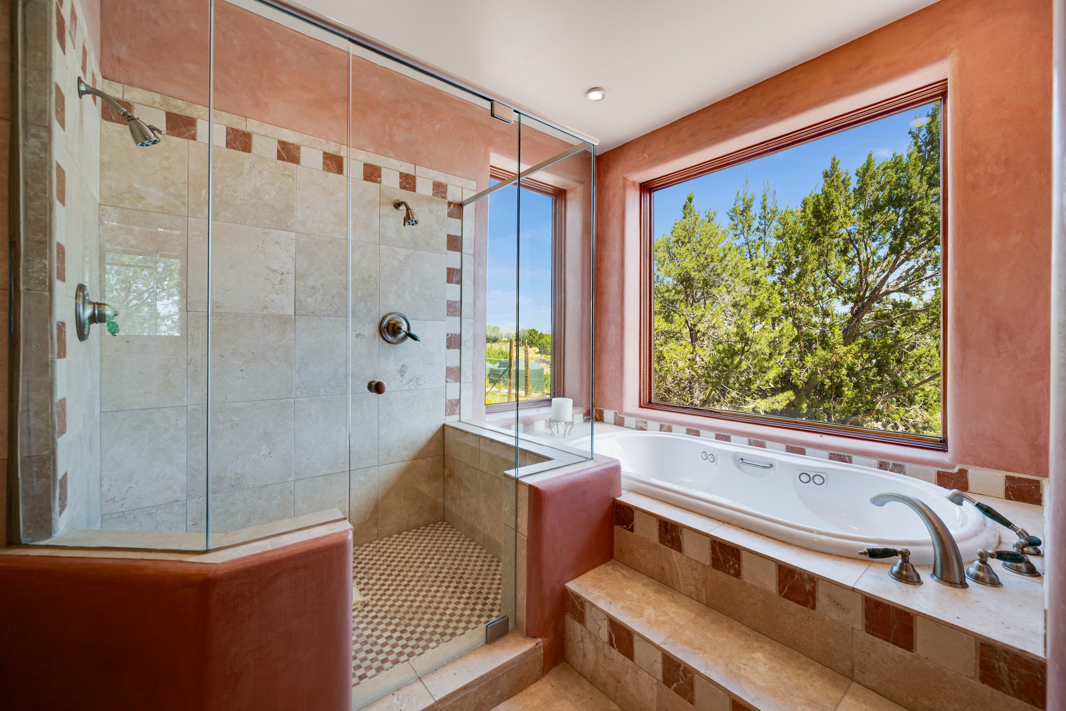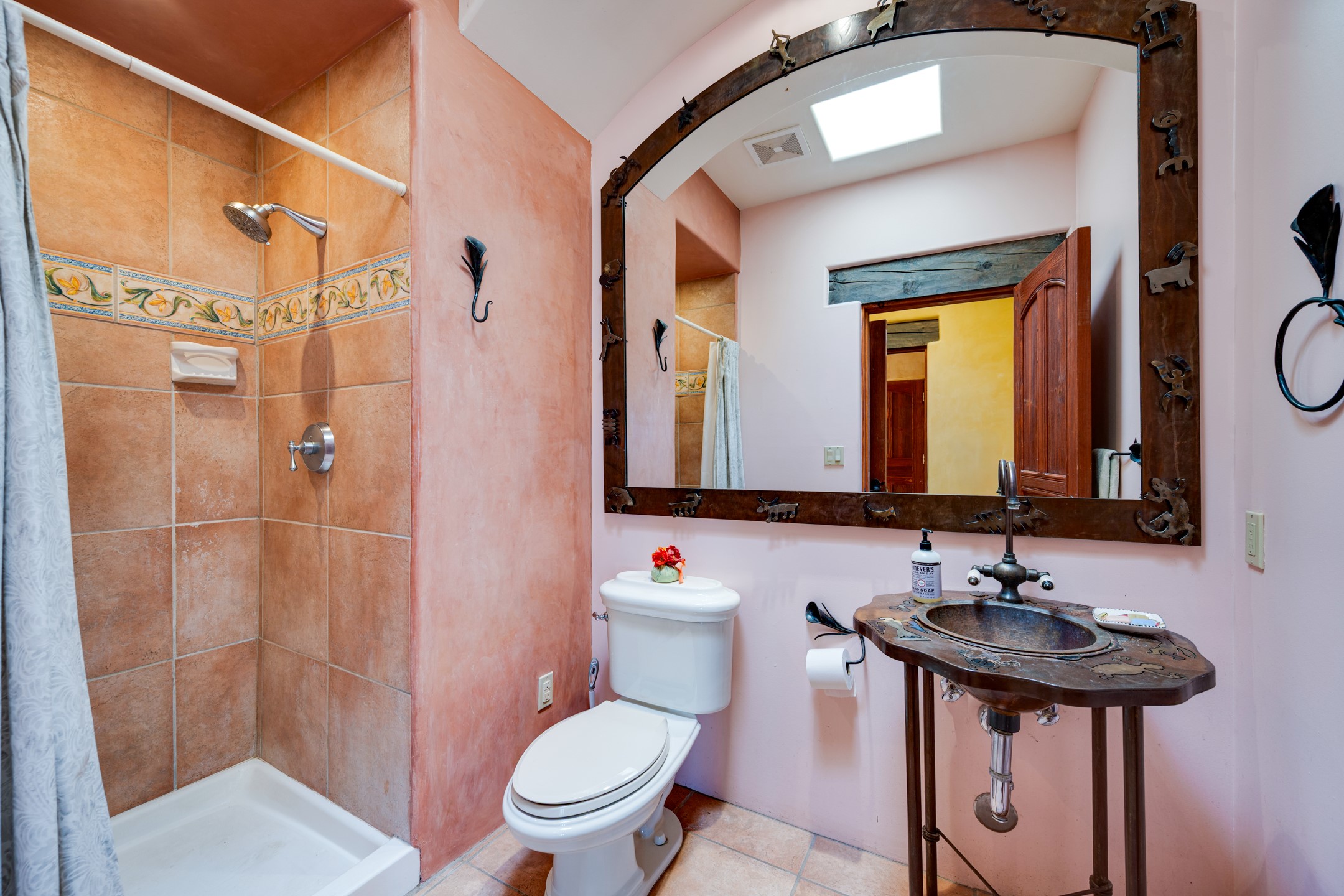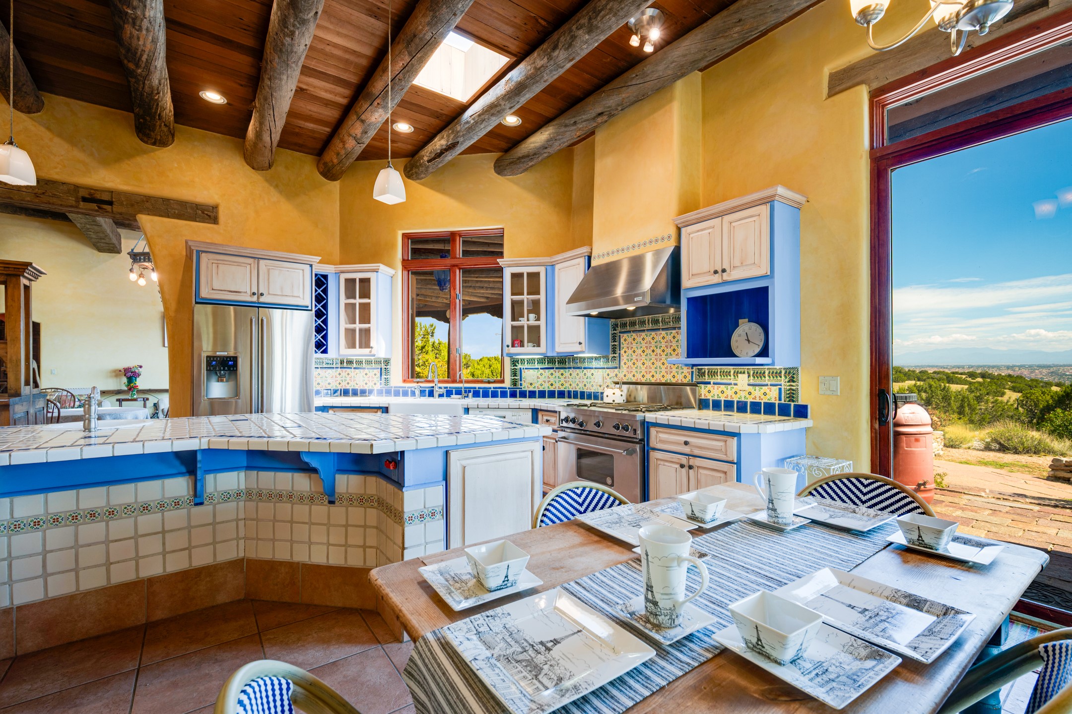 Oro Viejo Ranch is a timeless sanctuary on 106 acres. A harmonious blend of natural splendor, meticulous craftsmanship, and modern convenience. There are breathtaking panoramic views of the Sangre de Cristo, Ortiz Mountains, Cerrillos Hills, and the iconic Lone Butte. The main residence showcases authentic Southwest style, adobe and rastra construction. It features intricate plasterwork, recycled wood vigas, and a heated indoor pool, the rooftop deck offers truly unobstructed views. The solid oak cabin adds rustic charm, originally owned by the Hoover family, and rebuilt on-site. Horse enthusiasts will appreciate the six-stall, barn, tack room, workshop, covered hay storage, electric, and hot water, and protected outdoor runs. A insulated chicken coop provides the perfect setup for fresh eggs, while a private well with a large storage tank ensures a reliable water source.A convenient RV hookup is also available on the property.