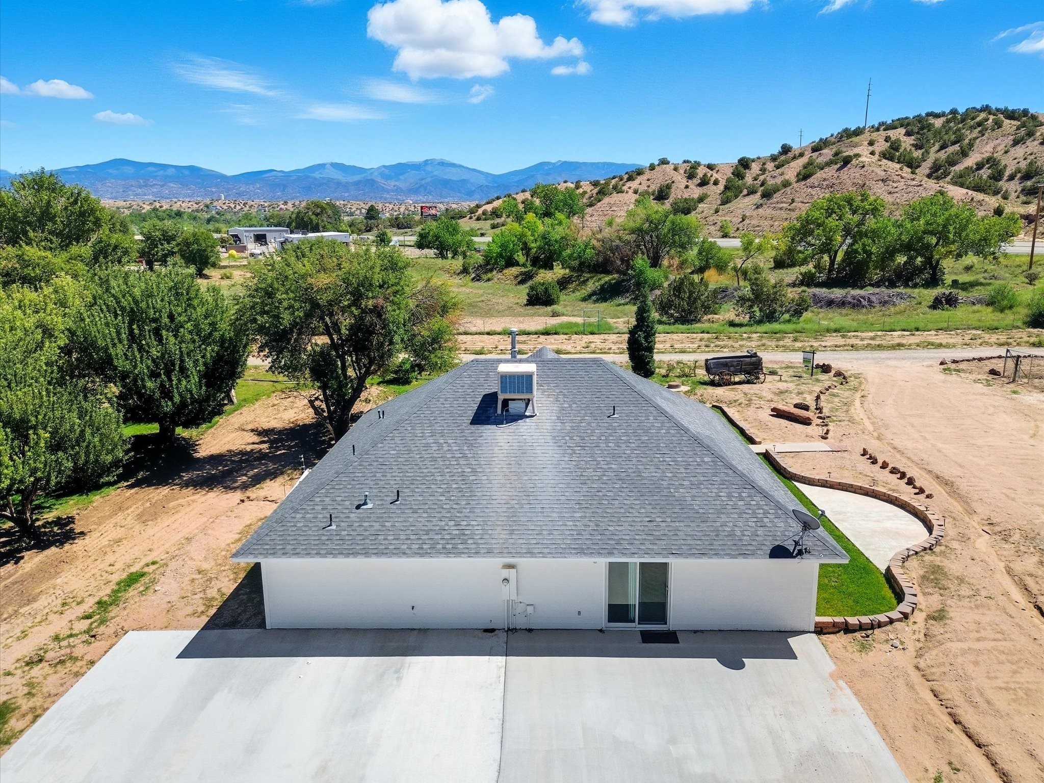 INCREDIBLE FIND - 0.75 acre property w/quality dream home and separate 1,206 sq ft workshop building w/3 garage doors (up to 6 car tandem). Found just 20 minutes from either Santa Fe plaza or Los Alamos National Labs in the coveted & fertile Pojoaque valley complete w/irrigation water rights. Special features of the home incl: new roof (installation 9/2025), newly painted interior & exterior, energy-saving Pella thermal windows, in-floor radiant heat for cozy winter days, 2 low-maintenance gas diamond plaster kiva fireplaces, tile or new high-quality engineered wood flooring throughout (no carpet!), updated baths with a Dream Style Shower, and a total kitchen remodel w/new cabinetry | stainless steel appliances | granite slab countertops. *Also available on 1.5 acres (including adjacent .75 acre lot) for September 2025 appraised value of $845,000.*