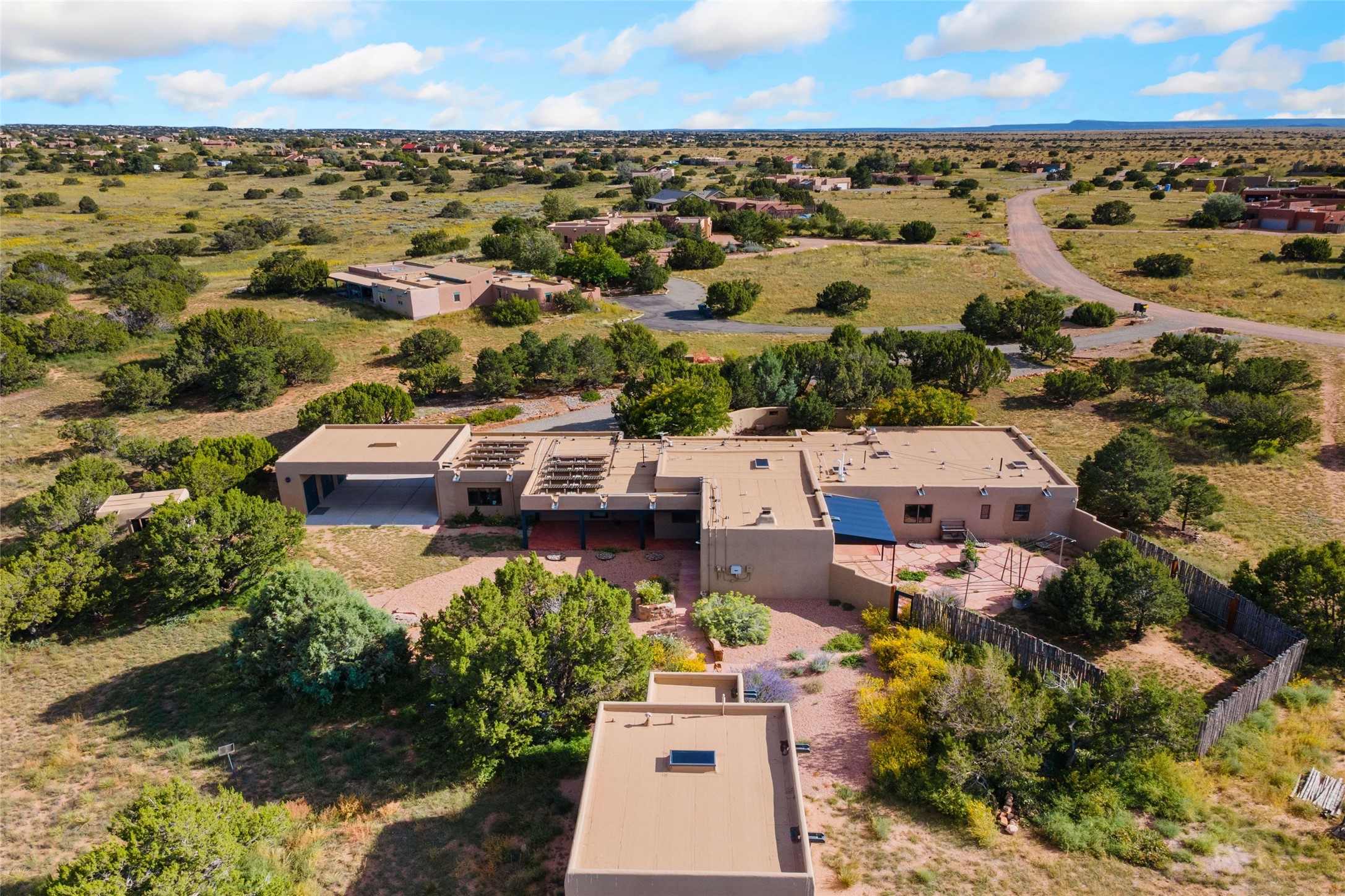 Introducing an elegant, single level, custom adobe home on almost 2 acres with absolutely everything! With an office area, 3 bedrooms, two art studios and 3 patios, the house is flexible enough for the most discerning Buyer. Walk to the front door through a large beautifully landscaped, walled courtyard and enter this light and bright home with high beamed ceilings and a dramatic fireplace - the incredible views to the east and to the west bring the outdoors in. Glass doors open to two different outdoor patios. The spacious open floor plan leads you naturally from the breathtaking living room, to the cozy, comfortable dining area which opens onto the renovated, gourmet, custom kitchen. Alder cabinets, granite countertops, under cabinet lighting and excellent appliances - every detail of this home was lovingly crafted and thoughtfully designed. The contemporary primary suite has a large walk-in closet and the bathroom has a jetted walk-in tub as well as a separate shower area. Another bedroom has a large fireplace and the two guest bedrooms share a bathroom with cheerful Mexican tile. Yes, two separate art studios! First, an attached former woodwork shop/ceramics studio with radiant heat followed by the newly constructed separate studio with high ceilings, art storage, excellent light and a bathroom. The studio has custom raw lime plaster walls. Light filled, with beautiful views from every window, the house is situated on an expansive greenbelt; quiet and privacy prevail. The home has solar panels providing supplemental electricity and a shared well, with excellent water, so utility bills are minimal. Improvements include a 2-year-old roof with a 10-year warranty, a high efficiency boiler with tankless hot water, drip irrigation and a large attached car port with high ceilings and ample storage. There is even a Catio for your feline friends!
