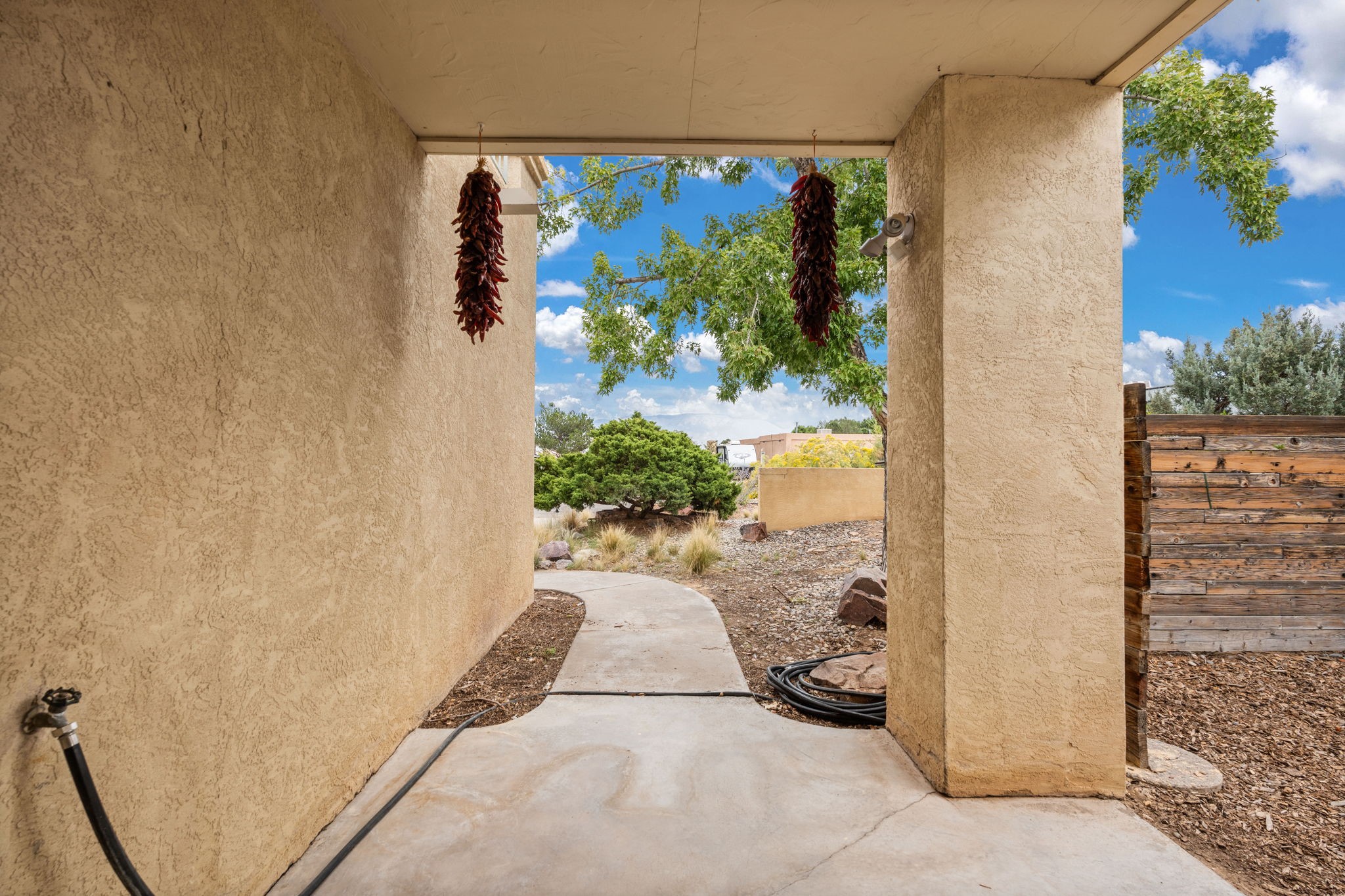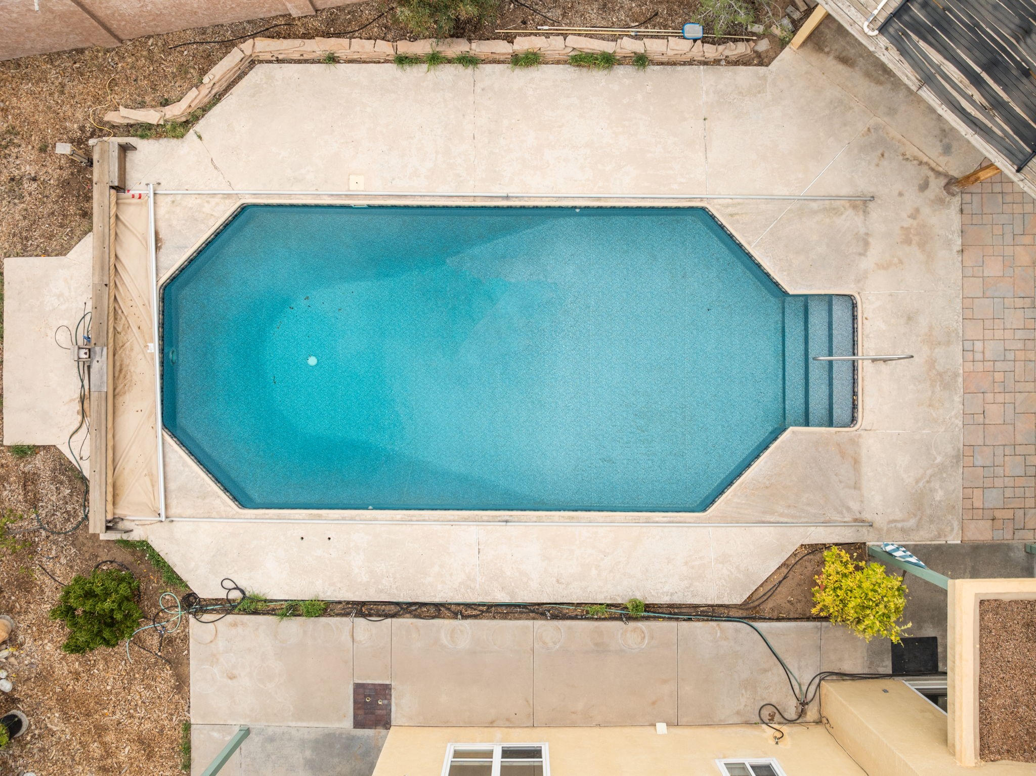Well loved two story home with an in ground pool 40*18 in Length and 4ft-8ft depth. Updated, new floors, spacious living areas quality living, defined yet open rooms that access the outside pool/ patio area. Large study with built in's, half bath, all on main floor. Upstairs newly carpeted with two large bedrooms, hall bath, primary bedroom with Sandia Mountains views welcoming you every morning. Access to east deck. Fabulous! Situated on a private cul de sac. Green house to enjoy all year long, and dual CFA unit for the second level with Refrigerated air. A wonderful place to call home.
