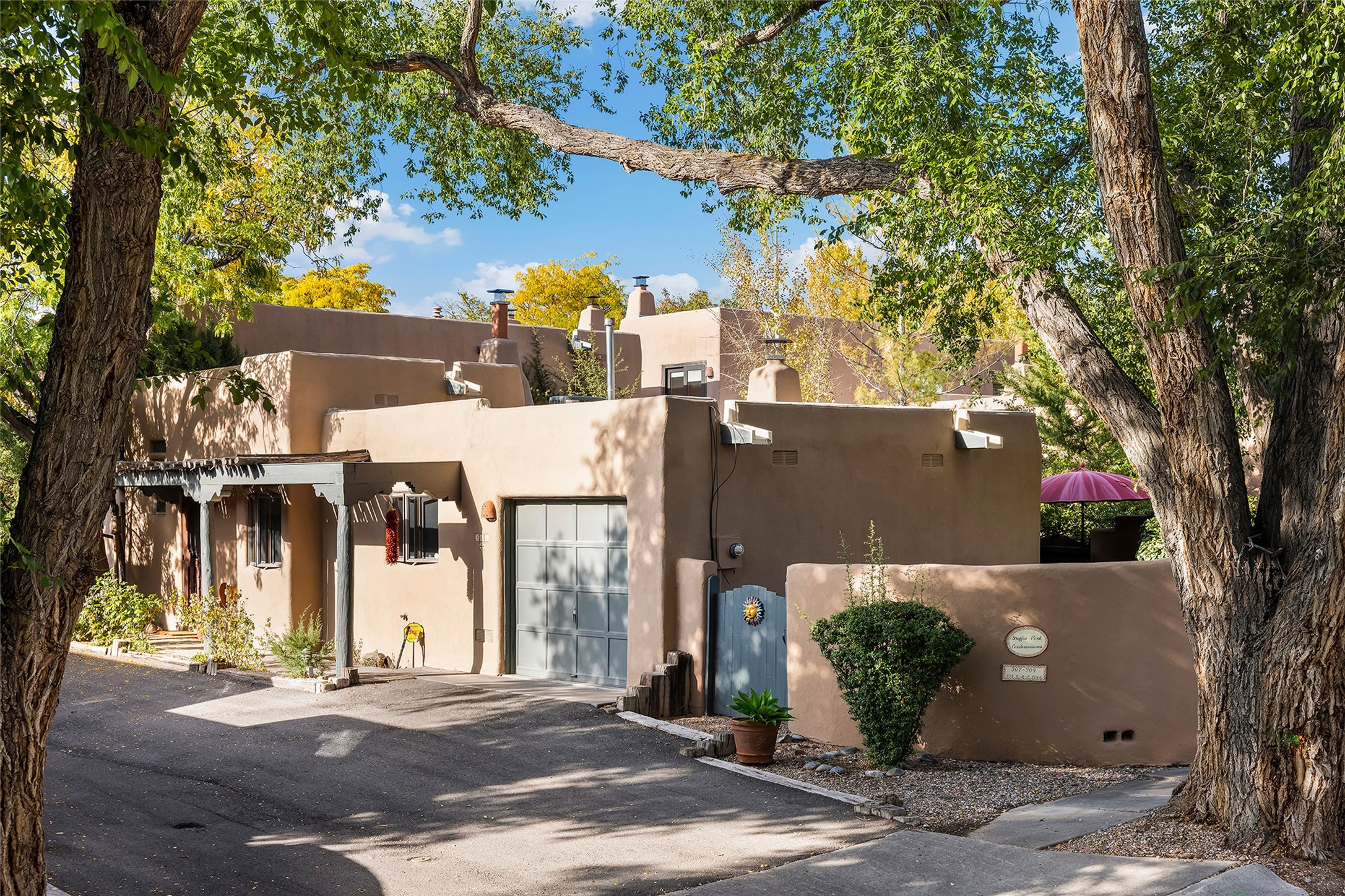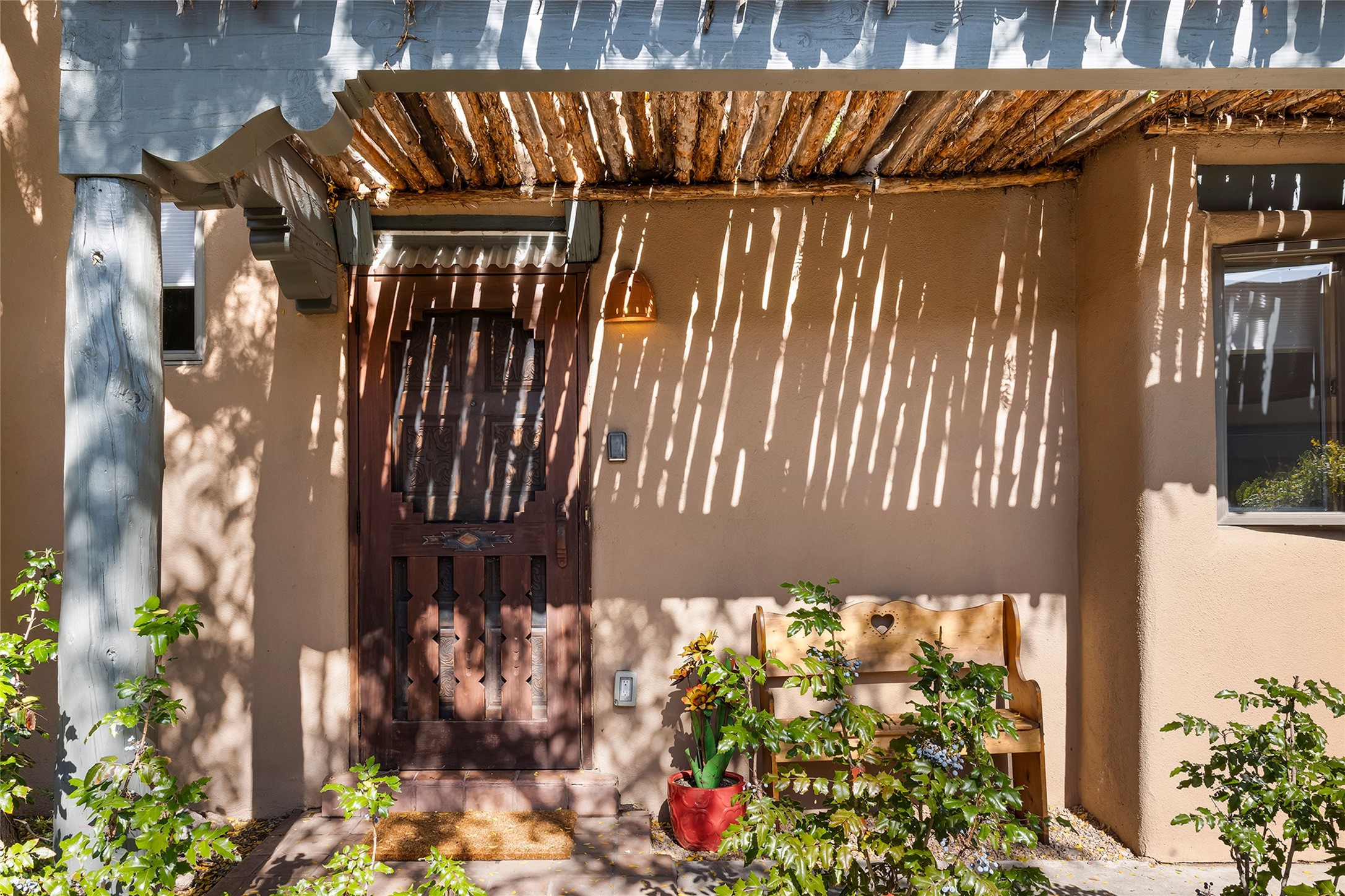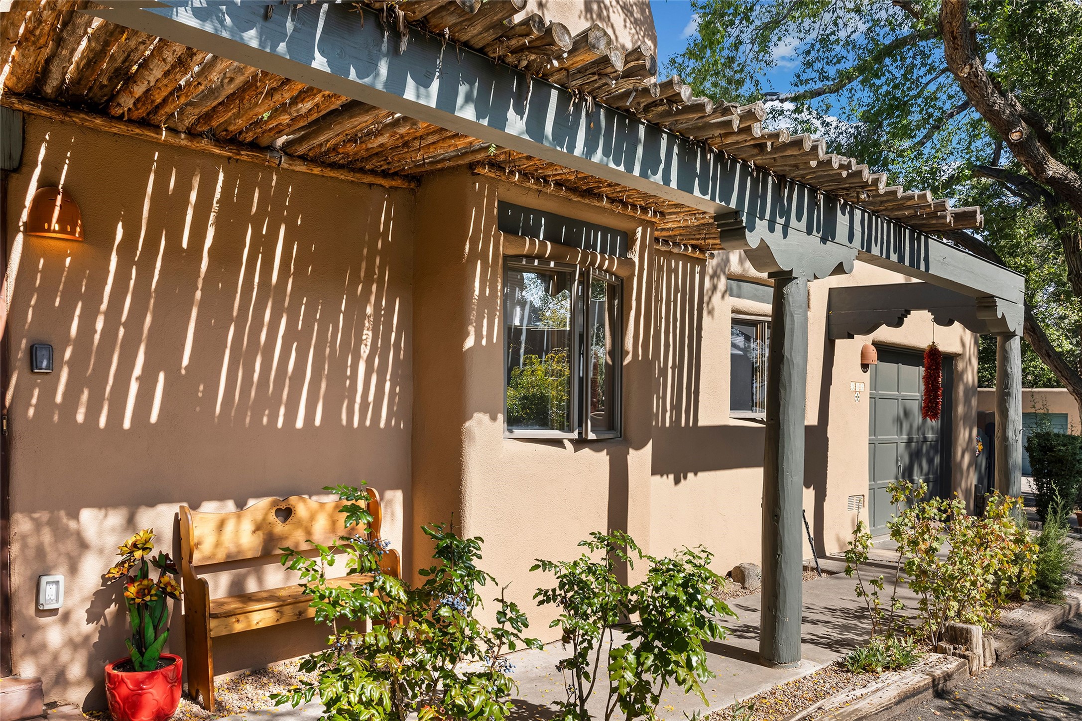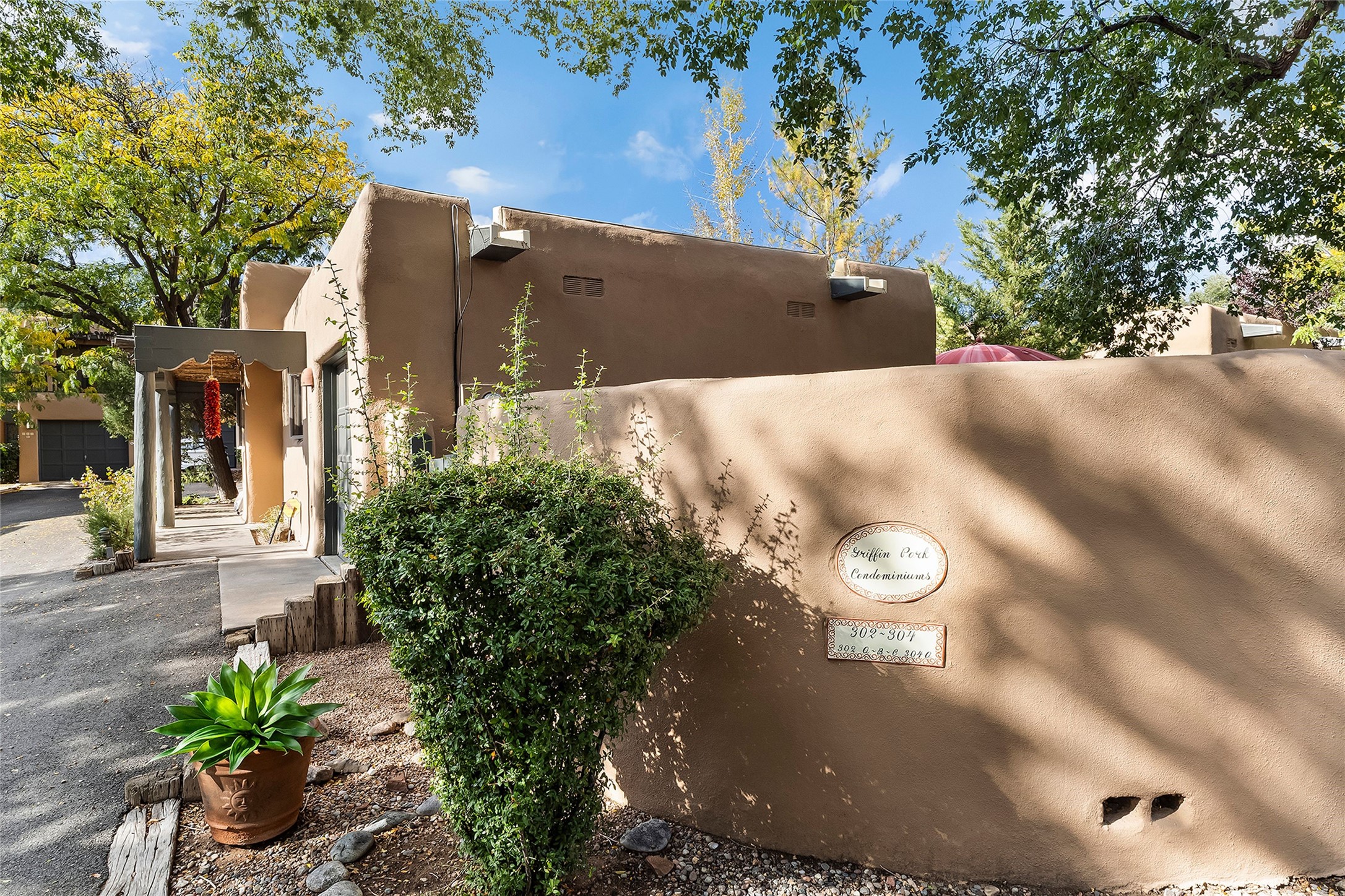 In-town Santa Fe living at its best!Rare single-level, 2-bedroom, 2-bath Santa Fe-style condo in the highly sought-after Griffin Park Condo community--just a few blocks from the Plaza. This charming home features classic Santa Fe details including a front portal with Latillas, Vigas, Saltillo tile floors and two Kiva wood burning fireplaces. In September 2025, the seller added a built in wine refrigerator and a stainless steel Frigidaire appliance package that included a stove, refrigerator and dishwasher. The kitchen has a bar seating and the pantry/laundry room connects directly to the attached single car garage for easy access and extra storage. The spacious primary suite offers a large closet and its own fireplace with French doors that open to the private courtyard under a canopy of trees. Modern comforts include central heating and air, tankless water heater and full-size washer and dryer. HOA covers water, sewer, trash, roof, stucco, and exterior landscaping. Quiet end-unit location on a peaceful street--ideal as a primary residence, pied--terre, or investment.