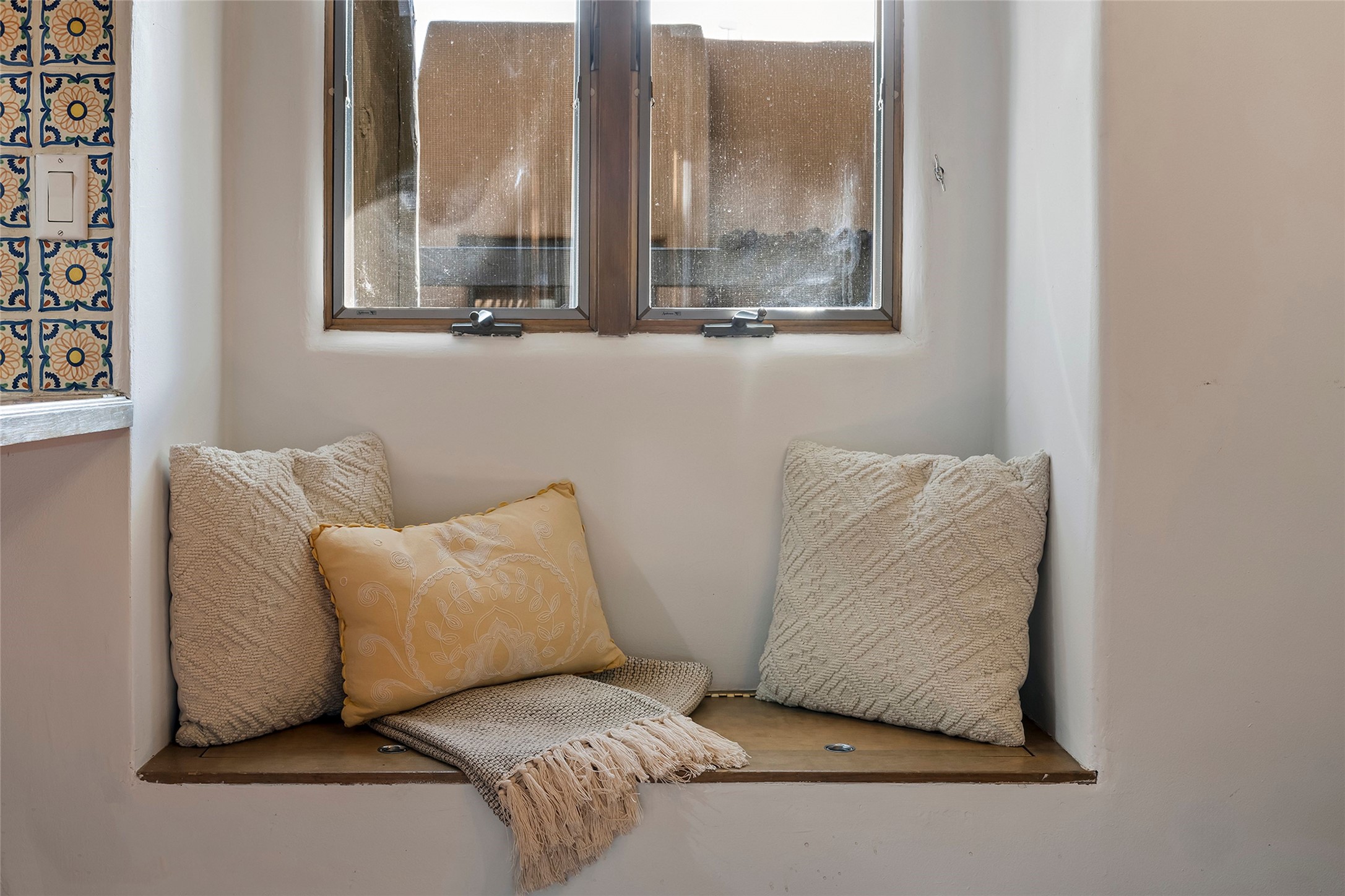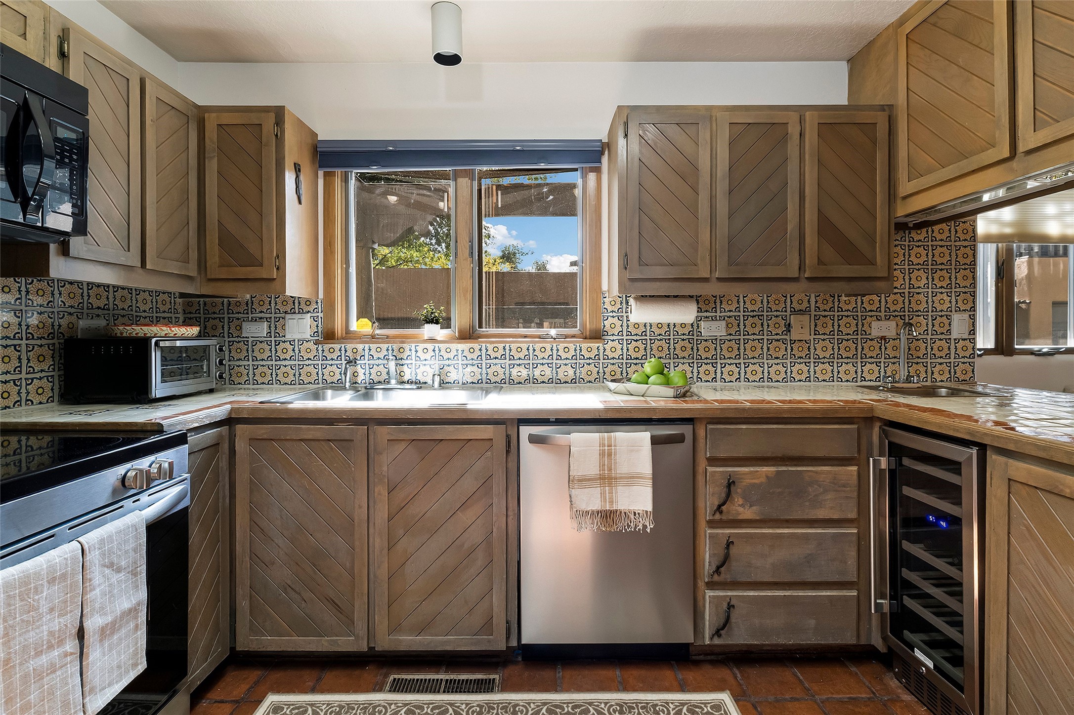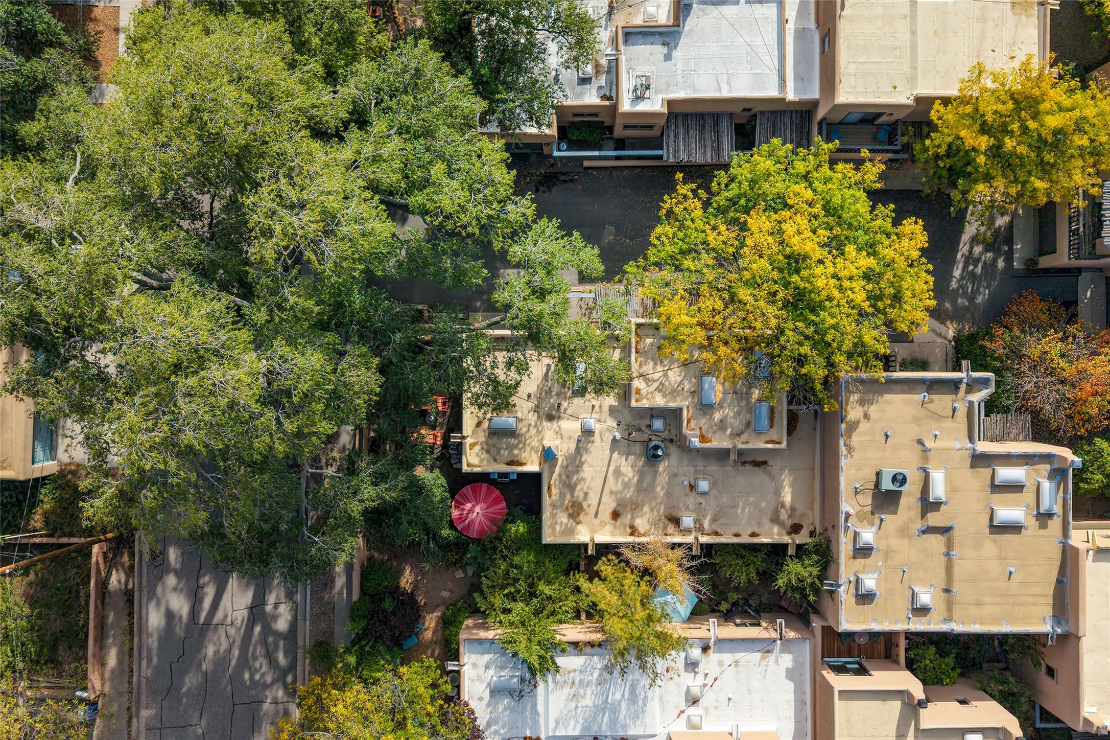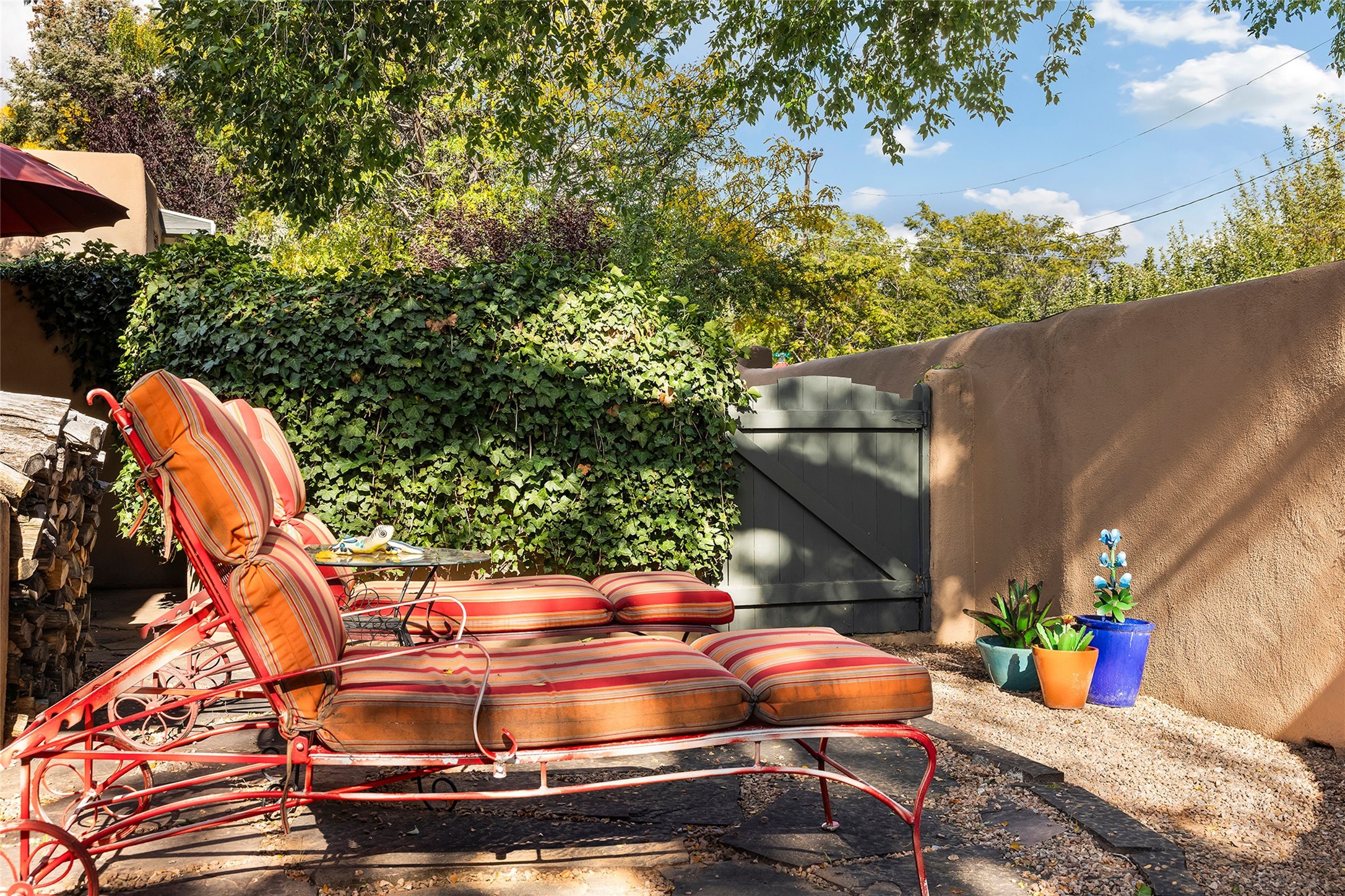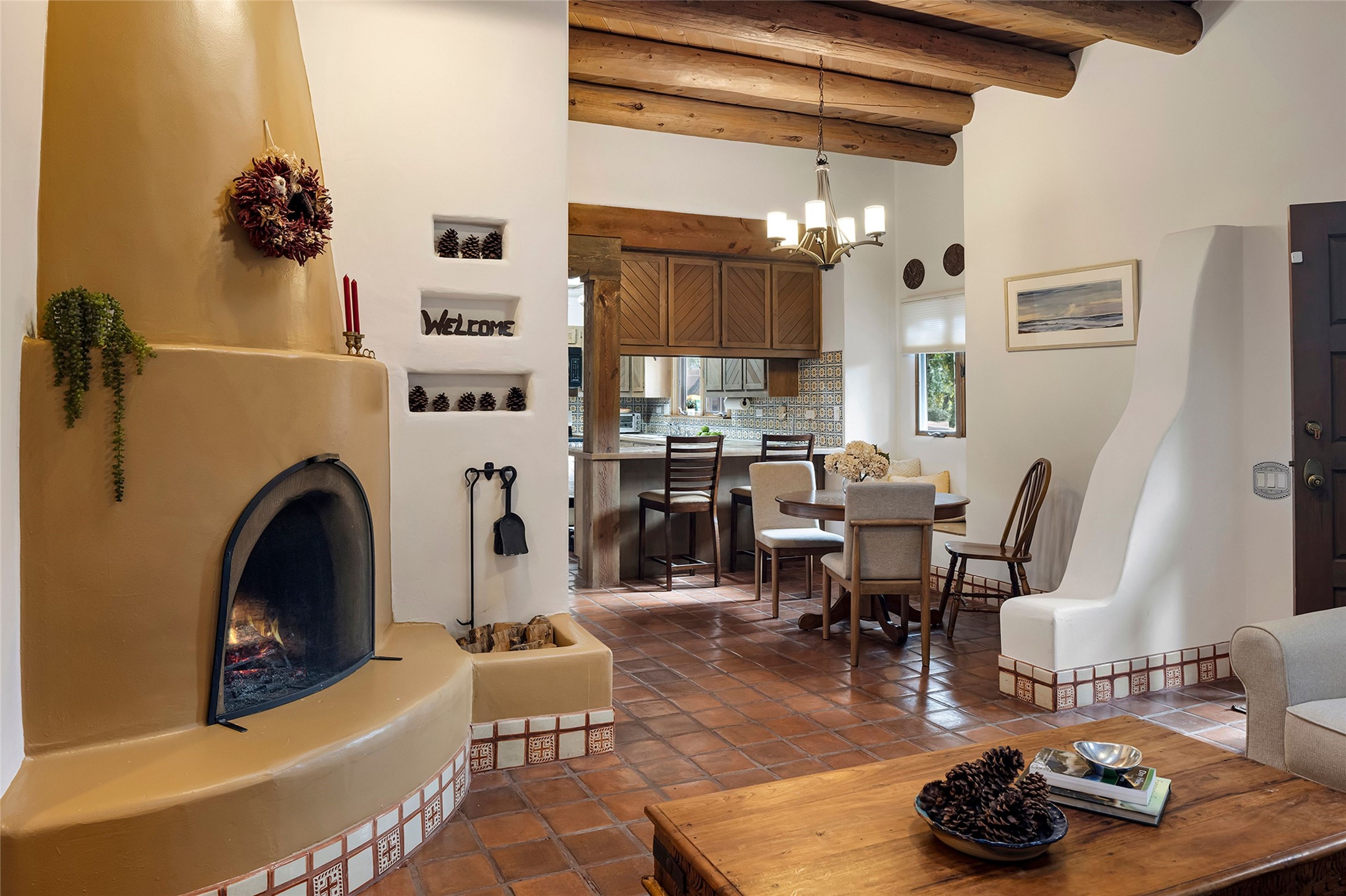In-town Santa Fe living at its best!Rare single-level, 2-bedroom, 2-bath Santa Fe-style condo in the highly sought-after Griffin Park Condo community--just a few blocks from the Plaza. This charming home features classic Santa Fe details including a front portal with Latillas, Vigas, Saltillo tile floors and two Kiva wood burning fireplaces. In September 2025, the seller added a built in wine refrigerator and a stainless steel Frigidaire appliance package that included a stove, refrigerator and dishwasher. The kitchen has a bar seating and the pantry/laundry room connects directly to the attached single car garage for easy access and extra storage. The spacious primary suite offers a large closet and its own fireplace with French doors that open to the private courtyard under a canopy of trees. Modern comforts include central heating and air, tankless water heater and full-size washer and dryer. HOA covers water, sewer, trash, roof, stucco, and exterior landscaping. Quiet end-unit location on a peaceful street--ideal as a primary residence, pied--terre, or investment.