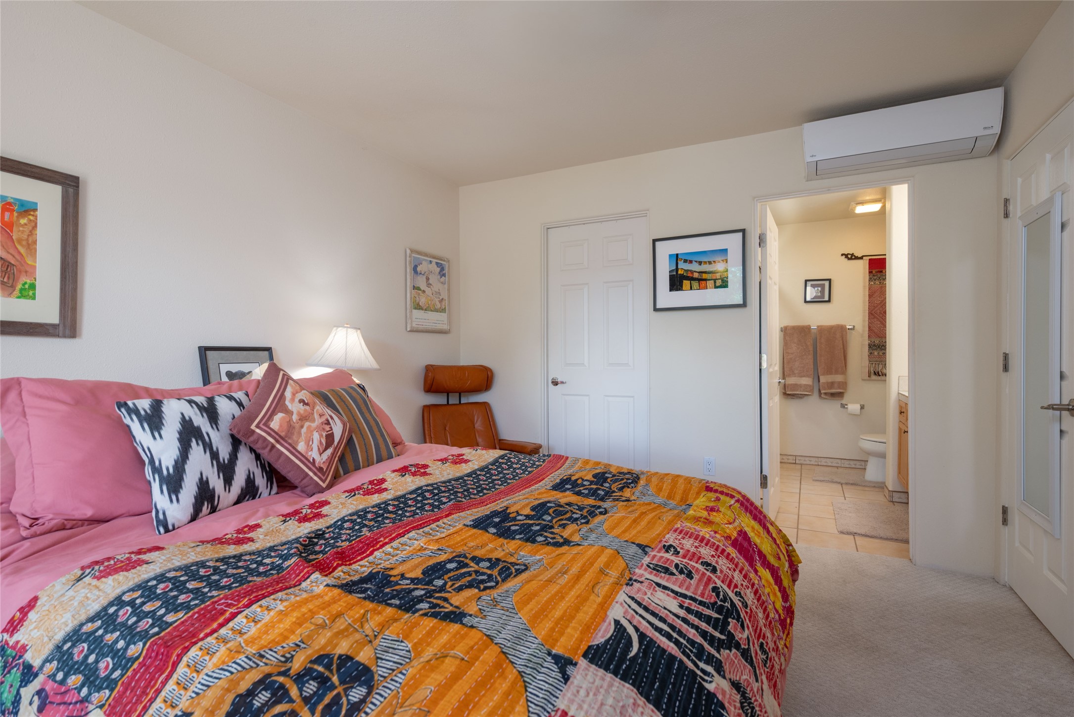 Minutes to De Vargas Mall, Down Town Plaza and Highway 285/84 .This light filled Townhome with spectacular views has it all. The open Living area features Cathedral ceilings, vigas, fireplace and walk out to private courtyard..The radiant floor heating is enhanced with refrigerated ductless A/C heat splits in living room and both upstairs bedrooms. Each Bedroom features en suite baths and the primary bedroom has its own balcony and walk in closet. Other features include skylights, nichos, and parking for guests .. Furniture for sale separately...Don't forget the oversized 2 car garage which offers extra storage space !!