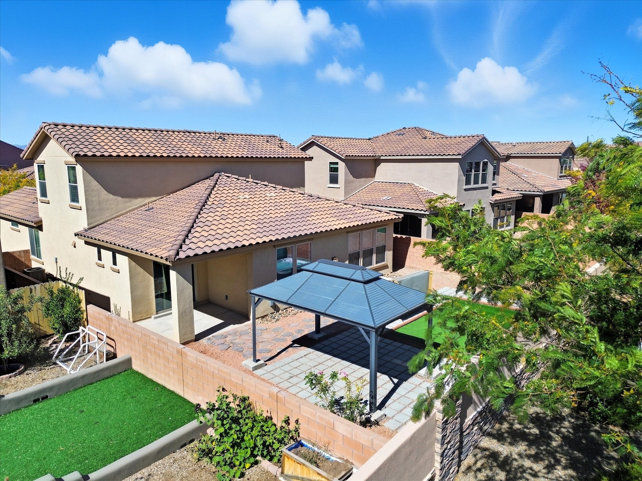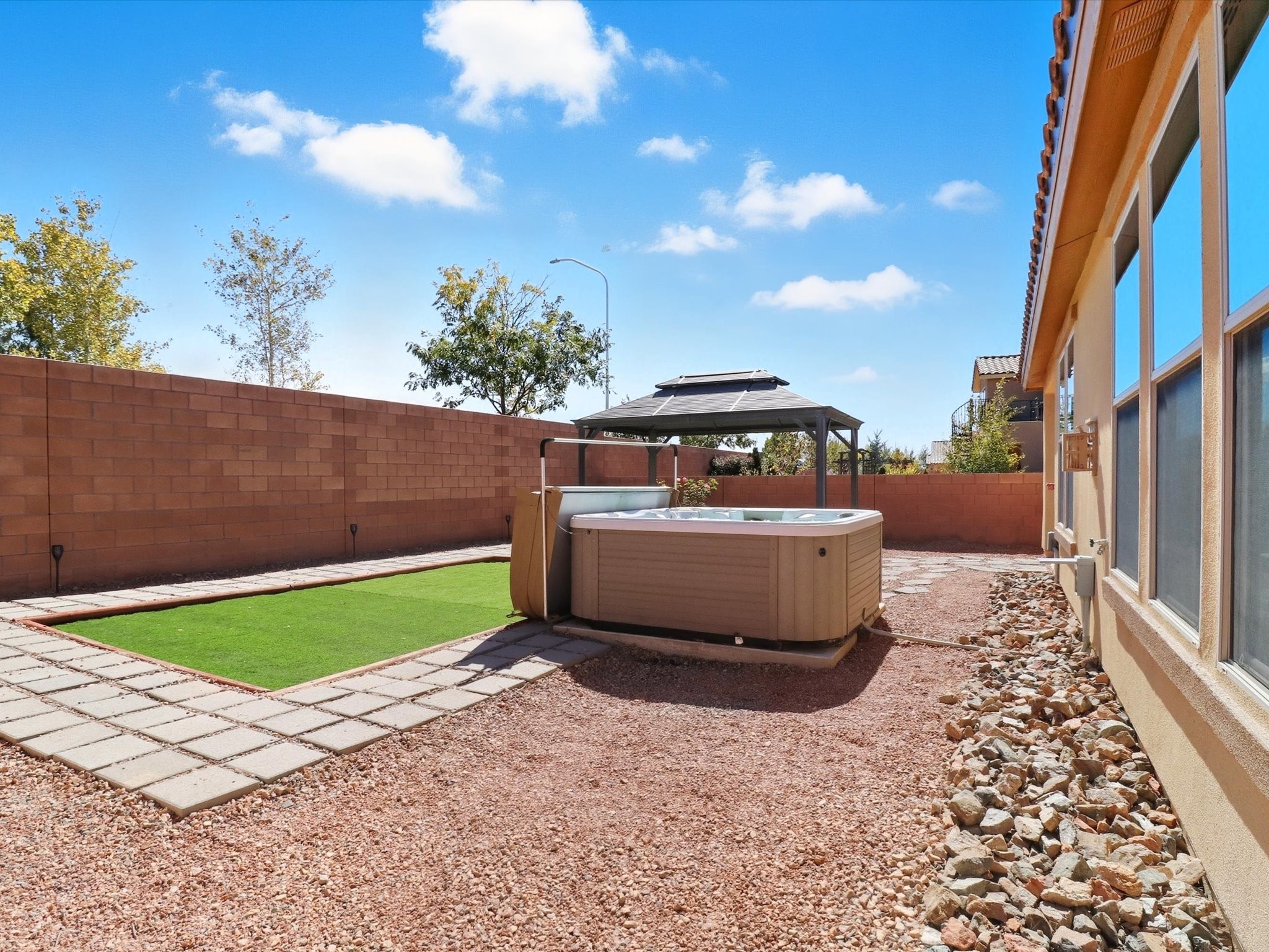Welcome to your dream home in one of Las Soleras' most desirable neighborhoods -- this well-maintained home offers elegance, functionality, and peace of mind with warranties and new features throughout.This home has a brand-new carpet, ceiling fans in every room, and upgraded 8-foot doors, adding a touch of sophistication and spaciousness throughout. The Kitchen is with granite countertops, new backsplash, new faucet, and a brand-new refrigerator, while the bathrooms feature quartz vanities, new faucets, and upgraded shower heads.Every detail has been thoughtfully refreshed -- from the new washer and dryer to the WiFi-enabled garage door opener and new weatherproof rubber entryway perfect for winter durability. Enjoy peace of mind with the remainder of the Pulte structural warranty, AC/heater and water heater warranties, and a 6-month refurbishment warranty on the hot tub.The zeroscaped backyard is designed for low-maintenance living, complete with a 50-amp outdoor service, ideal for gatherings or future enhancements. The extended garage provides space for a workshop, and CenturyLink wiring ensures high-speed connectivity. Pet lovers will appreciate the dog door conveniently leading into the garage, while guests will love the ample parking space directly across the home and the upstairs loft with a full bath -- a perfect retreat for visitors or entertainment.Located on a perimeter lot close to mailboxes and neighborhood conveniences, this home embodies modern Santa Fe living with unmatched practicality and style.Move-in ready, fully upgraded, and built to last -- this Las Soleras gem is a rare find you don't want to miss.