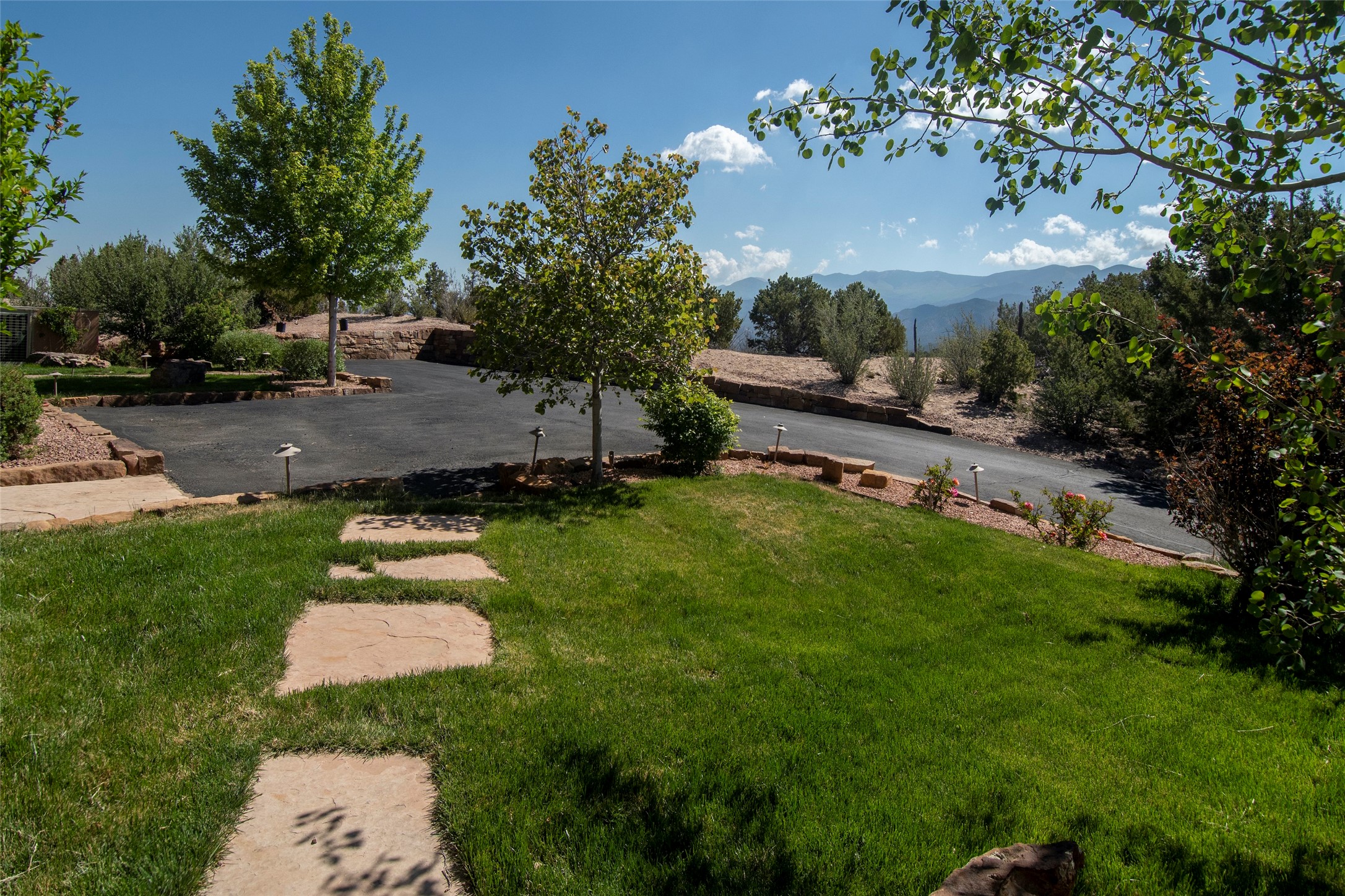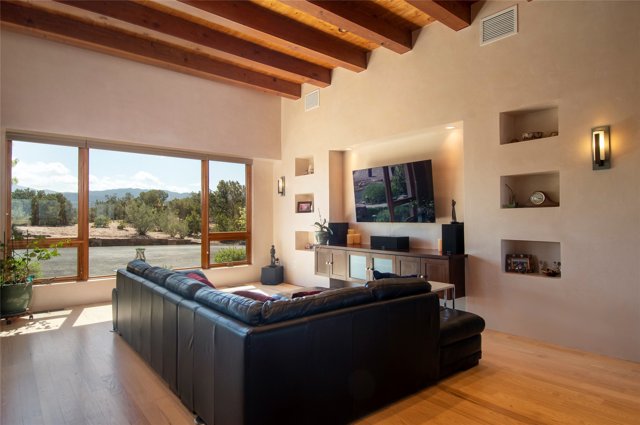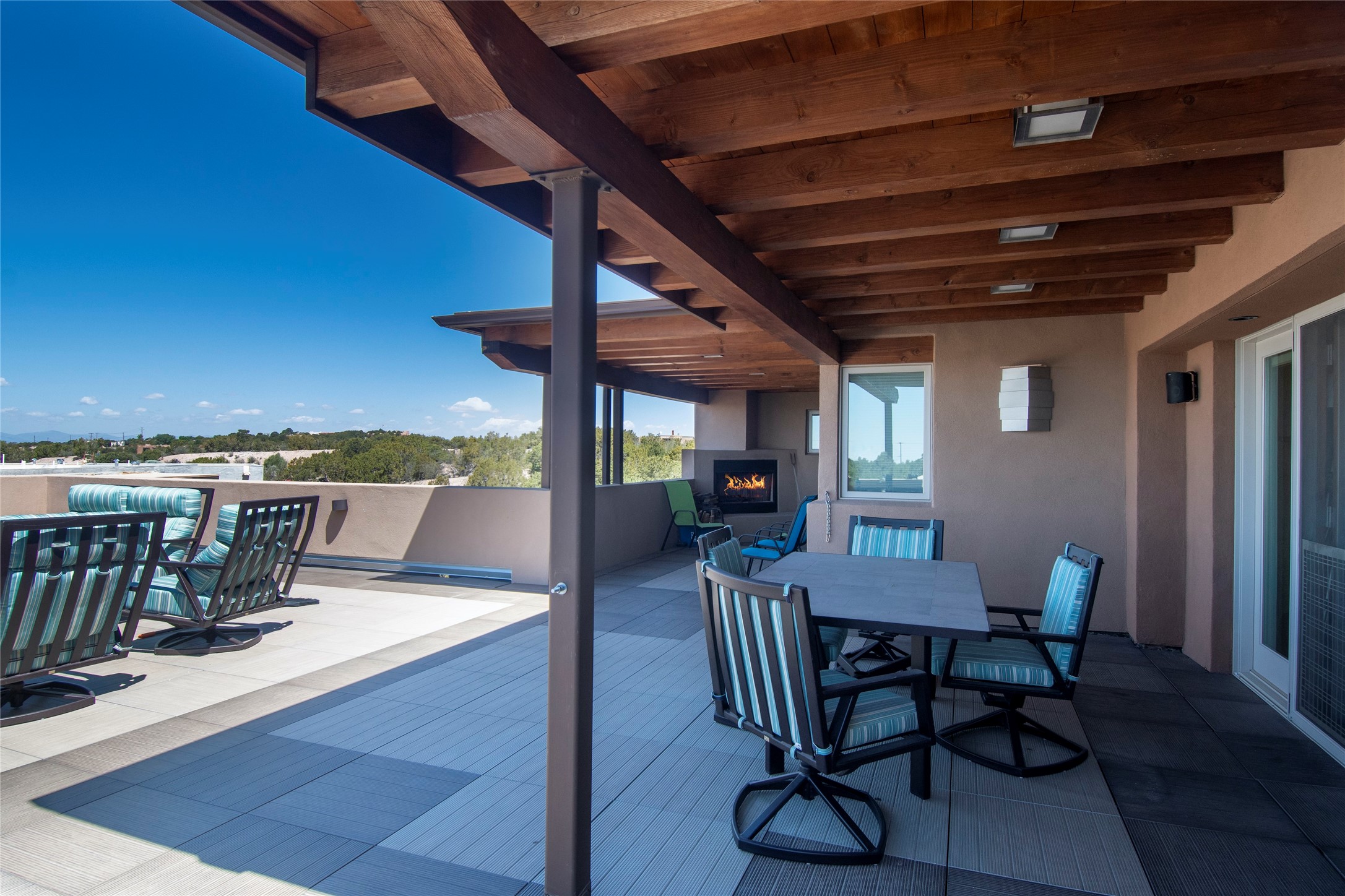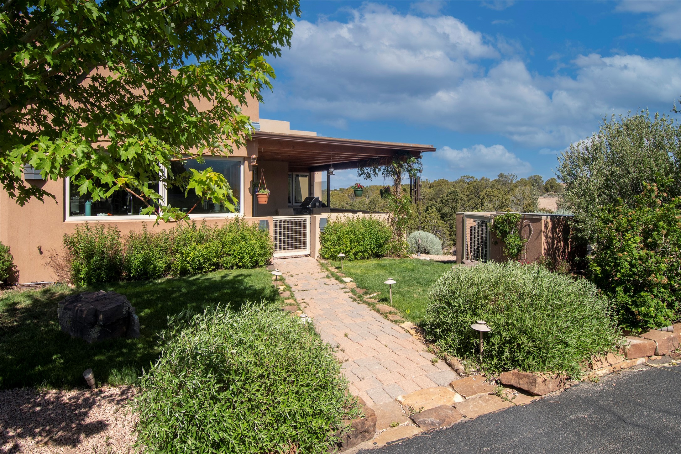This Michael Bauer custom designed, contemporary, two-story home was built by long time Santa Fe builder, Gary Lincoln, for himself. Known for quality construction and excellent designs, the best finishes and appliances were used in building this stunning home. The 3520 sq ft, open floor plan home is designed for comfortable, easy living and sited perfectly on 2+ acres to take in the breathtaking panoramic mountain views. Striking entry doors lead into the great room where a grand fireplace is a focal point, along with oversized windows that look onto a rooftop deck with fireplace and spectacular mountain views. The kitchen has wall-to-wall windows over the granite countertops on two sides so the chef will never be without a lovely view. A good-sized island with sink, and a walk-in pantry are conveniently located and offer plenty of storage. The appliances are top notch and include a double oven. The portal off the kitchen is the perfect for outdoor entertaining. Adjacent to the kitchen is an office and the master suite with its walk-in closet, beautiful bathroom and private portal with a fireplace. On the other side of the great room are two guest bedrooms each with outside entrances, and a laundry room. The lower level has a spacious den, bathroom, gym, huge storage room, and access to the 3-car garage. Just minutes to the Plaza in Santa Fe, and located in a small, highly desirable gated community, this home has easy access to walking and biking trails.
