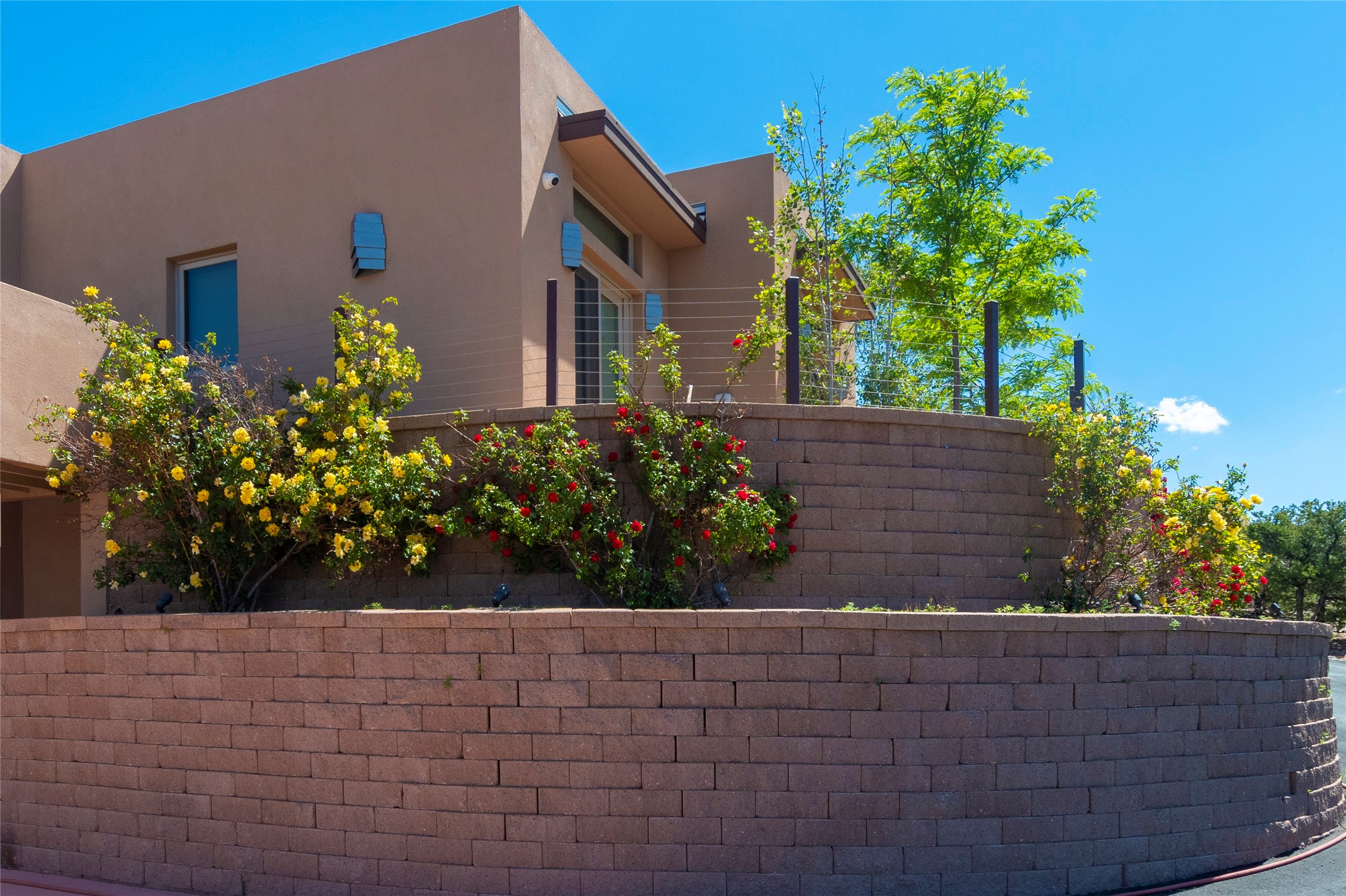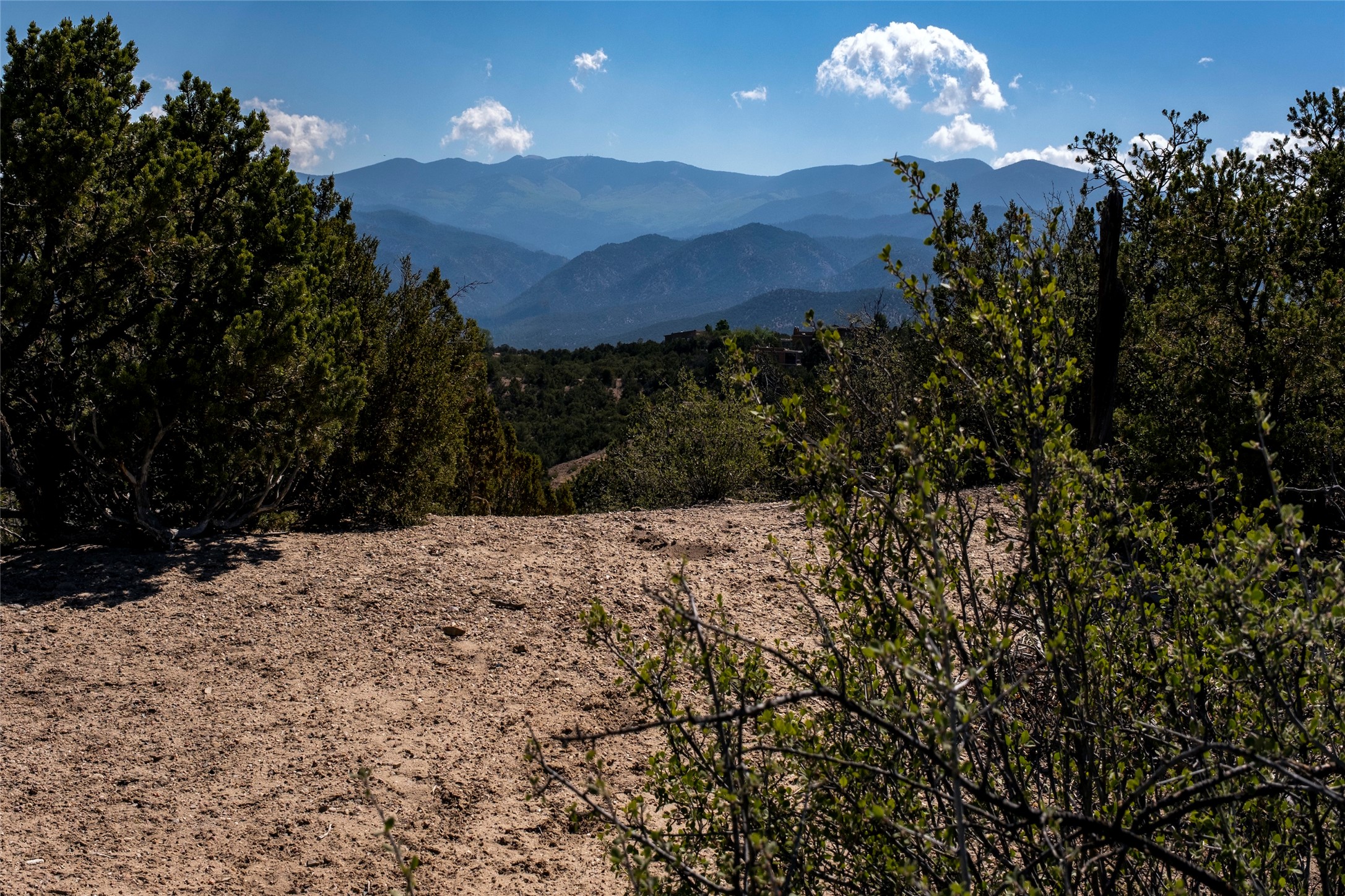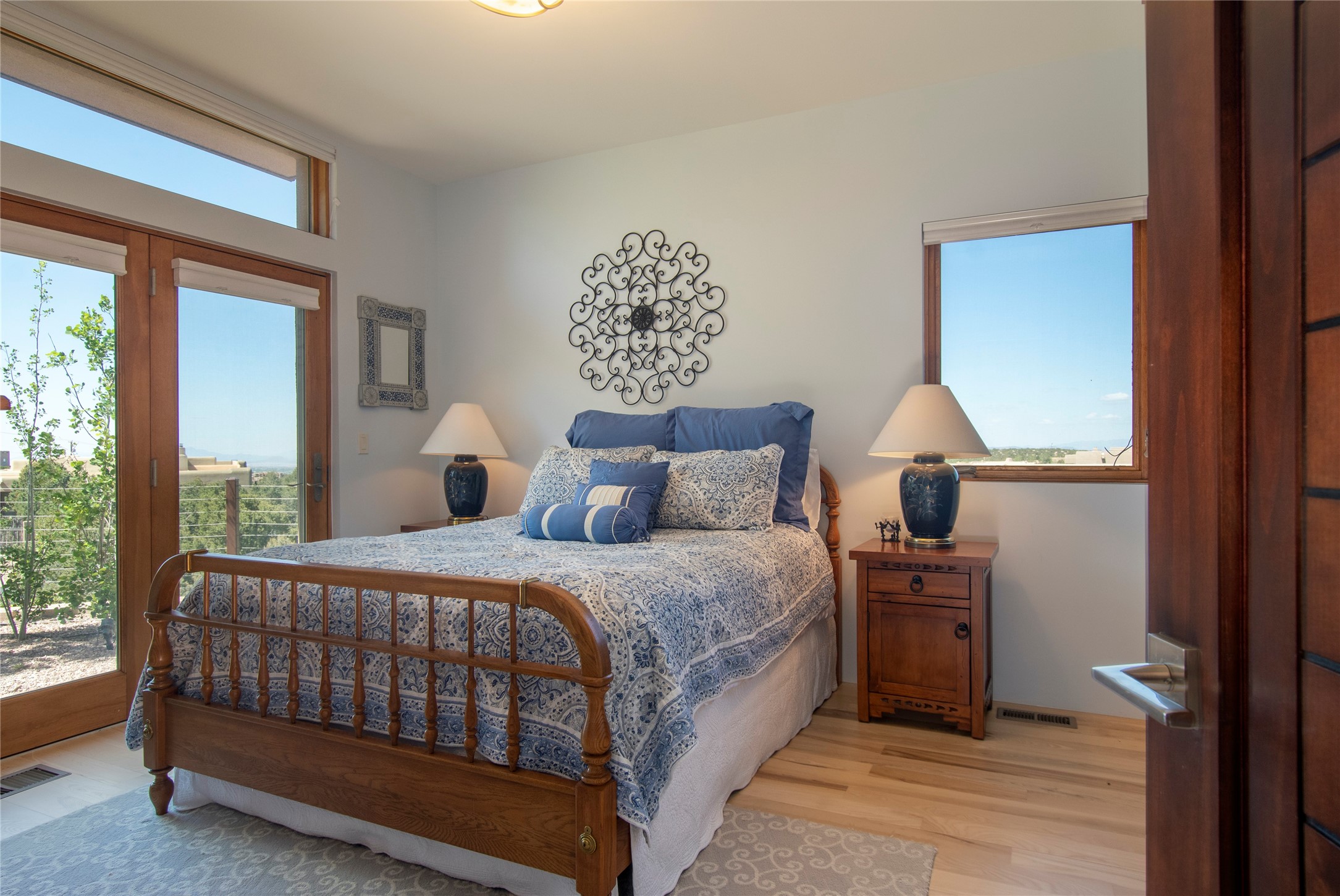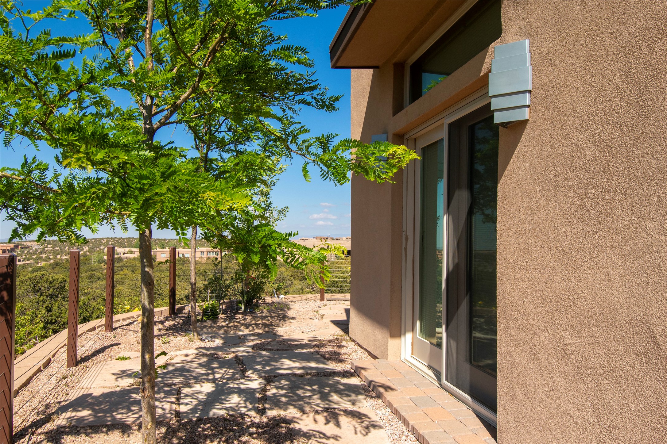 This Michael Bauer custom designed, contemporary, two-story home was built by long time Santa Fe builder, Gary Lincoln, for himself. Known for quality construction and excellent designs, the best finishes and appliances were used in building this stunning home. The 3520 sq ft, open floor plan home is designed for comfortable, easy living and sited perfectly on 2+ acres to take in the breathtaking panoramic mountain views. Striking entry doors lead into the great room where a grand fireplace is a focal point, along with oversized windows that look onto a rooftop deck with fireplace and spectacular mountain views. The kitchen has wall-to-wall windows over the granite countertops on two sides so the chef will never be without a lovely view. A good-sized island with sink, and a walk-in pantry are conveniently located and offer plenty of storage. The appliances are top notch and include a double oven. The portal off the kitchen is the perfect for outdoor entertaining. Adjacent to the kitchen is an office and the master suite with its walk-in closet, beautiful bathroom and private portal with a fireplace. On the other side of the great room are two guest bedrooms each with outside entrances, and a laundry room. The lower level has a spacious den, bathroom, gym, huge storage room, and access to the 3-car garage. Just minutes to the Plaza in Santa Fe, and located in a small, highly desirable gated community, this home has easy access to walking and biking trails.