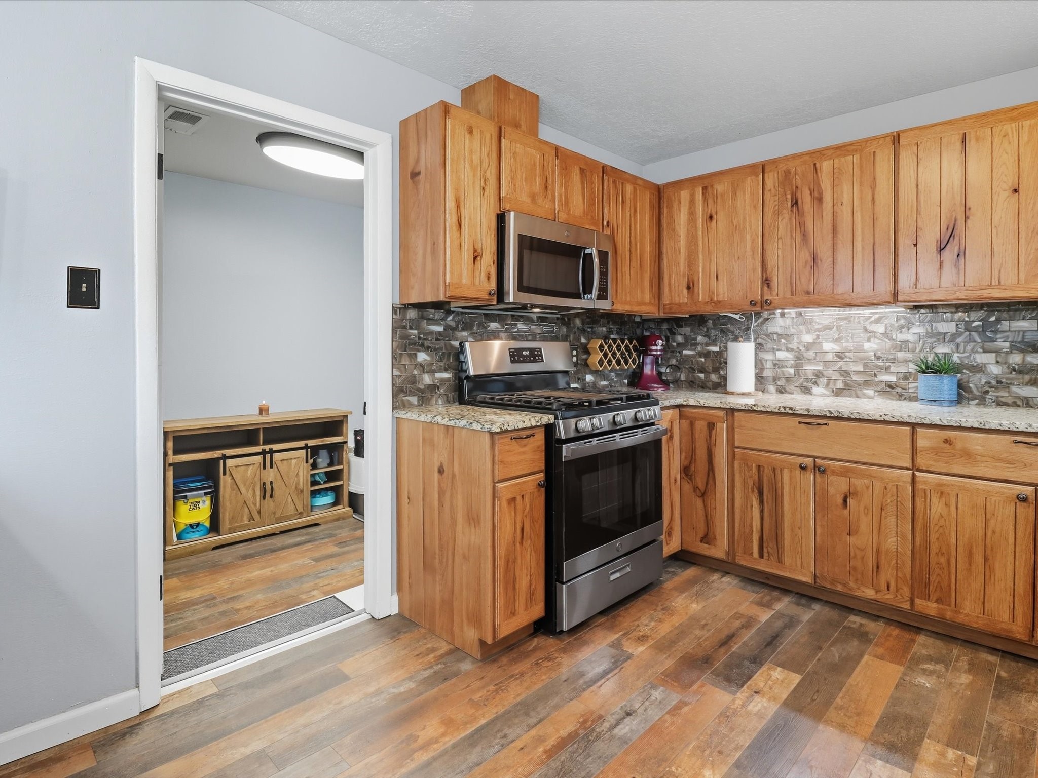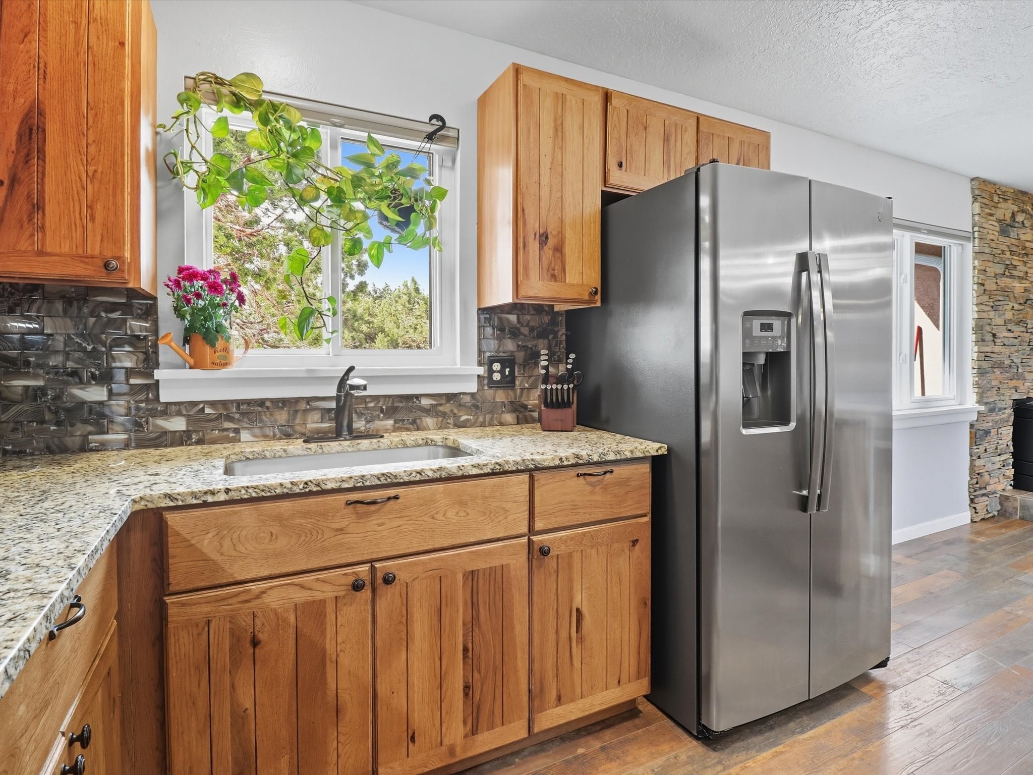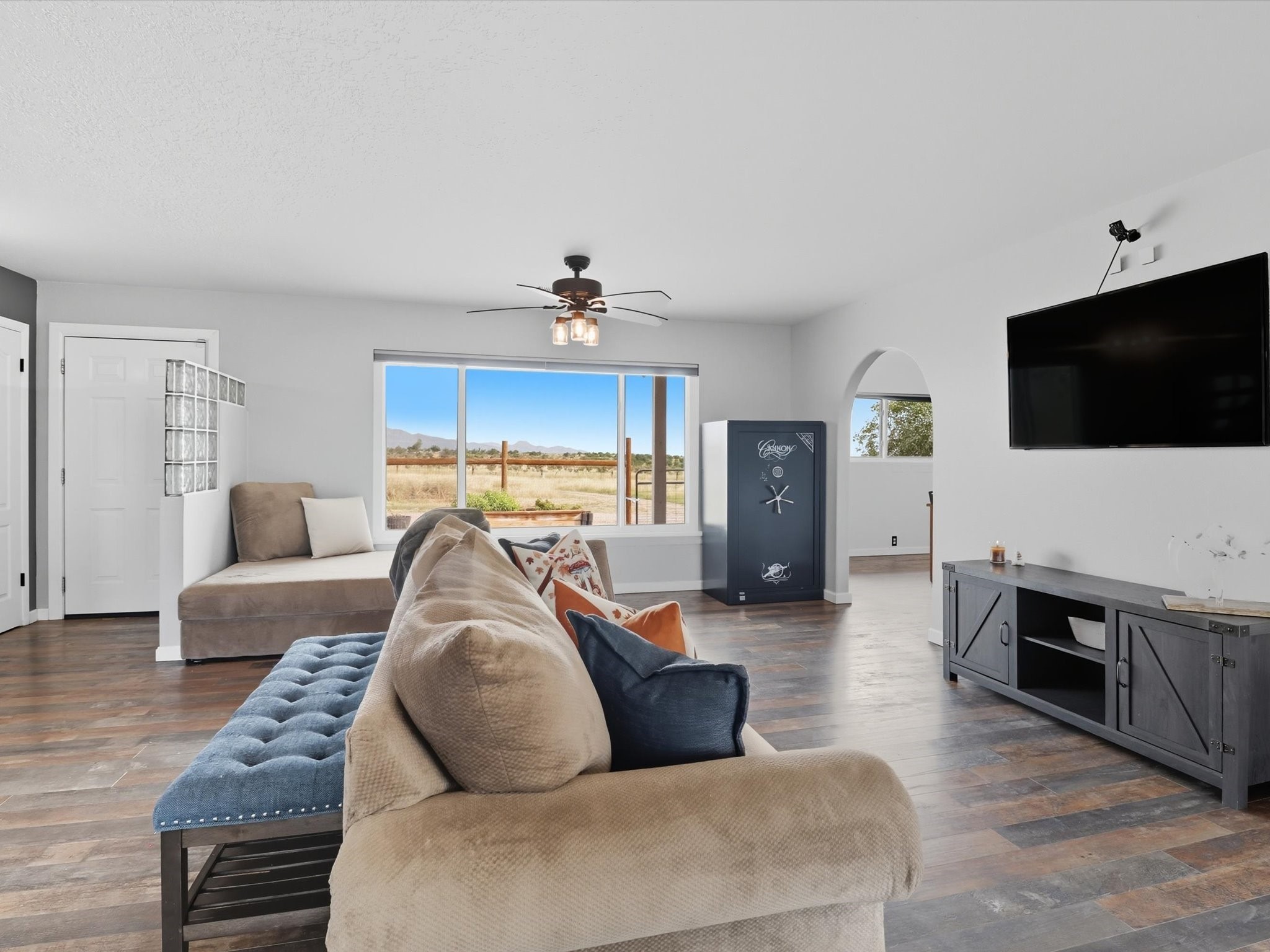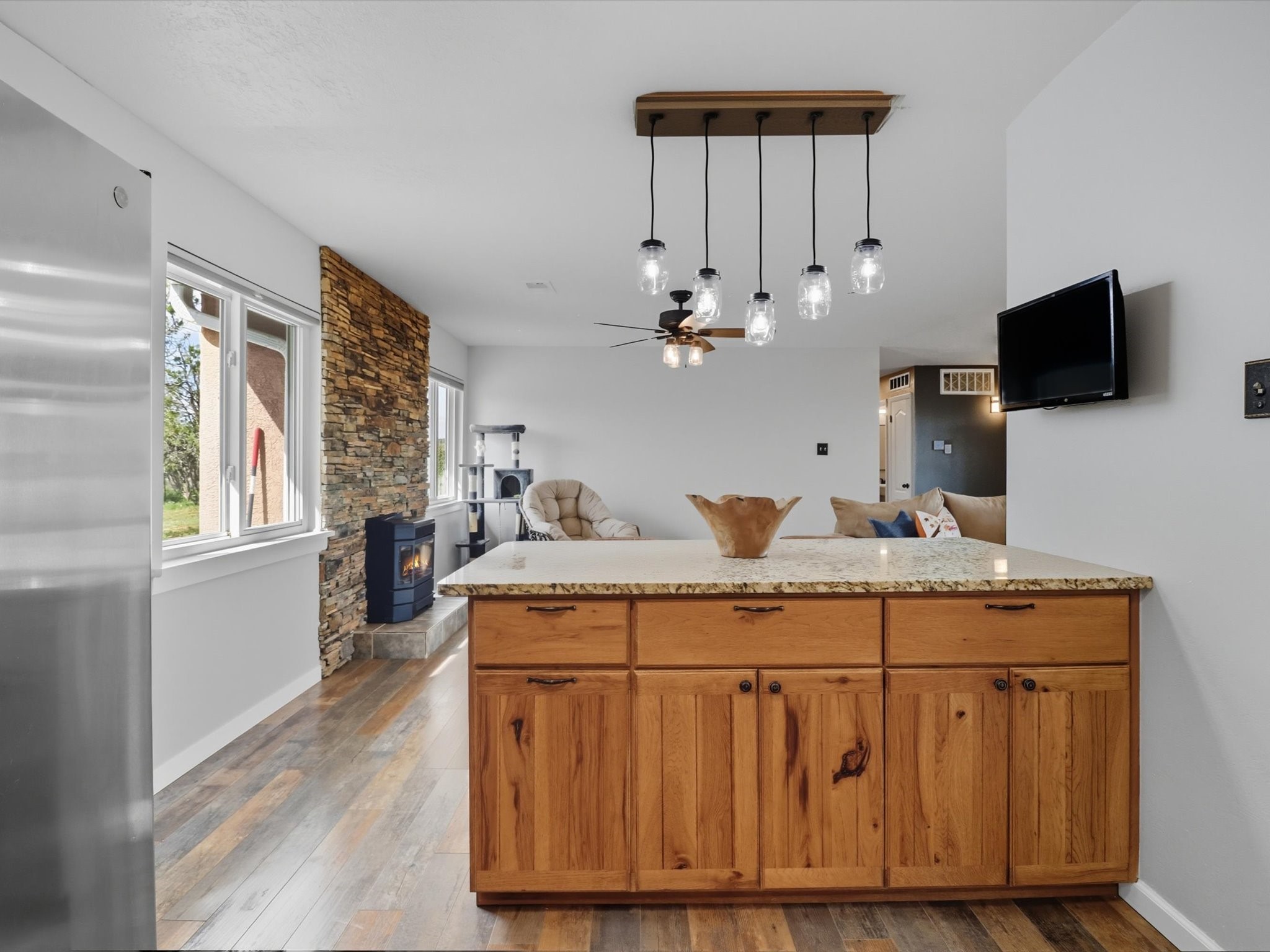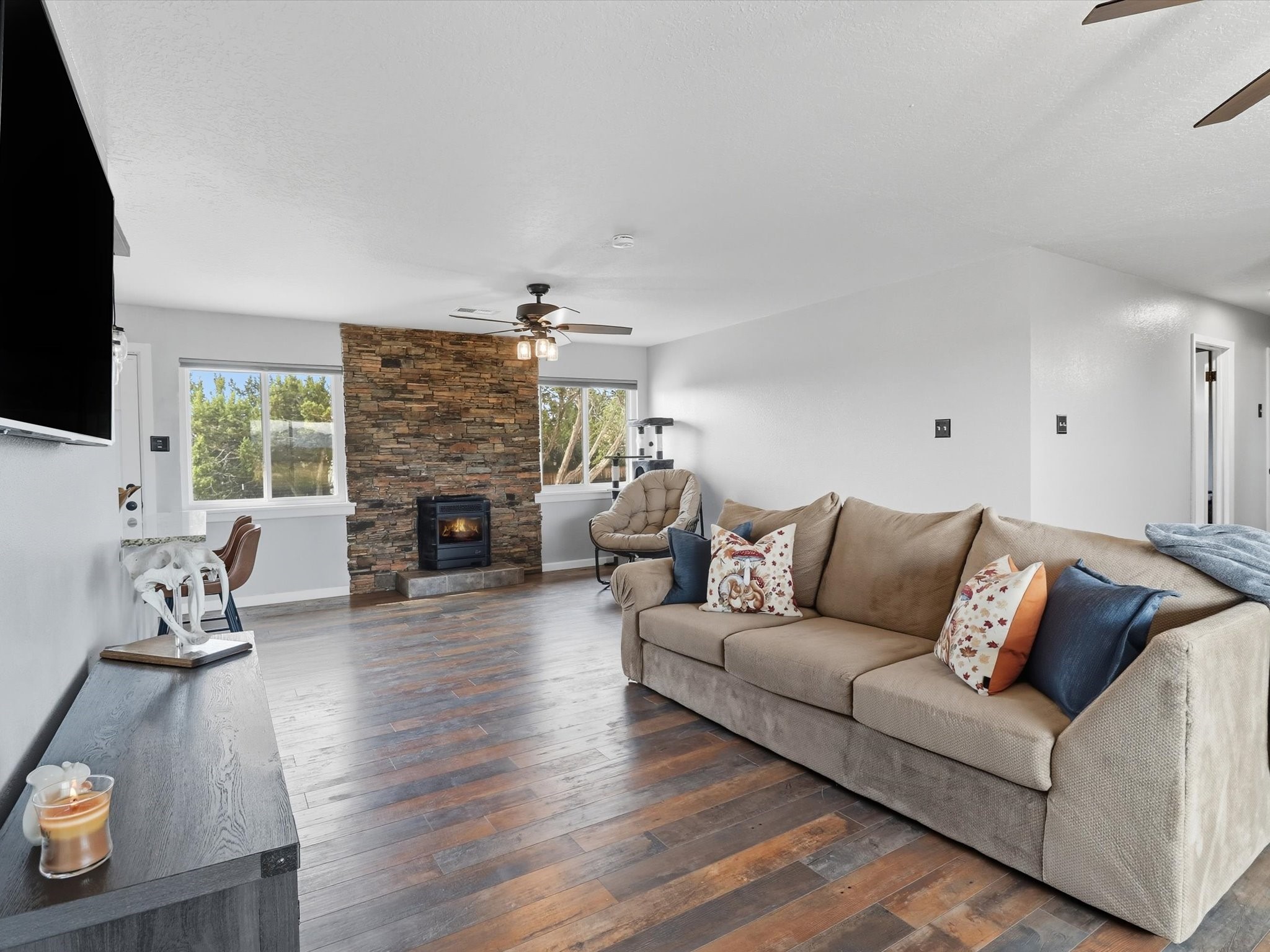 Discover peaceful, single-level living on a sprawling 3-acre lot in Edgewood, where modern luxury meets tranquil country charm. The heart of this home is the fully remodeled kitchen, featuring custom-crafted cabinetry, sleek granite countertops, and new luxury vinyl flooring that flows throughout the home. In 2021 new windows were put in the home, including a large living room window that frames a spectacular view of the mountains and surrounding landscape. The property includes a fully fenced acre ideal for pets or outdoor recreation, leaving 2 acres for horses or recreational vehicles. The spacious, detached garage offers ample room for vehicles, storage, or a workshop, catering to any hobbyist. No HOA offers unmatched freedom and flexibility. This property is full of upgrades and ready for you to move in.
