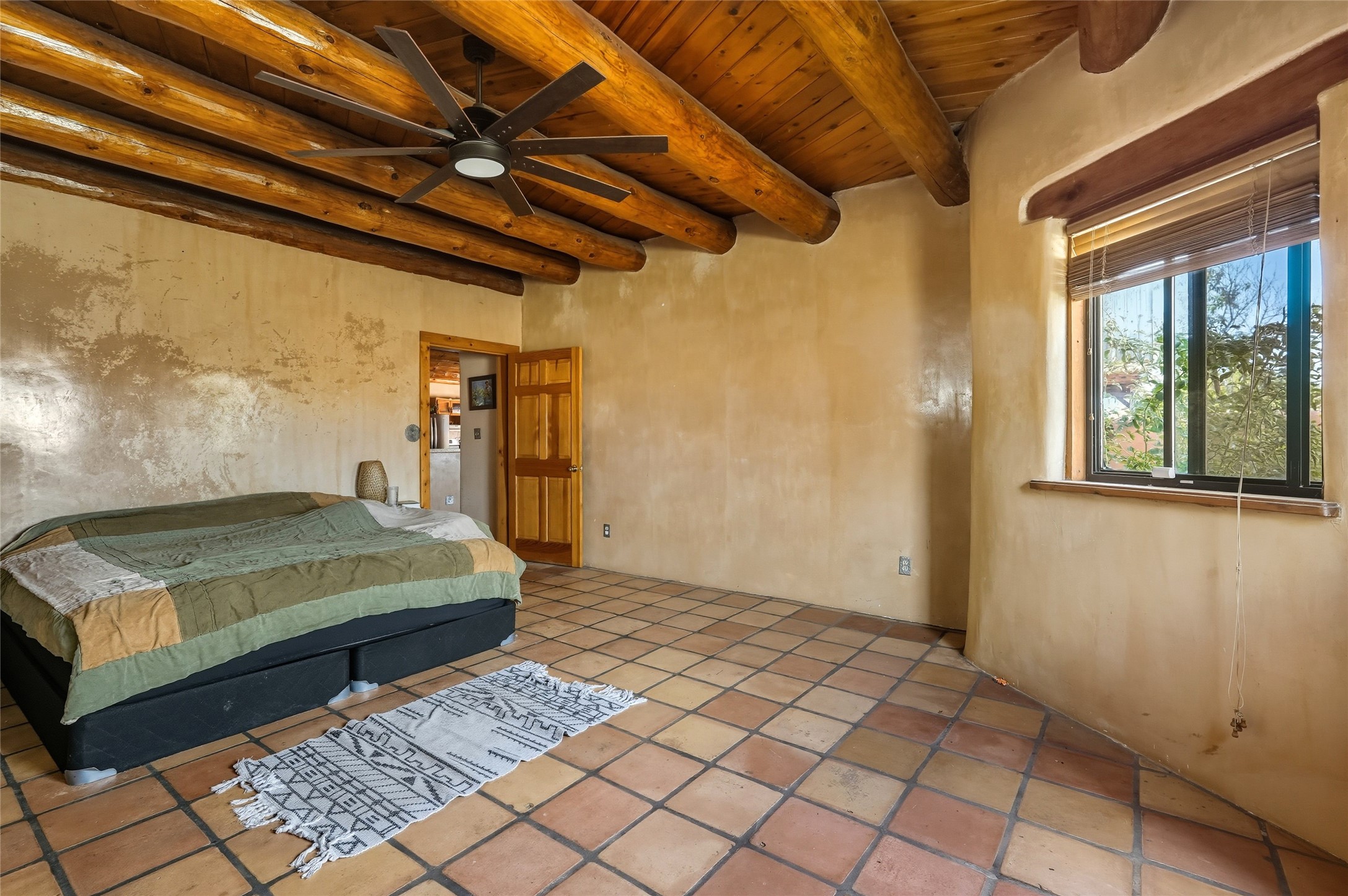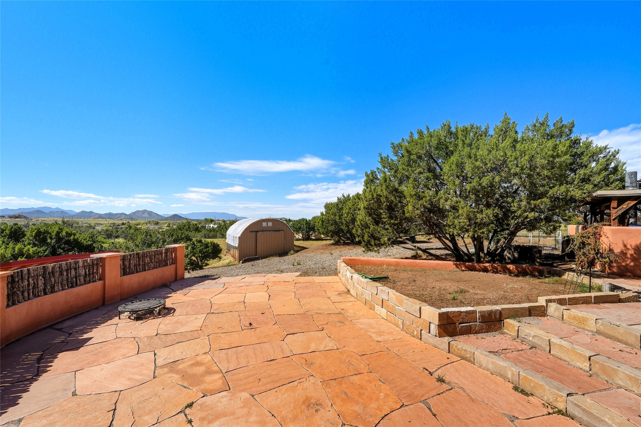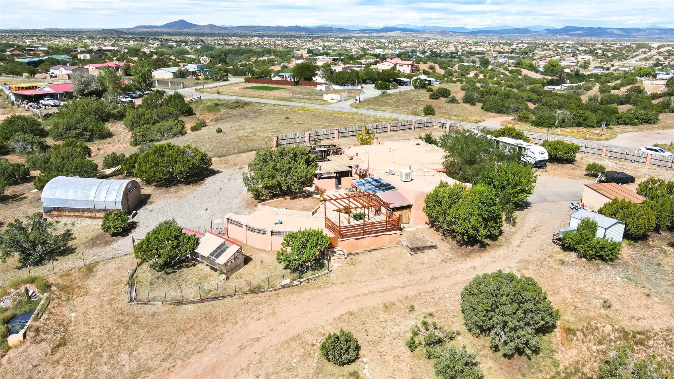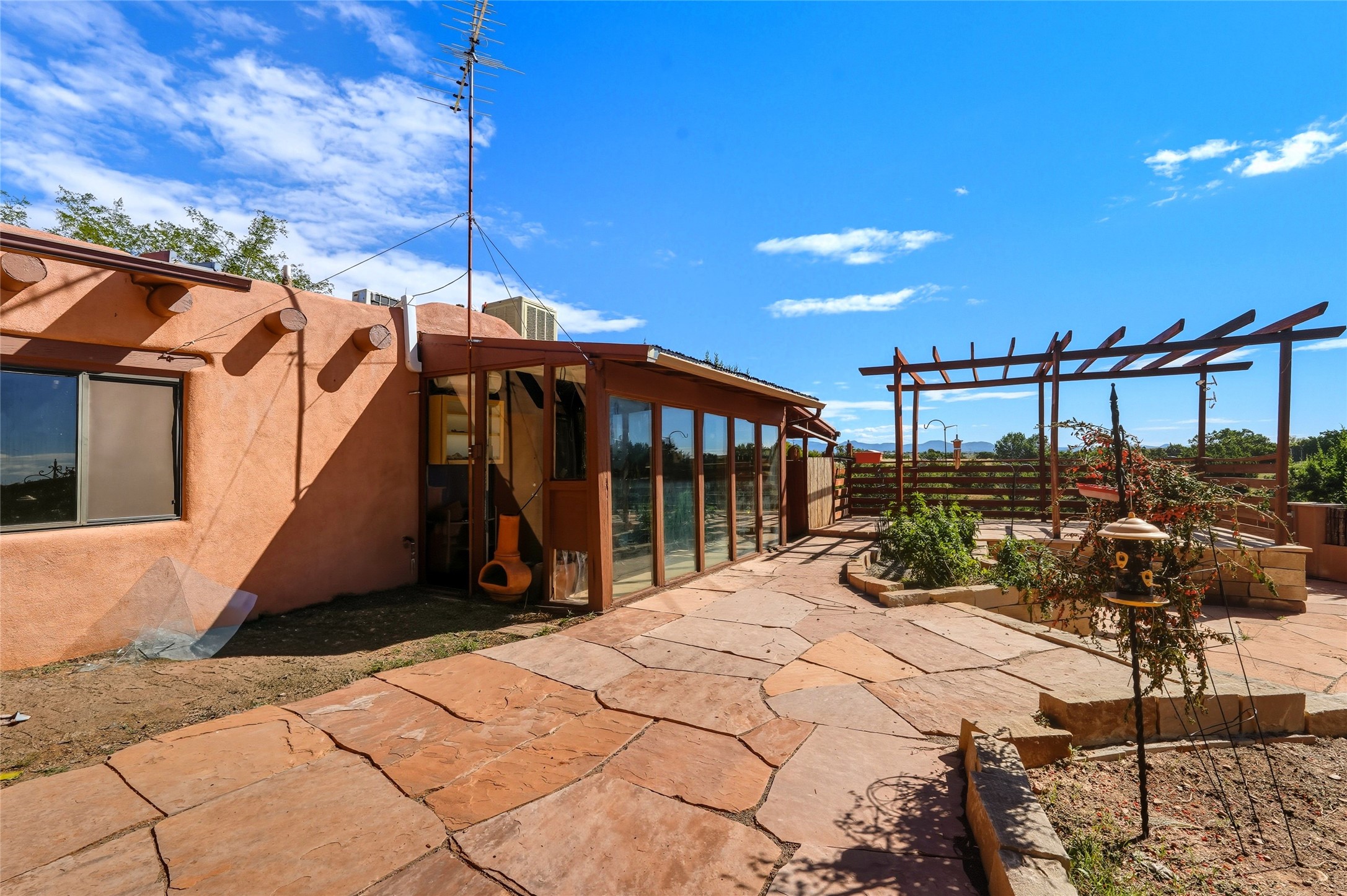 Experience classic Santa Fe charm in this Pueblo-style home nestled on 2.5 acres with sweeping views. The 2-bedroom, 2-bathroom main residence spans 2,134 sq. ft. and showcases authentic Southwestern details, including vigas, a cozy kiva fireplace, and inviting living spaces designed for comfort and style. A spacious flagstone patio extends the living outdoors, offering the perfect spot for entertaining or enjoying peaceful sunsets. Gardeners will appreciate the on-site greenhouse, ideal for year-round cultivation. The property also features a 500 sq. ft. guest house with its own kitchen, bathroom, and two flexible rooms that are perfect for hosting visitors, creating an art studio, or rental. This retreat offers the rare combination of privacy, natural beauty, and convenient access to downtown Santa Fe amenities.