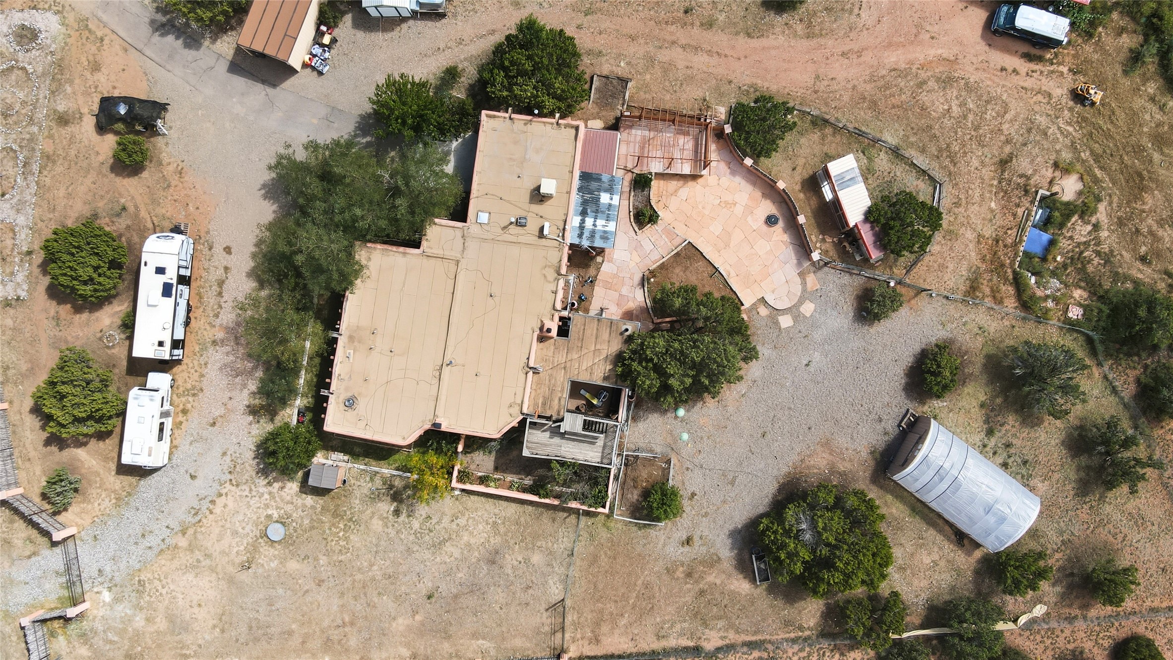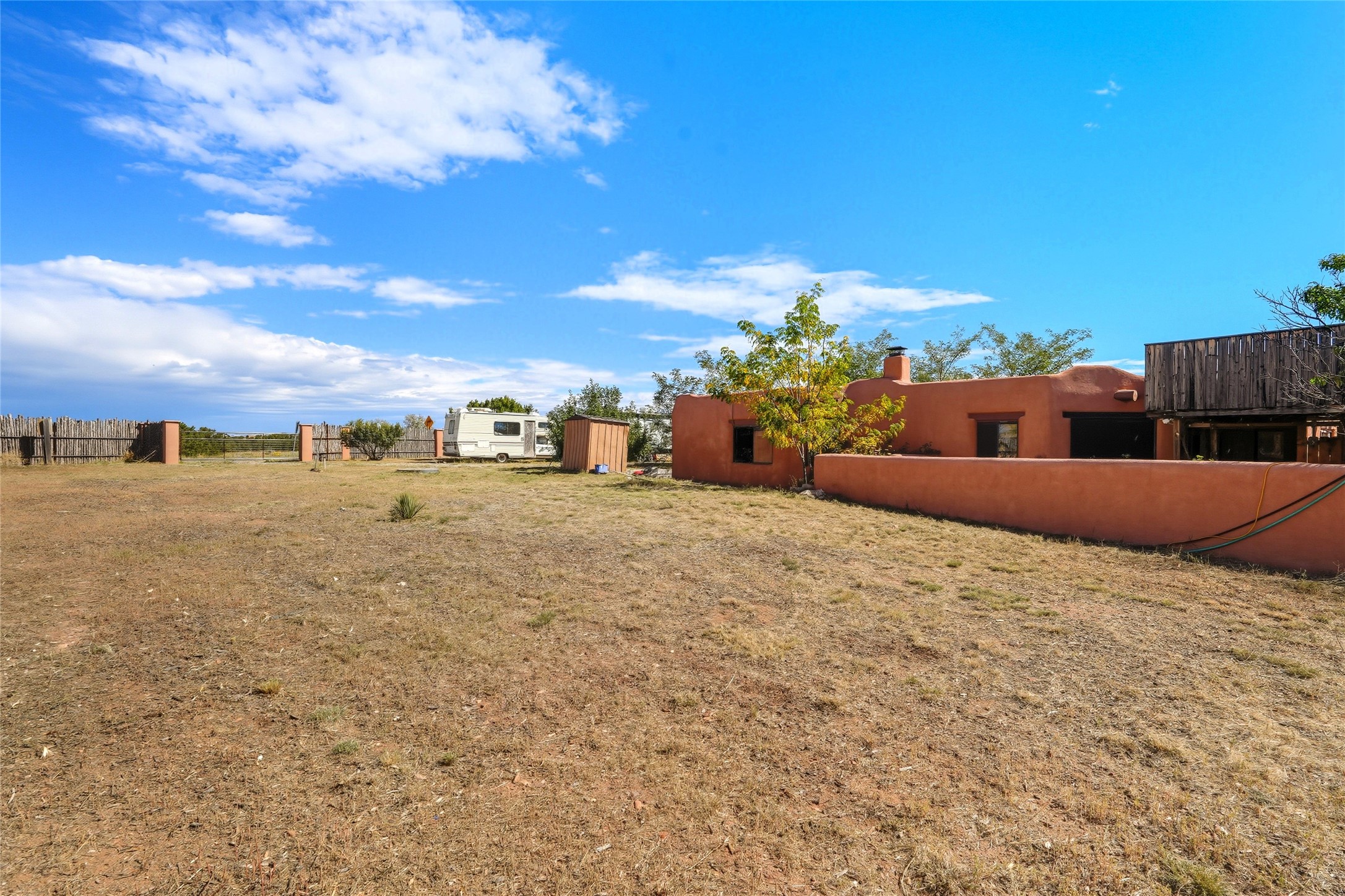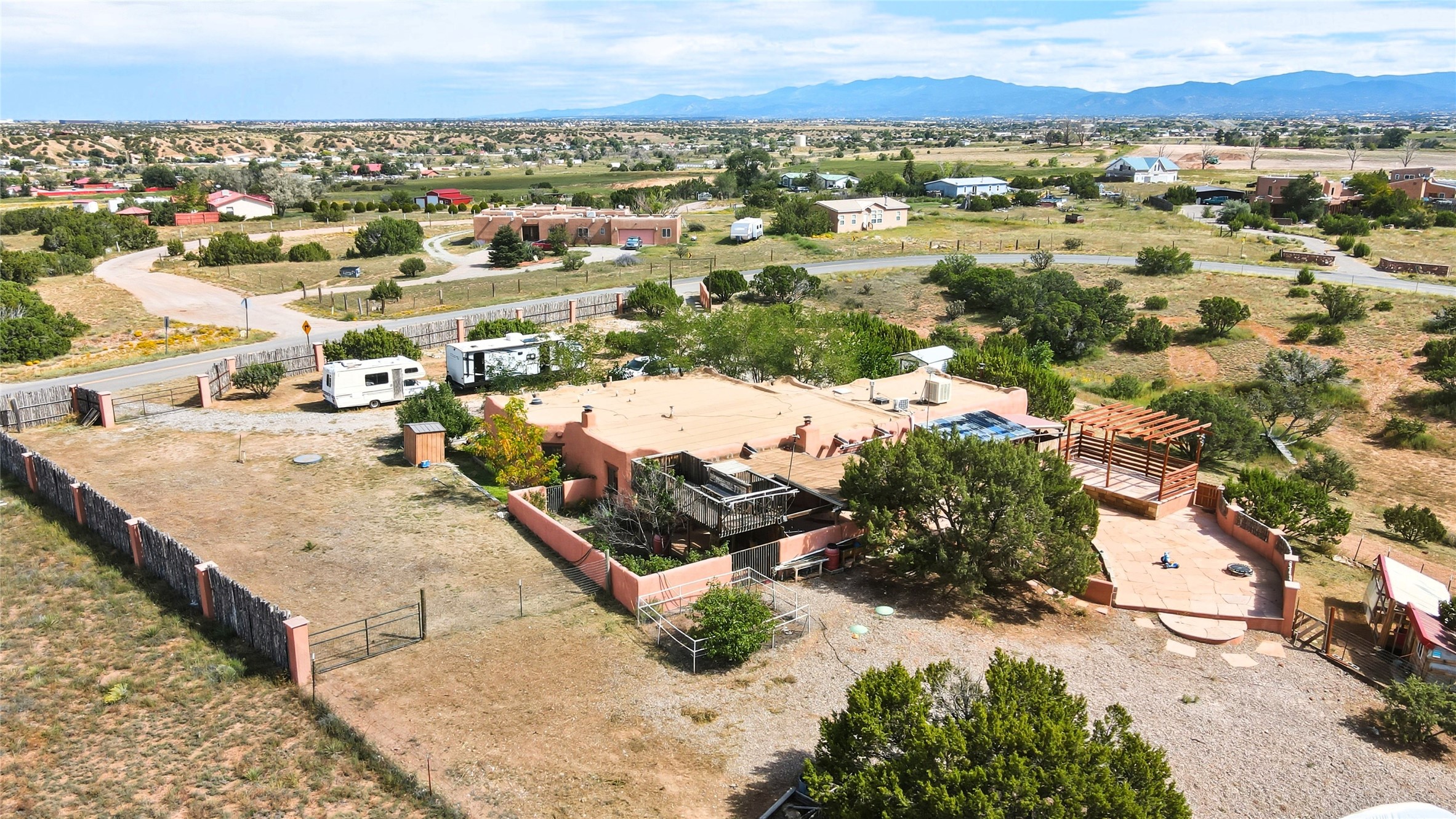 Experience classic Santa Fe charm in this Pueblo-style home nestled on 2.5 acres with sweeping views. The 2-bedroom, 2-bathroom main residence spans 2,134 sq. ft. and showcases authentic Southwestern details, including vigas, a cozy kiva fireplace, and inviting living spaces designed for comfort and style. A spacious flagstone patio extends the living outdoors, offering the perfect spot for entertaining or enjoying peaceful sunsets. Gardeners will appreciate the on-site greenhouse, ideal for year-round cultivation. The property also features a 500 sq. ft. guest house with its own kitchen, bathroom, and two flexible rooms that are perfect for hosting visitors, creating an art studio, or rental. This retreat offers the rare combination of privacy, natural beauty, and convenient access to downtown Santa Fe amenities.