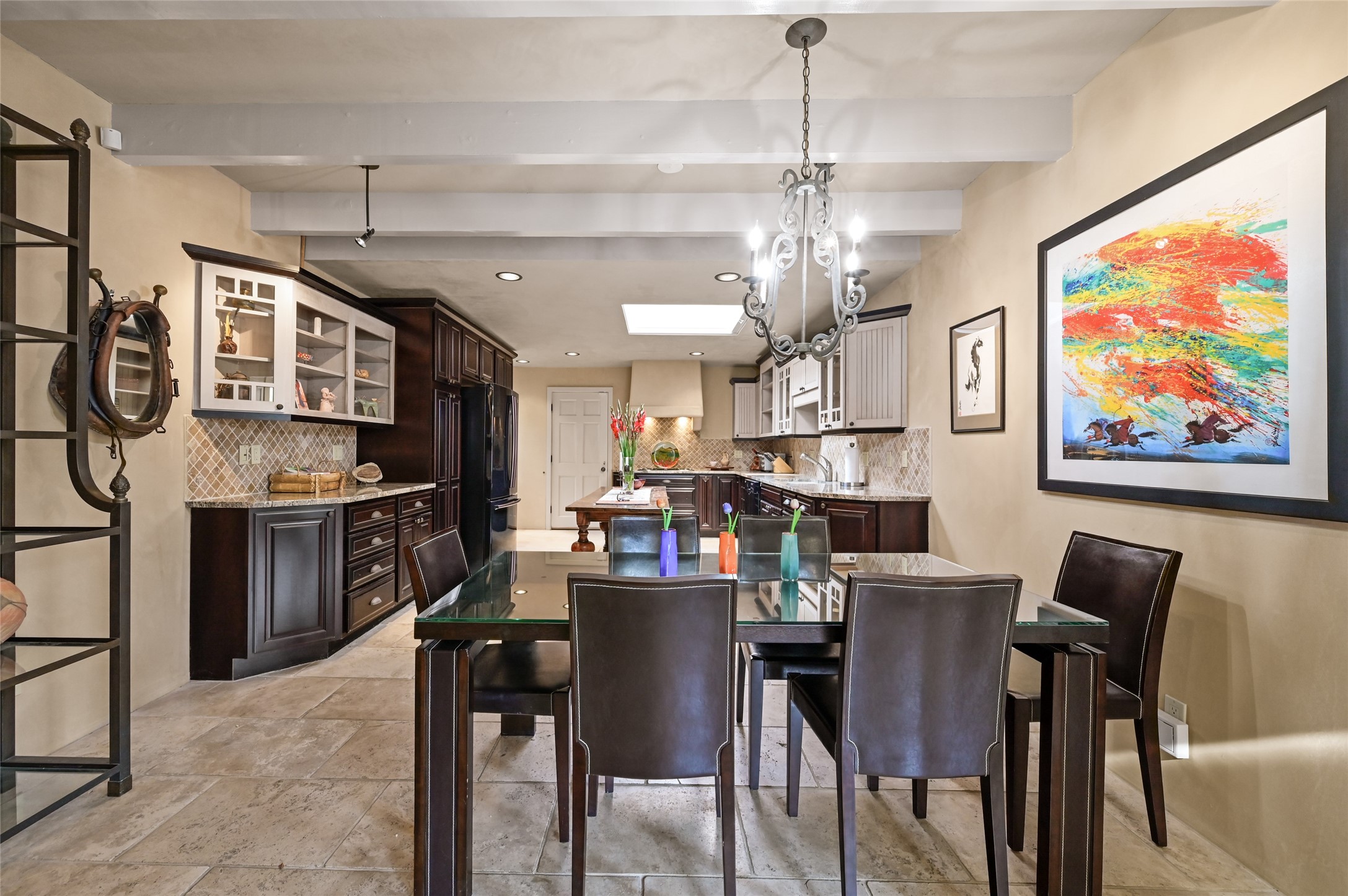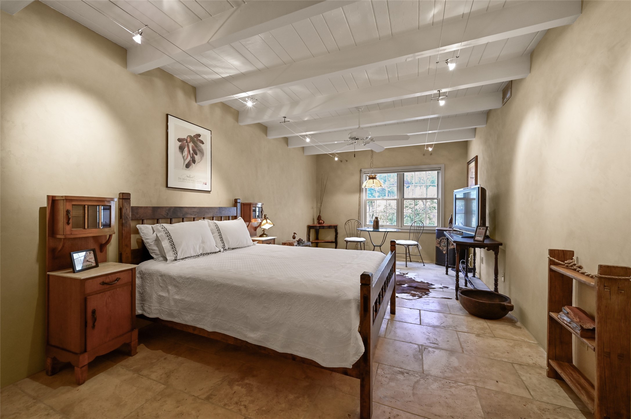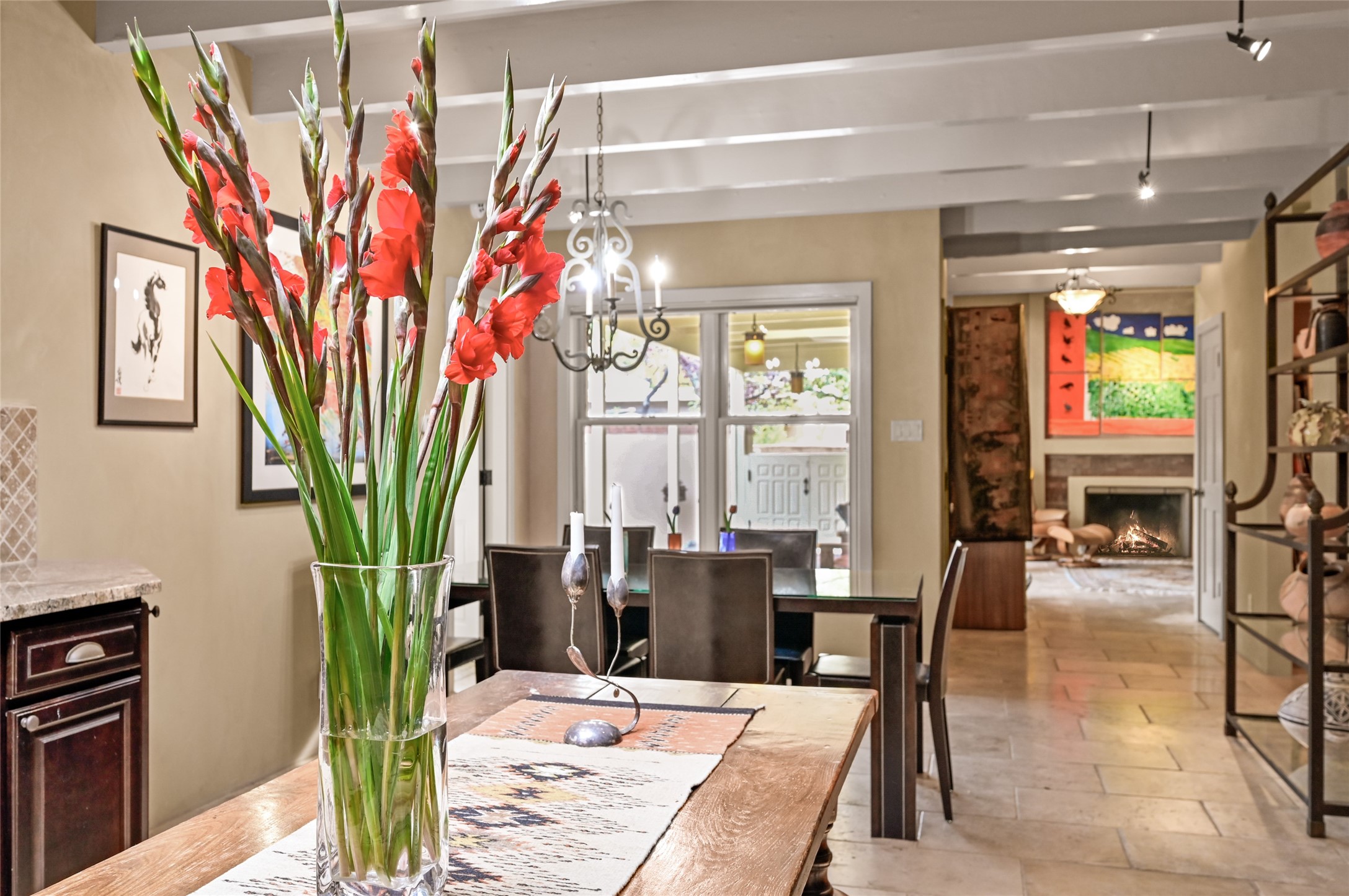 In the heart of Santa Fe, where art, culture, and cuisine intertwine, lies a hidden gem within the exclusive gates of The Compound Condos. Sheltered by graceful old trees and surrounded by lush, mature gardens, this residence offers a quiet escape moments from Canyon Road and the pulse of downtown. A private courtyard welcomes you inside, where sunlight pours through large windows and sliding doors, illuminating a warm living space anchored by a classic fireplace. Here, mornings begin with the scent of brewed coffee and evenings drift easily into fireside conversations. The open country kitchen, complete with generous counter space, vigas, and skylights, feels like the heart of the home. The primary suite, which captures the soft glow of the eastern light includes a kiva fireplace, a spacious dressing area, laundry, and full bath. A comfortable guest suite with walk-in closet and 3/4 bath ensures everyone feels at home. A heated two-car garage with an extra storage room adds practicality to this serene and private haven. A rare offering, where every detail reflects the timeless charm and understated feel of Santa Fe living.