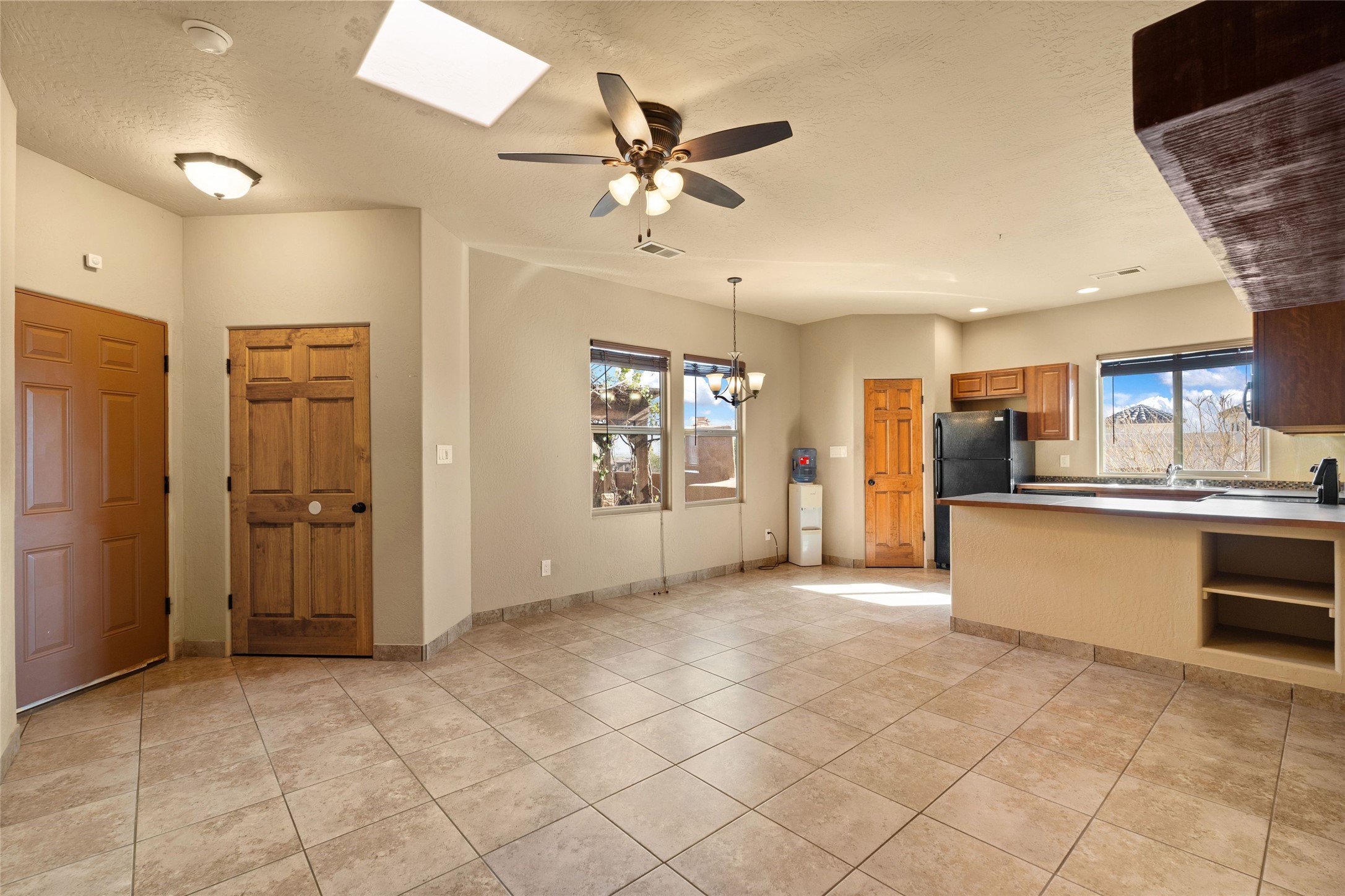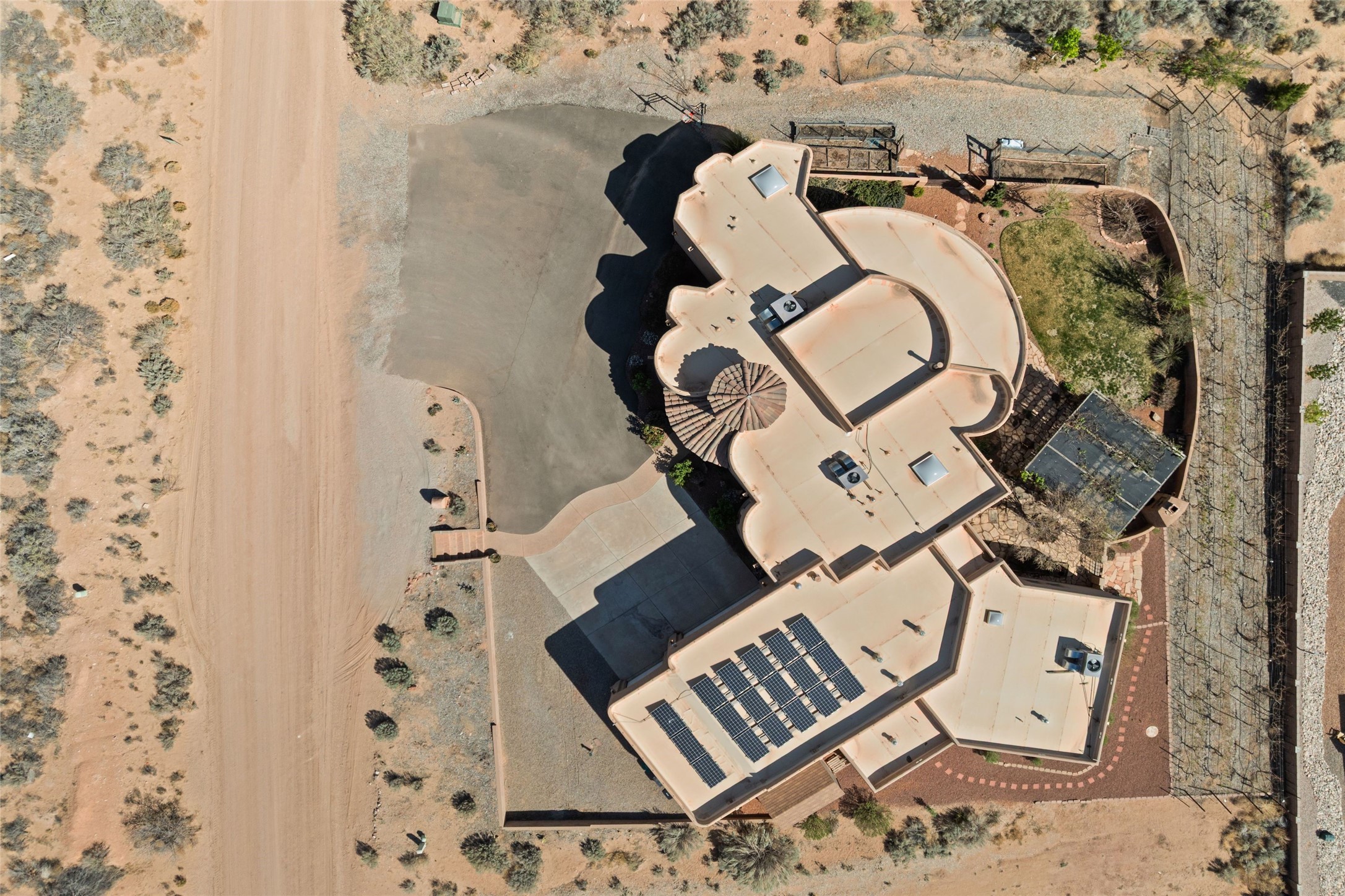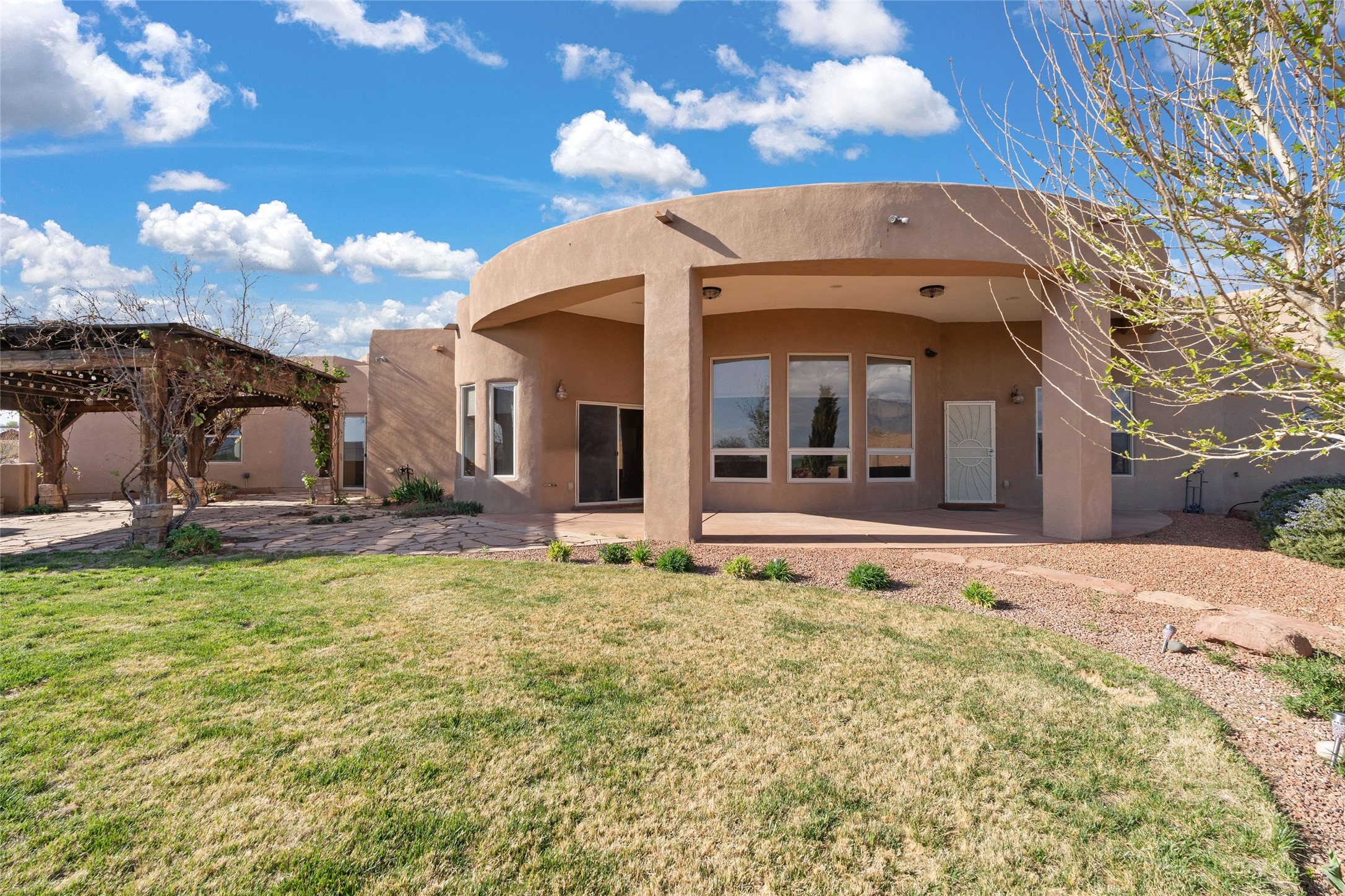 Seller owned solar and a private well! Enjoy the space without the high costs. Nestled on a lush and generous .52-acre lot in Rio Rancho, this property delivers expansive indoor-outdoor living, and countless features including a separate living area/casita. The home includes an oversized 3-car garage (1,488 SF) with extended depth, a dedicated hobby/game room, a 10x15 woodworking space, and a separate storage shed -- perfect for every project or pastime. The main house is designed with community and comfort in mind. The chef's kitchen boasts a gas cooktop, double convection ovens, dual sinks, a walk-in pantry, and flows effortlessly into the dining and living areas -- perfect for entertaining.A stacked stone custom gas log fireplace with banco seating adds cozy ambiance. The primary suite features southern views and private access to the extended covered back patio, a snail shower, garden tub, dual sinks, and a walk-in closet. Three additional bedrooms and two bathrooms provide ample room for children, guests, or office space.18-panel owned solar system installed in 2016. A central vacuum system adds further convenience. A standout feature is the spacious attached 800 SF casita, offering a full kitchen, living room, walk-in closet, and ensuite bathroom with linen storage. All on one level with no carpet, this private space is ideal for in-laws, guests, or even potential rental income.Outdoors, create unforgettable memories in the pergola-covered patio wrapped in grapevines, with a custom wood-burning fireplace and banco seating -- ideal for BBQs, al fresco dinners, and relaxing evenings. The property's mature vineyard includes Cabernet Sauvignon, Chardonnay, and more. Owners and past owners have previously had local farmers care for the grapes in exchange for the fruit at harvest time making this lush landscaping easy to enjoy.Edible landscaping surrounds you with fruit trees and raised garden beds for vegetables and herbs. New roof (2019).
