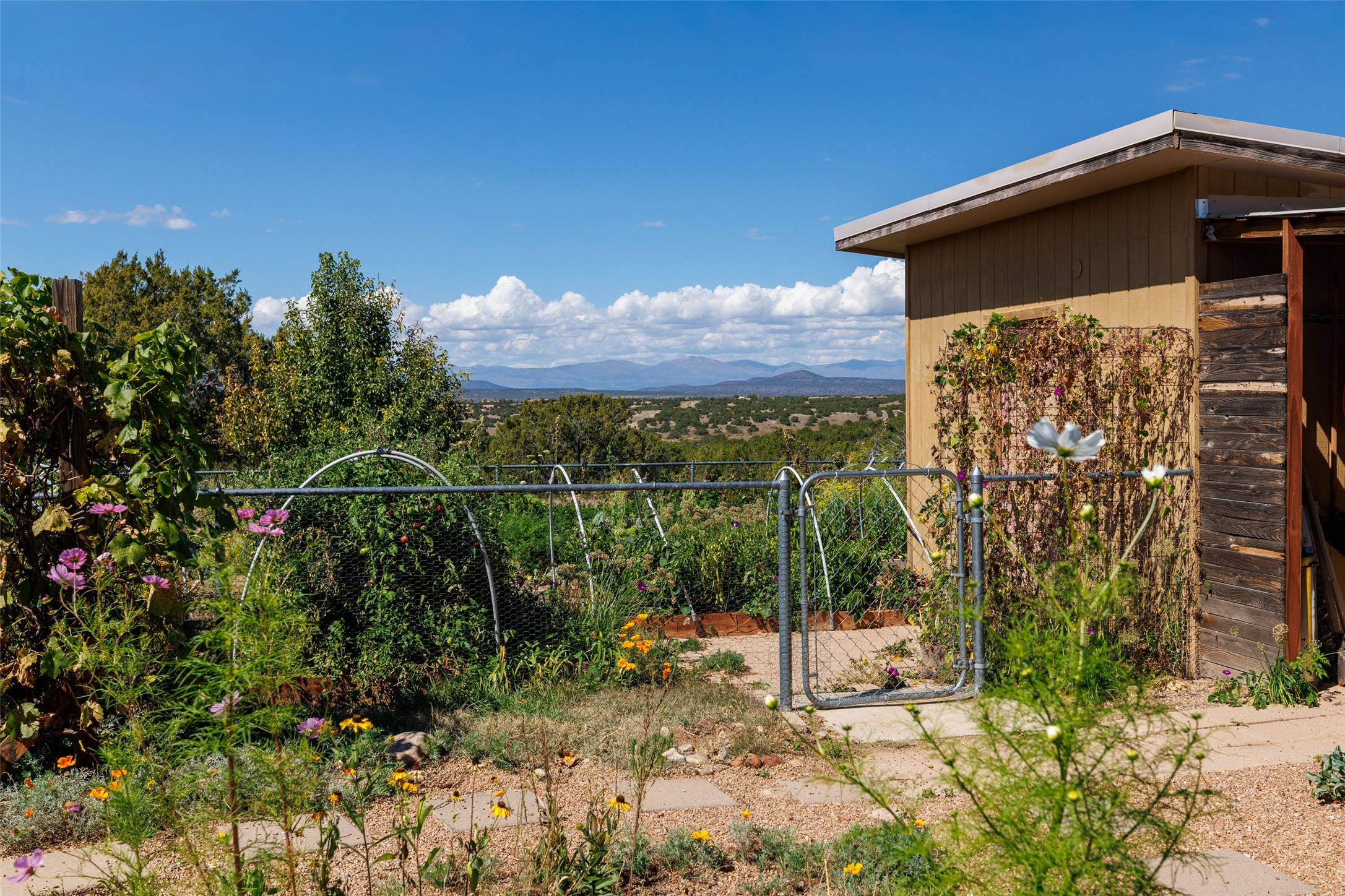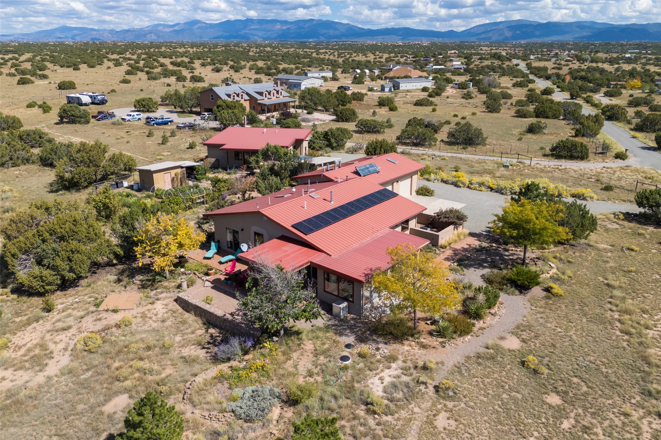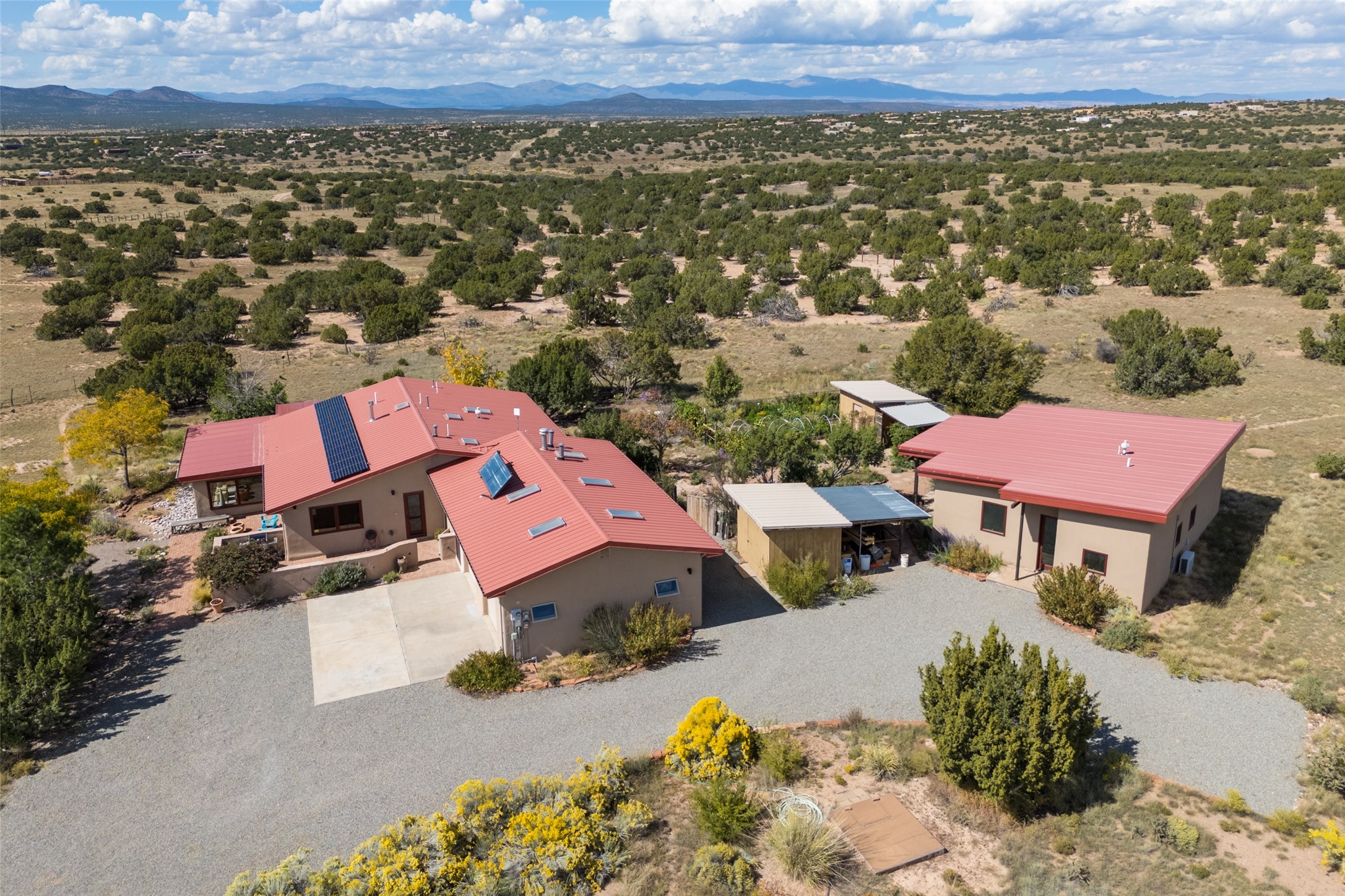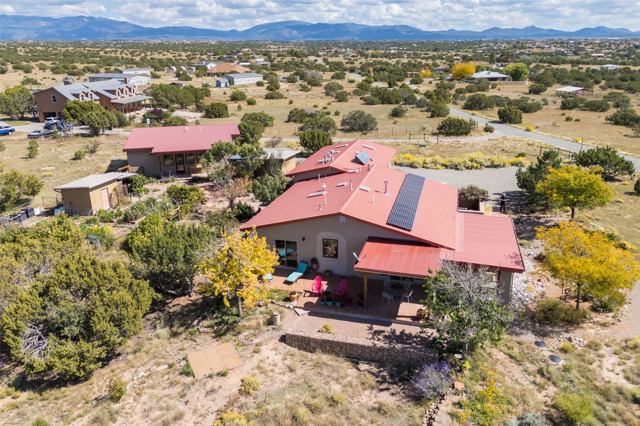 Set on 3 private acres with sweeping views of the Jemez and Sangre de Cristo Mountains, this contemporary home blends style, efficiency, and versatility. The 2-bedroom, 2-bath main house features an updated primary suite, newer kitchen, windows, and cork flooring. Owned solar panels help offset electric bills, adding to the home's sustainability. Creative and functional spaces expand the possibilities: a detached, 1050 sq ft, artist studio with its own bathroom, a 600 sq. ft. heated and cooled garage with office, a potting shed, and an additional storage shed. Established gardens and cisterns for water catchment support irrigation and year-round enjoyment of the land. With no HOA restrictions and a setting designed for privacy, this property offers freedom, modern comfort, and inspiring Northern New Mexico views -- all in one remarkable package.