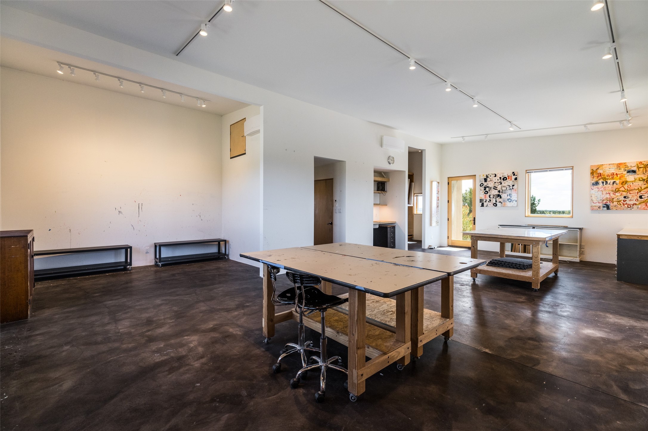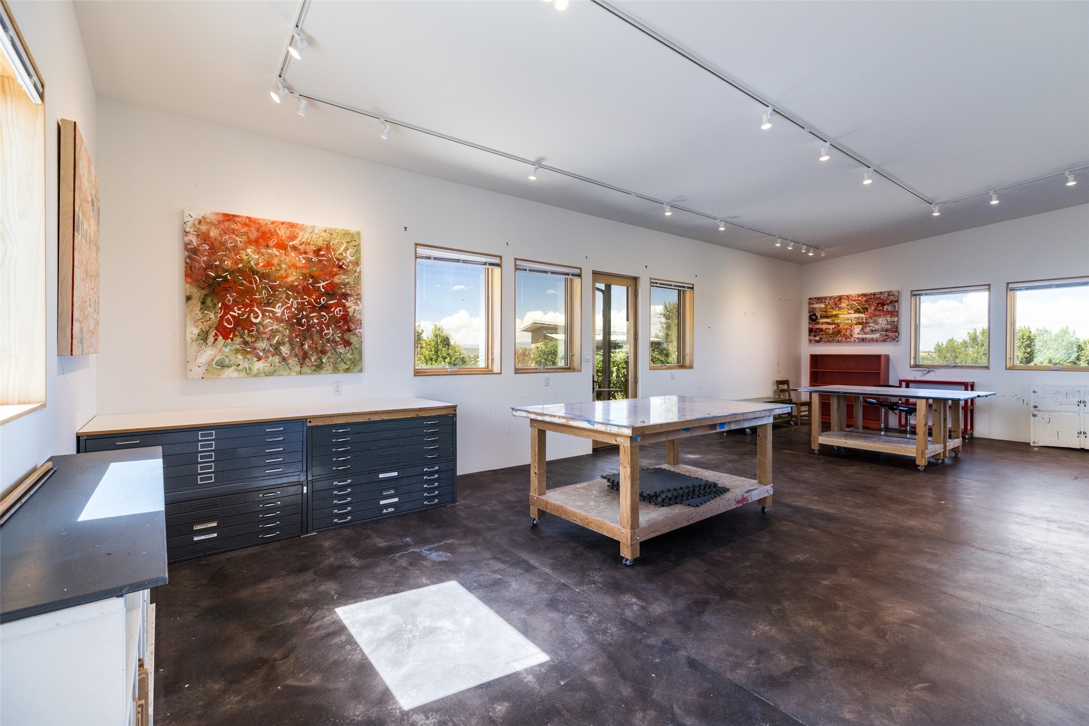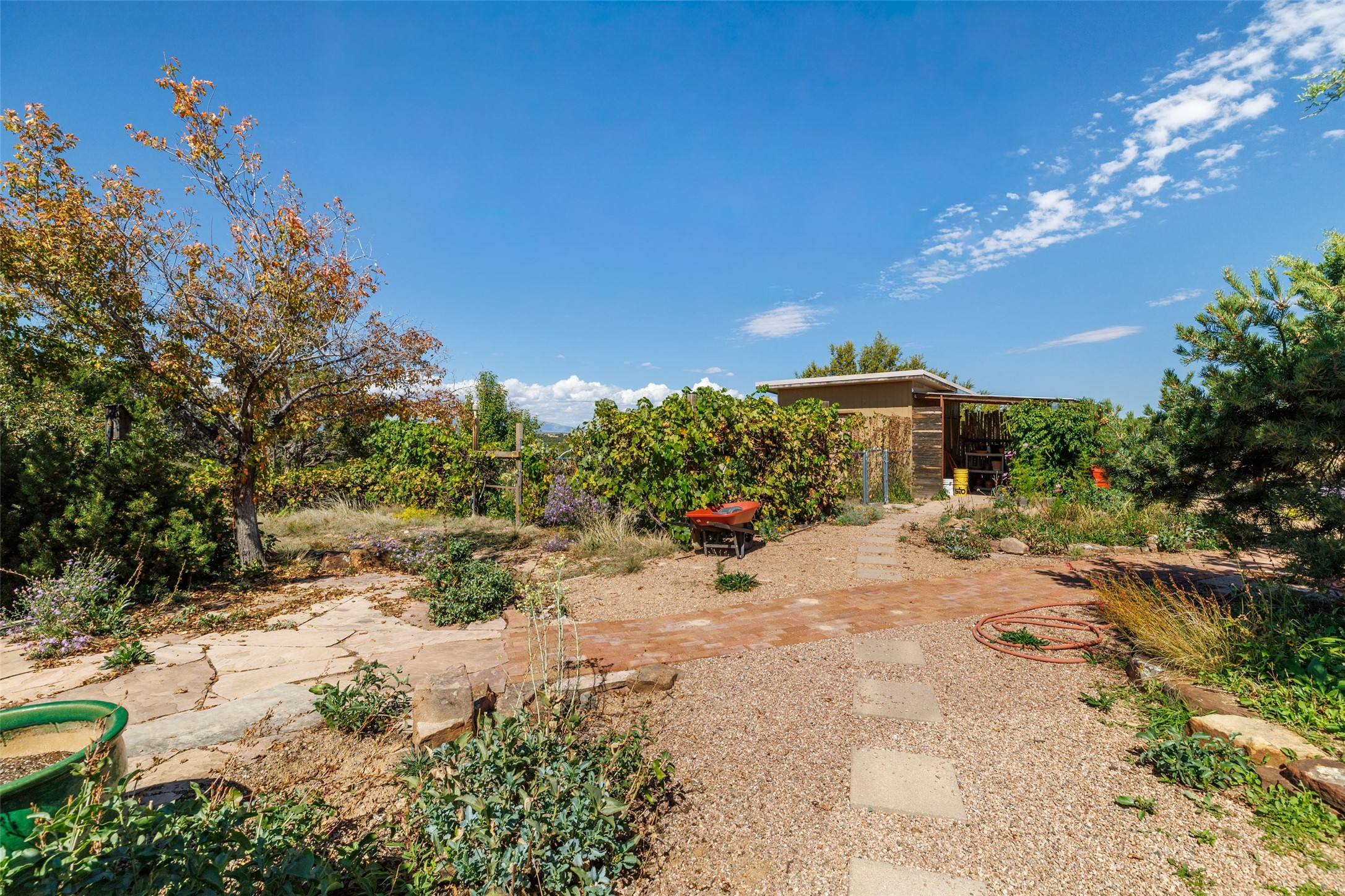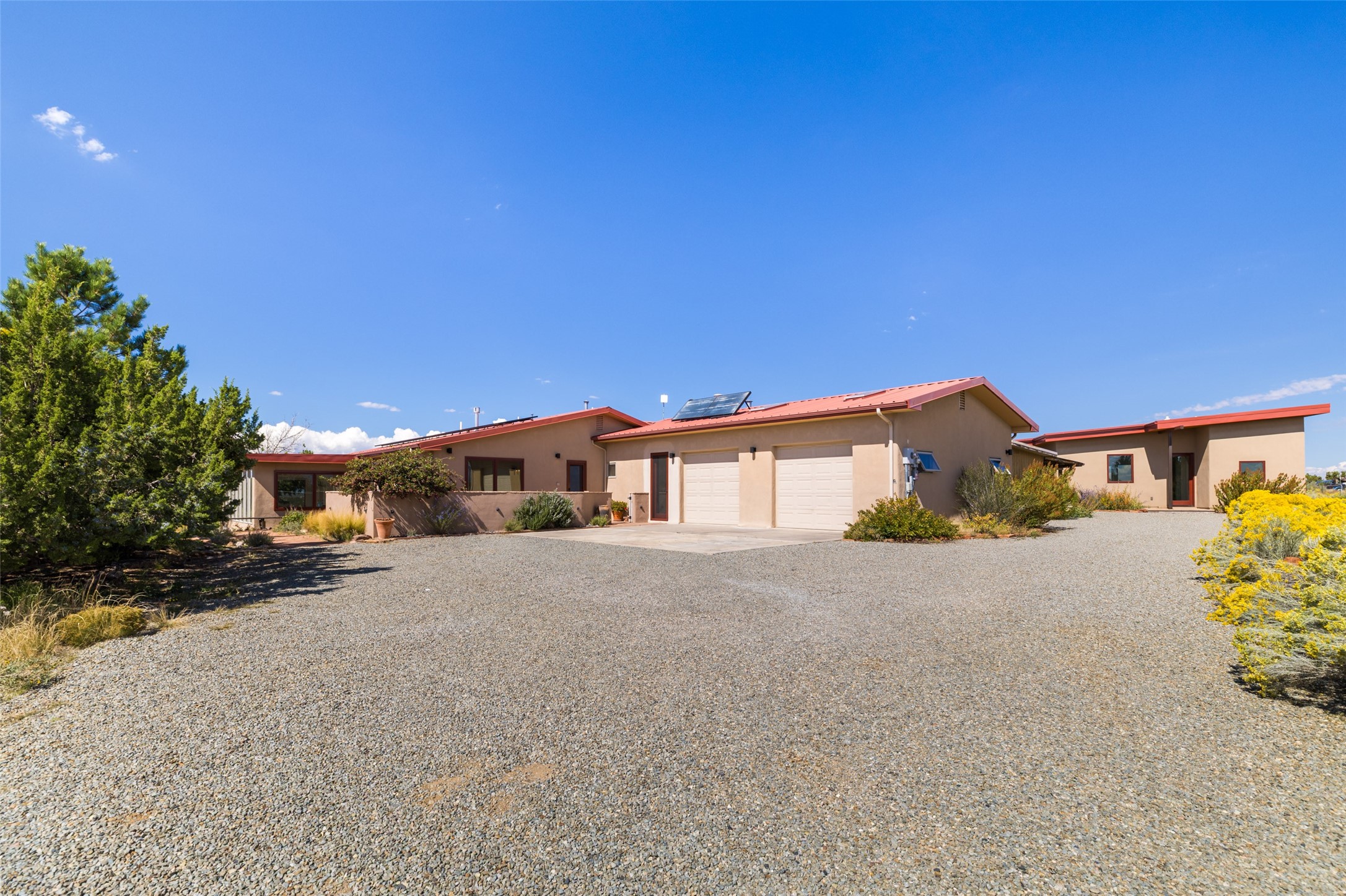 Set on 3 private acres with sweeping views of the Jemez and Sangre de Cristo Mountains, this contemporary home blends style, efficiency, and versatility. The 2-bedroom, 2-bath main house features an updated primary suite, newer kitchen, windows, and cork flooring. Owned solar panels help offset electric bills, adding to the home's sustainability. Creative and functional spaces expand the possibilities: a detached, 1050 sq ft, artist studio with its own bathroom, a 600 sq. ft. heated and cooled garage with office, a potting shed, and an additional storage shed. Established gardens and cisterns for water catchment support irrigation and year-round enjoyment of the land. With no HOA restrictions and a setting designed for privacy, this property offers freedom, modern comfort, and inspiring Northern New Mexico views -- all in one remarkable package.