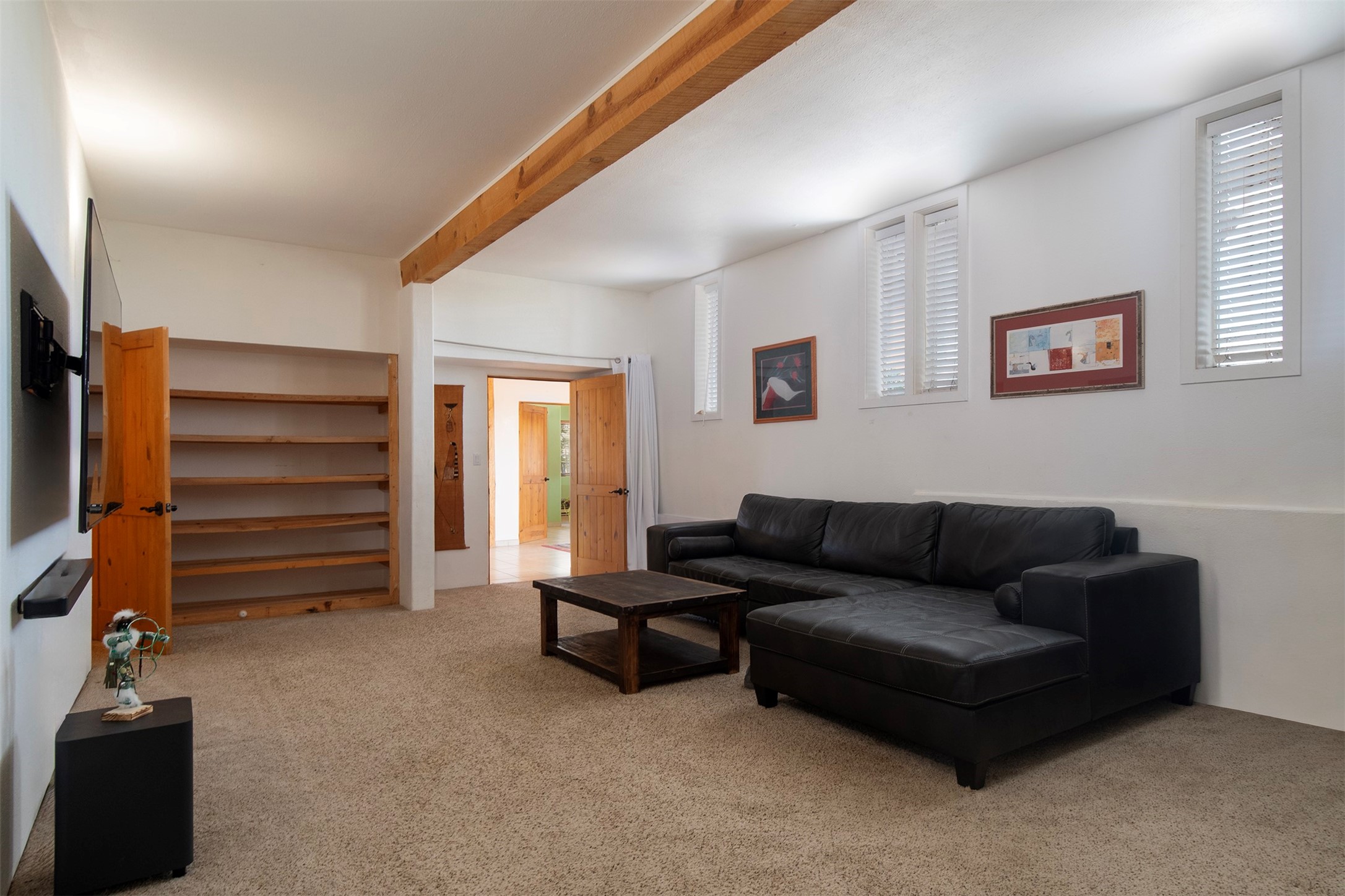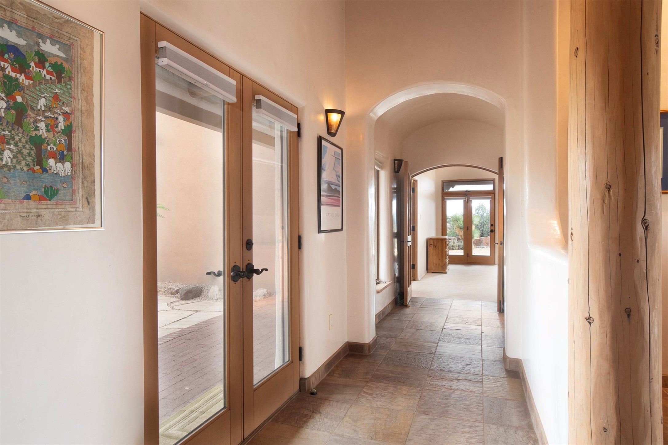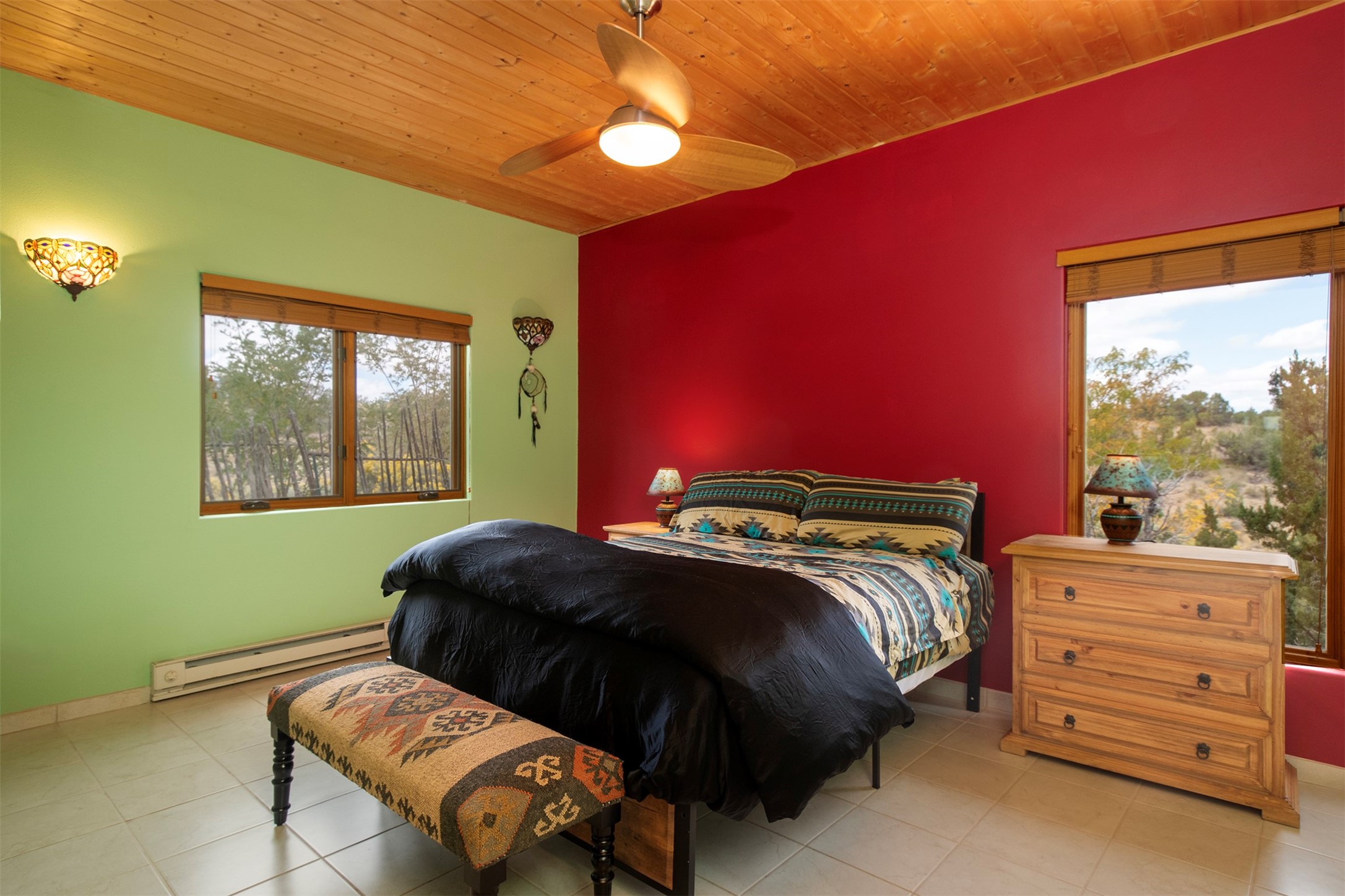 Set on 15 private acres with commanding forever views, this exceptional property combines the best of rural living with a strong sense of community & a lifestyle that embraces the outdoors.The main home offers nearly 3,500 square feet of living space, complemented by an attached 1,100 square foot ADU/guest house. Perfect for independent living, extended family, private guest quarters, a home office, or potential rental income, the guest house provides both flexibility & privacy.Inside the main residence, classic Santa Fe charm shines throughout. A spacious chef's kitchen is the heart of the home, while high ceilings with cedar latillas, hard trowel plaster walls, and multiple kiva fireplaces add warmth and character. A pellet stove ensures cozy comfort.Outdoor living takes center stage in every direction. Whether gathering around the kiva fireplace, relaxing on the patios, or entertaining on the elevated margarita deck with 360-degree sunset views, this property was designed to connect with nature & wide-open skies.Adding to its appeal, the home is equipped with green energy features including a Tesla Powerwall and a solar array, ensuring minimal electric costs while supporting sustainable living.This rare offering blends timeless Southwestern design with modern energy efficiency and endless opportunities for living, working, and entertaining--truly Rancho Alegre country living at its best.