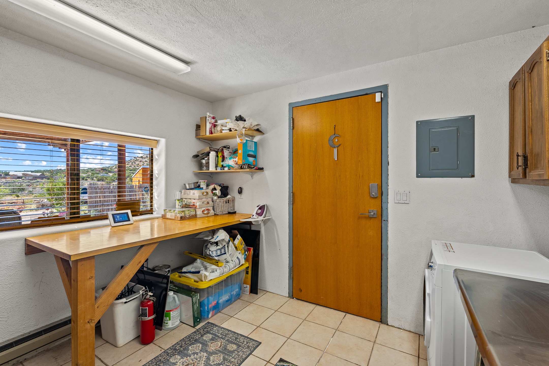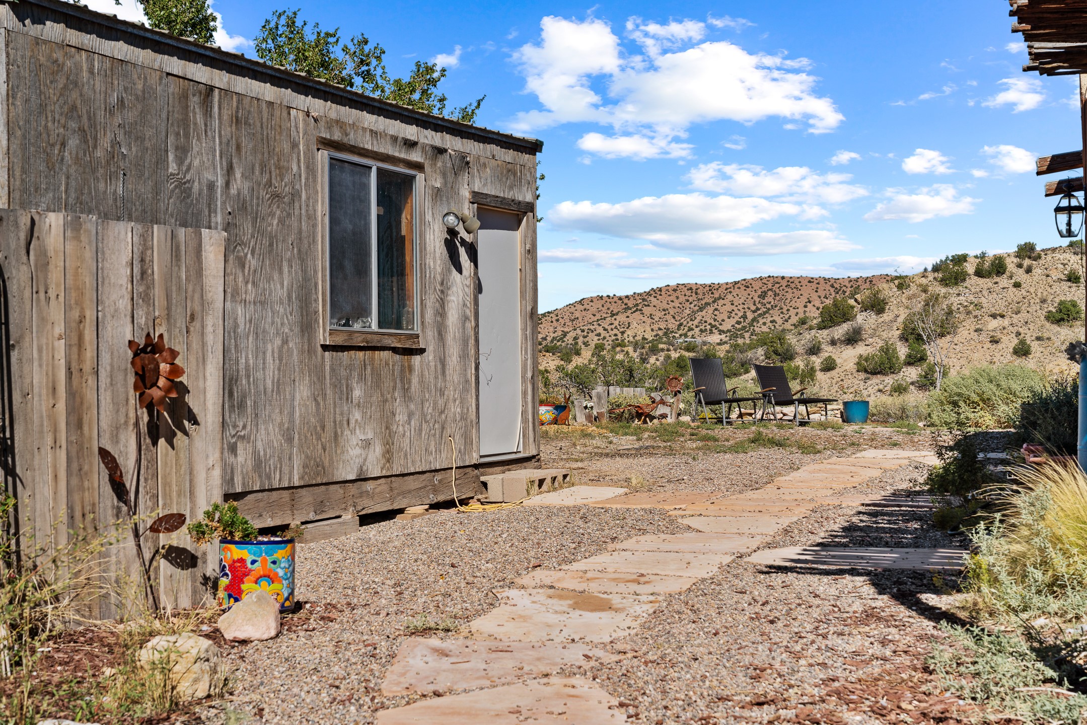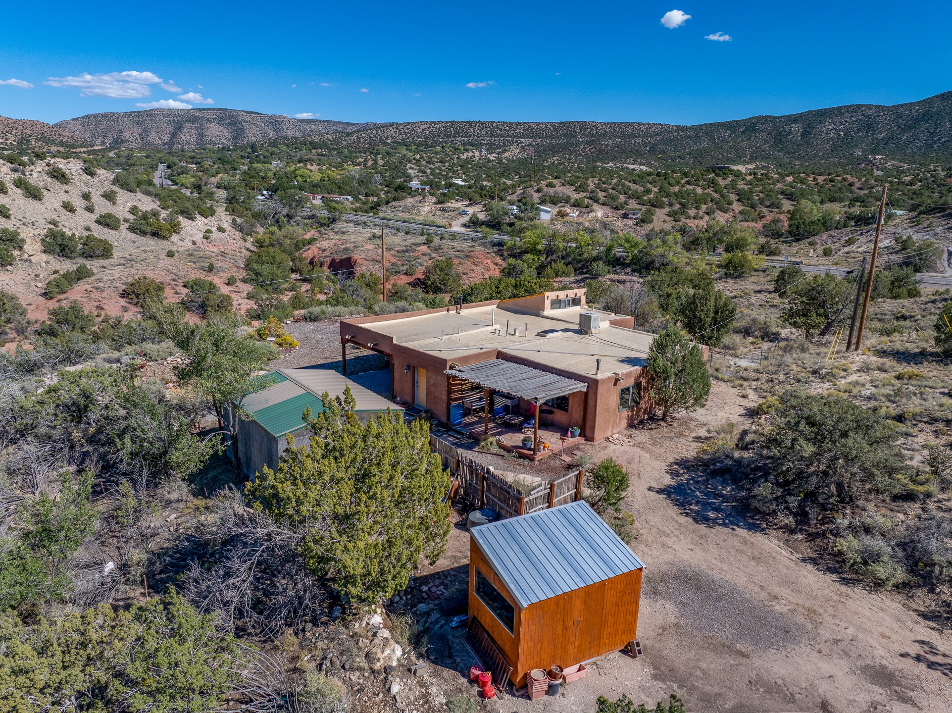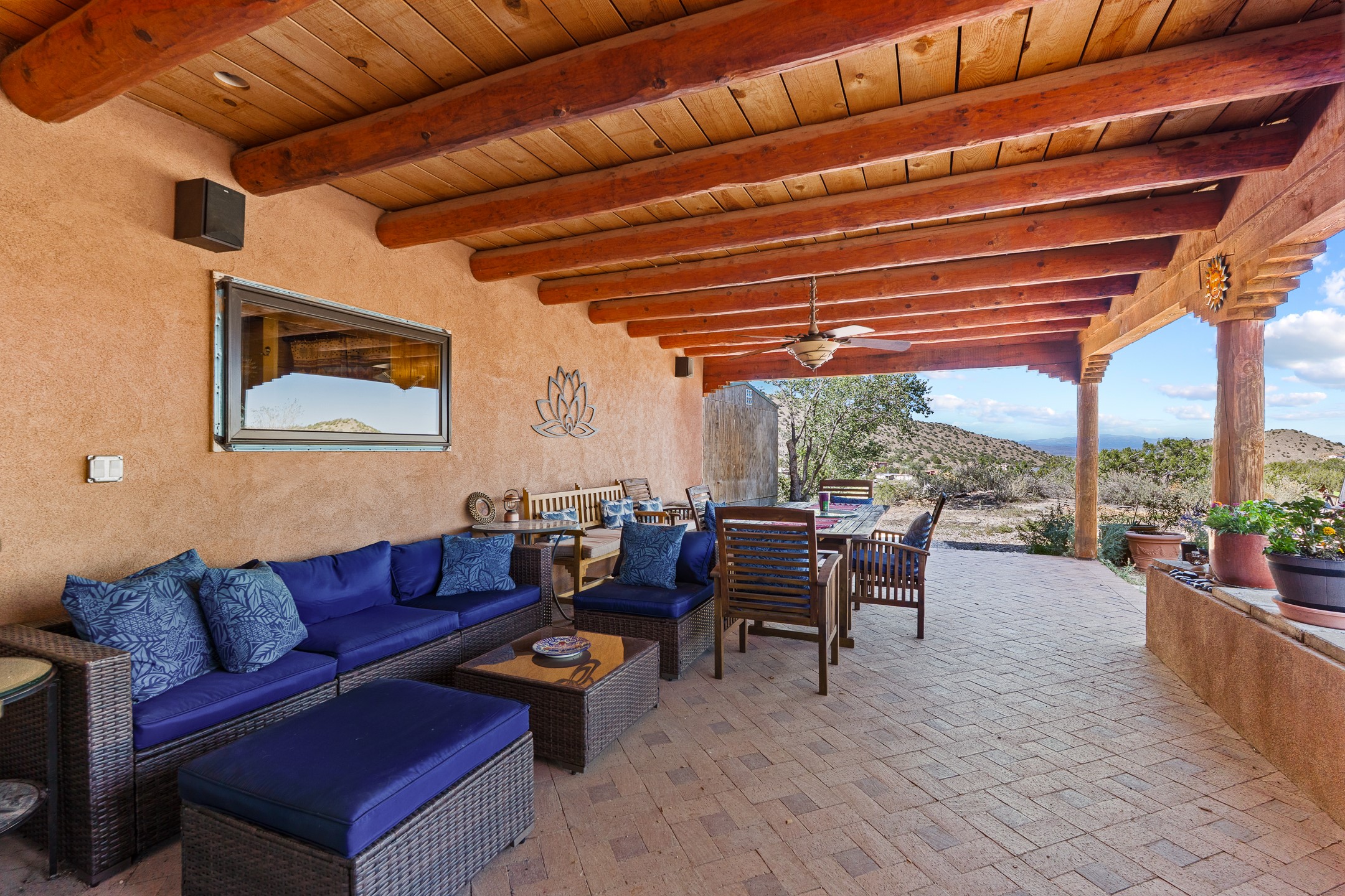 Nestled beside a picturesque canyon, part of the historic San Antonio de Las Huertas Land Grant, and near National Forest access, this charming adobe home--dating back to the 1940s--sits on two tranquil acres surrounded by sweeping mountain views. Thoughtfully updated to preserve its authentic Southwestern character, the home features traditional vigas and wood plank ceilings that create a warm, inviting atmosphere. Step onto the spacious covered portal, complete with vigas and a brick floor, and take in the serene vistas of the Sandia and Jemez mountains--an ideal setting for outdoor dining or entertaining. The main portal opens into a cozy living room with pellet stove and beautifully plastered adobe walls. The remodeled kitchen blends rustic charm with modern convenience, offering a country-style farm sink, quartz countertops, and a butcher block island. Both bedrooms are generously sized. Pella windows and patio door. Recent upgrades include a new roof system, new hot water heater, and new main electric panel service, all installed in September 2025. 320-square-foot workshop, 108-square-foot storage shed, and a large, fenced yard perfect for dogs. An older addition presents exciting possibilities--building plans available to convert to dining room. $9600 bid to turn it in to another portal. $10,000 credit to Buyer for old addition.