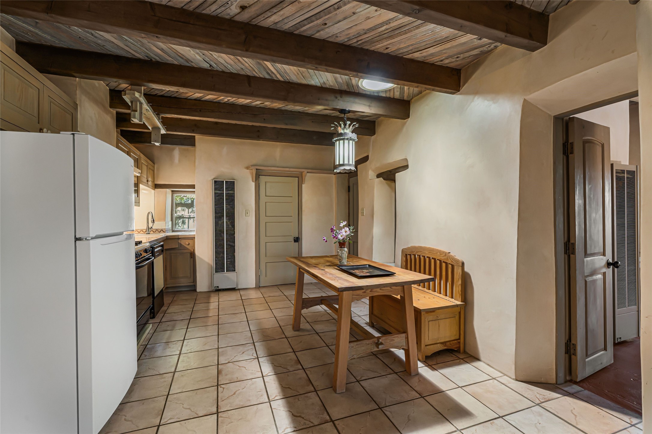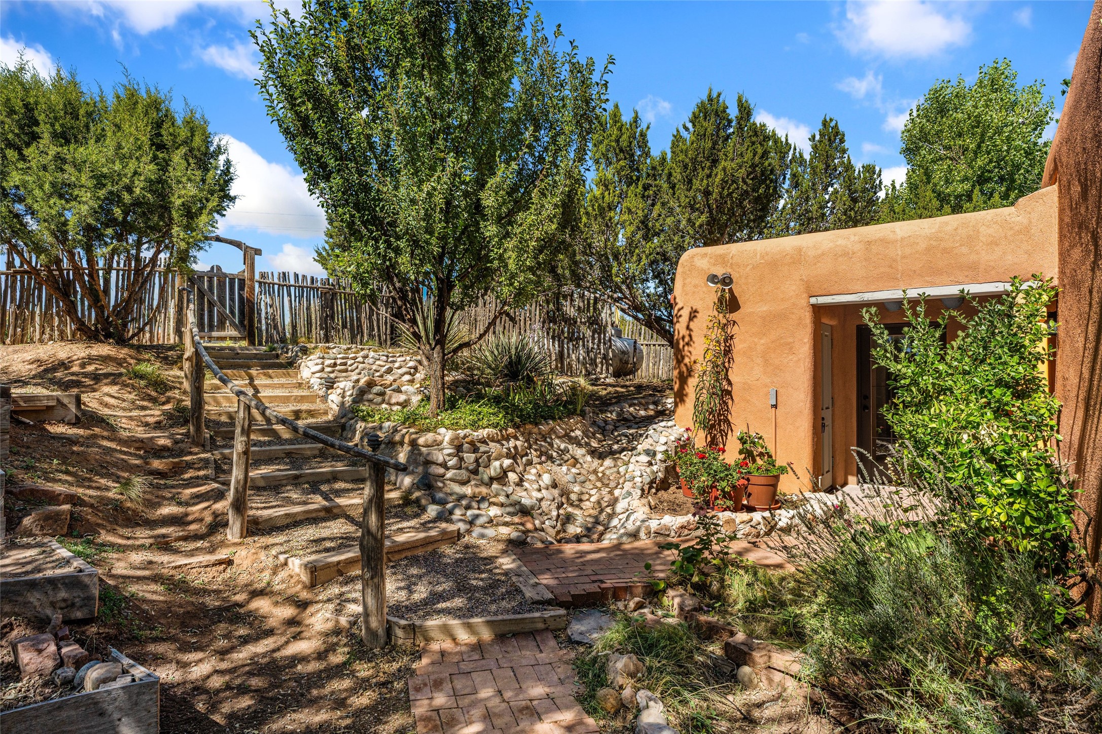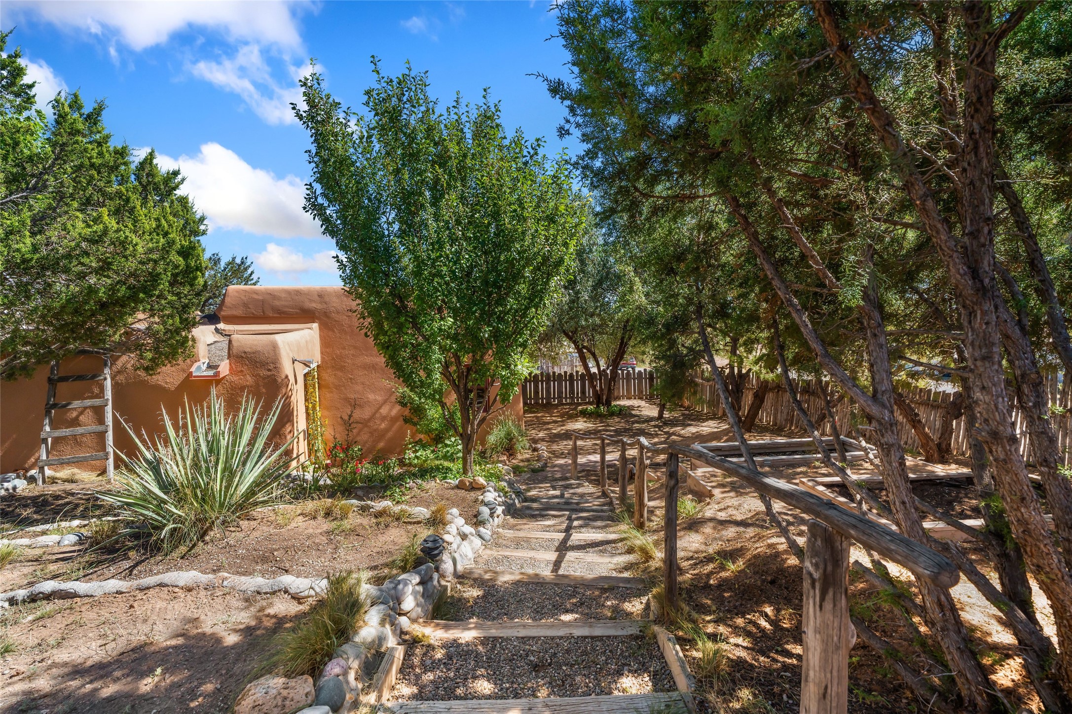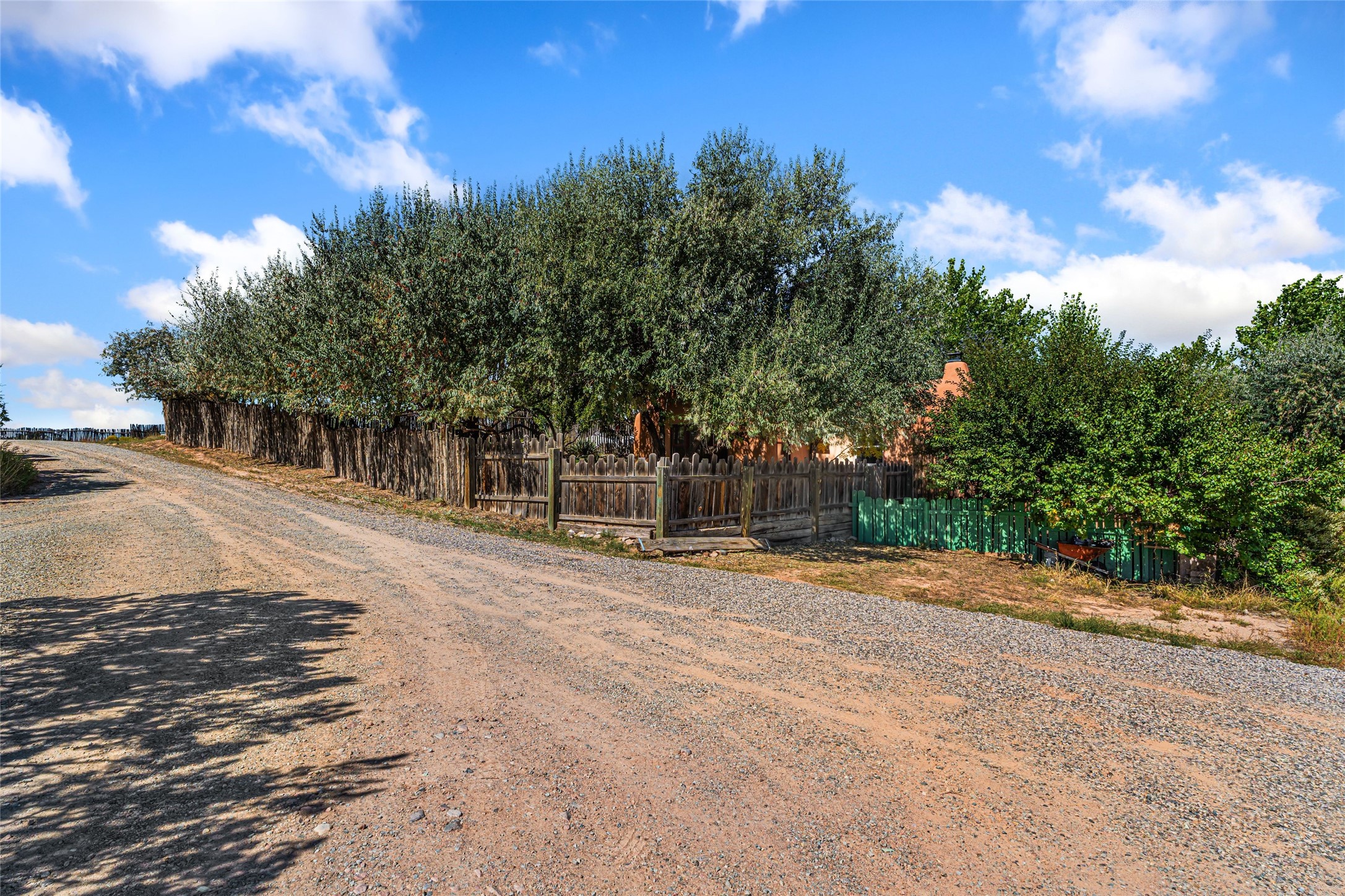 Set on nearly 6 acres of natural beauty, this hand-crafted adobe home by Jerry West offers a lifestyle rooted in nature and creativity. Part of a residential community, the grounds feature an orchard, shade trees, and meandering trails that invite exploration, quiet contemplation, or nature gazing. Two private yards extend your living space outdoors, ideal for gardens or simply enjoying the peace of the desert landscape. Inside, the 1-bedroom, 1-bath home blends artistry and function. The open plan living area connects to a kitchen and dining space with a handcrafted table, bench, and a restored antique tin-and-glass chandelier by Maurice Dixon. The bedroom offers warmth and charm with an adobe fireplace, handcrafted trastero cupboard, blanket chest, and two closets. Practical amenities include two attached storage rooms and private parking for two vehicles. A newer well and well house serve the community, ensuring both sustainability and convenience. Located just off NM State Hwy 14 at the Lone Butte General Store, the property offers easy access to downtown Santa Fe while retaining a retreat-like setting. This is a home where creativity abounds, and nature is just outside your door.