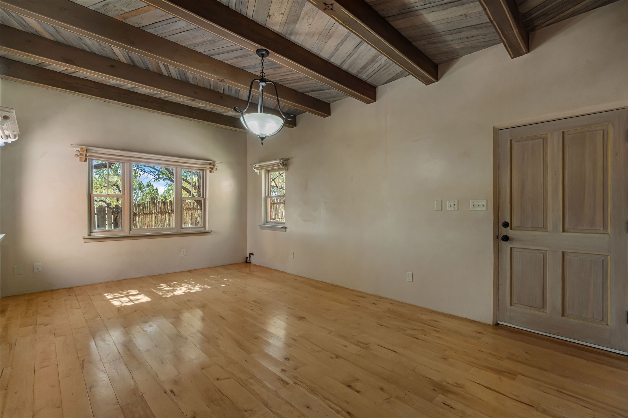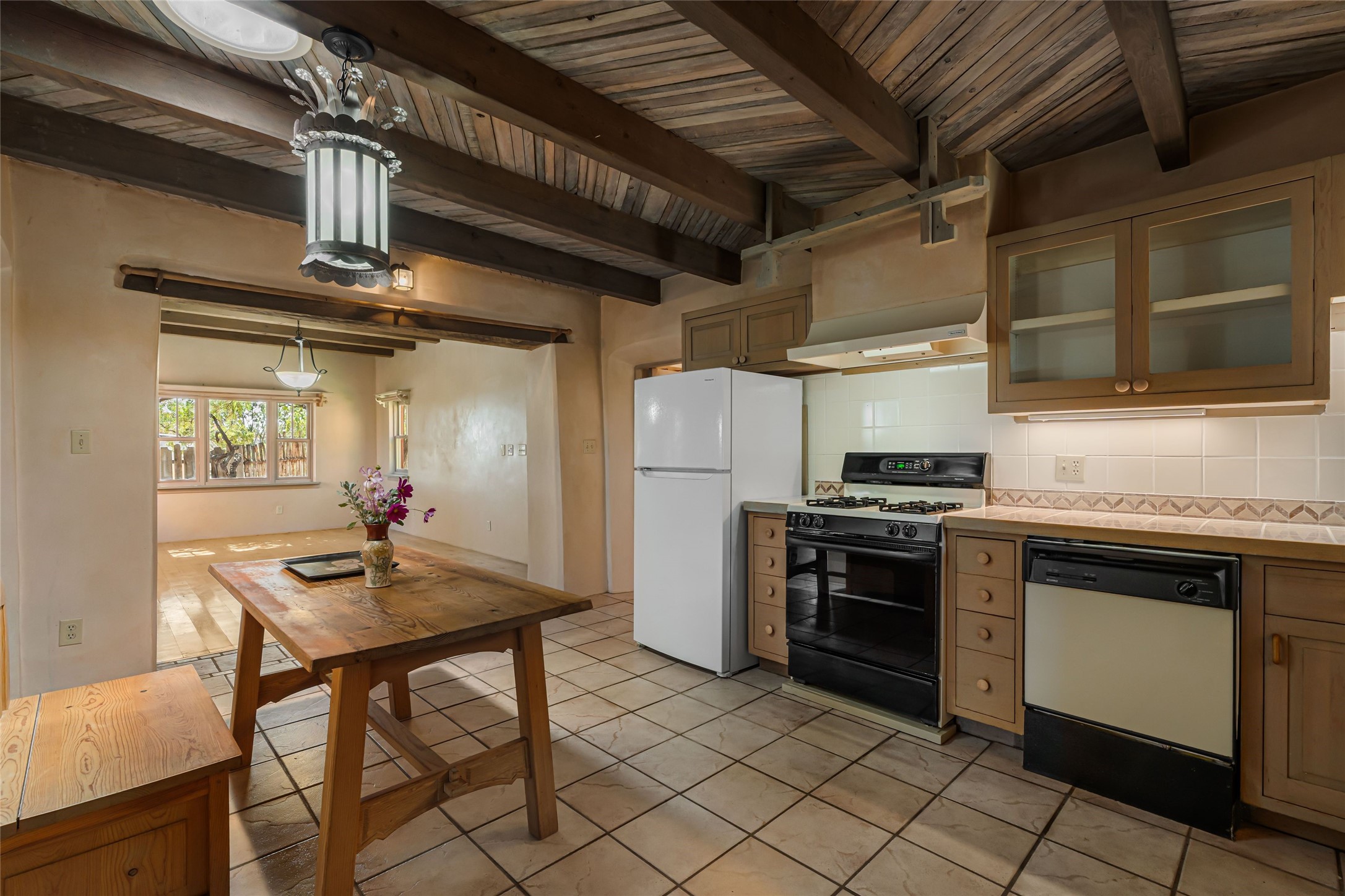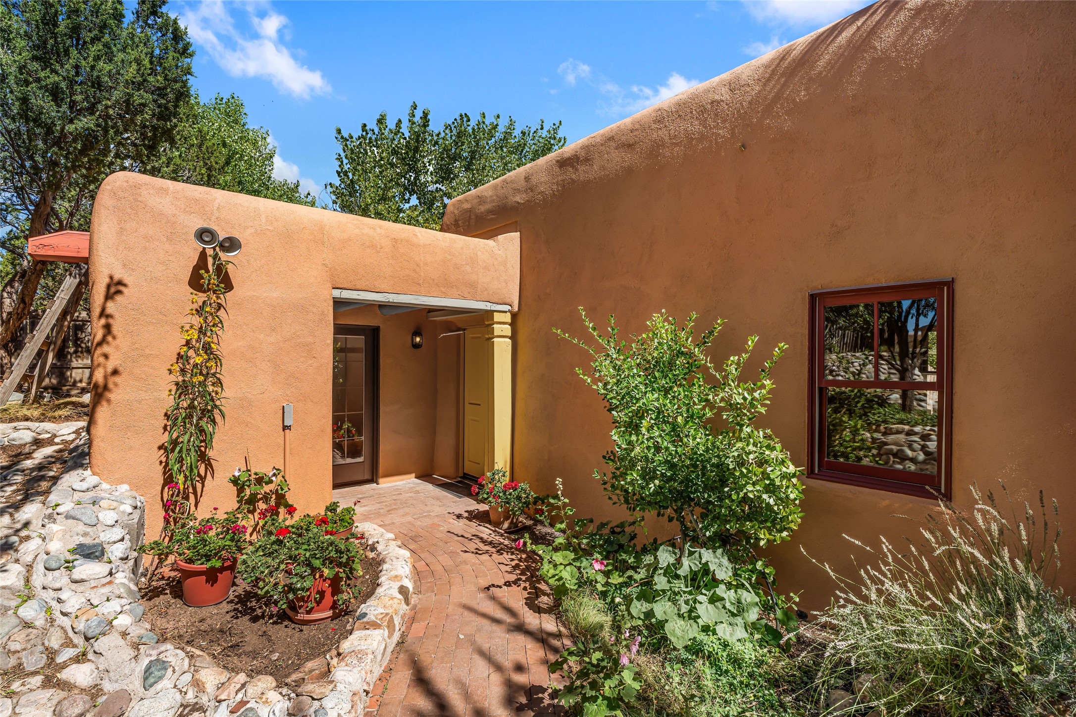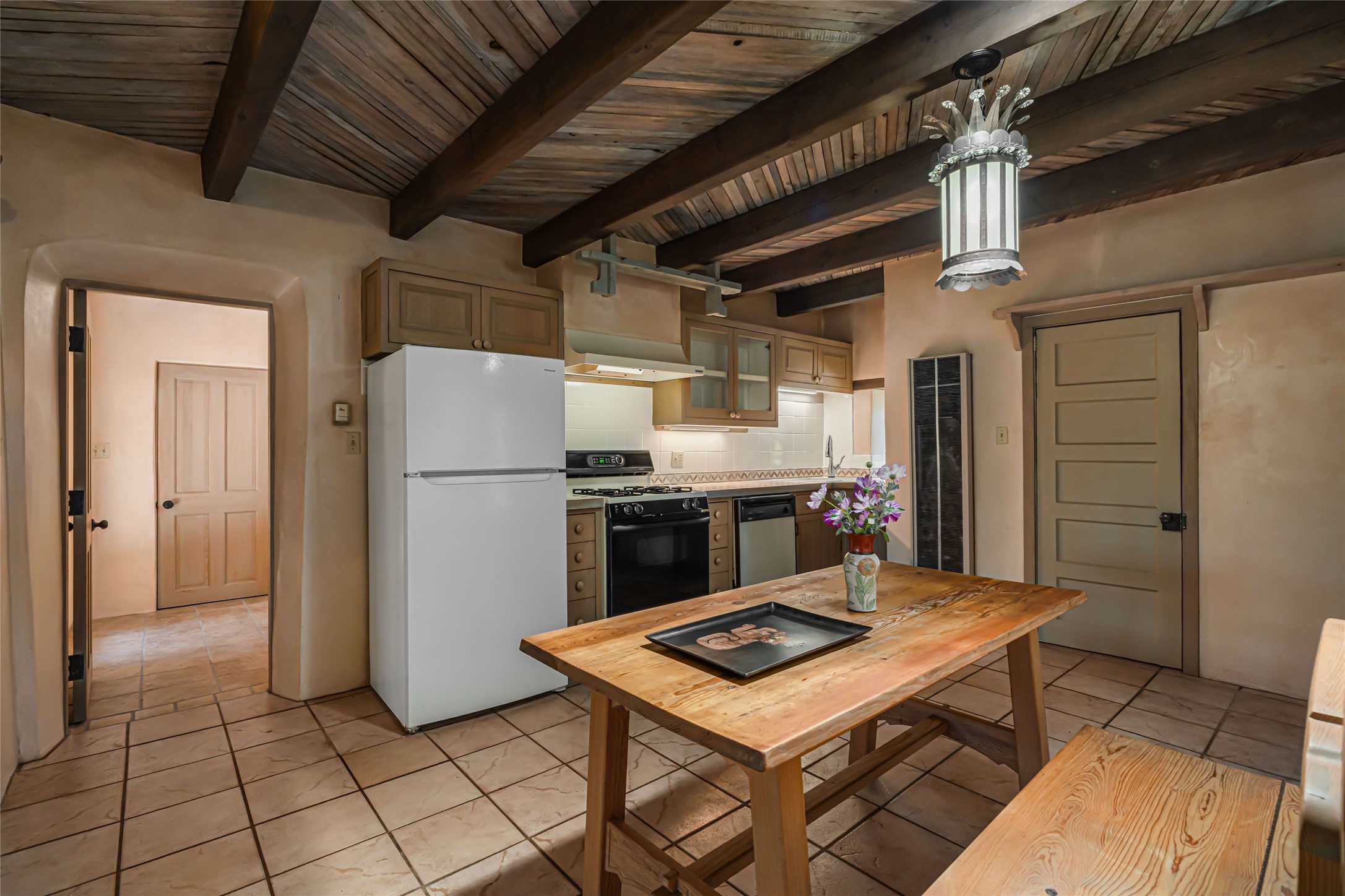 Set on nearly 6 acres of natural beauty, this hand-crafted adobe home by Jerry West offers a lifestyle rooted in nature and creativity. Part of a residential community, the grounds feature an orchard, shade trees, and meandering trails that invite exploration, quiet contemplation, or nature gazing. Two private yards extend your living space outdoors, ideal for gardens or simply enjoying the peace of the desert landscape. Inside, the 1-bedroom, 1-bath home blends artistry and function. The open plan living area connects to a kitchen and dining space with a handcrafted table, bench, and a restored antique tin-and-glass chandelier by Maurice Dixon. The bedroom offers warmth and charm with an adobe fireplace, handcrafted trastero cupboard, blanket chest, and two closets. Practical amenities include two attached storage rooms and private parking for two vehicles. A newer well and well house serve the community, ensuring both sustainability and convenience. Located just off NM State Hwy 14 at the Lone Butte General Store, the property offers easy access to downtown Santa Fe while retaining a retreat-like setting. This is a home where creativity abounds, and nature is just outside your door.