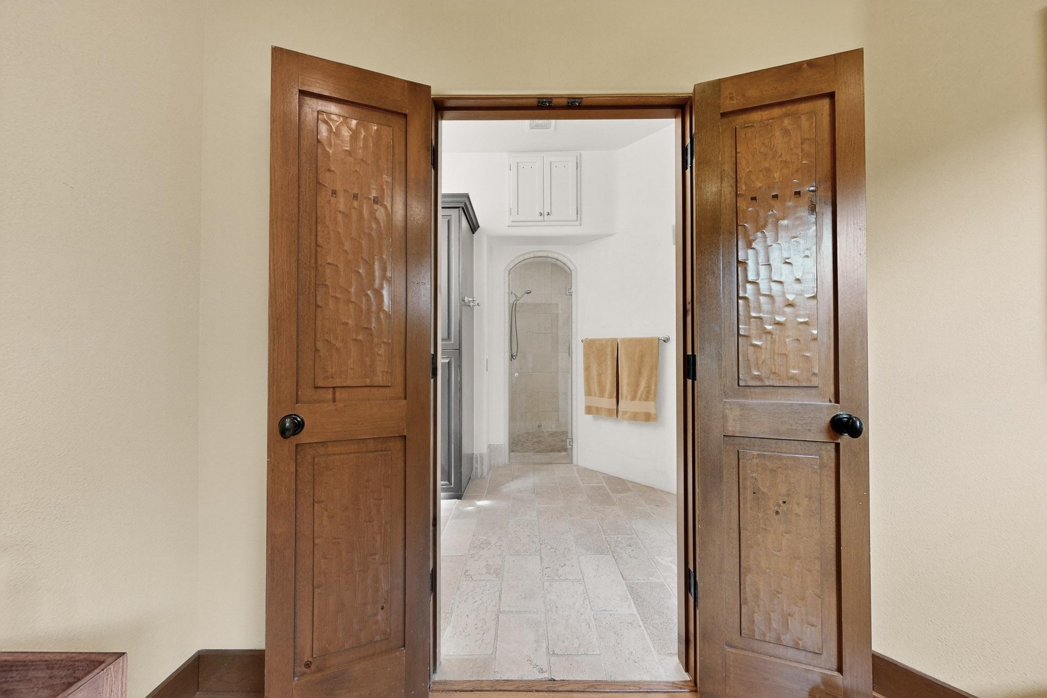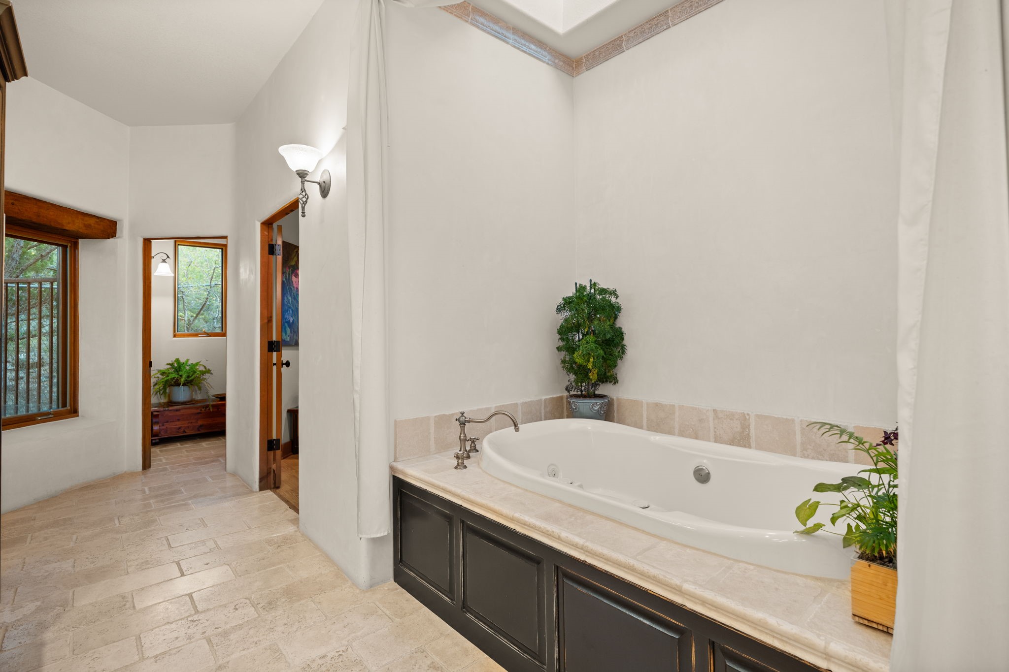 With vistas of the Sandia Mountains and city lights, this spacious 5,513 sq. ft. Sandia Heights estate is a rare blend of artistry, craftsmanship, and luxury. Upon entering the front door, the spacious living area introduces the understated beauty of this special home with hand-crafted details, deep sandstone sills, and a beautiful wood-burning fireplace. Features such as expansive chip-carved beams, custom doors, and diamond plaster walls provide warmth and refinement. Expansive windows frame breathtaking views and bath the house with natural light, magically merging the outdoor and indoor spaces. The kitchen is a chef's dream with a Sub-Zero refrigerator and freezer, Viking Professional 6-burner stove with griddle, and a butler's pantry complete with a Sub-Zero wine and beverage coolerTogether with the eating nook, kiva fireplace seating area, and formal dining room the kitchen area is perfect for evenings with family or elegant entertaining. The primary suite is a true sanctuary featuring a coved ceiling with exposed beams and corbels, a gas log fireplace, and a cozy seating area with latilla ceiling and built-in bookcases. The adjoining spa-inspired bath has it all - a steam shower, dual shower heads, travertine seating, a skylight over the garden jetted tub, and a private yoga and meditation room. Additional living spaces include a home office attached to a secondary living room and multiple generous ensuite bedrooms. The private backyard feels like a Zen oasis under New Mexico skies with a tiered garden, in-ground spa, outdoor fireplace, and covered patio. Modern comforts abound with in-floor hot water radiant heat, large 3-car garage, abundant storage, central vacuum, built-in speakers, new stucco and septic in 2025! This could be your ABQ Dream Home!