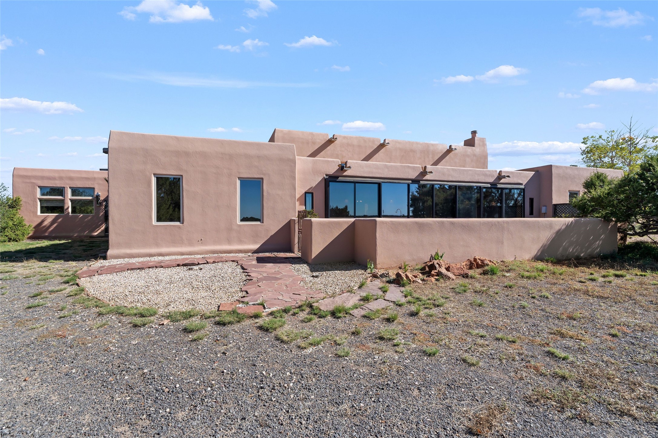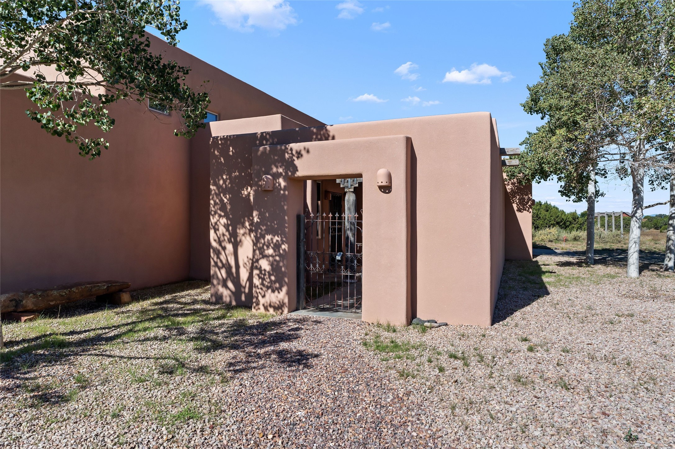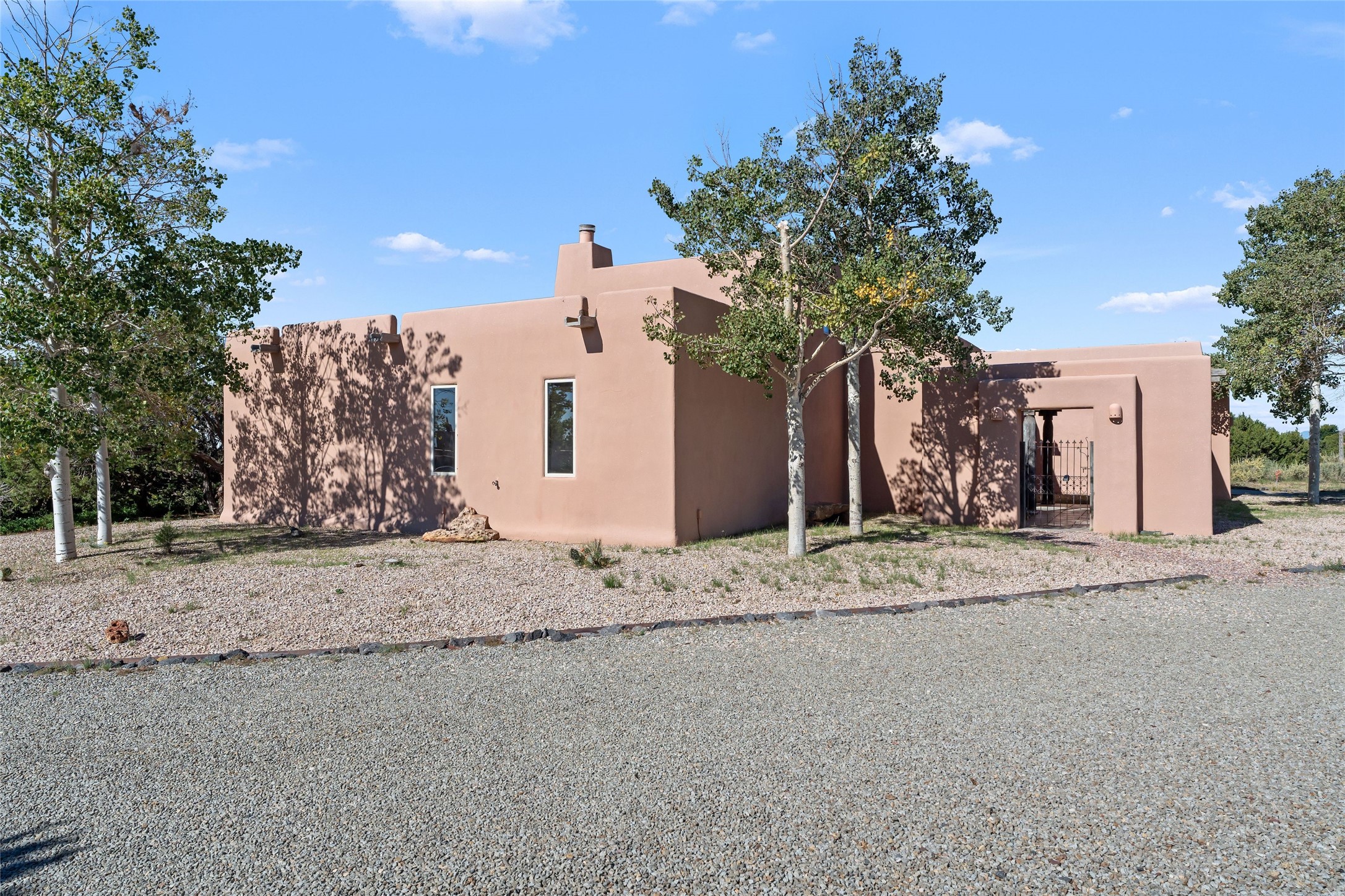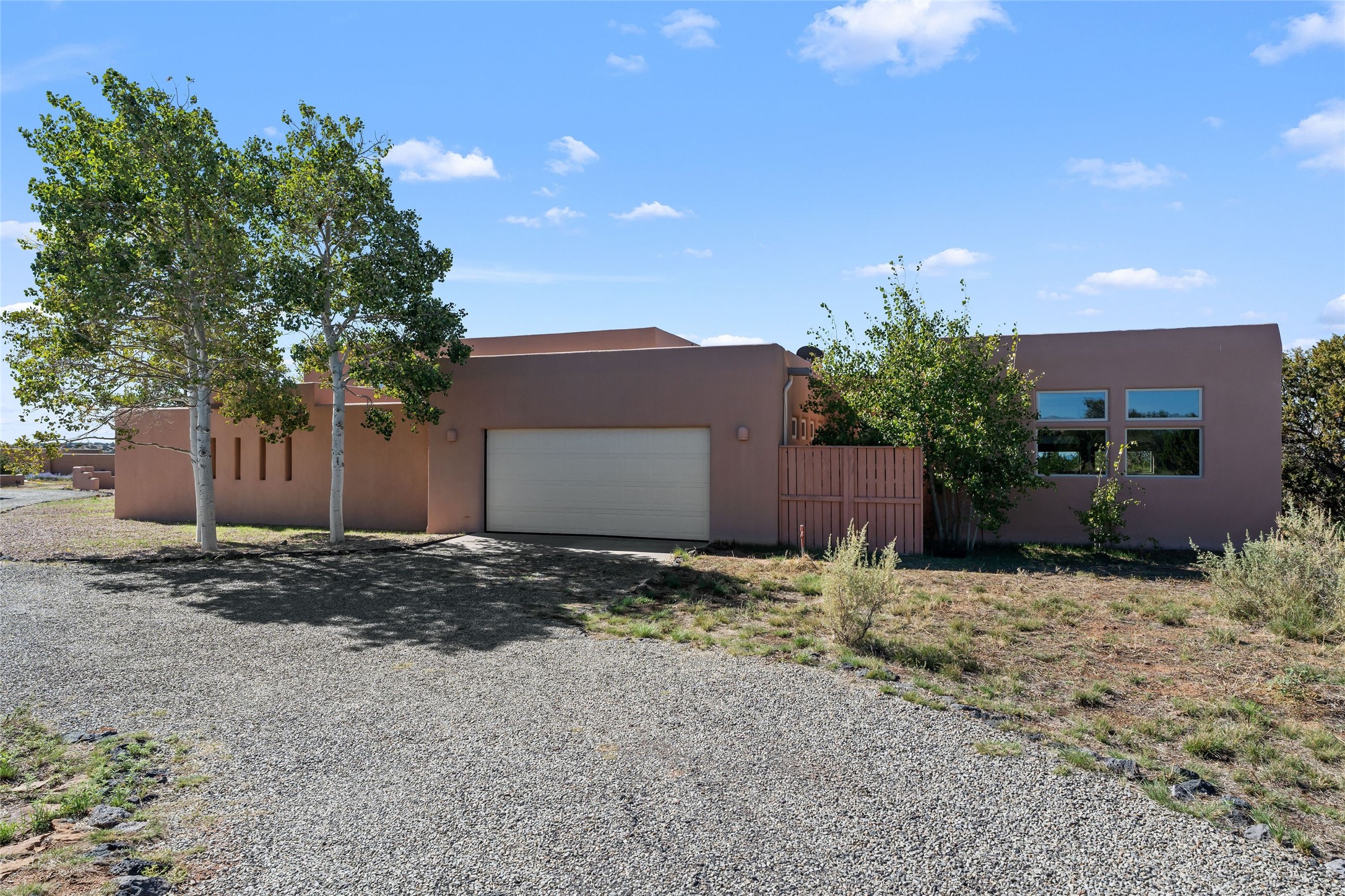 Nestled in the serene Eldorado/Lamy area, this home perfectly balances tranquility and convenience. Enjoy the peacefulness of the high desert while being just a short drive from Santa Fe's renowned dining, cultural attractions, and amenities. Embodying the timeless elegance of Southwestern architecture, this residence features classic vigas, rich wood accents, and authentic regional charm. Step through the foyer into an expansive living room, where soaring ceilings, clerestory windows, and a cozy fireplace create an inviting sense of space and light. The living and dining areas flow seamlessly into the adjacent kitchen, making it ideal for entertaining and everyday living. The well-designed layout includes a large walk-in pantry near the kitchen, as well as a laundry room with abundant storage and a utility sink. The split floor plan offers privacy, with the primary suite on the east side of the home and two generously sized secondary bedrooms with a nearby full bath on the west side. The spacious primary suite includes a dual-sink vanity, soaking tub, separate shower, large walk-in closet, and direct access to an expansive enclosed patio--perfect for enjoying quiet mornings or evening sunsets. A bonus room off the oversized two-car garage provides flexible space for an art studio, home gym, or private office/library. Recent upgrades include a new high-efficiency boiler and water heater and fresh interior paint. Outdoor spaces are equally impressive, featuring a gated courtyard with a covered portal and a walled backyard accessible from the patio or side gate. Set on approximately 4.66 acres, this property offers sweeping views of the Ortiz, Sandia, and Jemez Mountains. With its combination of comfort, character, and spectacular scenery, this home is a must-see Santa Fe retreat. PROPERTY IS BEING SOLD IN AS-IS CONDITION.
