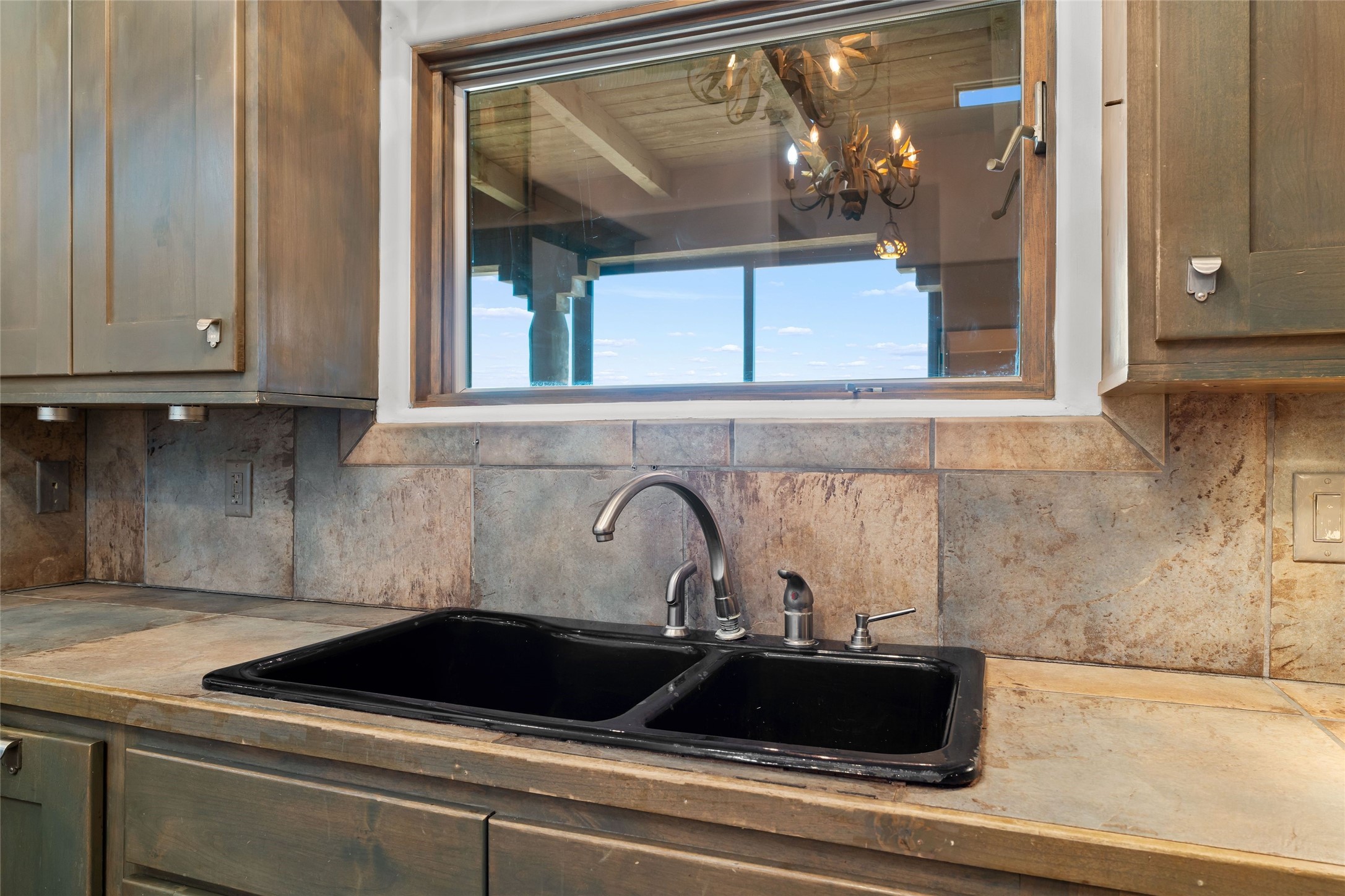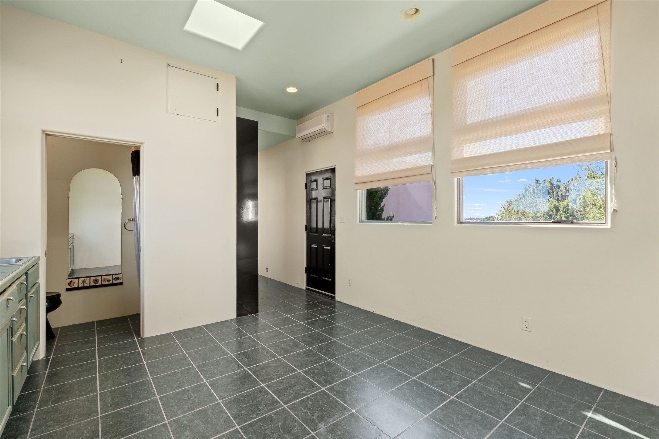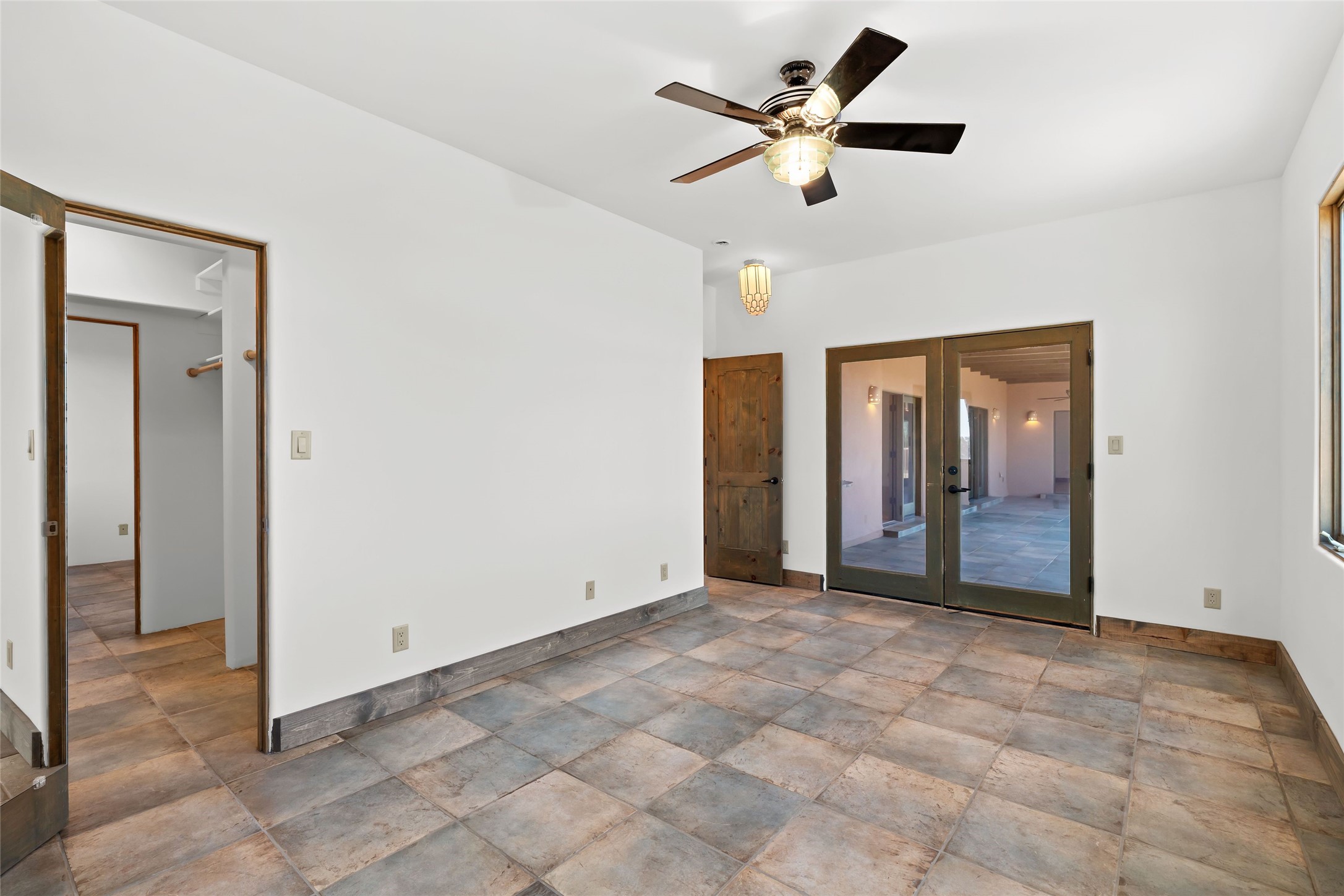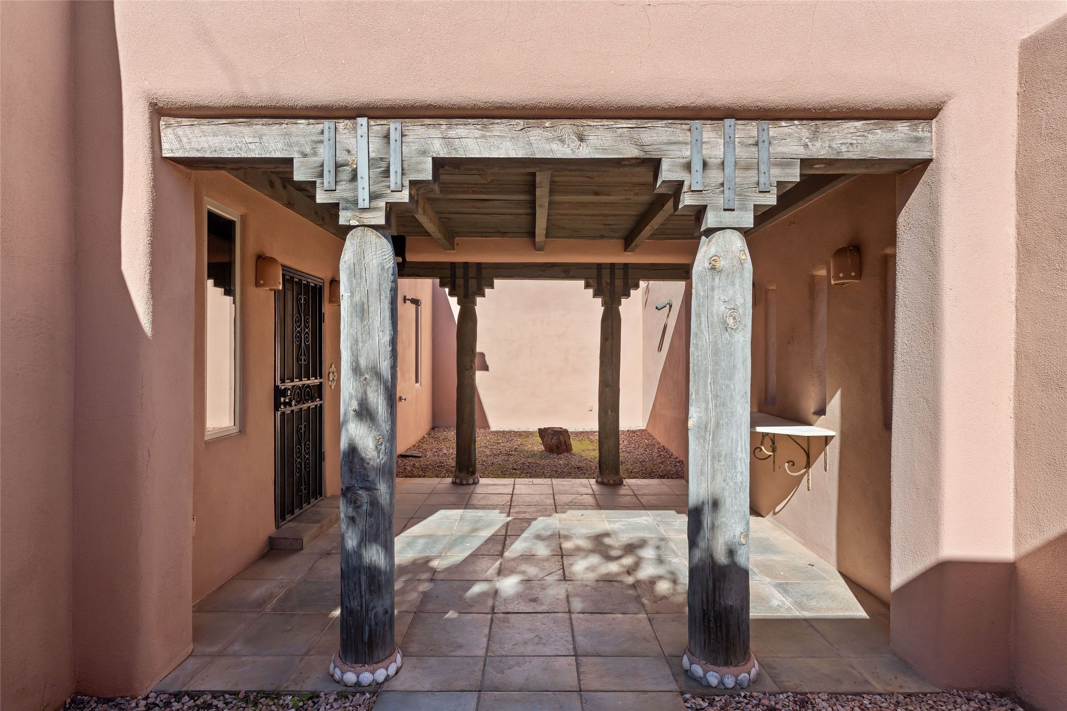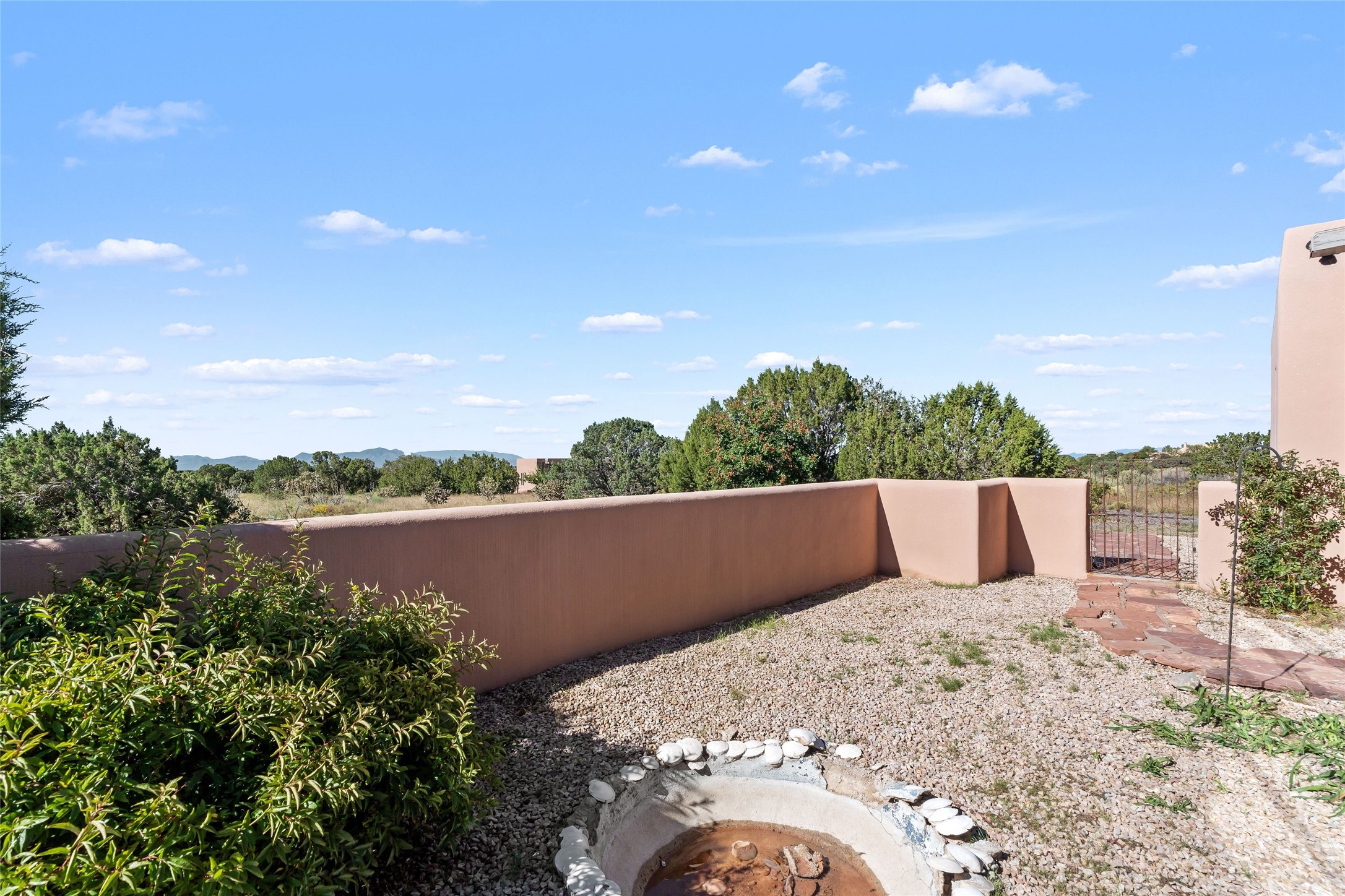Nestled in the serene Eldorado/Lamy area, this home perfectly balances tranquility and convenience. Enjoy the peacefulness of the high desert while being just a short drive from Santa Fe's renowned dining, cultural attractions, and amenities. Embodying the timeless elegance of Southwestern architecture, this residence features classic vigas, rich wood accents, and authentic regional charm. Step through the foyer into an expansive living room, where soaring ceilings, clerestory windows, and a cozy fireplace create an inviting sense of space and light. The living and dining areas flow seamlessly into the adjacent kitchen, making it ideal for entertaining and everyday living. The well-designed layout includes a large walk-in pantry near the kitchen, as well as a laundry room with abundant storage and a utility sink. The split floor plan offers privacy, with the primary suite on the east side of the home and two generously sized secondary bedrooms with a nearby full bath on the west side. The spacious primary suite includes a dual-sink vanity, soaking tub, separate shower, large walk-in closet, and direct access to an expansive enclosed patio--perfect for enjoying quiet mornings or evening sunsets. A bonus room off the oversized two-car garage provides flexible space for an art studio, home gym, or private office/library. Recent upgrades include a new high-efficiency boiler and water heater and fresh interior paint. Outdoor spaces are equally impressive, featuring a gated courtyard with a covered portal and a walled backyard accessible from the patio or side gate. Set on approximately 4.66 acres, this property offers sweeping views of the Ortiz, Sandia, and Jemez Mountains. With its combination of comfort, character, and spectacular scenery, this home is a must-see Santa Fe retreat. PROPERTY IS BEING SOLD IN AS-IS CONDITION.
