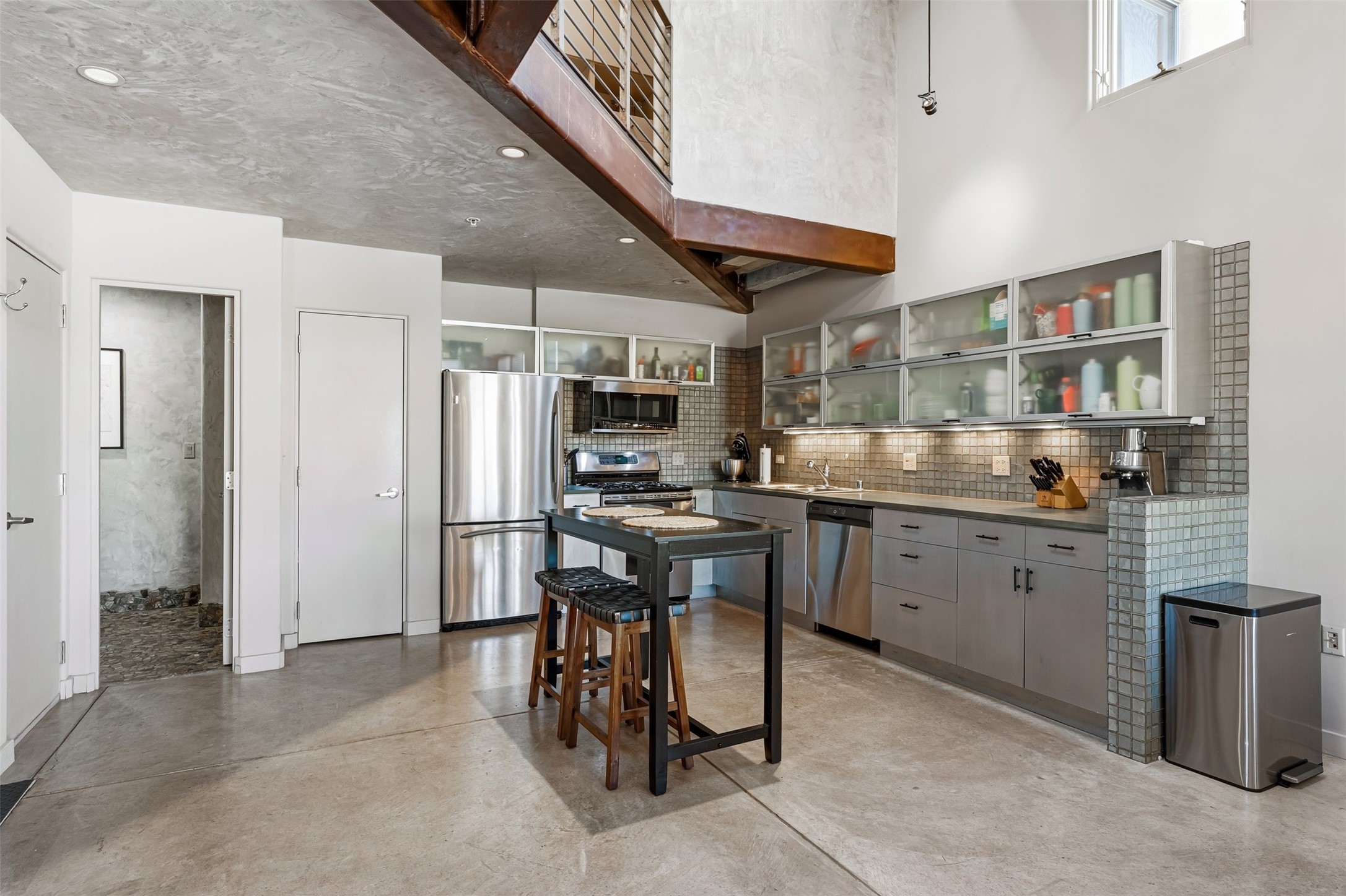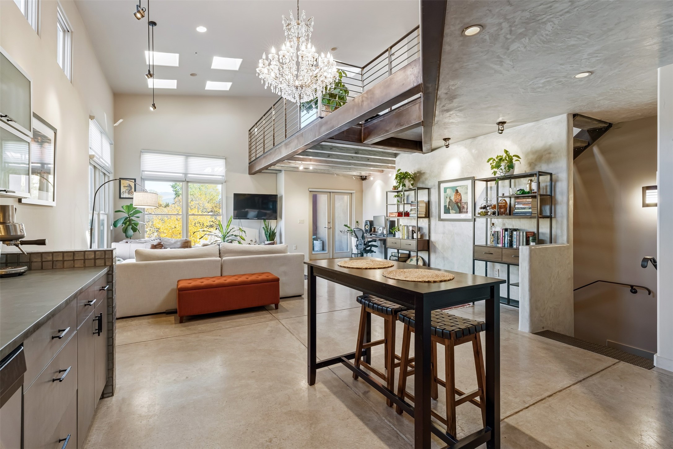 Contemporary live/work condo located in the highly sought-after South Capitol neighborhood--just a short walk to the Santa Fe Plaza and less than a mile from the Railyard District. Enjoy easy access to Whole Foods, Trader Joe's, Natural Grocers, popular restaurants, and a variety of local amenities. This two-level, second-floor residence offers 1 bedroom and 2 baths (1 full, 1 half) and is quietly tucked away at the back of the complex for added privacy. Expansive windows frame views of the Sangre de Cristo Mountains, while clerestory windows and soaring 17' ceilings fill the space with natural light.The open floor plan features a modern kitchen, sleek concrete floors with in-floor radiant heat, and new evaporative cooler. Step out from the living area onto a spacious deck to enjoy outdoor living and mountain views. Upstairs, the lofted bedroom offers generous closet space, a bath with a steam shower, and stackable laundry. Don't miss this unique opportunity to own a stylish and light-filled home in one of Santa Fe's most desirable neighborhoods.