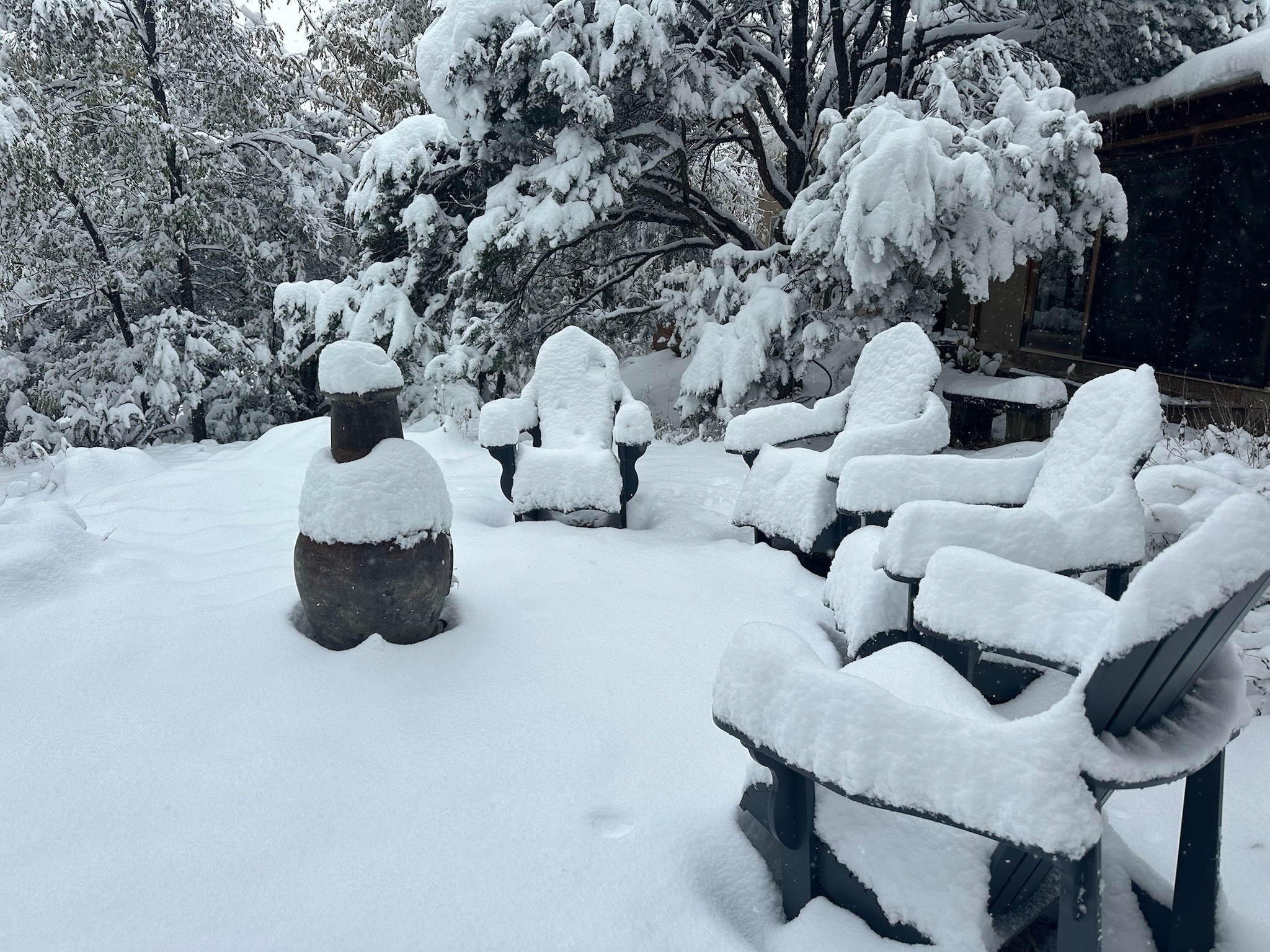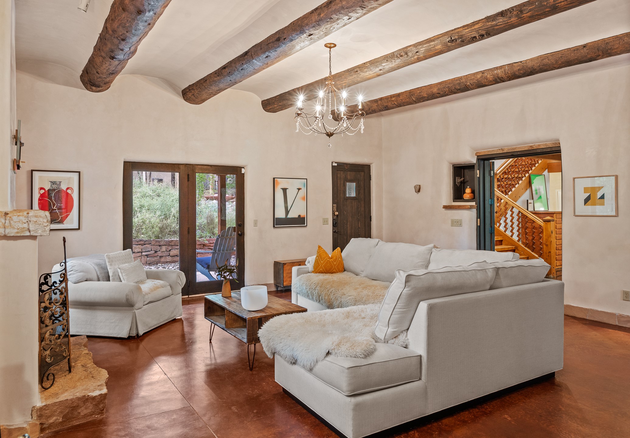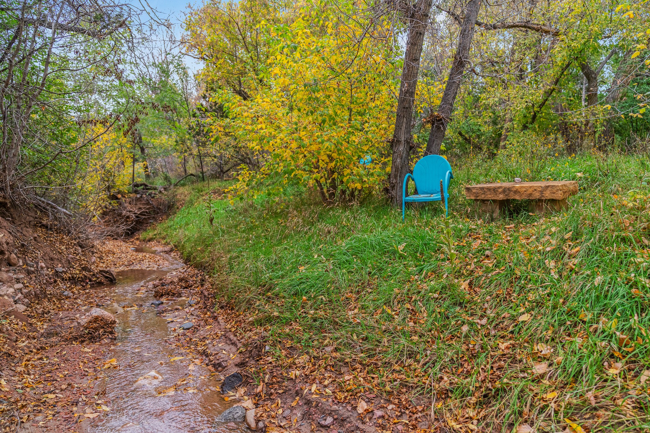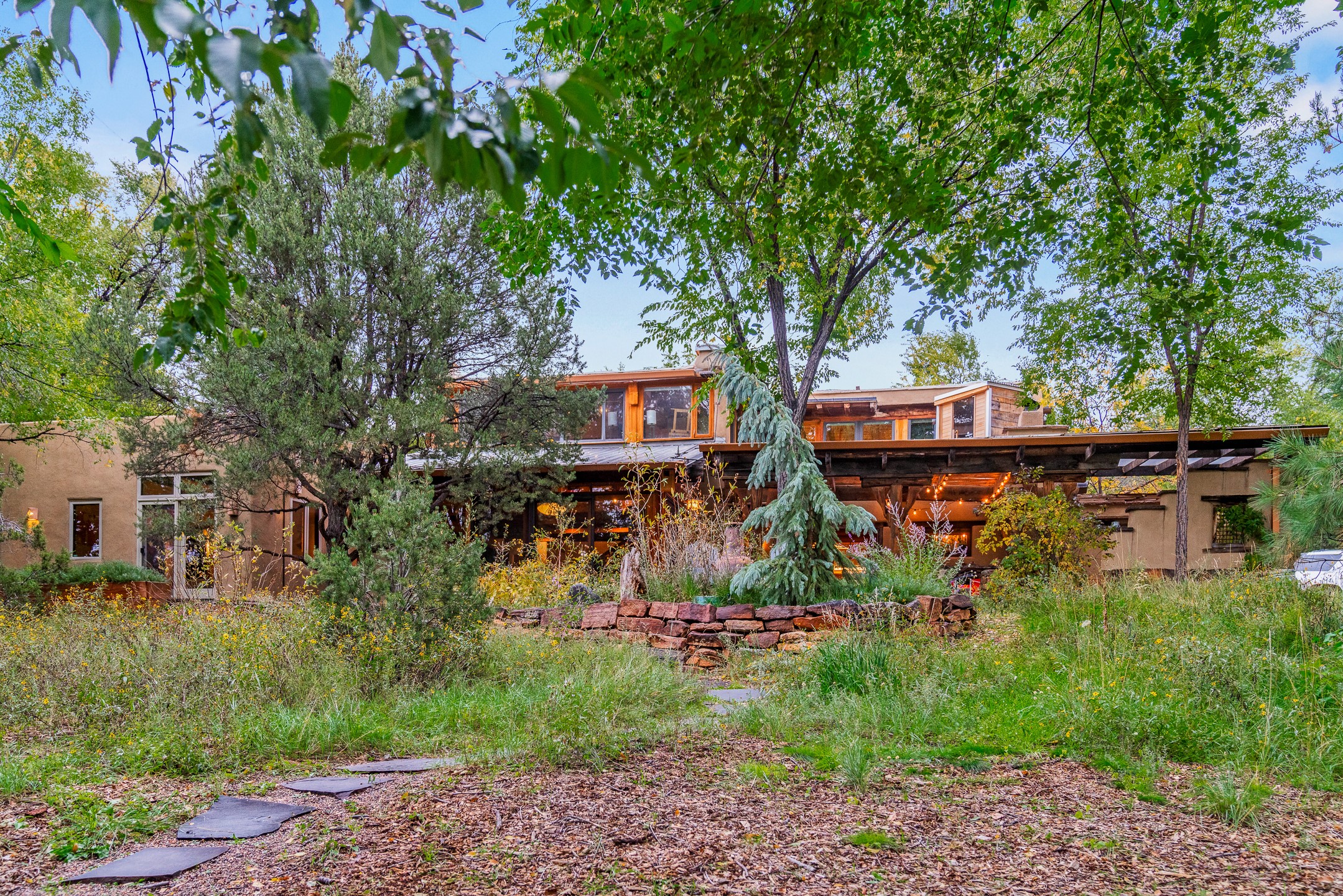 Location, location! A quick 8 minutes to Santa Fe Plaza and 5 minutes from the beloved Tesuque Village Market, this extraordinary 3,366 sq ft adobe sanctuary is nestled on .77 lush, tree-covered acre and adjacent to the seasonal Tesuque Creek. This 3 bdrm/3.5 bath residence blends soulful Santa Fe architecture built by notable local craftsmen, with regenerative land stewardship to support biodiversity. Flagstone floors, vigas, split cedar ceilings, and walls that transition organically from adobe to stone create a uniquely grounded and artistic living experience. The renovated kitchen features natural stone countertops and open dining area perfect for entertaining. Dining area opens to a covered portal with a natural gas firepit ideal for outdoor gatherings beneath the stars, rain or shine. There are two living areas: The original living room was designed for Japanese tea ceremony with glass wall that opens to views of the garden and creek side forest. The North living room features a dramatic fireplace, high ceilings, and connects to a serene ground-level primary suite with cedar lined closet, as well as a fenced garden area abundant with fruit trees and pollinator-friendly plants. The handcrafted staircase is built with no nails and leads to the upper level, where you'll find a guest suite and a second primary suite with a private deck and an infrared sauna - an immersive retreat in the treetops of Tesuque. Both have en suite bathrooms.Additional amenities include an automatic gated entry, labyrinth, private well with pristine water, EV charger, and a handcrafted workshop. There is so much more to say about this poetic property, but if you're seeking a Santa Fe home that honors nature, creativity, and intentional living, this eco-sanctuary in Tesuque is for you. Hiking access via arroyo from back yard and up the road .75 miles to the Lower Windsor Trailhead offer instant connection to the Sangre de Cristomountains and the coveted ecology of the Tesuque Valley.