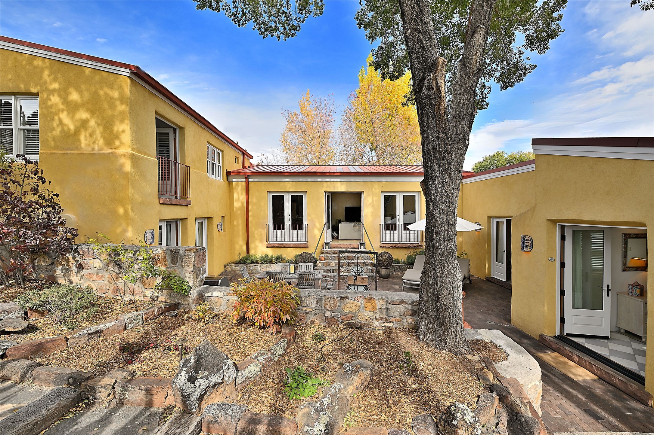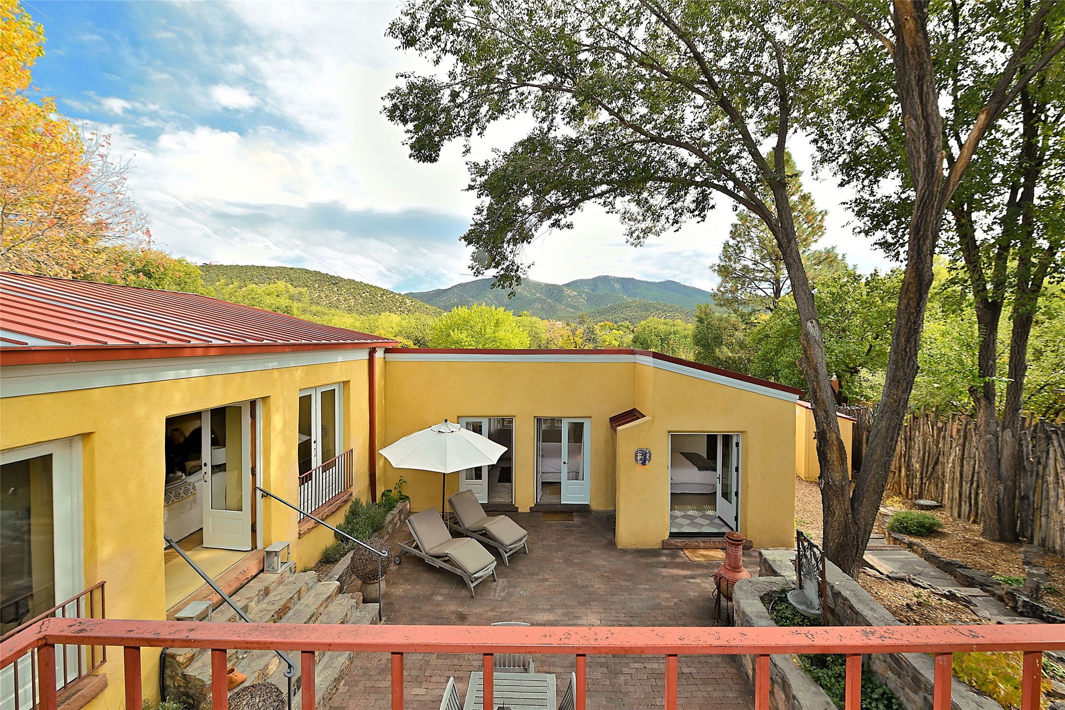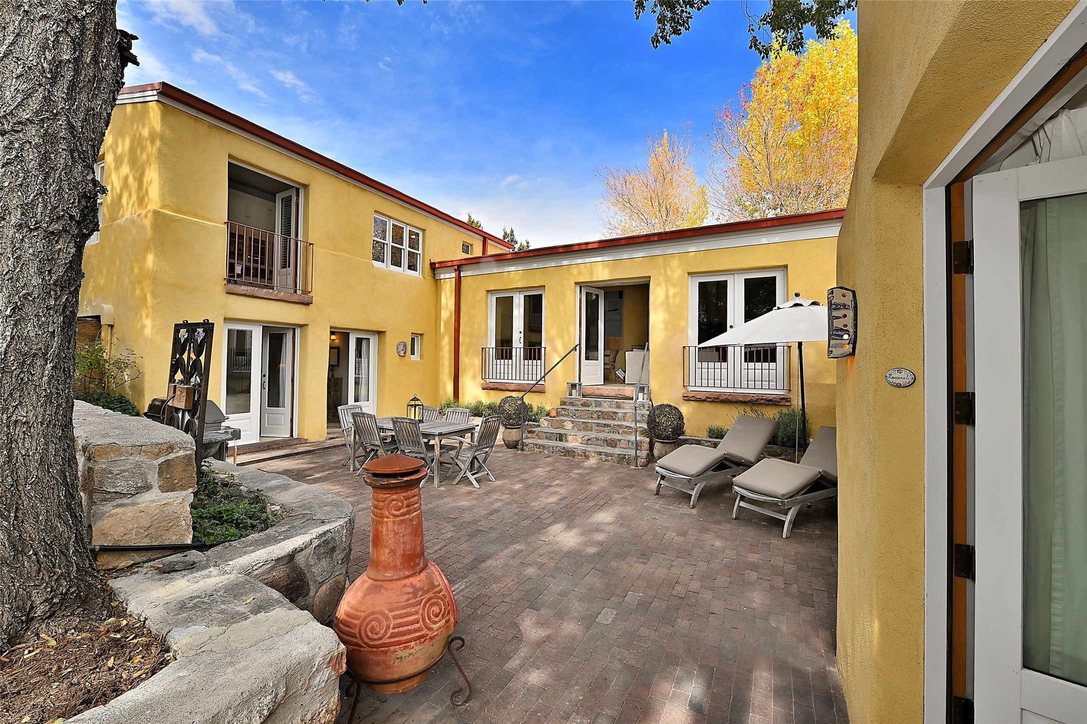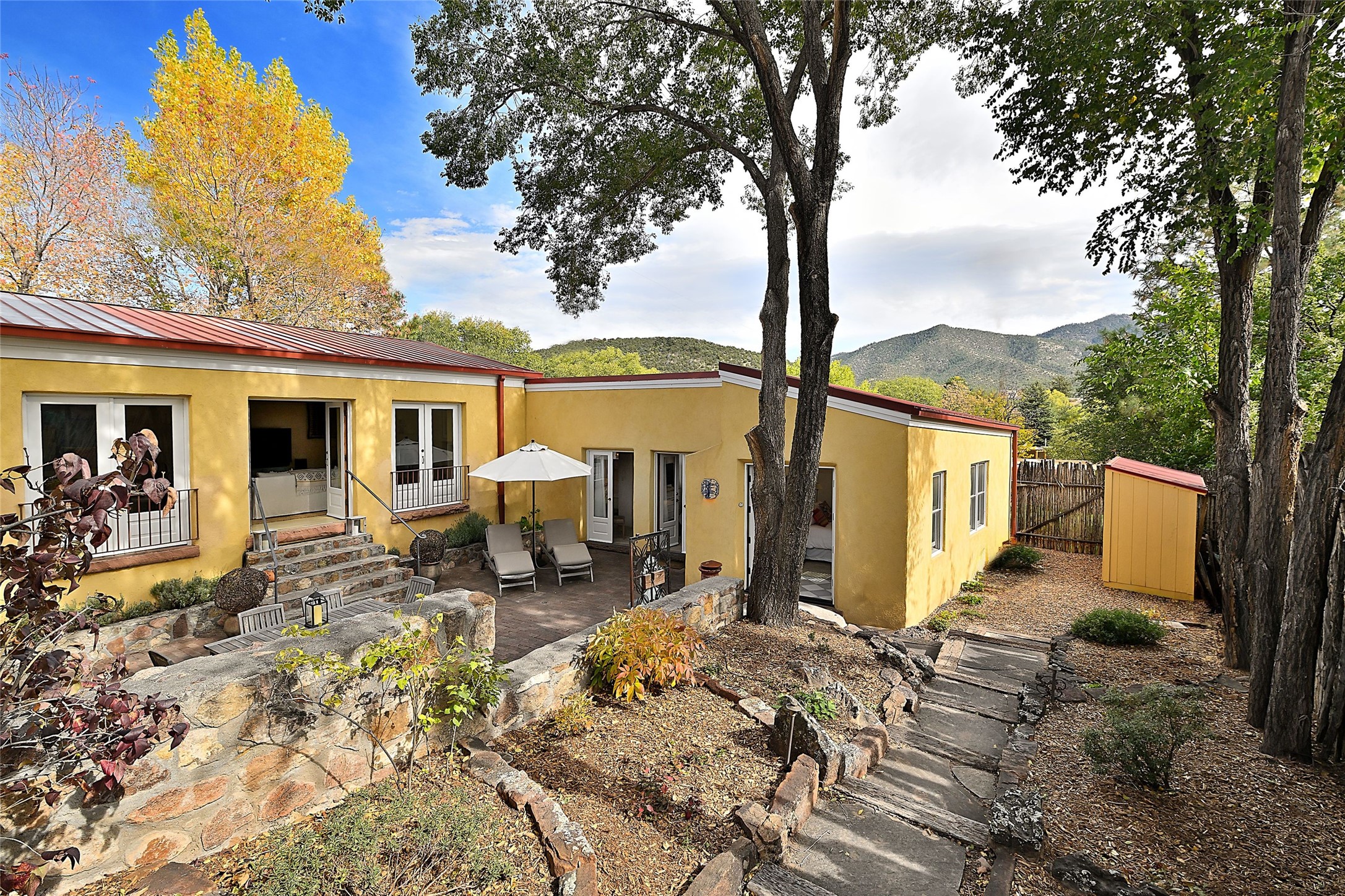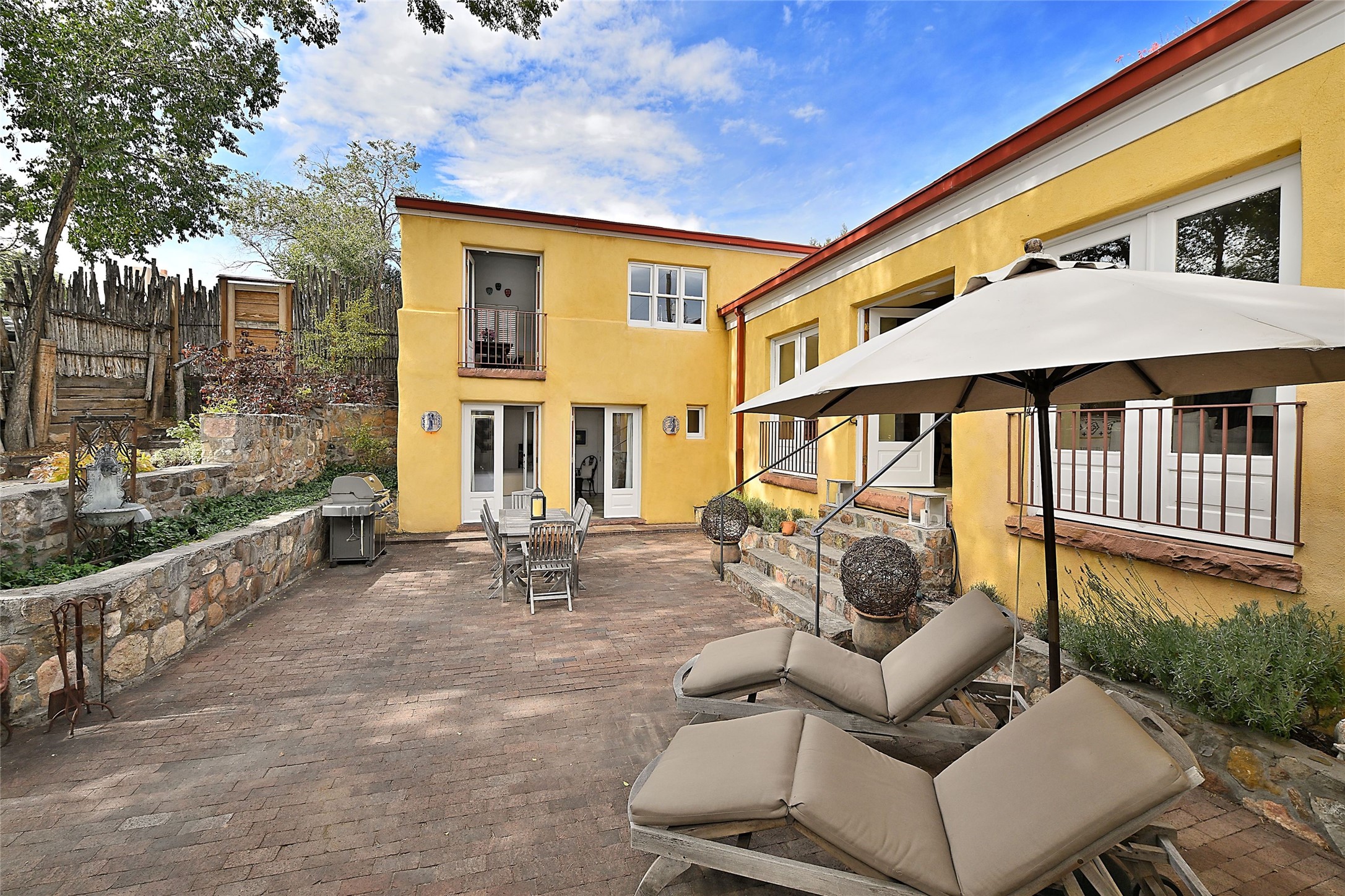 Quiet and charming oasis, located in the heart of Santa Fe's Historic Eastside, and a stone's throw to Canyon Road and the Plaza. Built in 1988 for Santa Fe New Mexican arts critic David Bell, the original two-story structure is carved into an east-facing hillside at the fork of Lorenzo Lane in a verdant neighborhood of historic homes. Unusual for Santa Fe, the yellow stucco exterior gives this delightful home the look of a French country house. Through the quaint, unimposing facade, one enters a surprisingly spacious, yet cozy, three-bedroom home with stunning views of Mount Atalaya and Picacho Peak. French doors open from the living/dining room and all three en-suite bedrooms to a tranquil courtyard surrounded by stone walls, walkways, and irrigated, terraced beds planted with lavender, perennials and shade trees. The primary bedroom was added in 1997 and the attached casita (accessed from the courtyard) was built in 2017 per the design of famed Santa Fe architect Richard Martinez. The property features an abundance of charming features, including: Antique kitchen cabinetry repurposed from a landmark Santa Fe hardware store; 12-foot living/room dining room ceiling with vigas; Diamond-plaster-finished living/dining room, primary bedroom, and casita walls; Painted floors and wood ceiling detailing; Kiva fireplace; French doors into the courtyard from all bedrooms and living/dining room; Landscape lighting and small fountain in courtyard. Modern upgrades include: AC/Heat supplied by mini-splits installed in kitchen and all bedrooms in 2017; Lochinvar, high-efficiency gas furnace installed in 2021 supplies radiant floor heat and instant hot water; Roof-mounted solar panels installed in 2017 that supply 100% of the electricity. The property was previously a popular short-term rental with rave reviews from guests. This is truly the ideal enchanting Santa Fe retreat that is not to be missed!