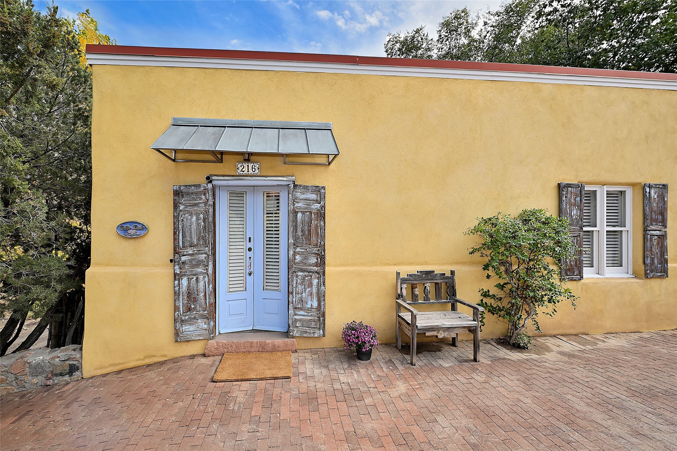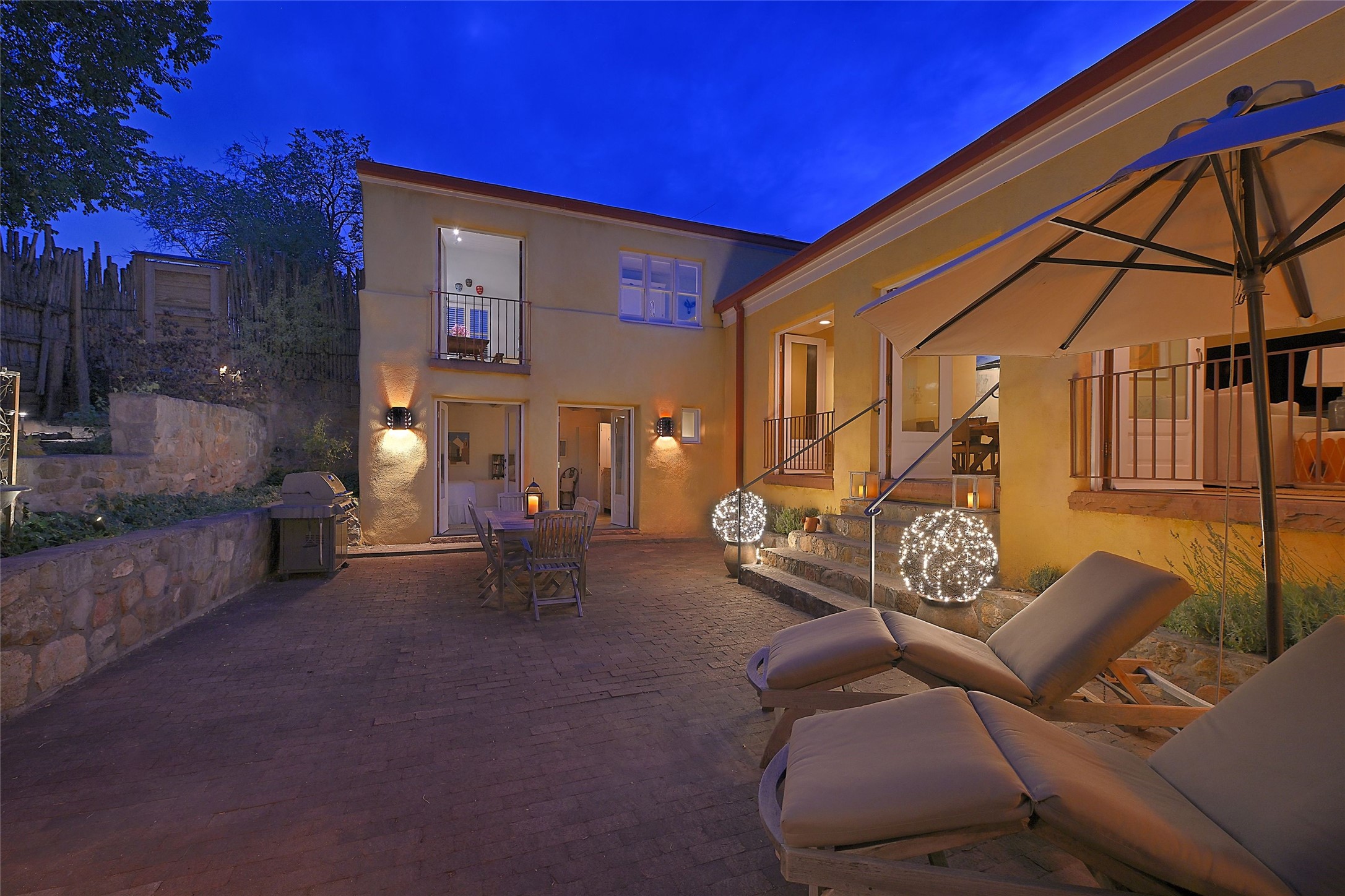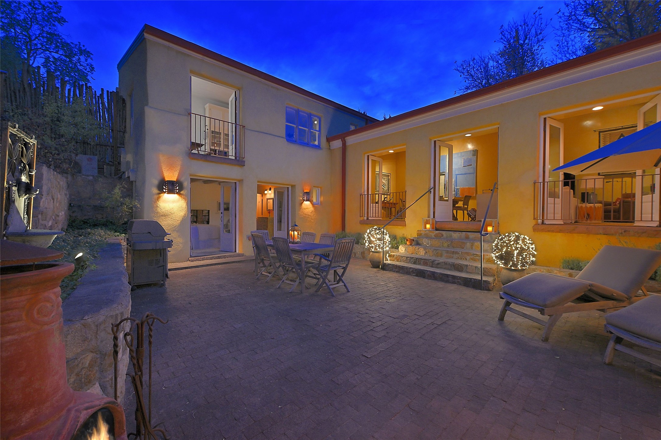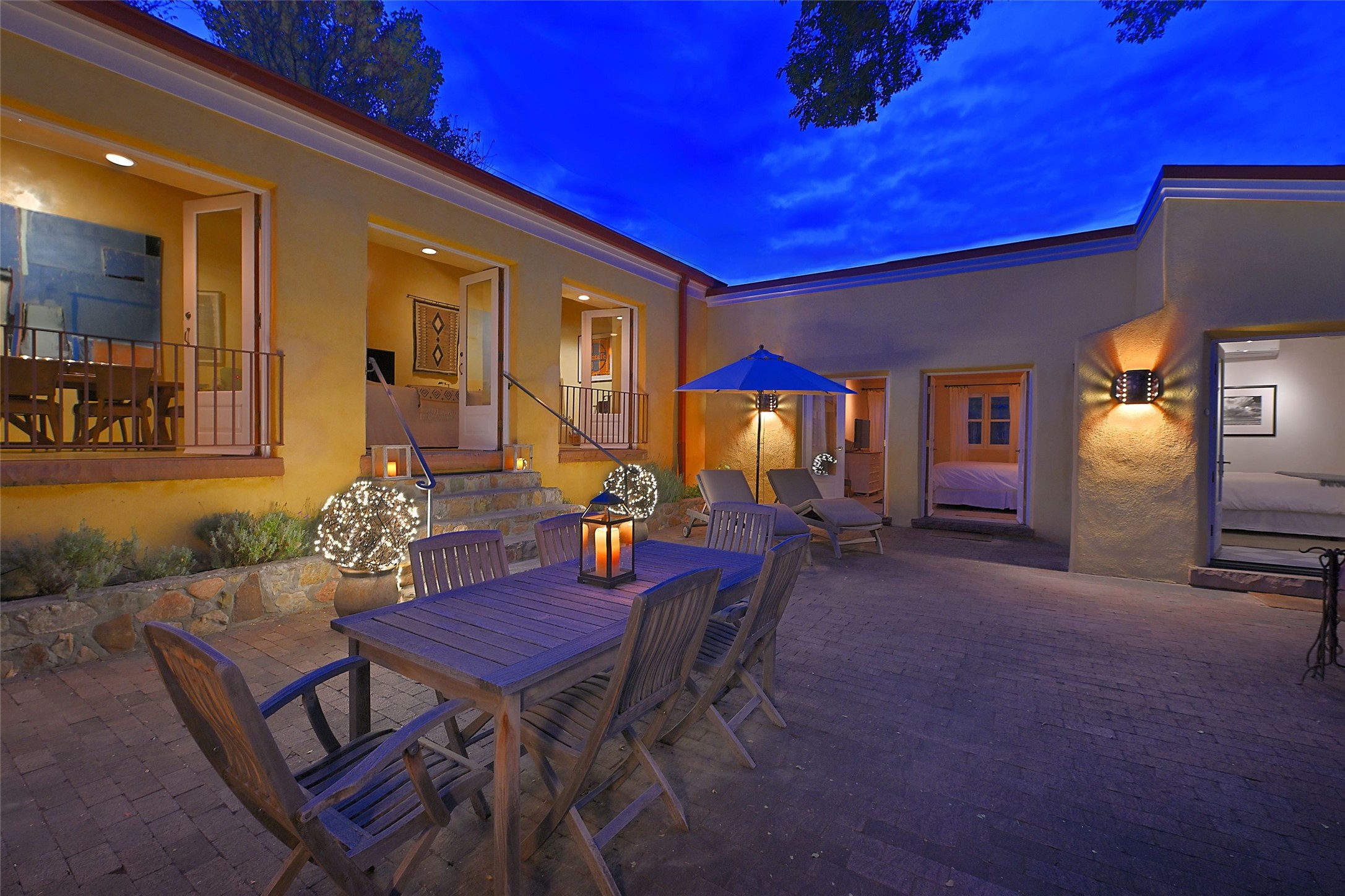 Quiet and charming oasis, located in the heart of Santa Fe's Historic Eastside, and a stone's throw to Canyon Road and the Plaza. Built in 1988 for Santa Fe New Mexican arts critic David Bell, the original two-story structure is carved into an east-facing hillside at the fork of Lorenzo Lane in a verdant neighborhood of historic homes. Unusual for Santa Fe, the yellow stucco exterior gives this delightful home the look of a French country house. Through the quaint, unimposing facade, one enters a surprisingly spacious, yet cozy, three-bedroom home with stunning views of Mount Atalaya and Picacho Peak. French doors open from the living/dining room and all three en-suite bedrooms to a tranquil courtyard surrounded by stone walls, walkways, and irrigated, terraced beds planted with lavender, perennials and shade trees. The primary bedroom was added in 1997 and the attached casita (accessed from the courtyard) was built in 2017 per the design of famed Santa Fe architect Richard Martinez. The property features an abundance of charming features, including: Antique kitchen cabinetry repurposed from a landmark Santa Fe hardware store; 12-foot living/room dining room ceiling with vigas; Diamond-plaster-finished living/dining room, primary bedroom, and casita walls; Painted floors and wood ceiling detailing; Kiva fireplace; French doors into the courtyard from all bedrooms and living/dining room; Landscape lighting and small fountain in courtyard. Modern upgrades include: AC/Heat supplied by mini-splits installed in kitchen and all bedrooms in 2017; Lochinvar, high-efficiency gas furnace installed in 2021 supplies radiant floor heat and instant hot water; Roof-mounted solar panels installed in 2017 that supply 100% of the electricity. The property was previously a popular short-term rental with rave reviews from guests. This is truly the ideal enchanting Santa Fe retreat that is not to be missed!