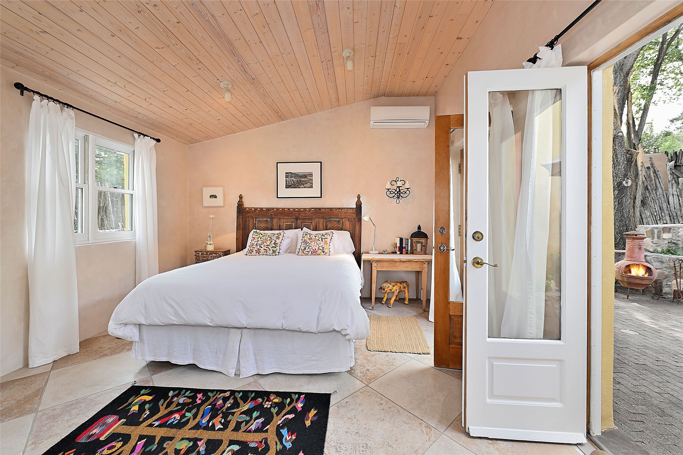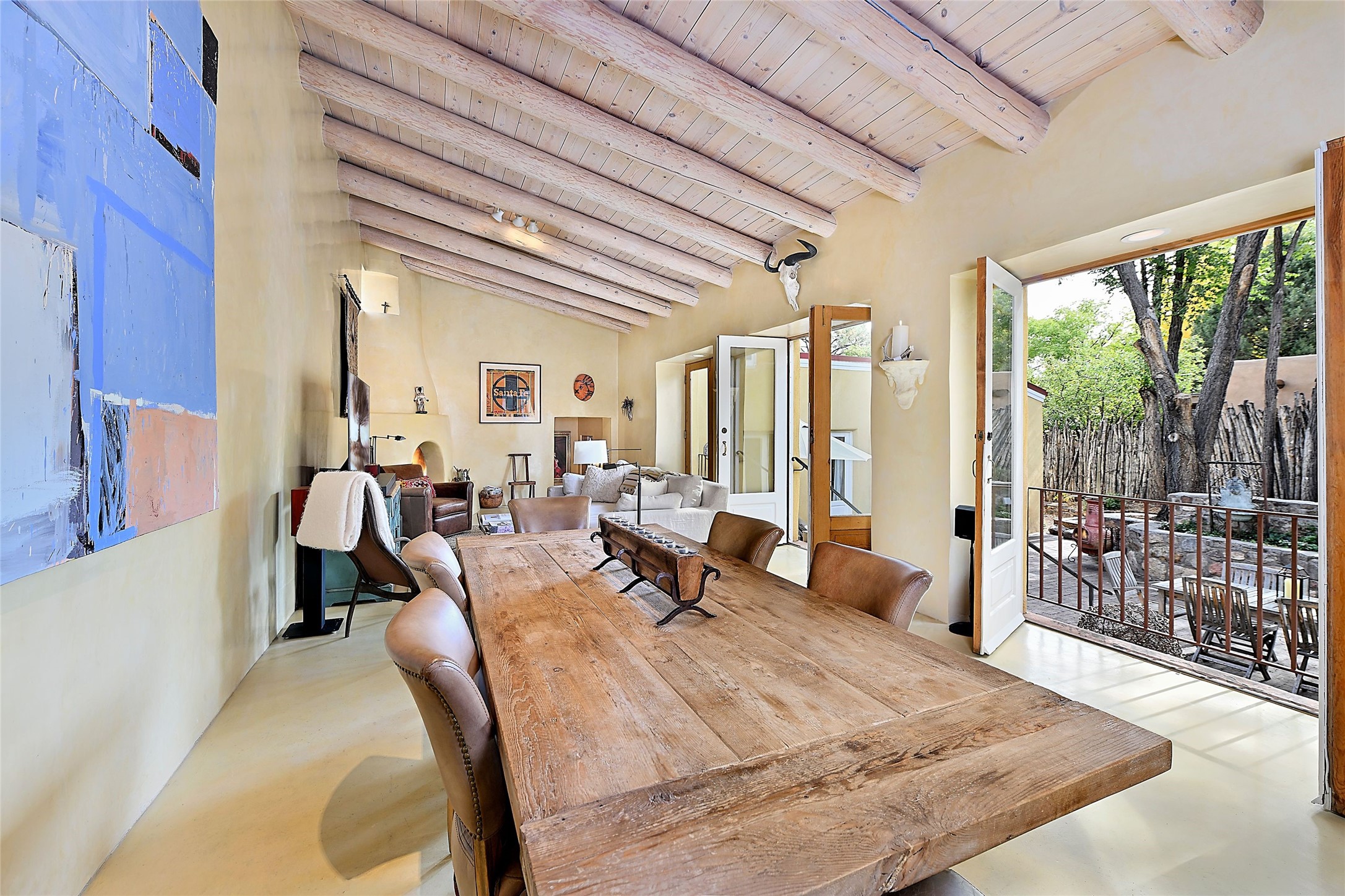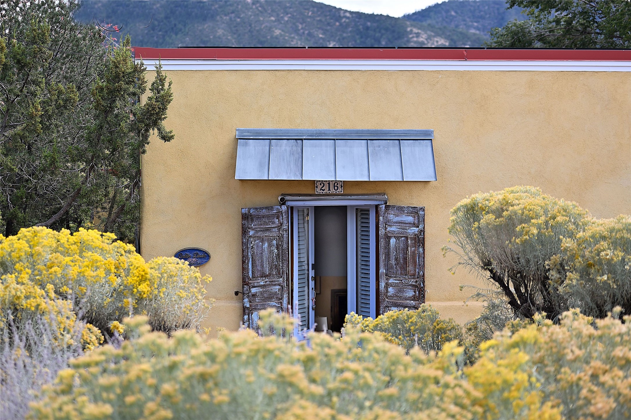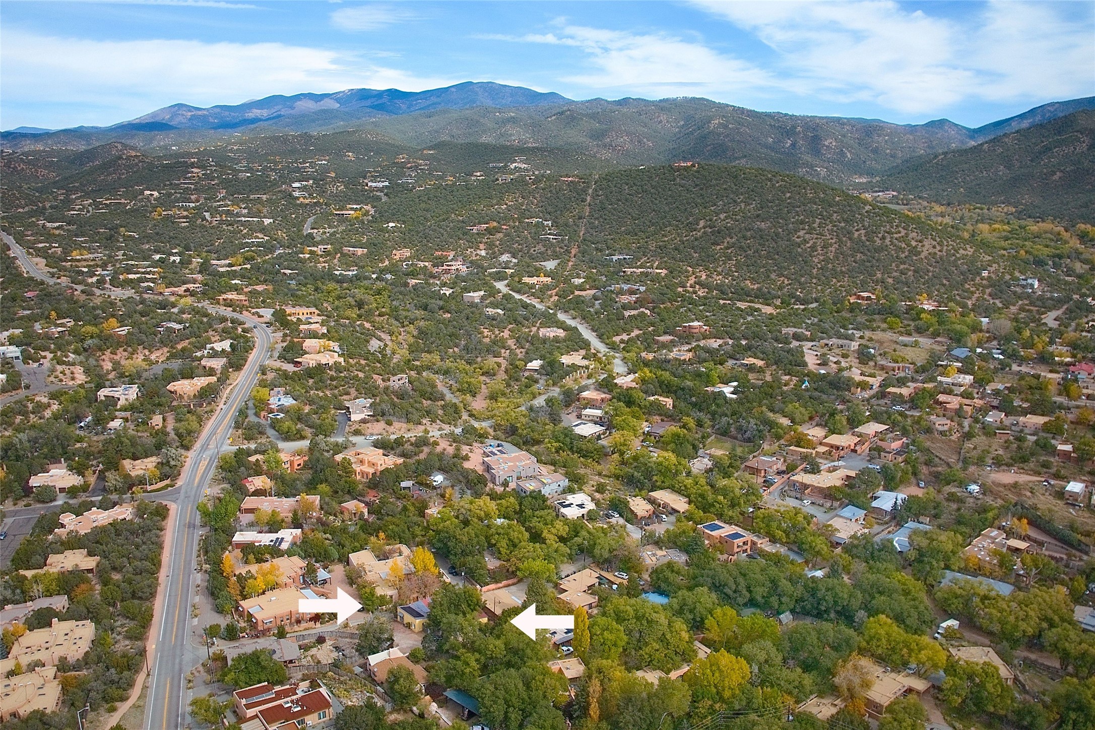 Quiet and charming oasis, located in the heart of Santa Fe's Historic Eastside, and a stone's throw to Canyon Road and the Plaza. Built in 1988 for Santa Fe New Mexican arts critic David Bell, the original two-story structure is carved into an east-facing hillside at the fork of Lorenzo Lane in a verdant neighborhood of historic homes. Unusual for Santa Fe, the yellow stucco exterior gives this delightful home the look of a French country house. Through the quaint, unimposing facade, one enters a surprisingly spacious, yet cozy, three-bedroom home with stunning views of Mount Atalaya and Picacho Peak. French doors open from the living/dining room and all three en-suite bedrooms to a tranquil courtyard surrounded by stone walls, walkways, and irrigated, terraced beds planted with lavender, perennials and shade trees. The primary bedroom was added in 1997 and the attached casita (accessed from the courtyard) was built in 2017 per the design of famed Santa Fe architect Richard Martinez. The property features an abundance of charming features, including: Antique kitchen cabinetry repurposed from a landmark Santa Fe hardware store; 12-foot living/room dining room ceiling with vigas; Diamond-plaster-finished living/dining room, primary bedroom, and casita walls; Painted floors and wood ceiling detailing; Kiva fireplace; French doors into the courtyard from all bedrooms and living/dining room; Landscape lighting and small fountain in courtyard. Modern upgrades include: AC/Heat supplied by mini-splits installed in kitchen and all bedrooms in 2017; Lochinvar, high-efficiency gas furnace installed in 2021 supplies radiant floor heat and instant hot water; Roof-mounted solar panels installed in 2017 that supply 100% of the electricity. The property was previously a popular short-term rental with rave reviews from guests. This is truly the ideal enchanting Santa Fe retreat that is not to be missed!