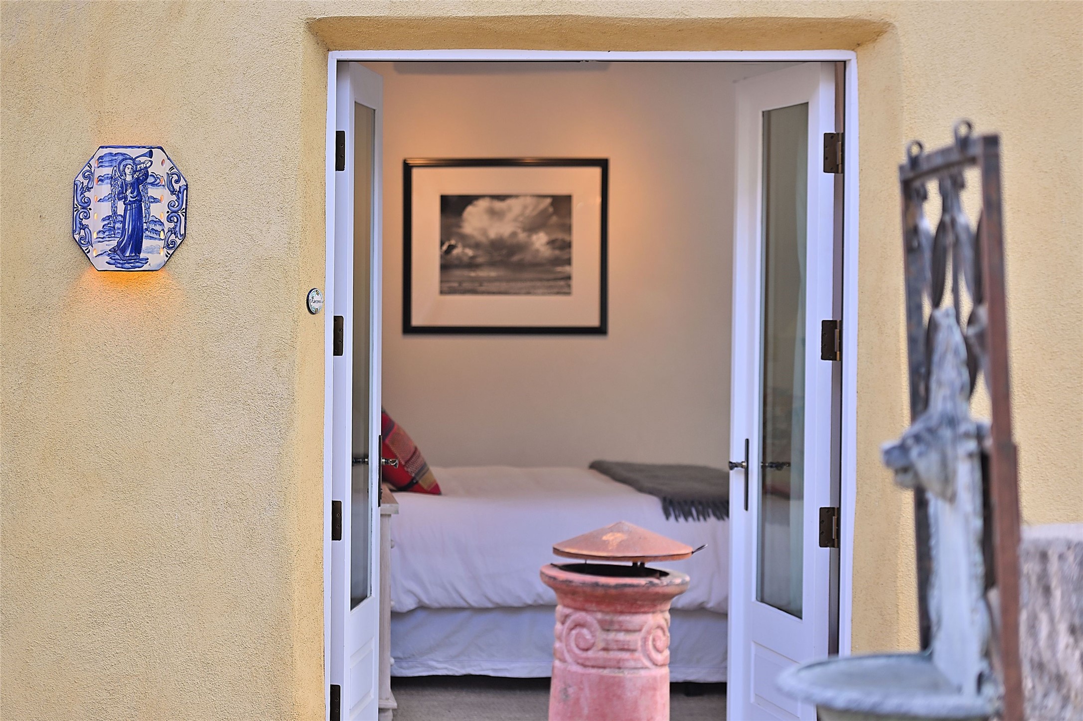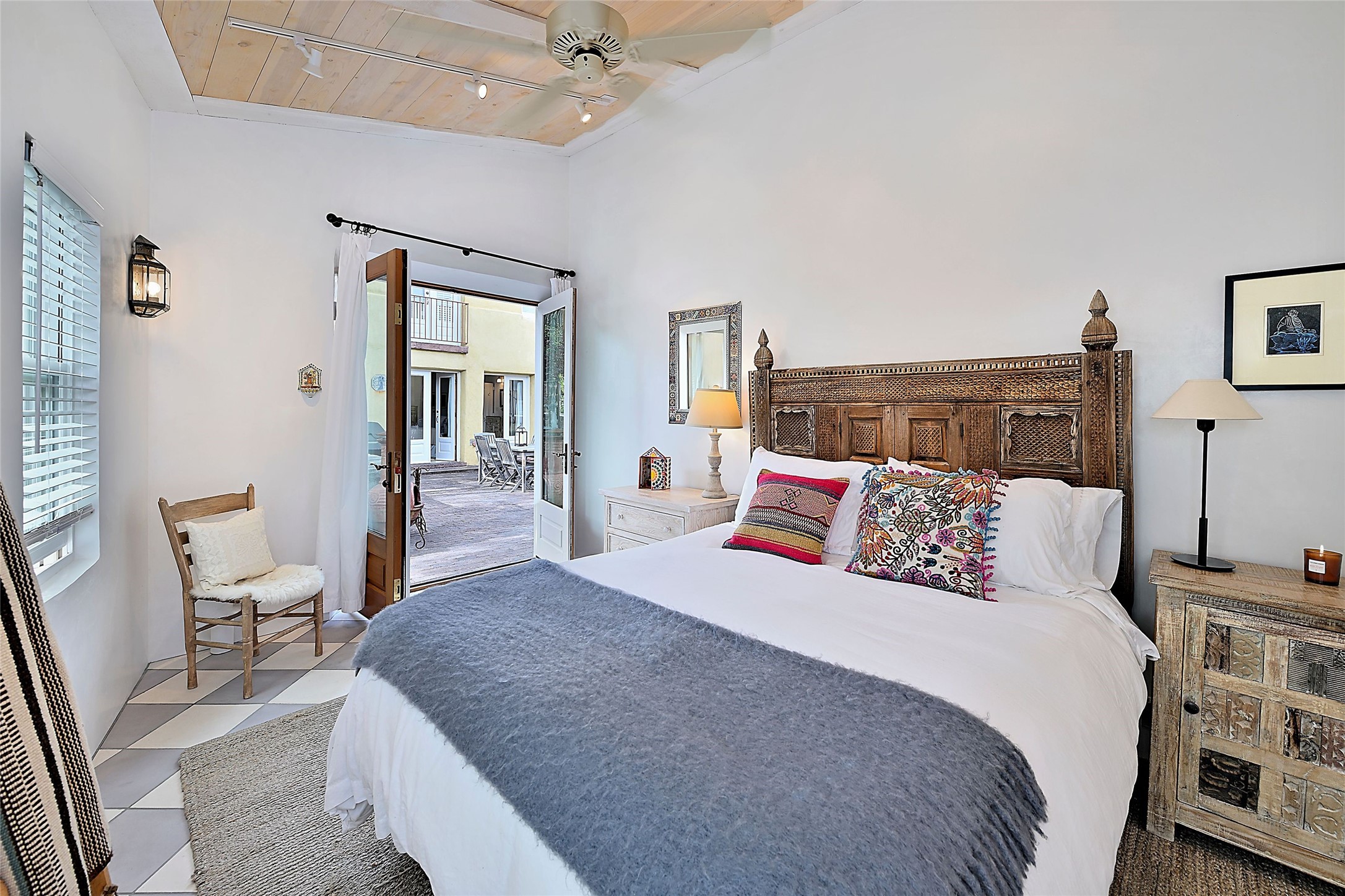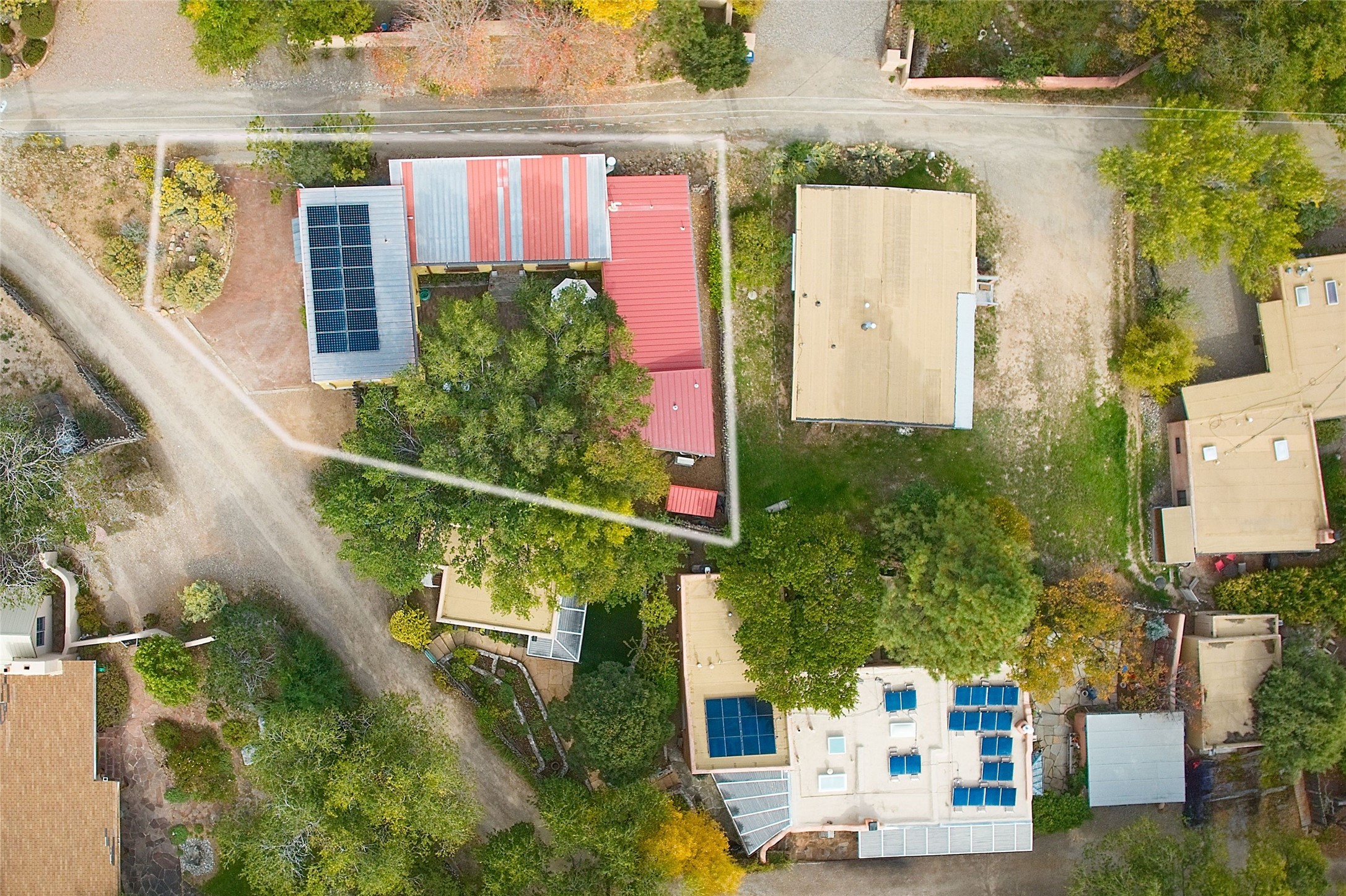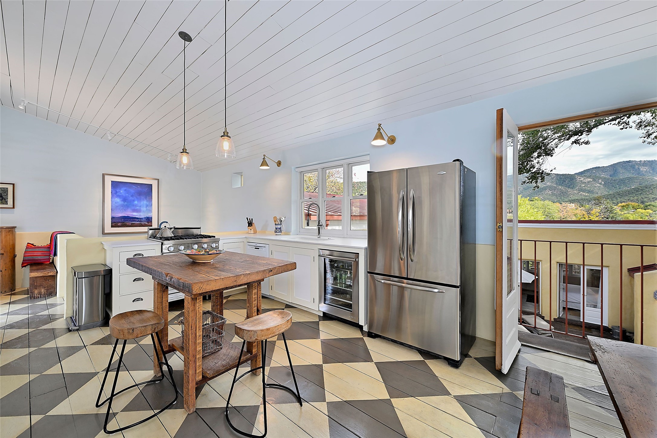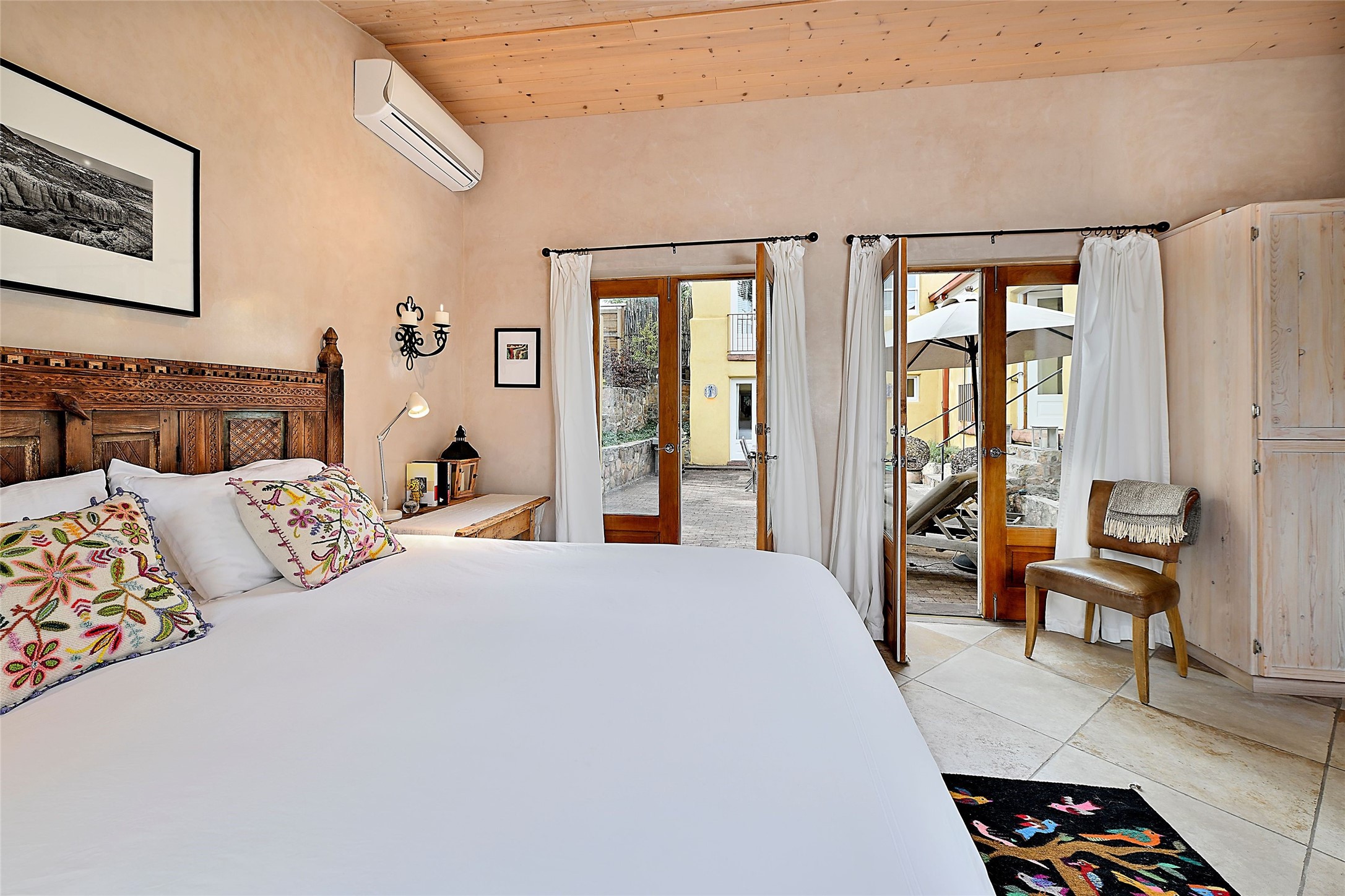 Quiet and charming oasis, located in the heart of Santa Fe's Historic Eastside, and a stone's throw to Canyon Road and the Plaza. Built in 1988 for Santa Fe New Mexican arts critic David Bell, the original two-story structure is carved into an east-facing hillside at the fork of Lorenzo Lane in a verdant neighborhood of historic homes. Unusual for Santa Fe, the yellow stucco exterior gives this delightful home the look of a French country house. Through the quaint, unimposing facade, one enters a surprisingly spacious, yet cozy, three-bedroom home with stunning views of Mount Atalaya and Picacho Peak. French doors open from the living/dining room and all three en-suite bedrooms to a tranquil courtyard surrounded by stone walls, walkways, and irrigated, terraced beds planted with lavender, perennials and shade trees. The primary bedroom was added in 1997 and the attached casita (accessed from the courtyard) was built in 2017 per the design of famed Santa Fe architect Richard Martinez. The property features an abundance of charming features, including: Antique kitchen cabinetry repurposed from a landmark Santa Fe hardware store; 12-foot living/room dining room ceiling with vigas; Diamond-plaster-finished living/dining room, primary bedroom, and casita walls; Painted floors and wood ceiling detailing; Kiva fireplace; French doors into the courtyard from all bedrooms and living/dining room; Landscape lighting and small fountain in courtyard. Modern upgrades include: AC/Heat supplied by mini-splits installed in kitchen and all bedrooms in 2017; Lochinvar, high-efficiency gas furnace installed in 2021 supplies radiant floor heat and instant hot water; Roof-mounted solar panels installed in 2017 that supply 100% of the electricity. The property was previously a popular short-term rental with rave reviews from guests. This is truly the ideal enchanting Santa Fe retreat that is not to be missed!